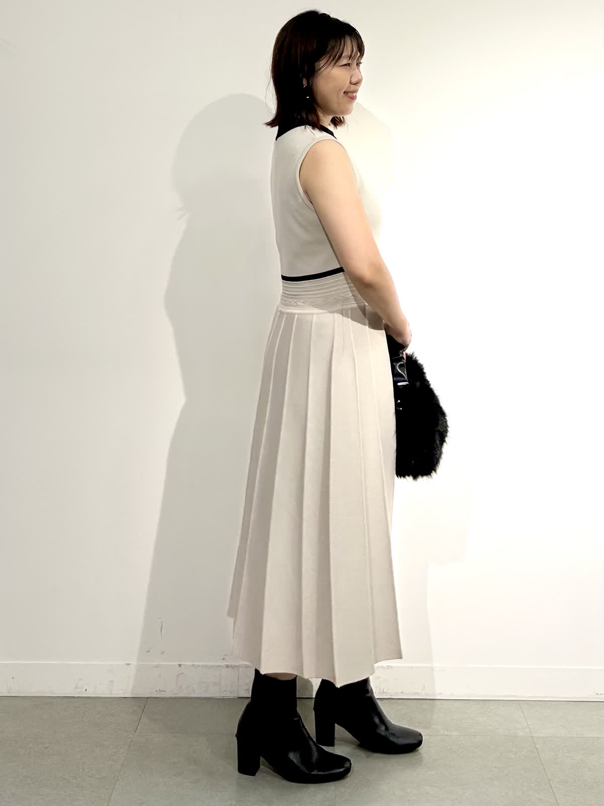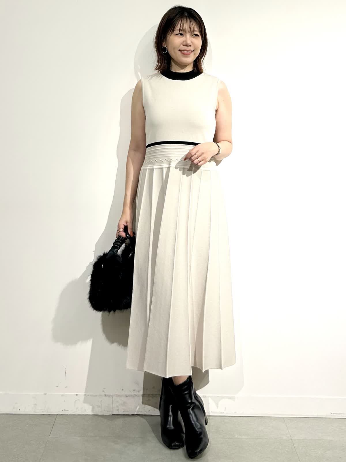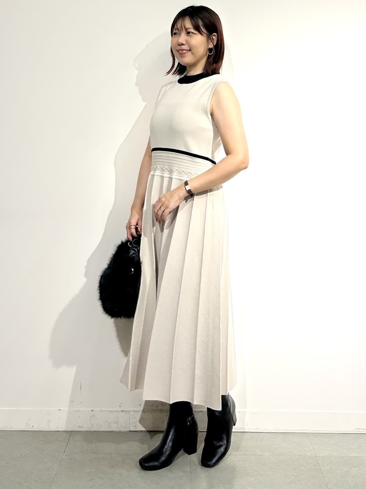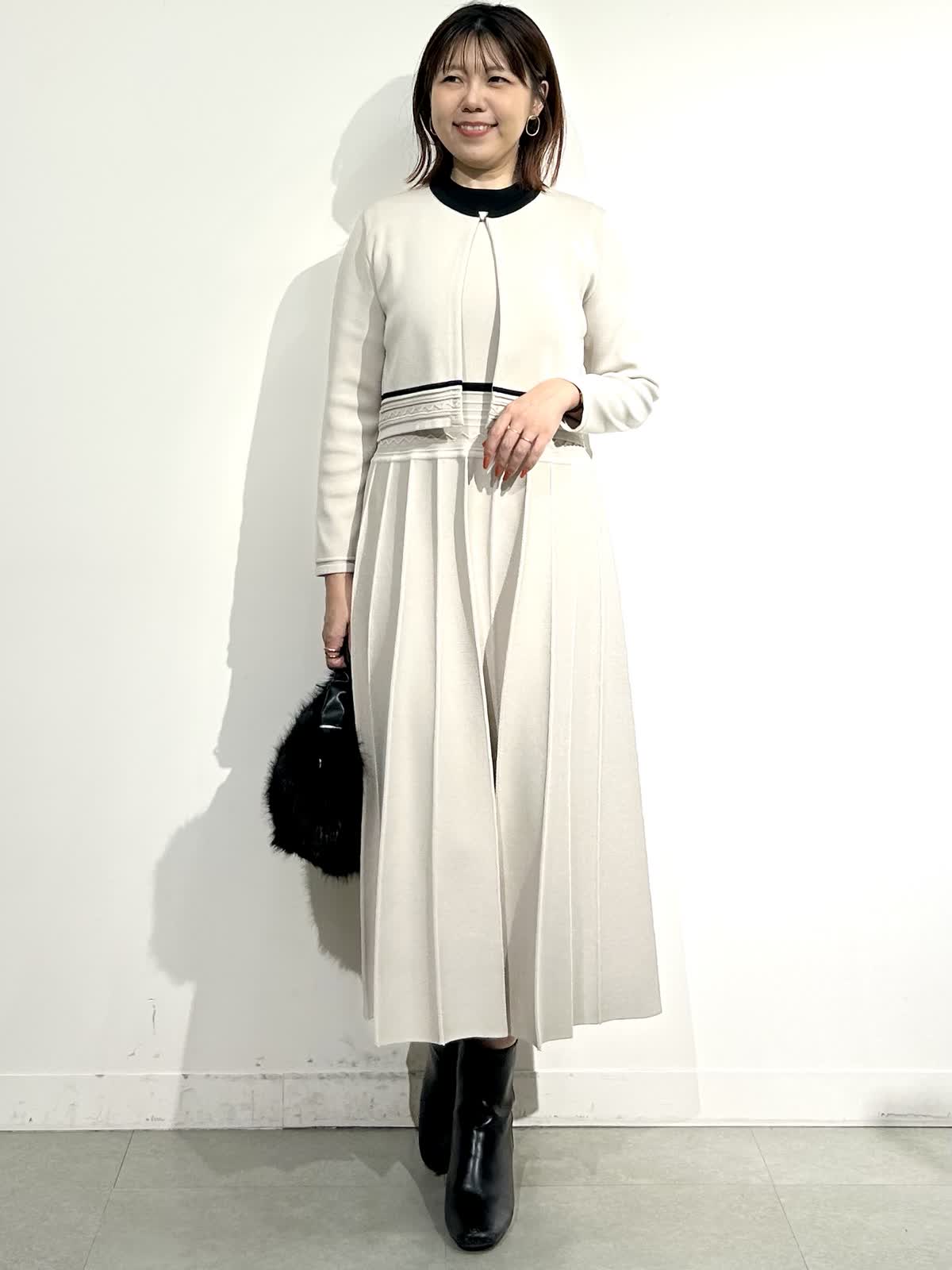 合わせたのは毎年大人気のワンピース。女性らしいシルエットが上品で、首元の配色やウエストのディテールが目を惹きます。