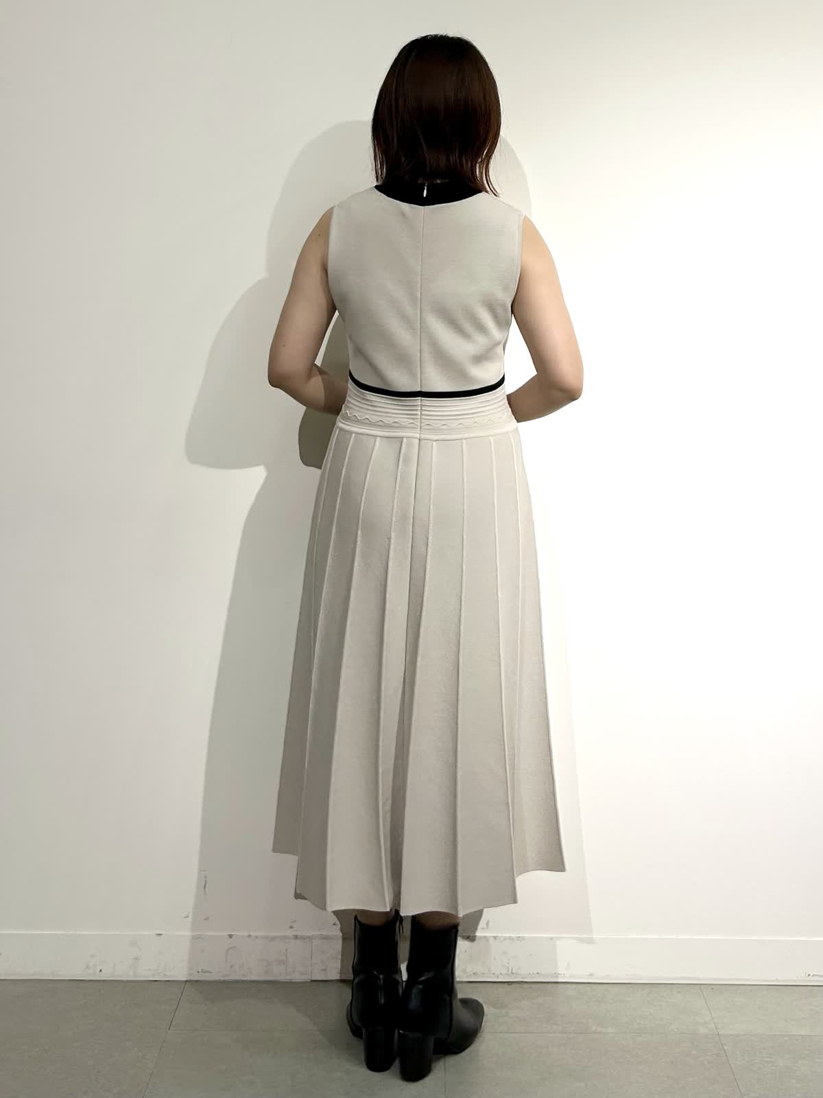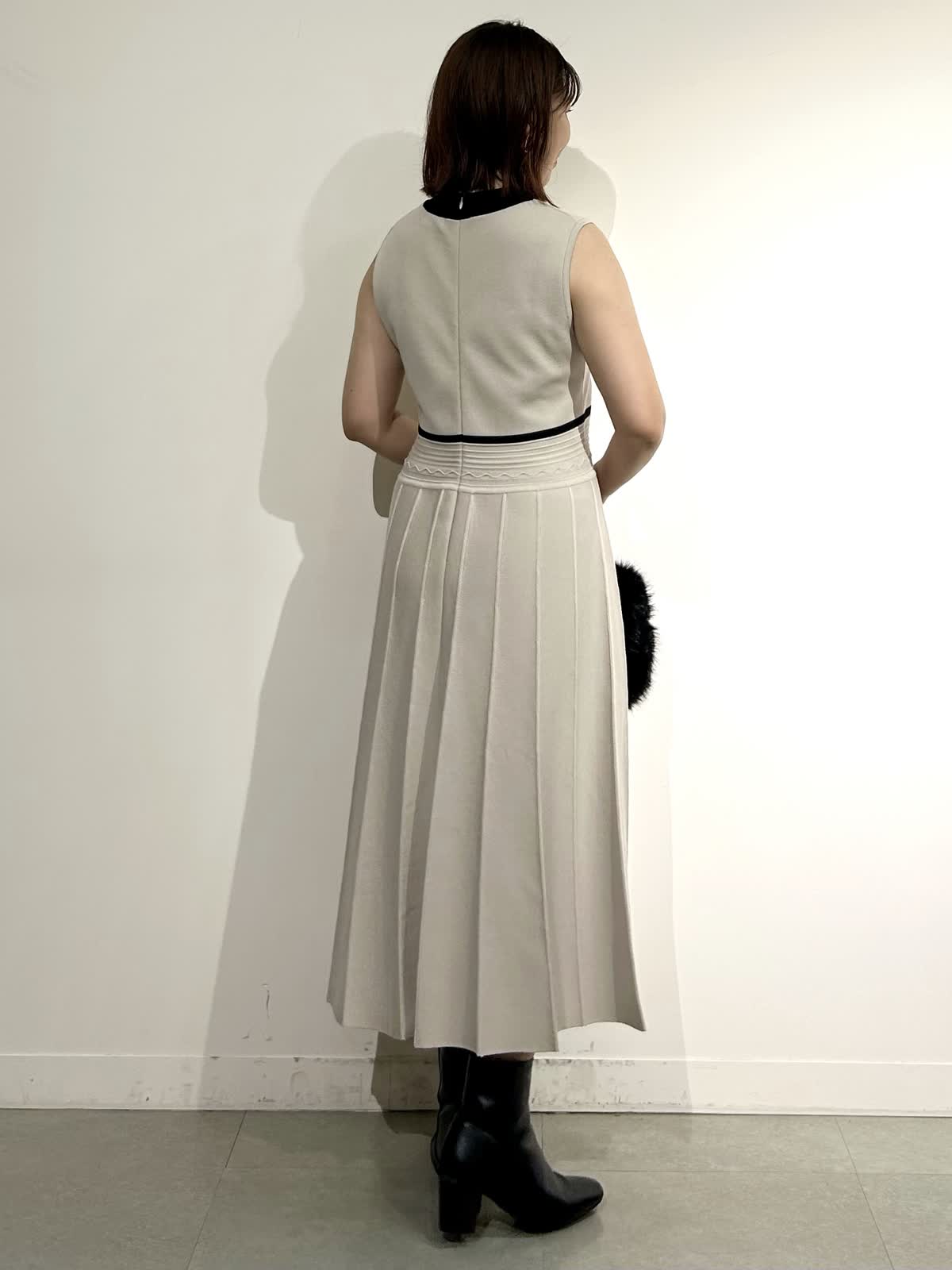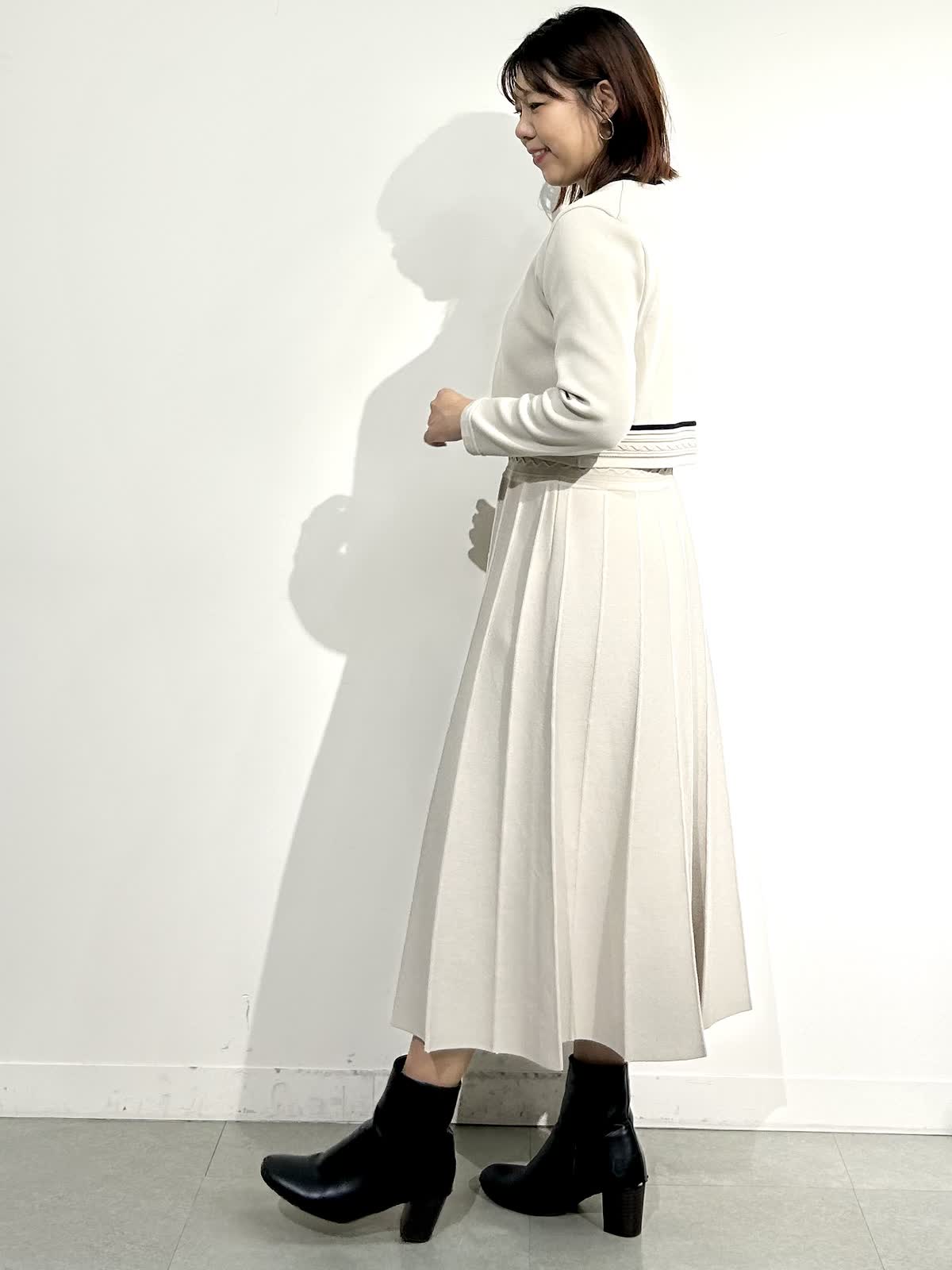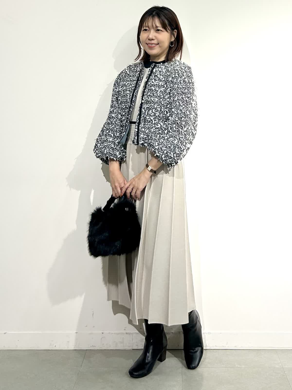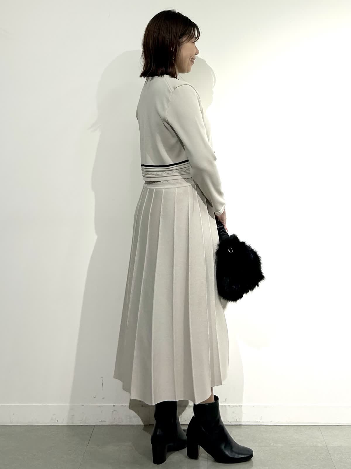 合わせたのは毎年大人気のワンピース。女性らしいシルエットが上品で、首元の配色やウエストのディテールが目を惹きます。
