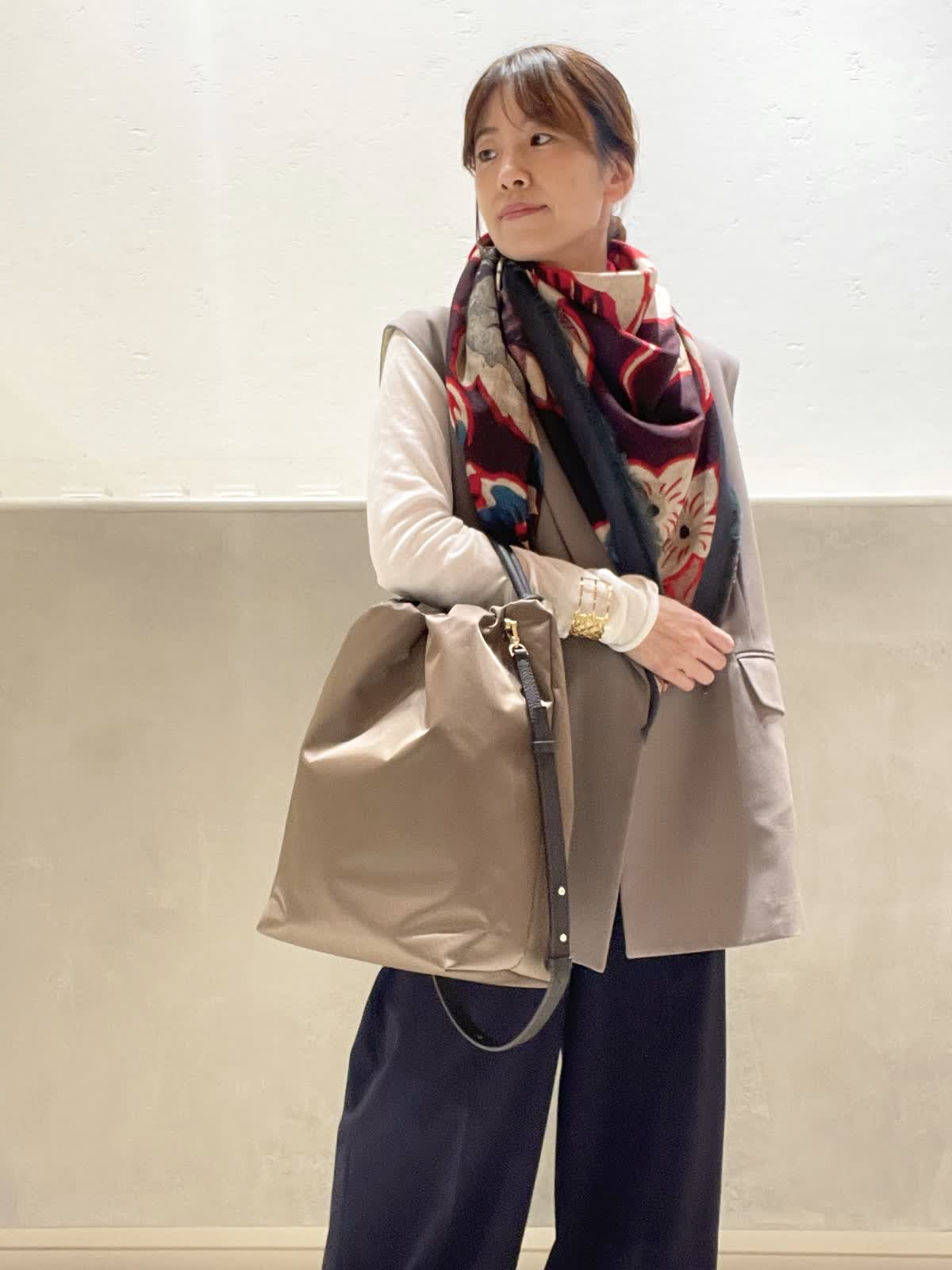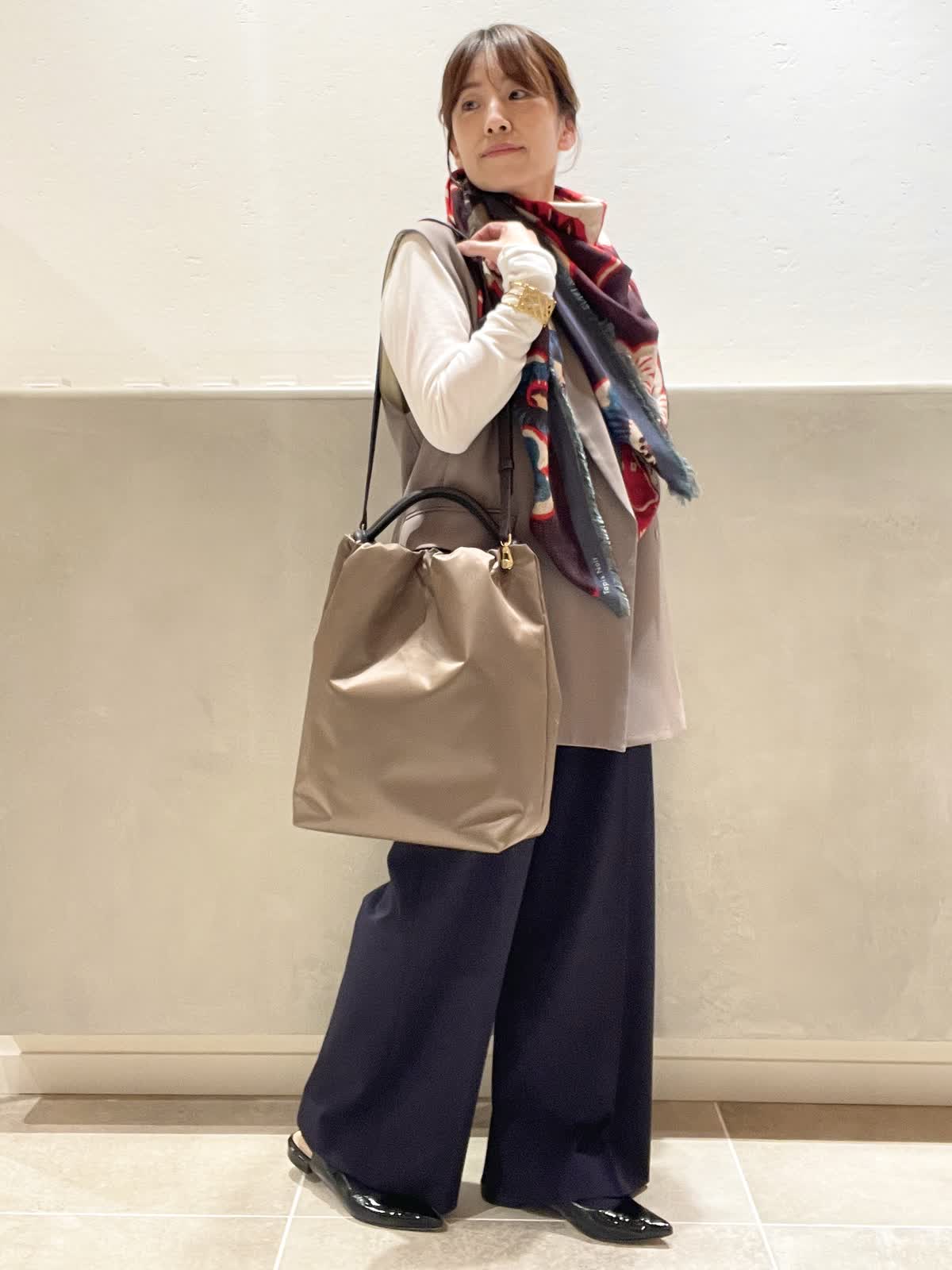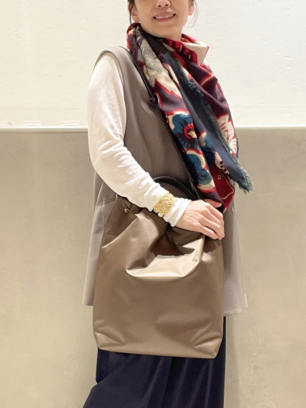 【着用アイテム:カラー/サイズ】 カットソー:オフホワイト/9号 バッグ:ブラウン 初秋の通勤には体温調節しやすいシアーカットソーとジレのスタイリング。FEEL AND TASTEのナイロンバッグはクッションもきいているので,タブレットの持ち歩きにも安心です。中の大きなポケットが飲み物を立てて入れられるのも便利。ナイロン素材のブラウンなら、若見えでスタイリッシュさもだせます。