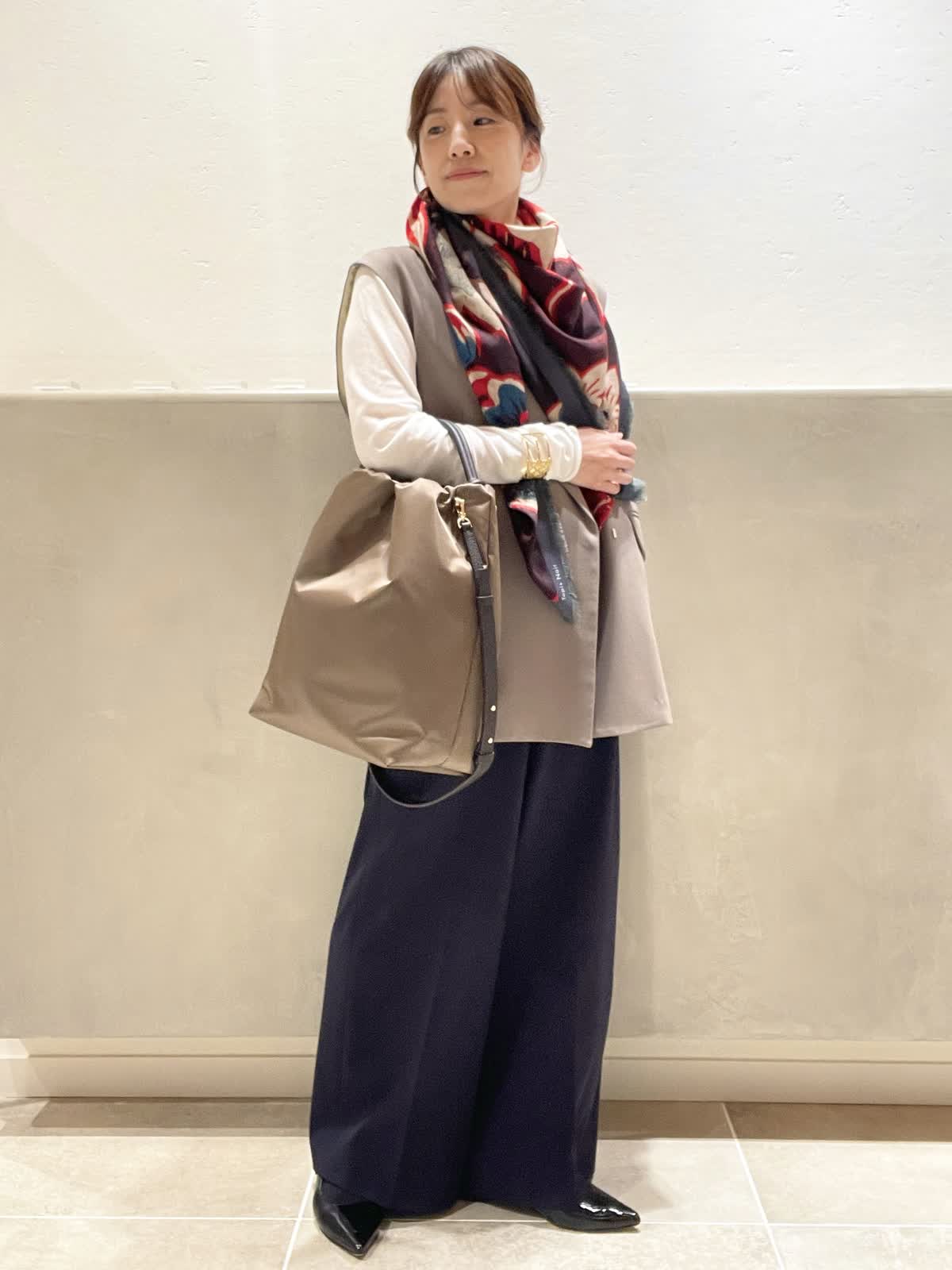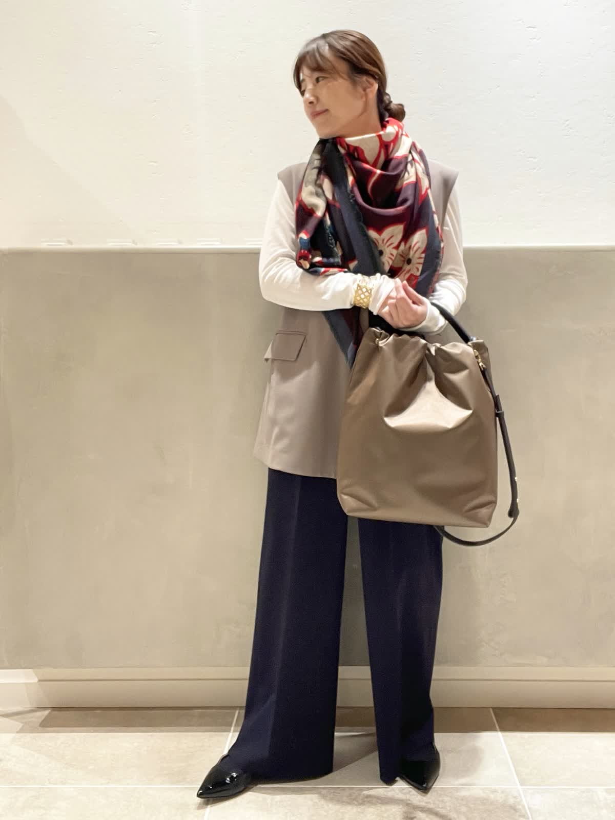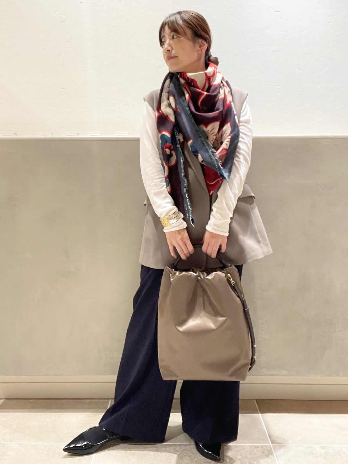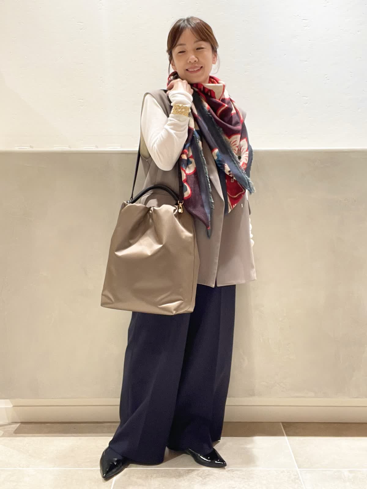 【着用アイテム:カラー/サイズ】 カットソー:オフホワイト/9号 バッグ:ブラウン 初秋の通勤には体温調節しやすいシアーカットソーとジレのスタイリング。FEEL AND TASTEのナイロンバッグはクッションもきいているので,タブレットの持ち歩きにも安心です。中の大きなポケットが飲み物を立てて入れられるのも便利。ナイロン素材のブラウンなら、若見えでスタイリッシュさもだせます。