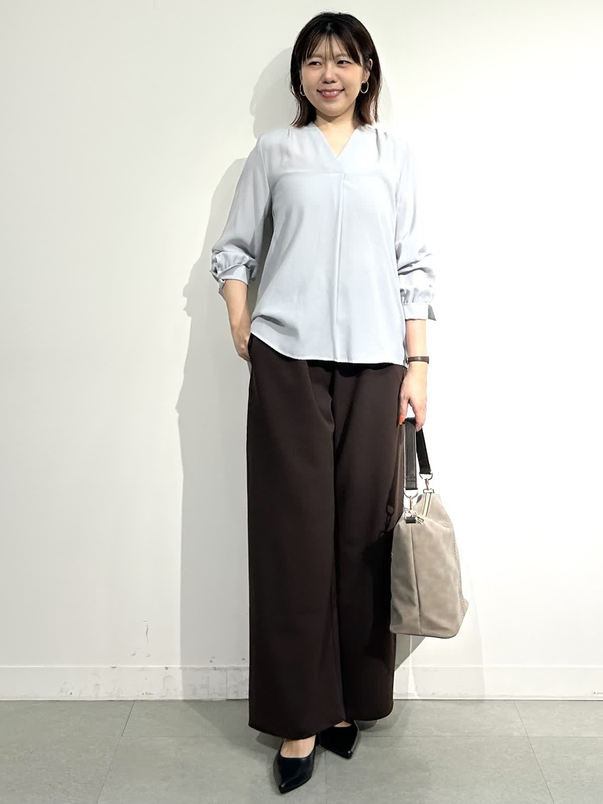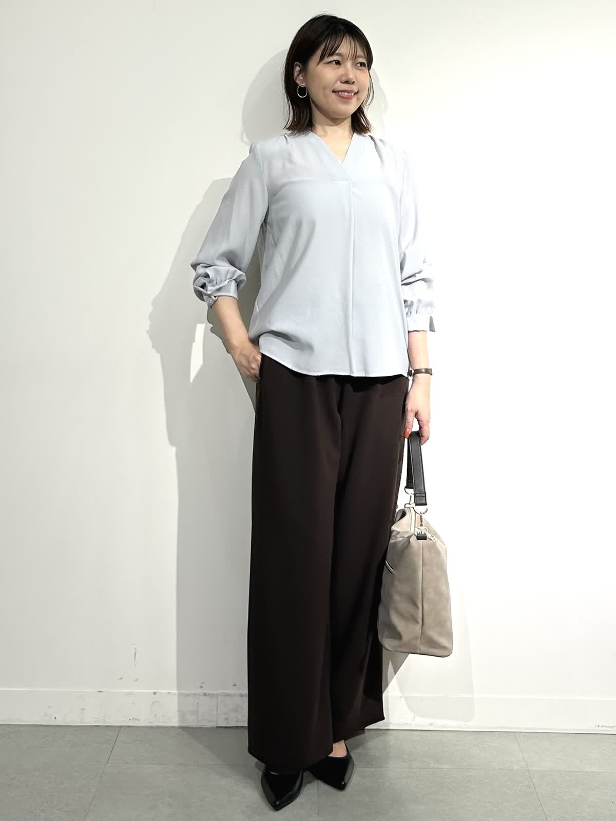 ブラウスはVネックでスッキリ、1枚でも綺麗です。