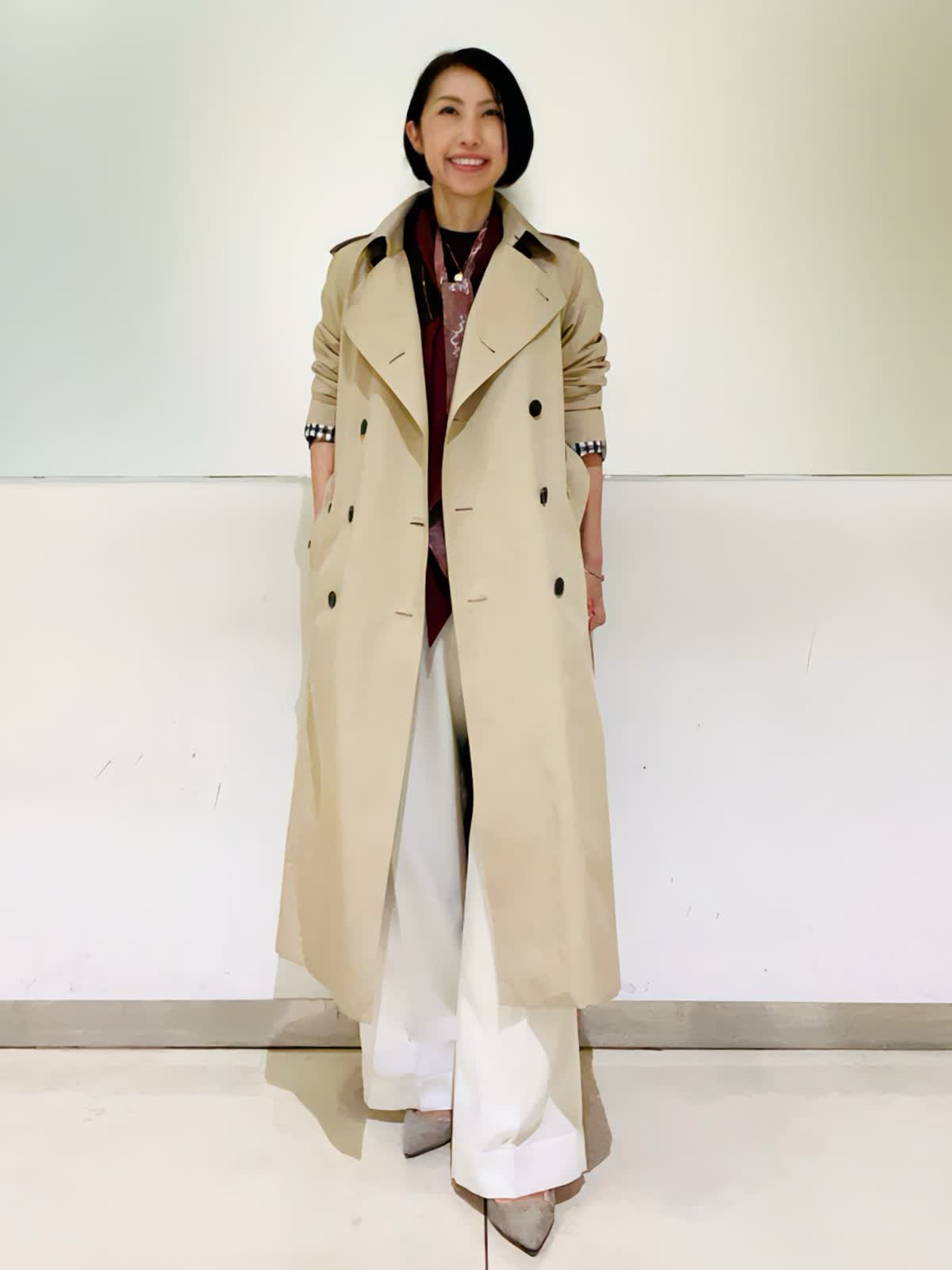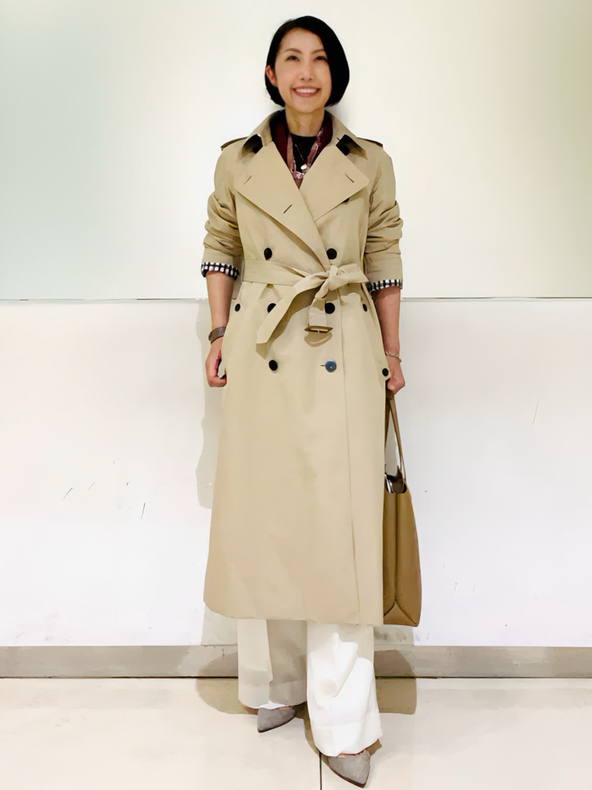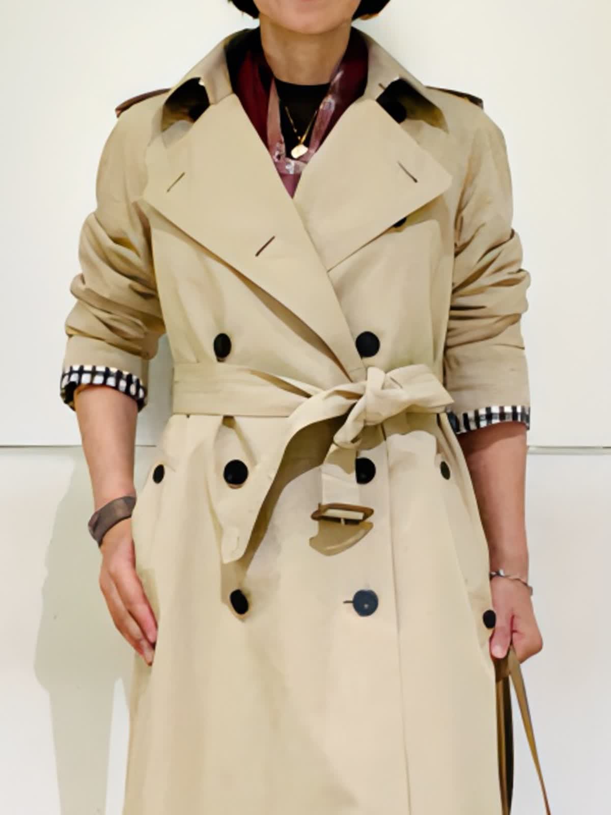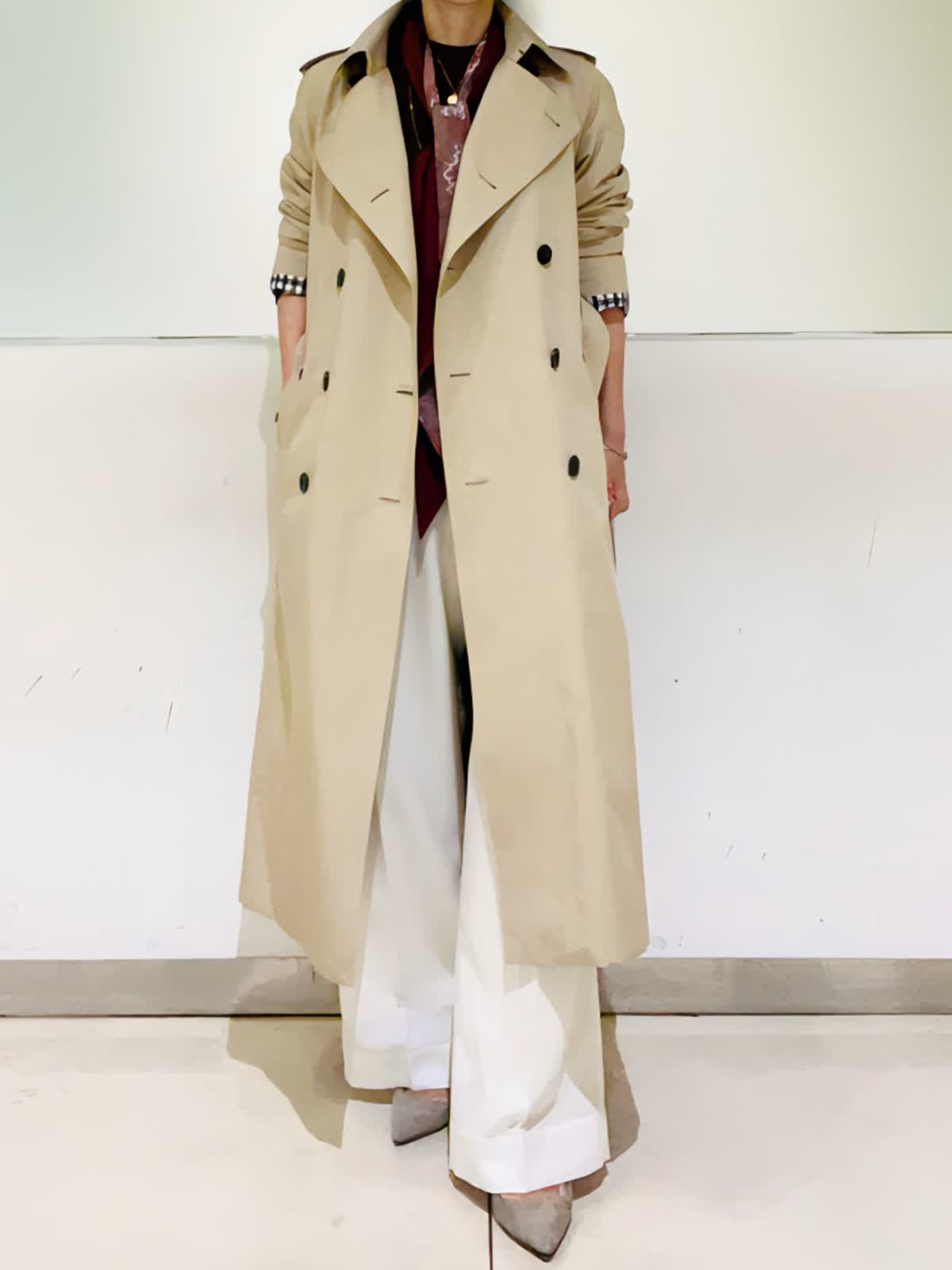 【着用アイテム】すべて9号 【着用カラー】コート:キャメル ニット:ダークブラウン パンツ:オフホワイト 秋になると着たくなる応援トレンチコート。ライナーの取り外しが出来るので、秋の始まりから真冬まで長く着られるコートです。流行りすたり無い定番のデザインで、何にでも合わせやすく、さっと羽織るだけでスタイリングが決まる優勝コートです。