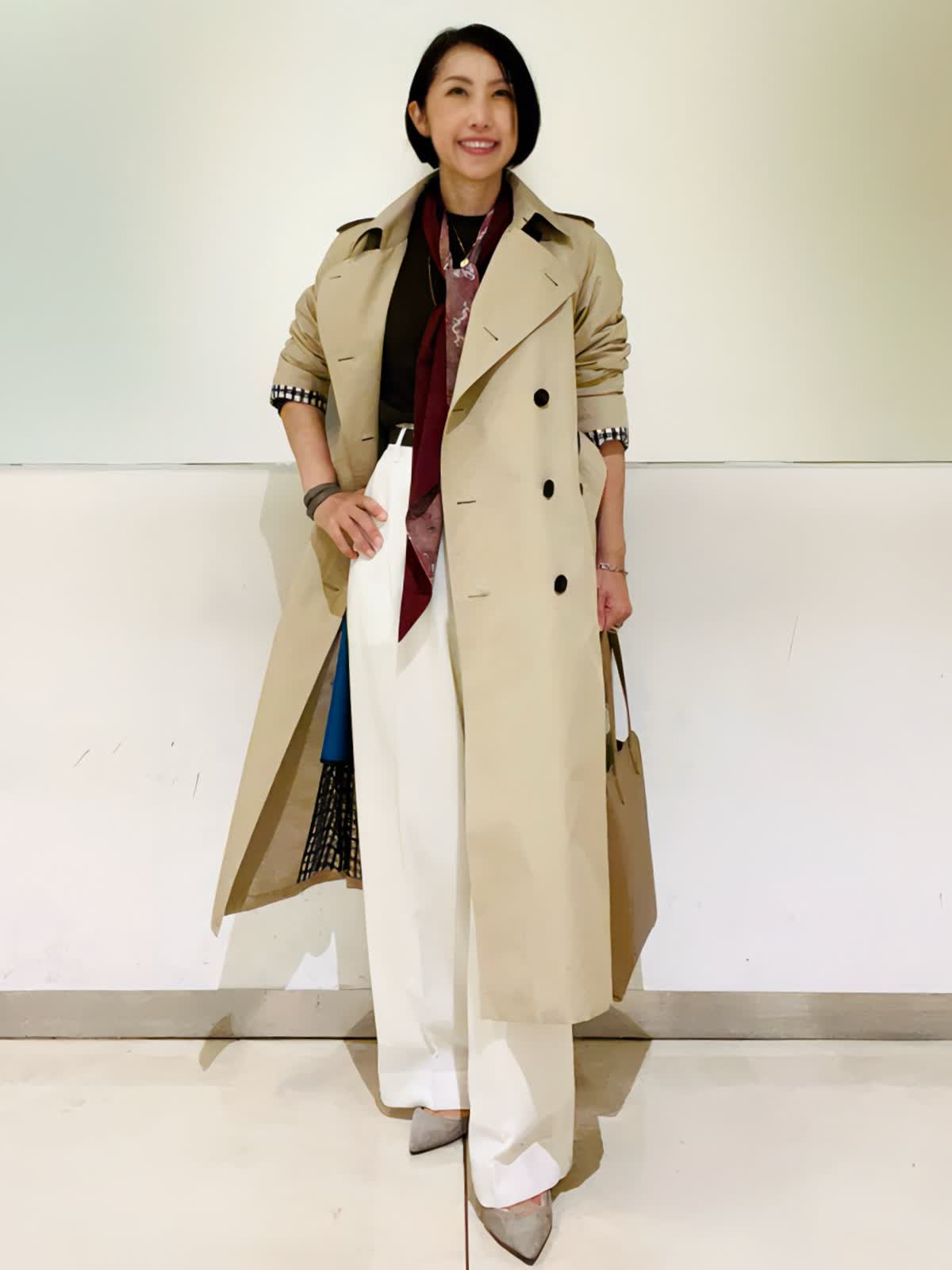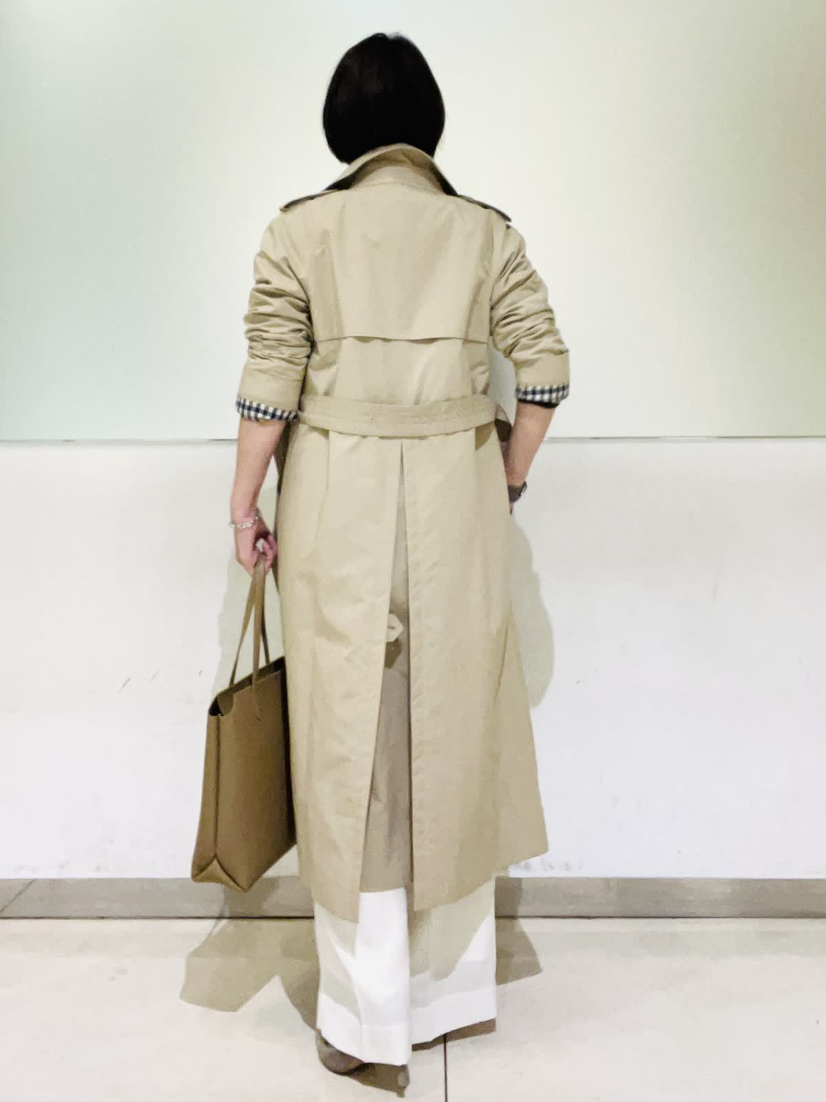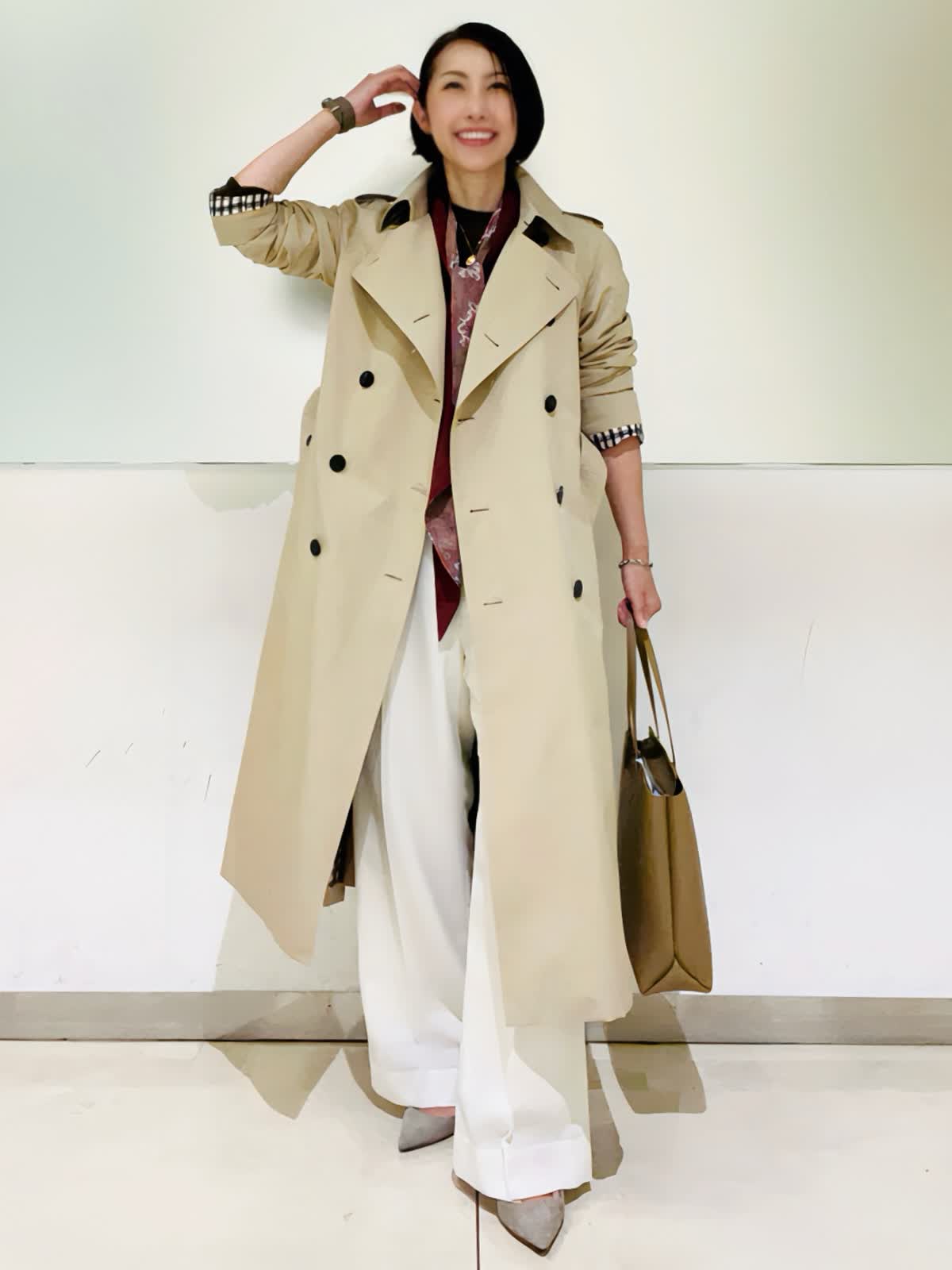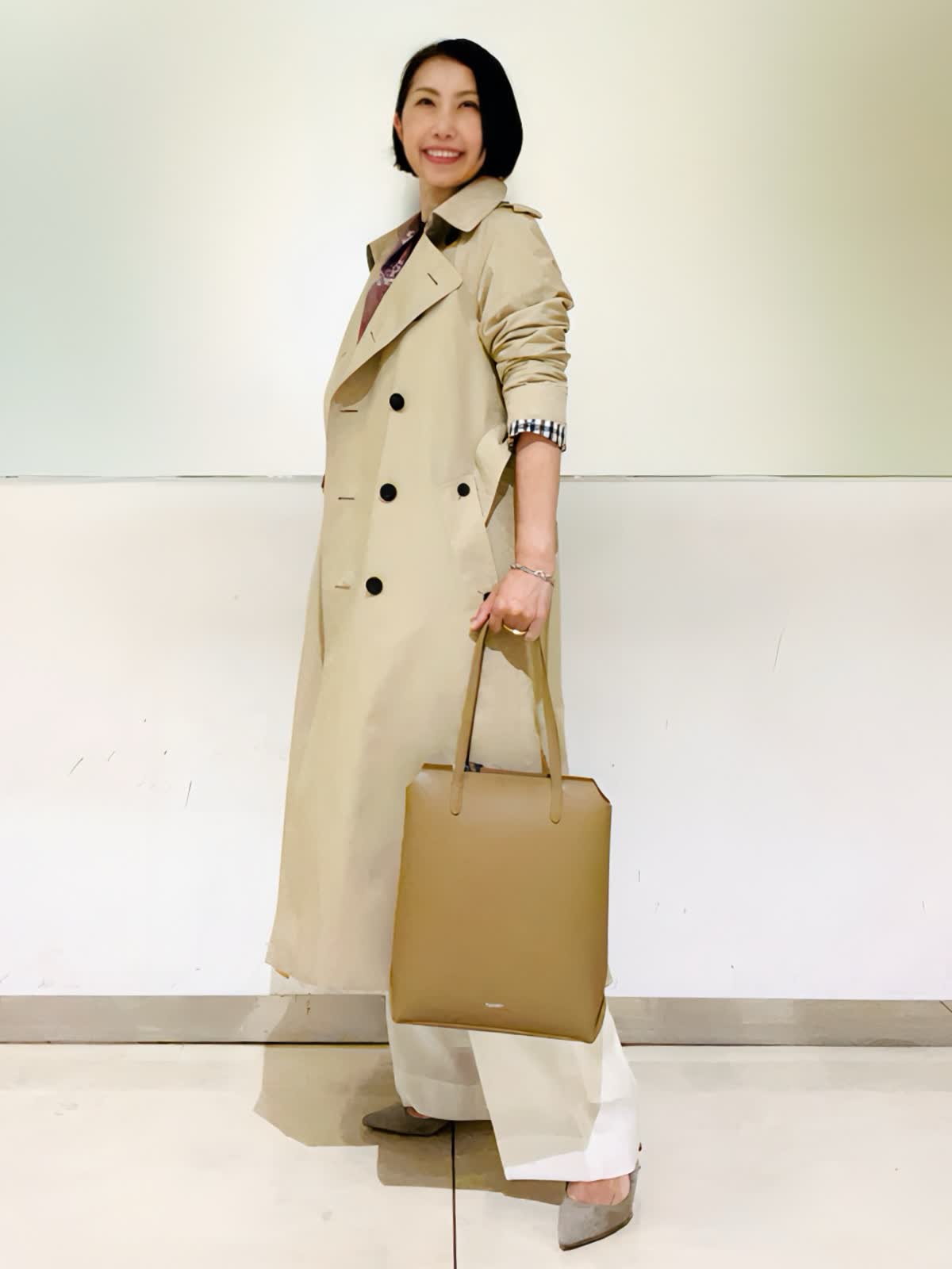 【着用アイテム】すべて9号 【着用カラー】コート:キャメル ニット:ダークブラウン パンツ:オフホワイト 秋になると着たくなる応援トレンチコート。ライナーの取り外しが出来るので、秋の始まりから真冬まで長く着られるコートです。流行りすたり無い定番のデザインで、何にでも合わせやすく、さっと羽織るだけでスタイリングが決まる優勝コートです。