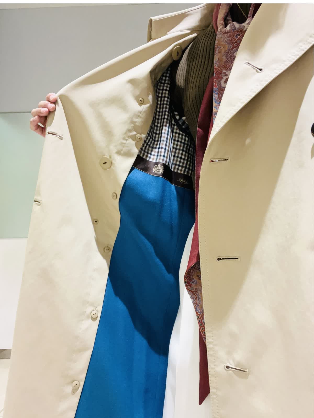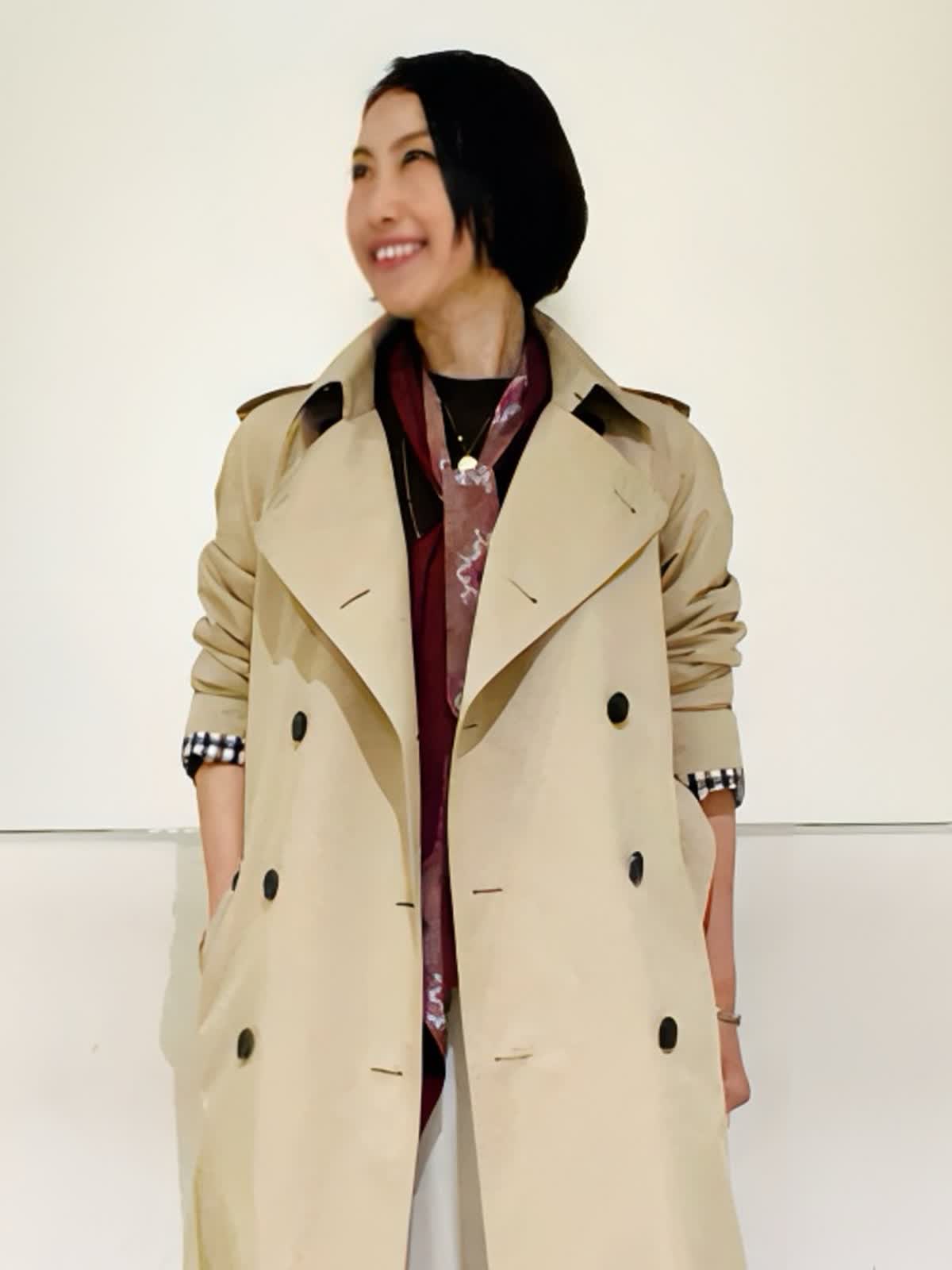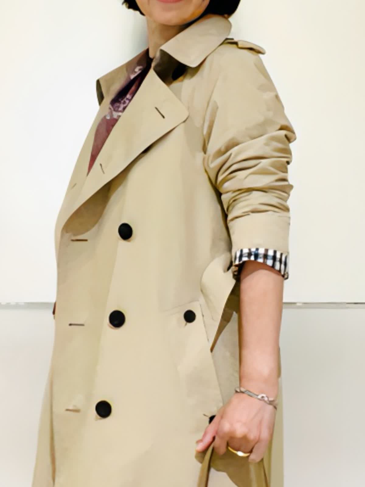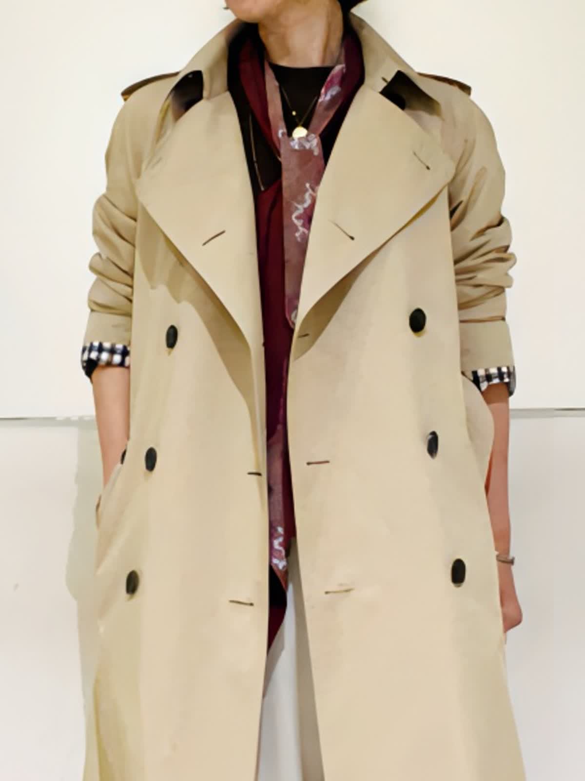 【着用アイテム】すべて9号 【着用カラー】コート:キャメル ニット:ダークブラウン パンツ:オフホワイト 秋になると着たくなる応援トレンチコート。ライナーの取り外しが出来るので、秋の始まりから真冬まで長く着られるコートです。流行りすたり無い定番のデザインで、何にでも合わせやすく、さっと羽織るだけでスタイリングが決まる優勝コートです。