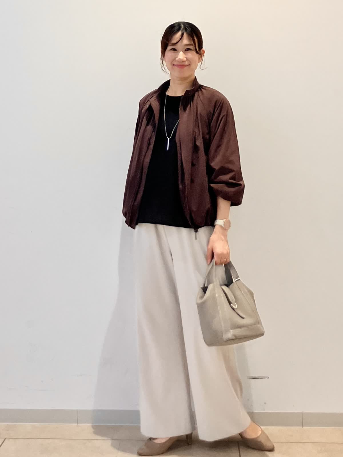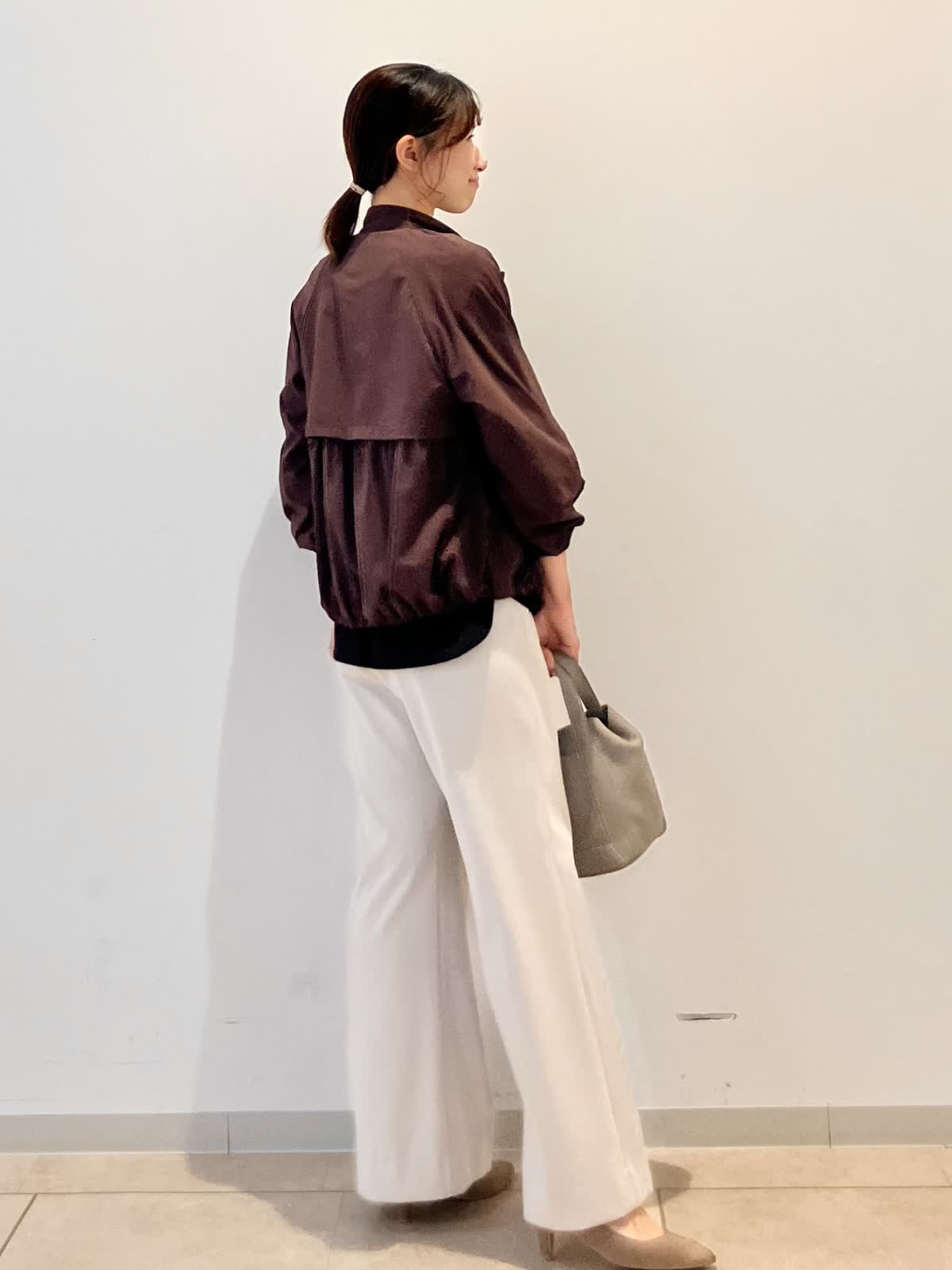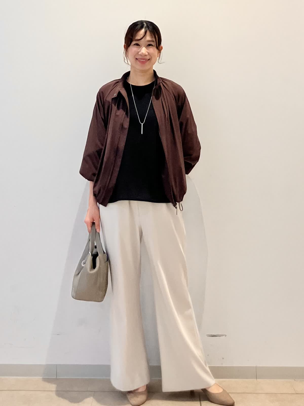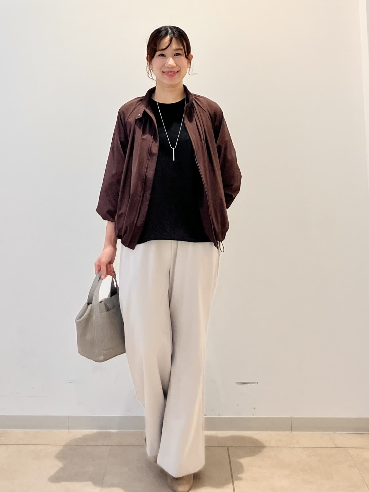 【着用サイズ】ブルゾン:フリー カットソー:フリー パンツ:9号 「週末の美術館、カフェ巡りスタイル」 上品さのあるカラーで、きちんと感を演出できます。例えばですが、秋の良い季節の時に美術館、カフェ巡りなんていいですよね♪そんな時何を着て行こうとなった時、オススメスタイルです! 温度調節しやすい柔らかなブルゾン、中は動きやすく、通気性◎なキレイめカットソー。気温差のある季節に最適です♪