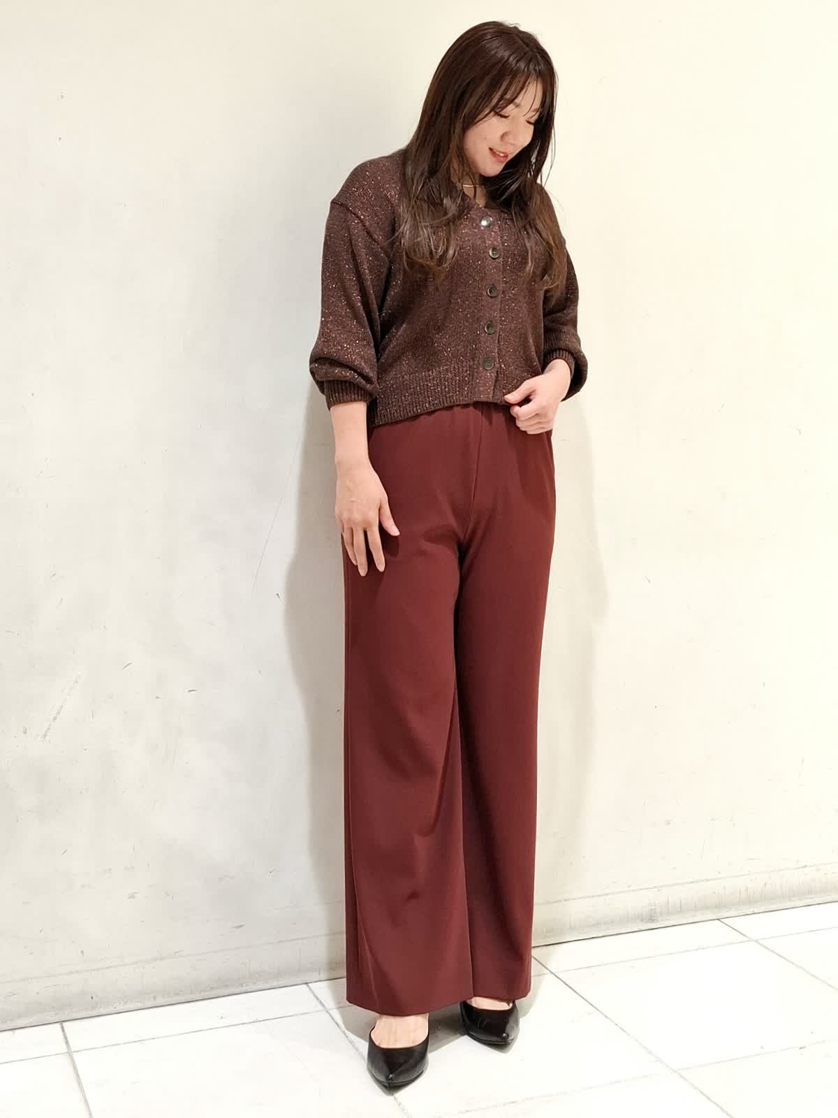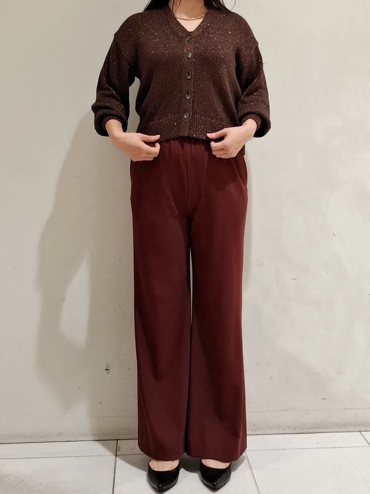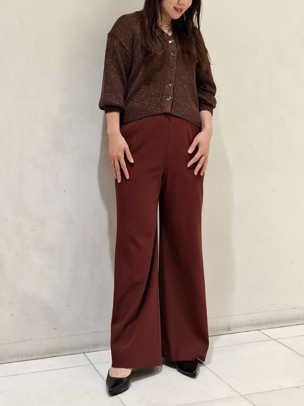【着用サイズ】カーディガン:フリーサイズ ブラウン パンツ:9号サイズ ボルドー ざっくり編みのカーディガンは、ドロップショルダーと程よくゆとりのあるシルエットで着やすいです。メタルボタンがポイントで、ラメ感が着るだけで華やかな印象を与えてくれます。パンツは、ウエストゴムではきやすく、シワになりにくいストレッチが効いた素材です。