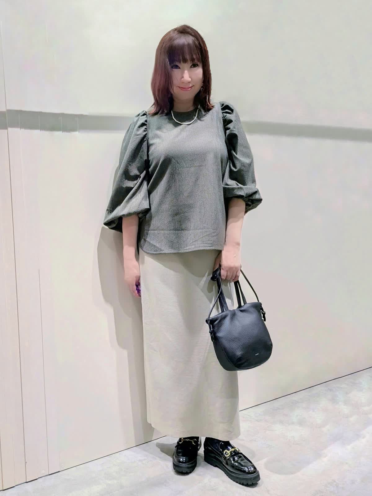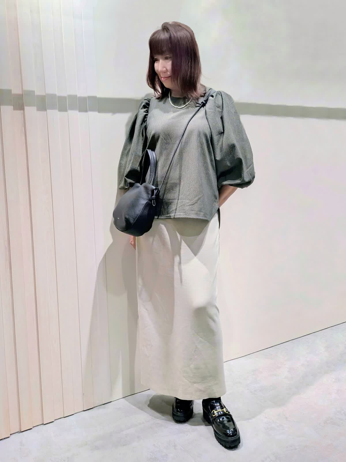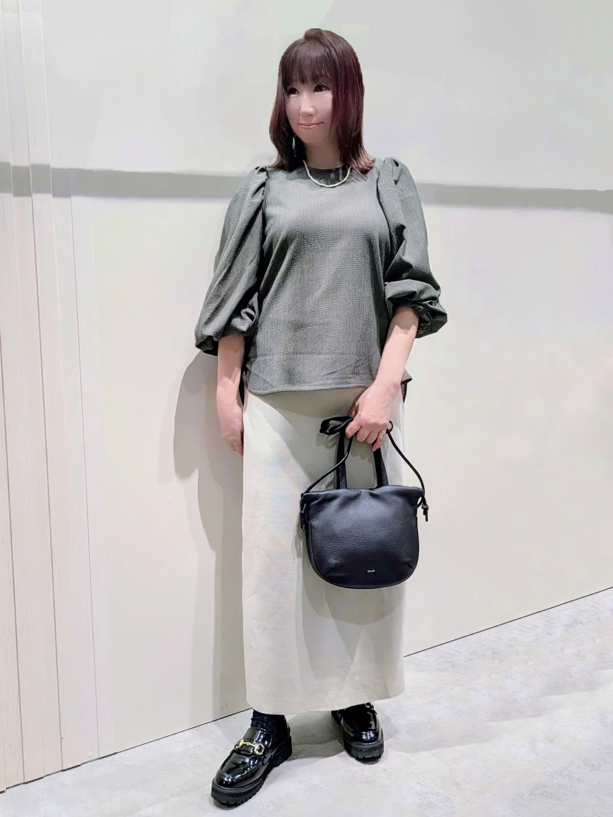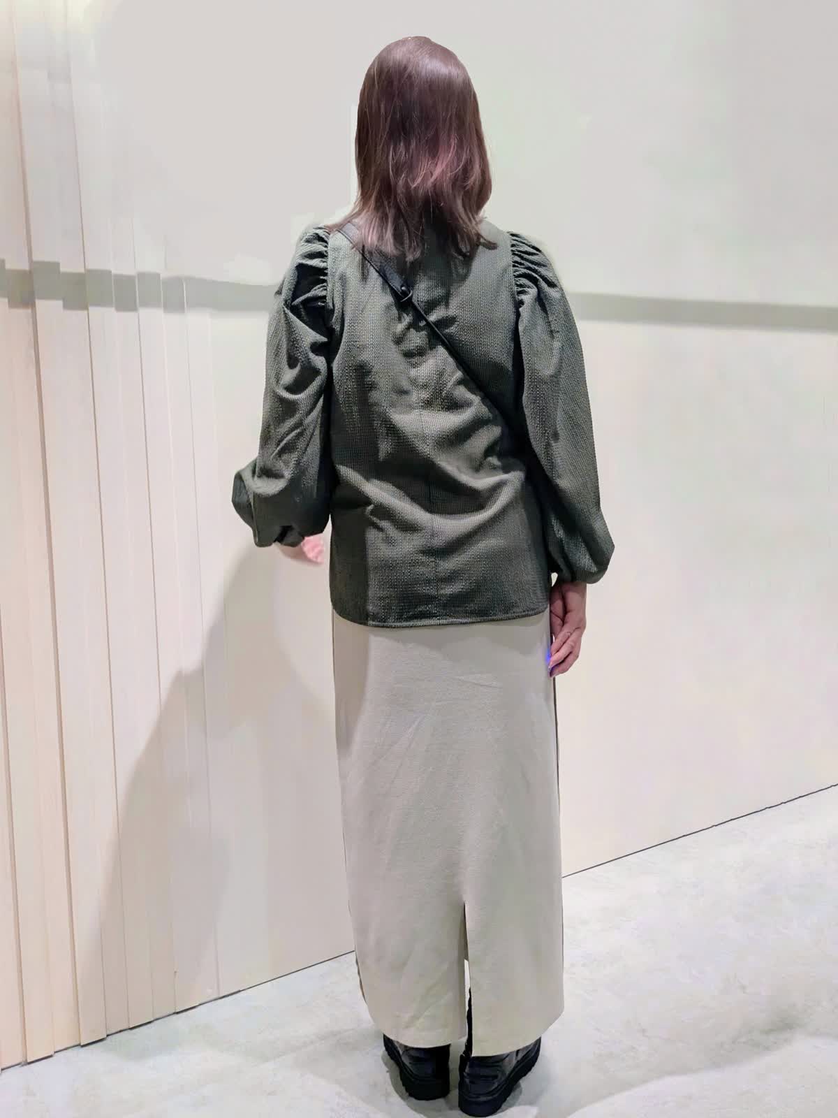 【着用サイズ】ブルゾン、プルオーバー、スカート:フリー 【着用カラー】ブルゾン:ブラック プルオーバー:カーキ スカート:ベージュ キレイ目お出掛けコーディネート ふんわりとしたボリュームのあるお袖が可愛いぃギャザースリーブのプルオーバーは、コンパクトなショルダーラインで華奢見えし、前後差のある裾は腰周りが隠れる嬉しい丈感です。ウエストインでもスタイリングを楽しめます。スカートは、ボディラインを拾いにくく後ろスリットで足さばきも良いです。ウエストゴム仕様でストレスフリーなはき心地です。