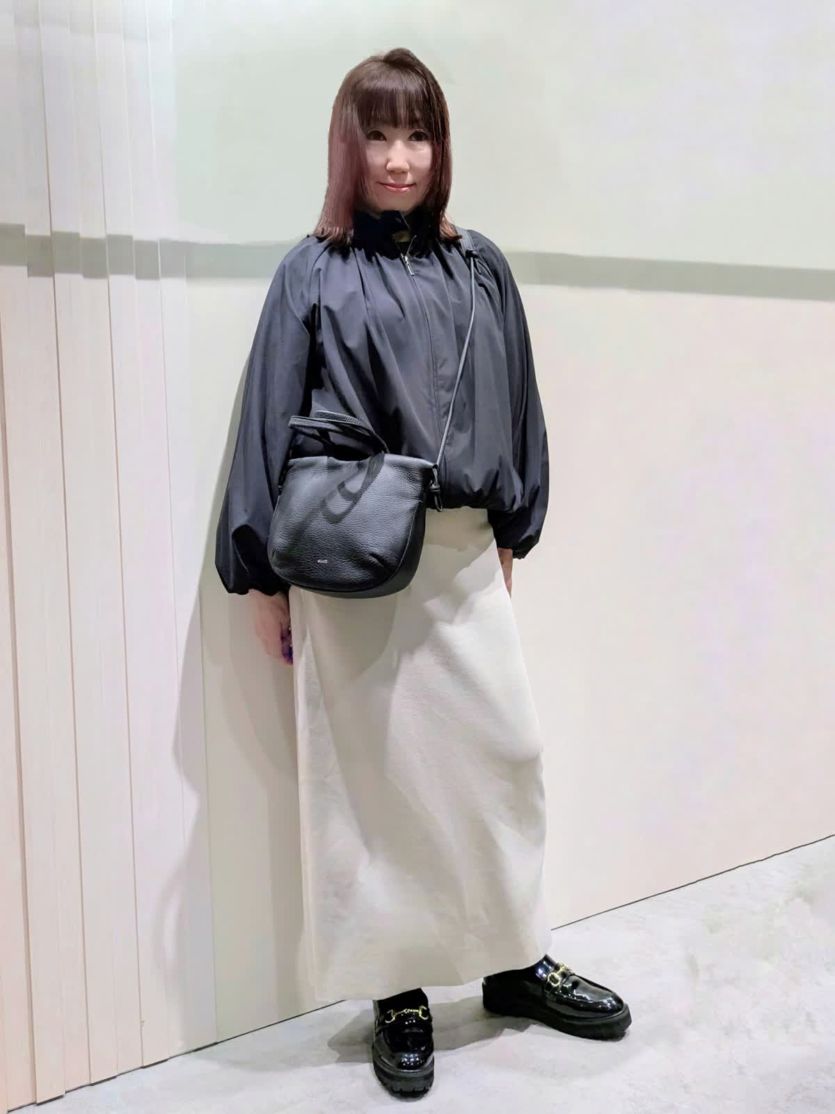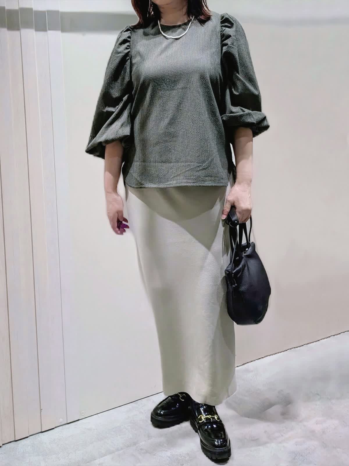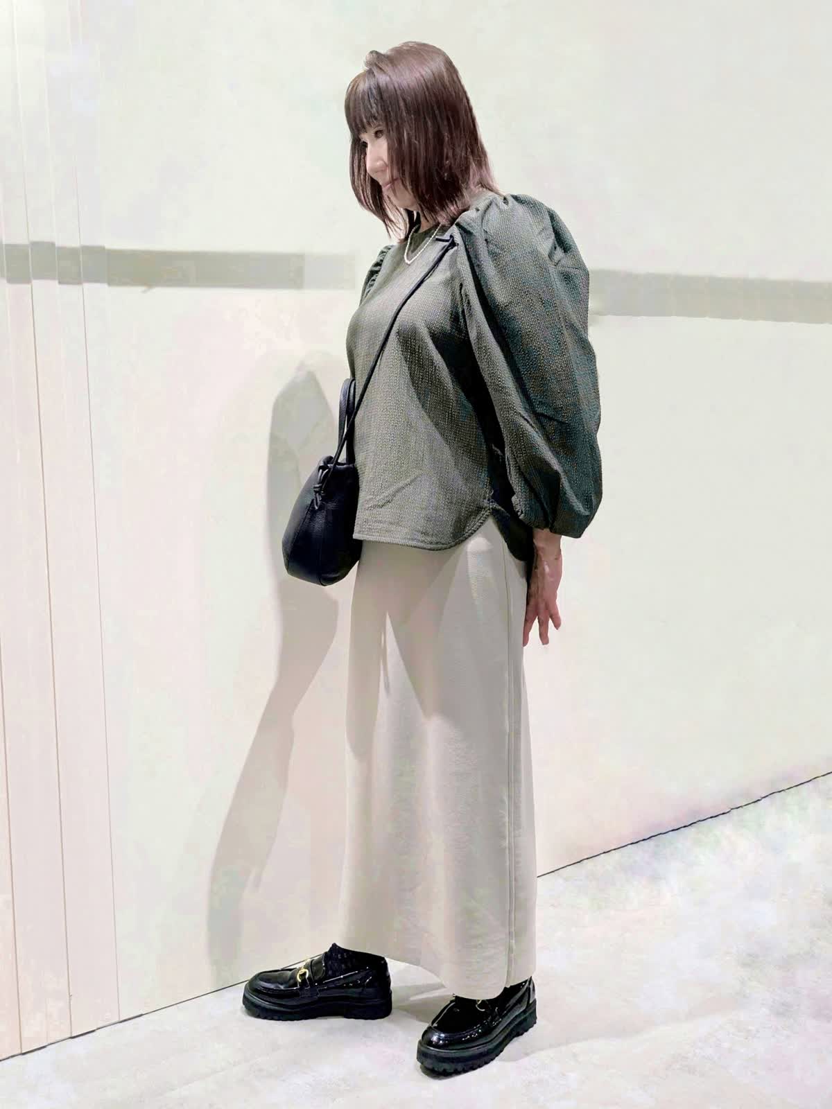 【着用サイズ】ブルゾン、プルオーバー、スカート:フリー 【着用カラー】ブルゾン:ブラック プルオーバー:カーキ スカート:ベージュ キレイ目お出掛けコーディネート ふんわりとしたボリュームのあるお袖が可愛いぃギャザースリーブのプルオーバーは、コンパクトなショルダーラインで華奢見えし、前後差のある裾は腰周りが隠れる嬉しい丈感です。ウエストインでもスタイリングを楽しめます。スカートは、ボディラインを拾いにくく後ろスリットで足さばきも良いです。ウエストゴム仕様でストレスフリーなはき心地です。