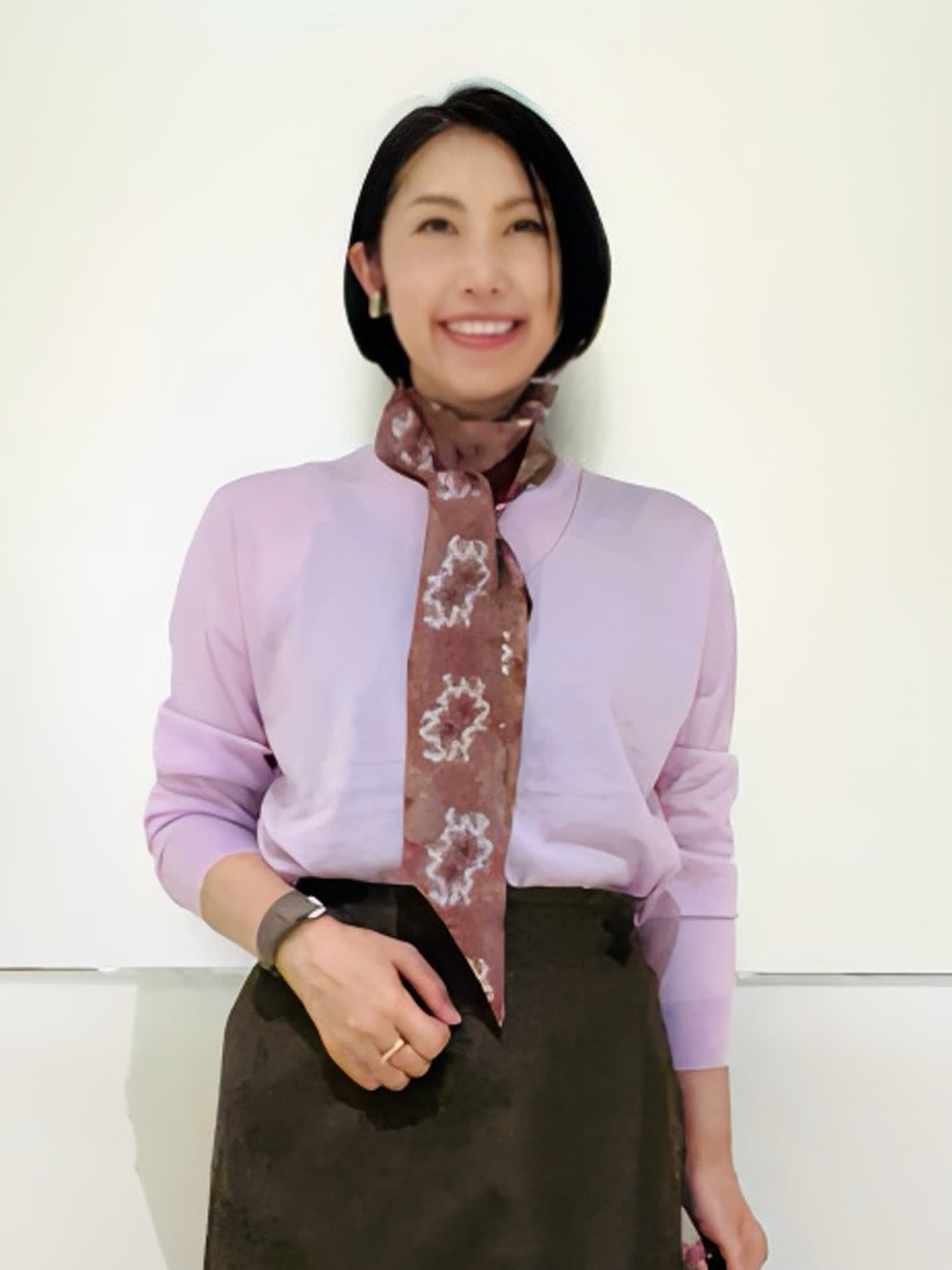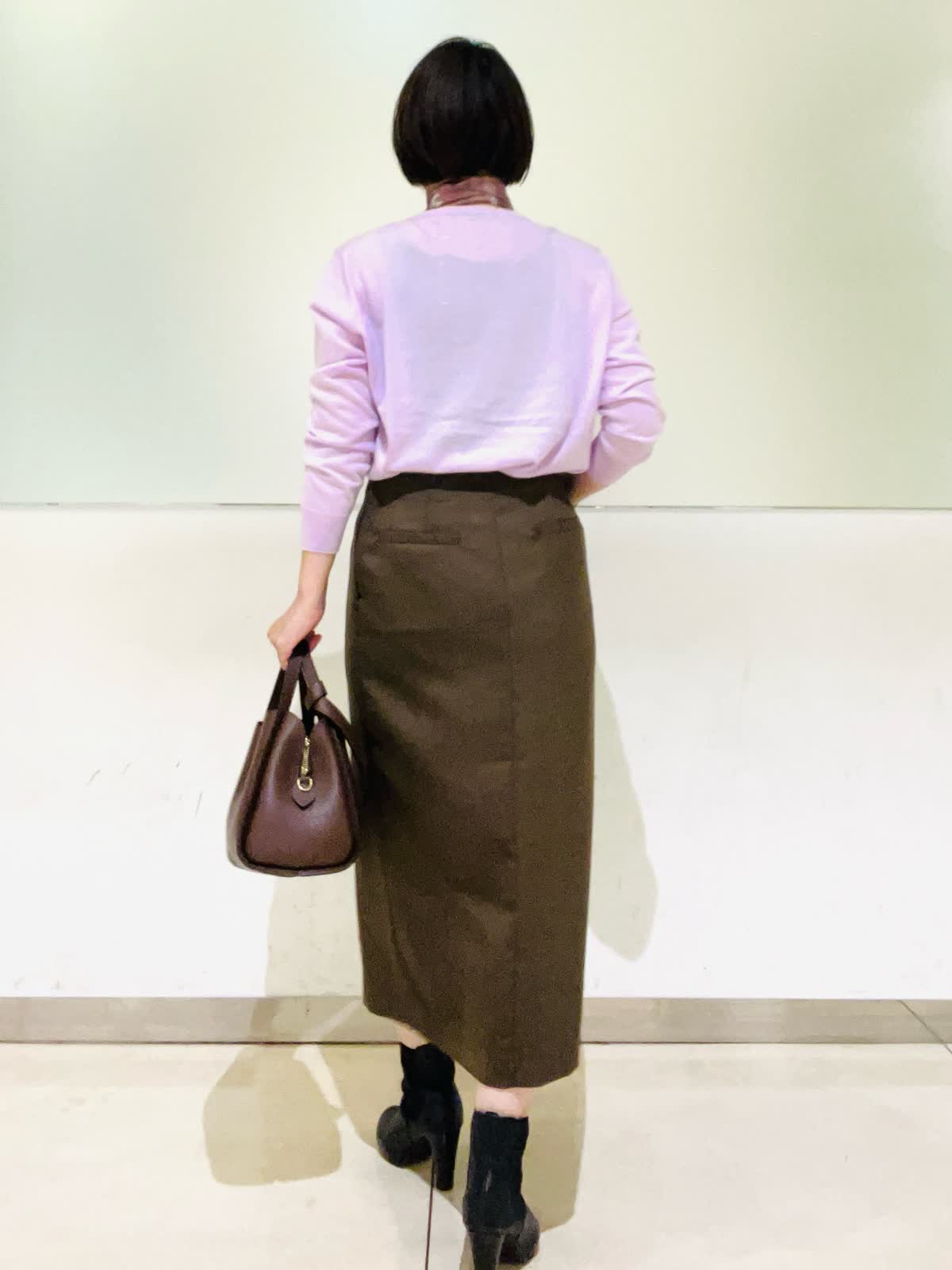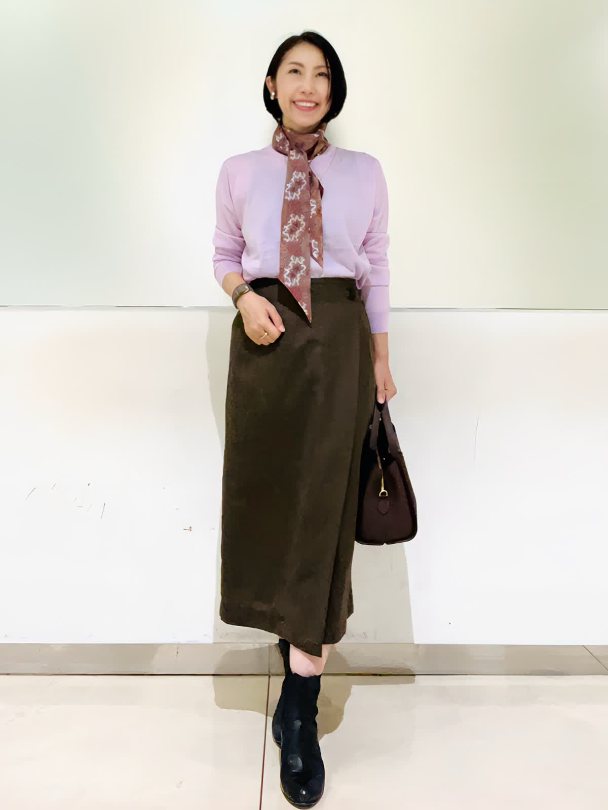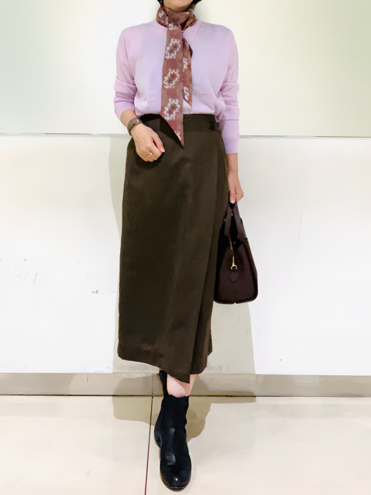 【着用アイテム】すべて9号 【着用カラー】ニット:ラベンダー スカート:ブラウン 秋のお出かけコーディネート。着心地の良いウールシルクのニット。ラベンダーのカラーが顔映りも良く華やかな雰囲気にしてくれます。大きすぎないジャストなサイズ感なので1枚で着ても可愛いし、ジャケットやコートのインナーにも着られます。こっくりとしたブラックのスカートと合わせた秋らしいスタイリングです。