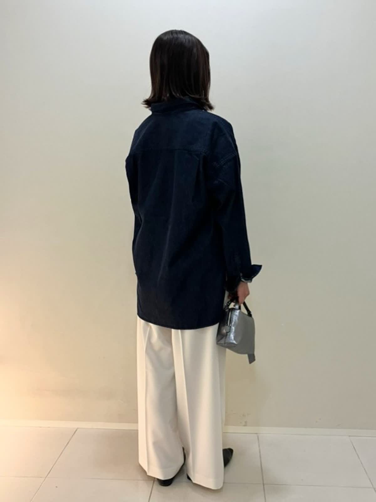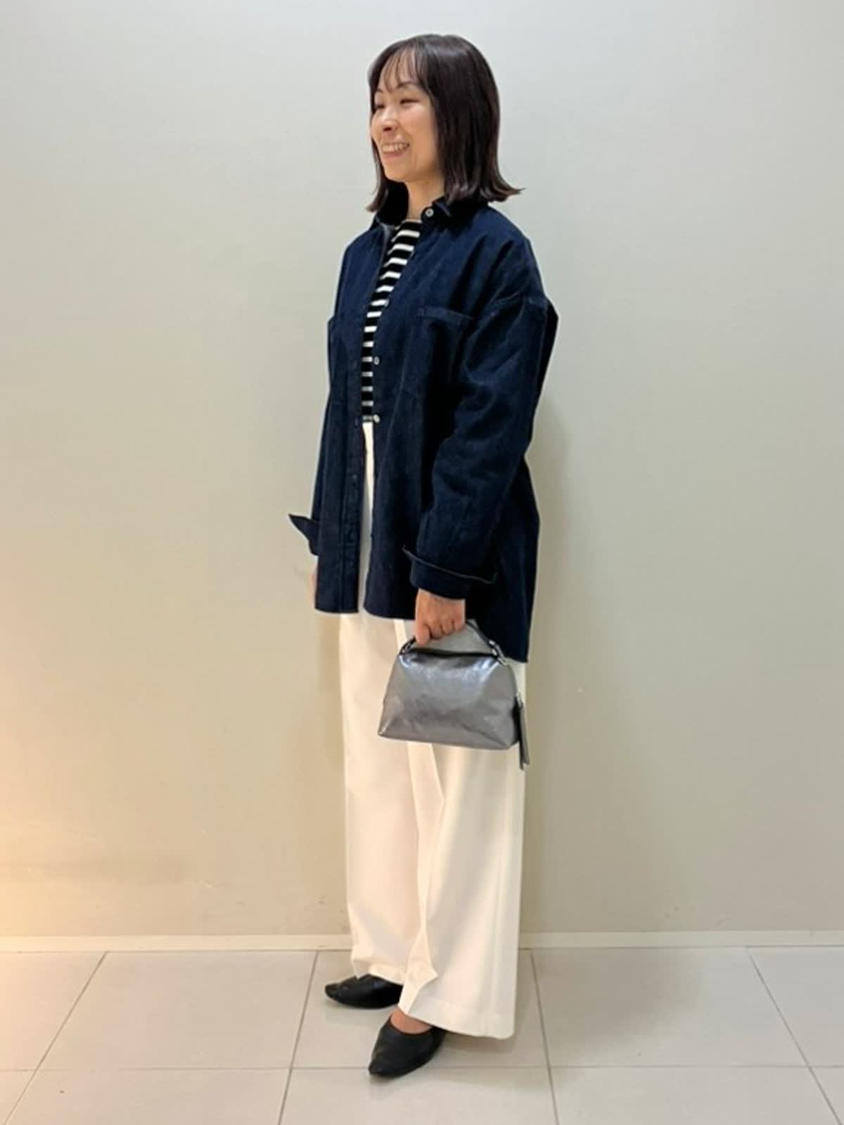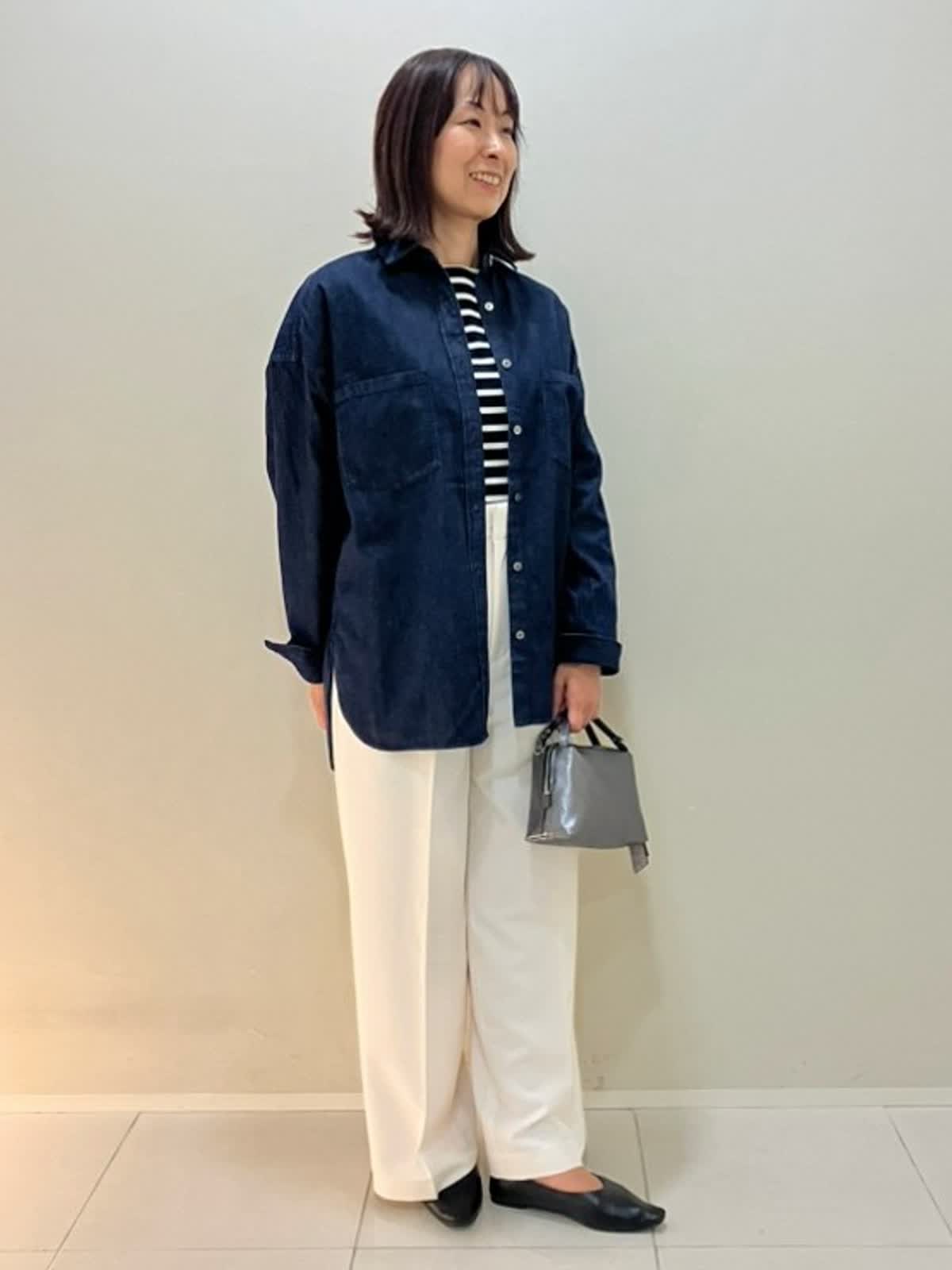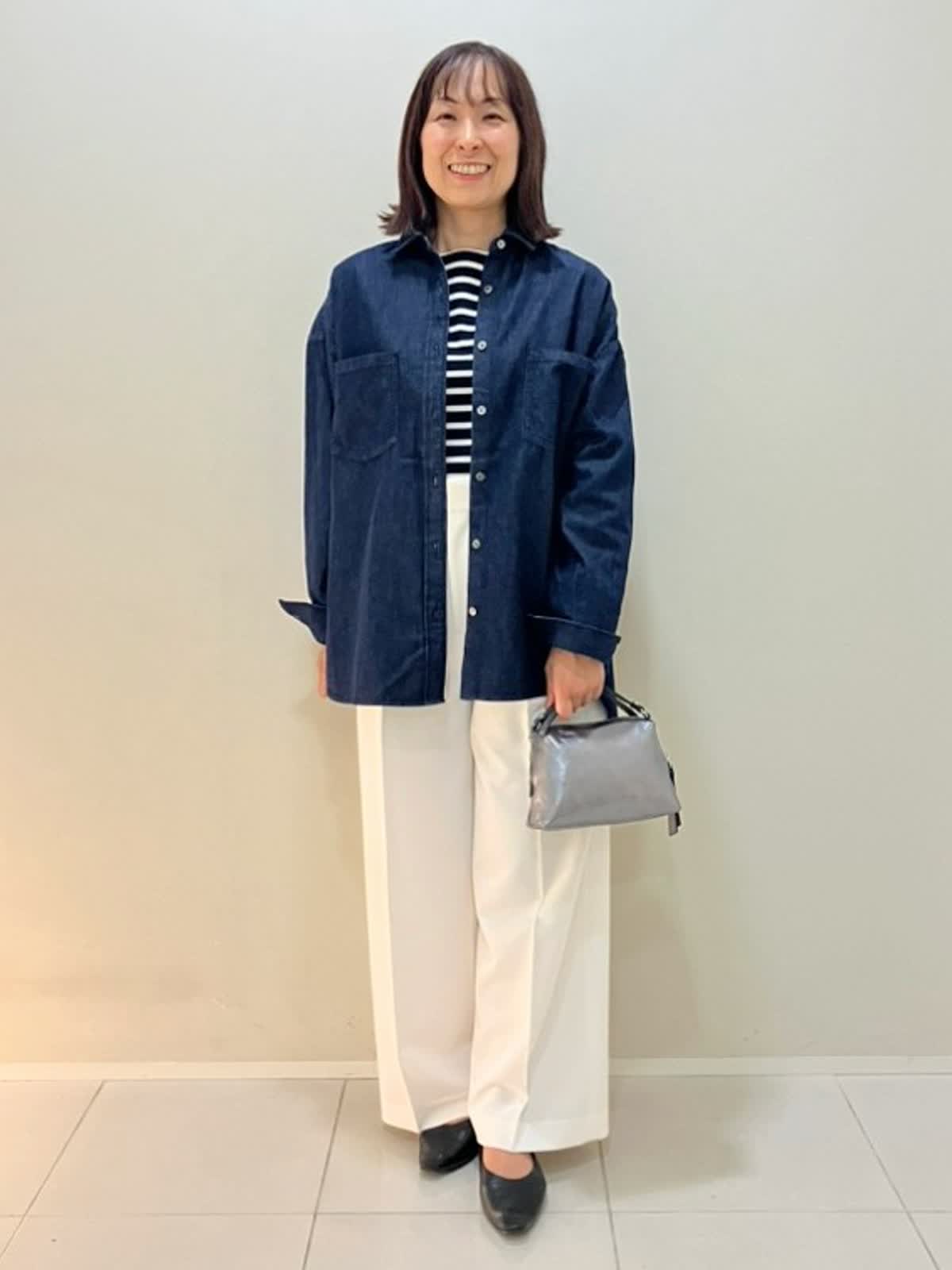 【着用サイズ】シャツ:フリー カットソー:フリー パンツ:7号【着用カラー】シャツ:インディゴ カットソー:ブラック パンツ:オフホワイト 秋のおでかけスタイル オーバーサイズのデニムシャツは綿100%で厚すぎす、サラッと羽織っていただけるアイテム。ボーダーカットソーも綿100%で着心地が良いです。ワイドパンツはウエストゴム仕様なので、見た目よりも楽に動きやすくなっています。