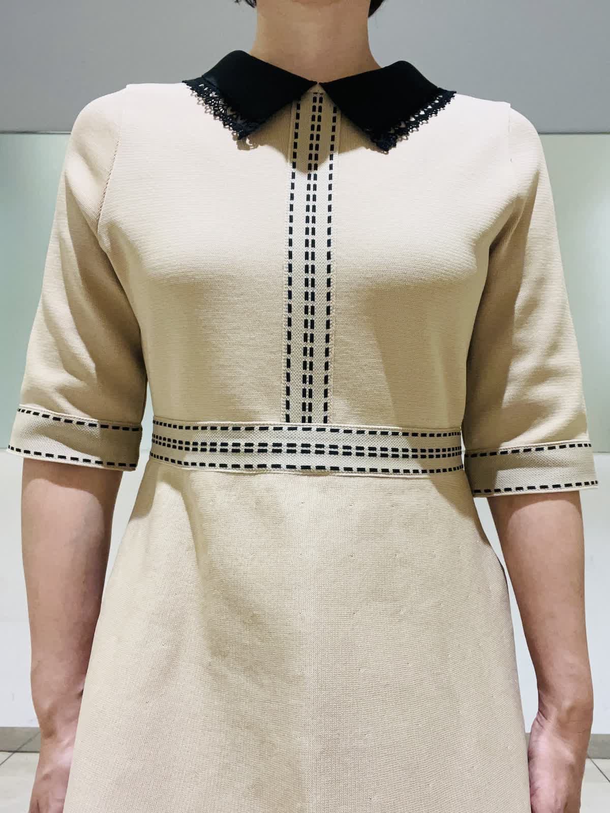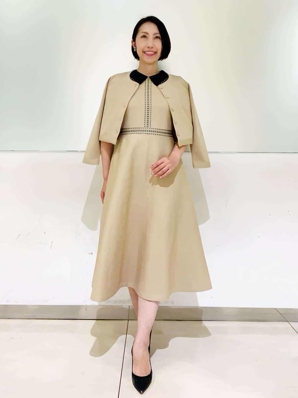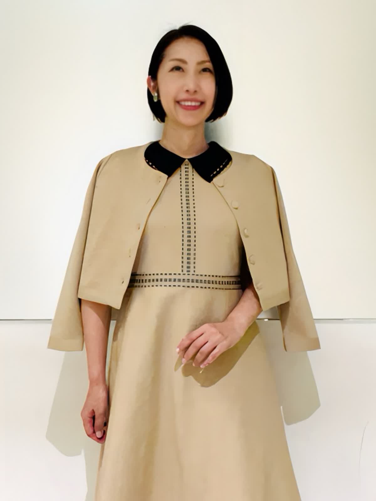 【着用アイテム/カラー】ワンピース、カーディガン:9号/ベージュ お出かけからセレモニーイベントまで幅広く使える褒められニットワンピース。レースの付いた衿が可愛いデザイン。ベージュにブラックの配色の衿とステッチがポイントになり、コーディネートを引き締めてくれます。ニット素材でもはり感のある生地で体のラインが出にくいのも嬉しいポイント。同素材のカーディガンと2ピースで着ればきちんと感もアップし、七五三などのセレモニーイベントにもお使いいただけます。
