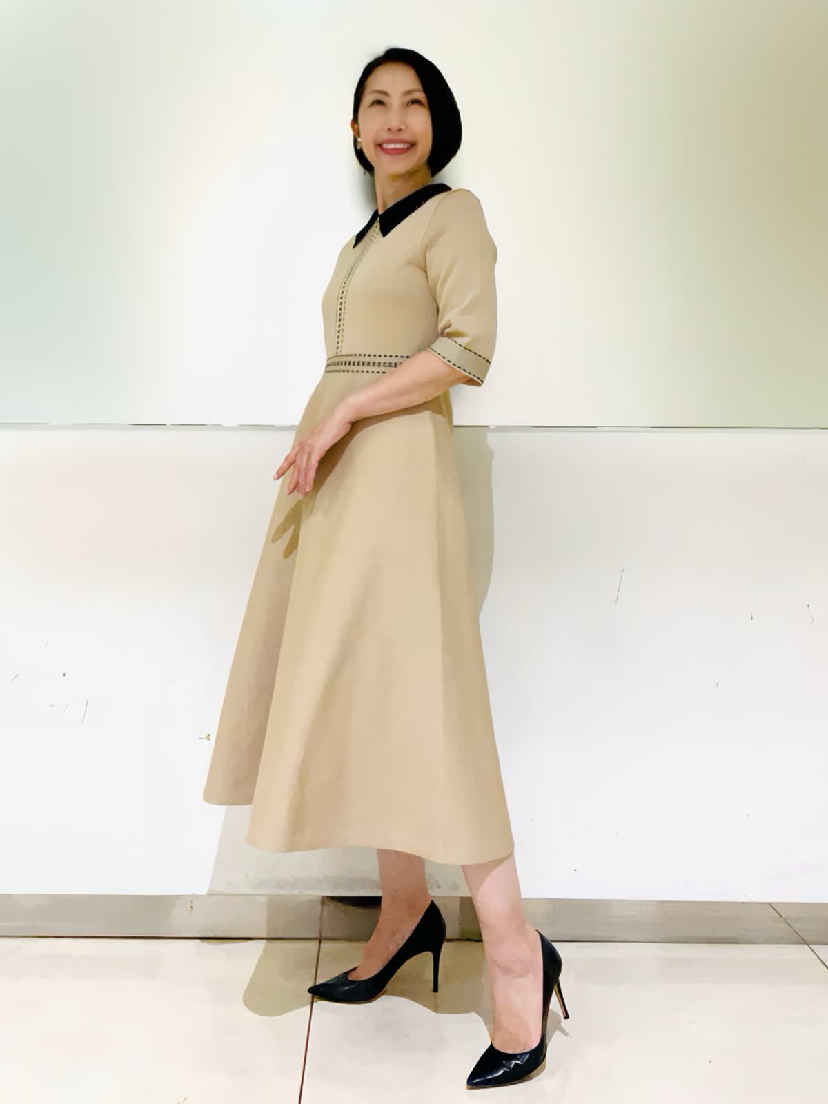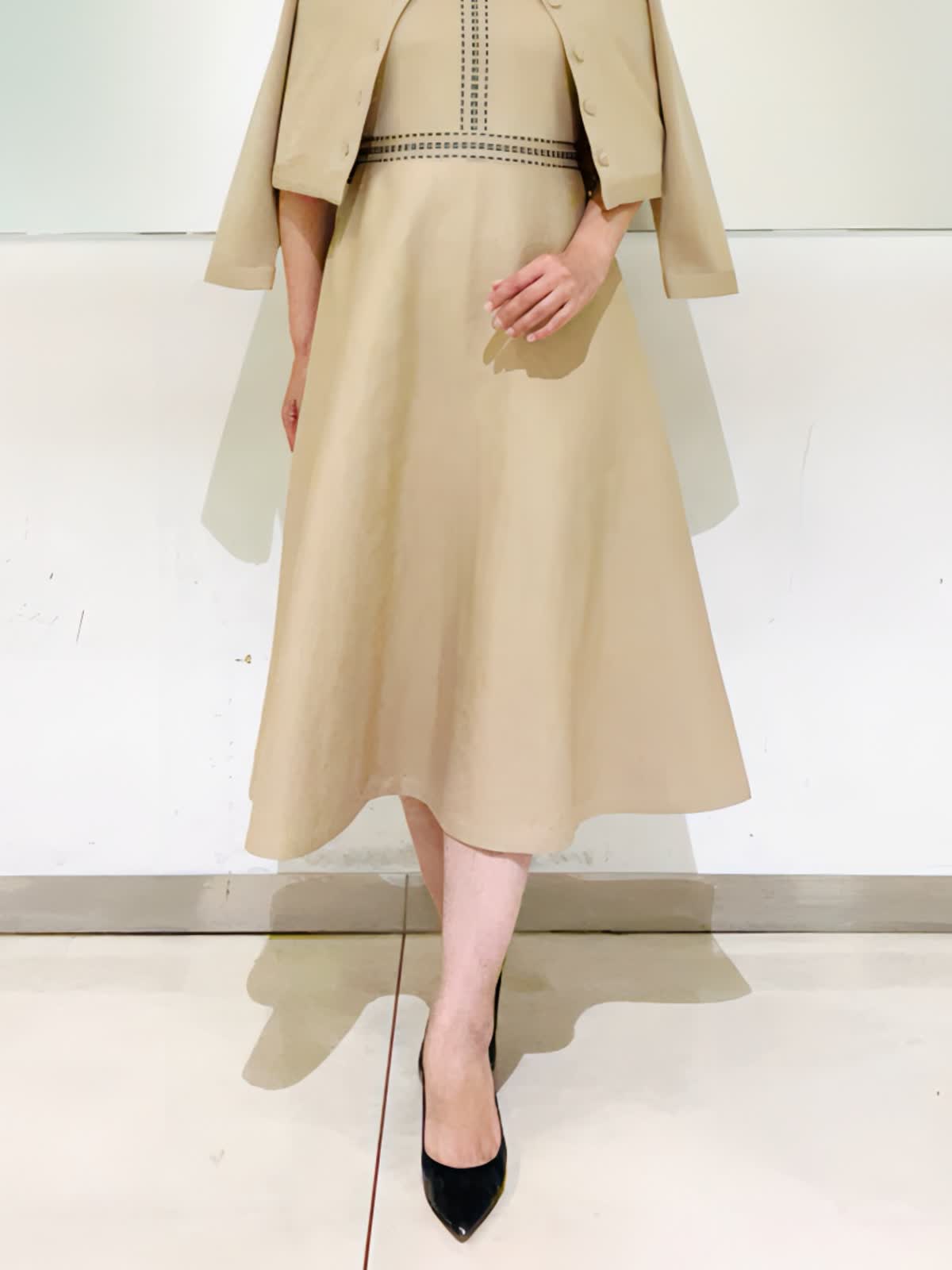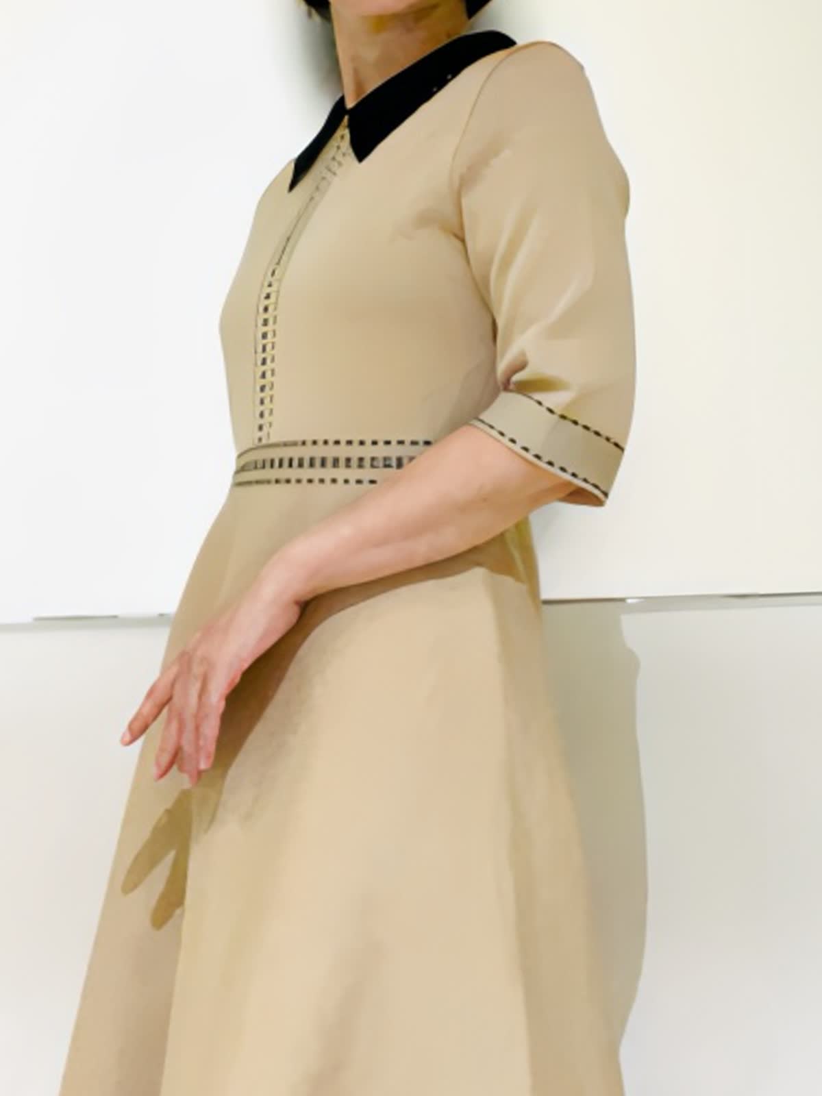 【着用アイテム/カラー】ワンピース、カーディガン:9号/ベージュ お出かけからセレモニーイベントまで幅広く使える褒められニットワンピース。レースの付いた衿が可愛いデザイン。ベージュにブラックの配色の衿とステッチがポイントになり、コーディネートを引き締めてくれます。ニット素材でもはり感のある生地で体のラインが出にくいのも嬉しいポイント。同素材のカーディガンと2ピースで着ればきちんと感もアップし、七五三などのセレモニーイベントにもお使いいただけます。