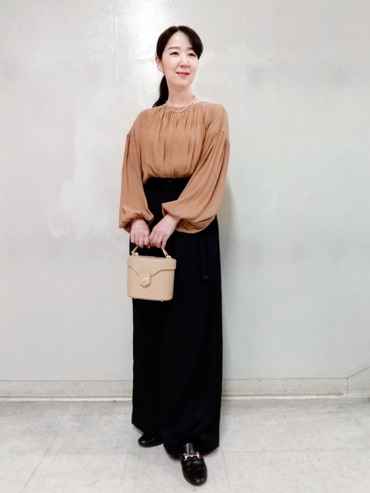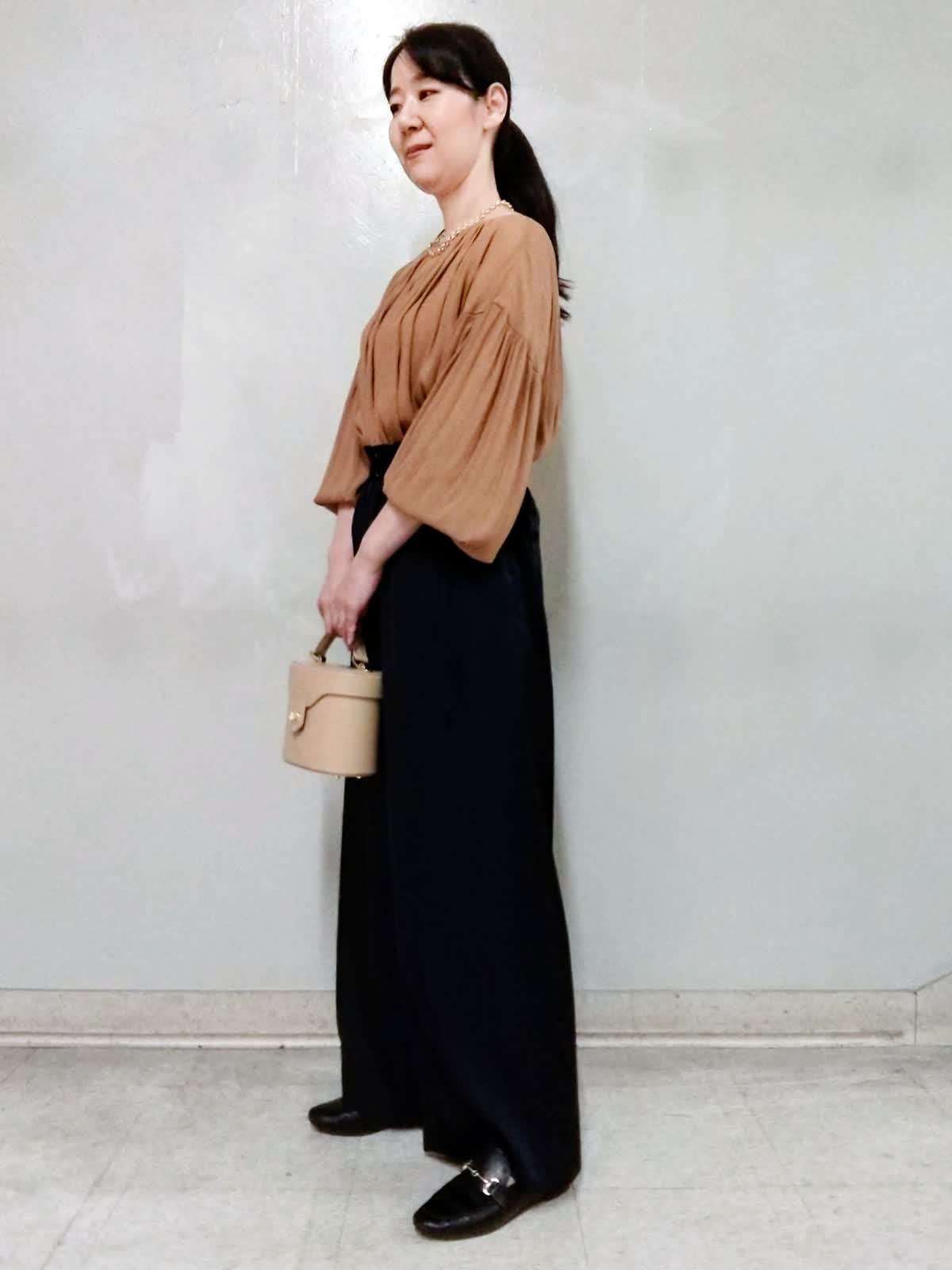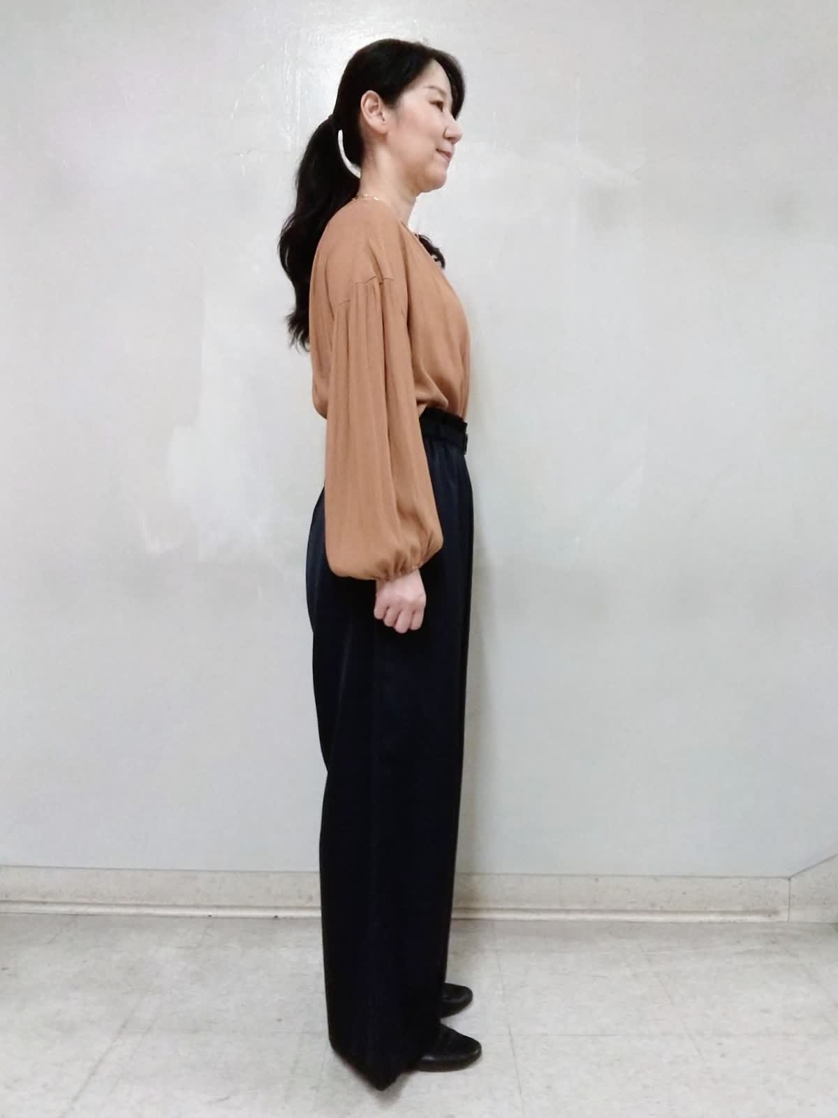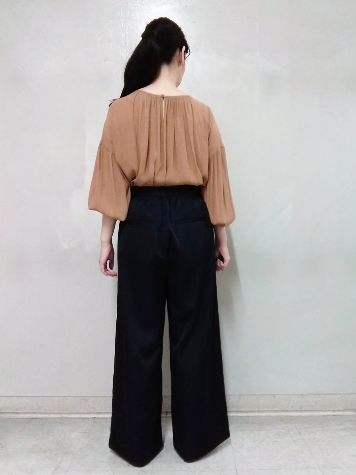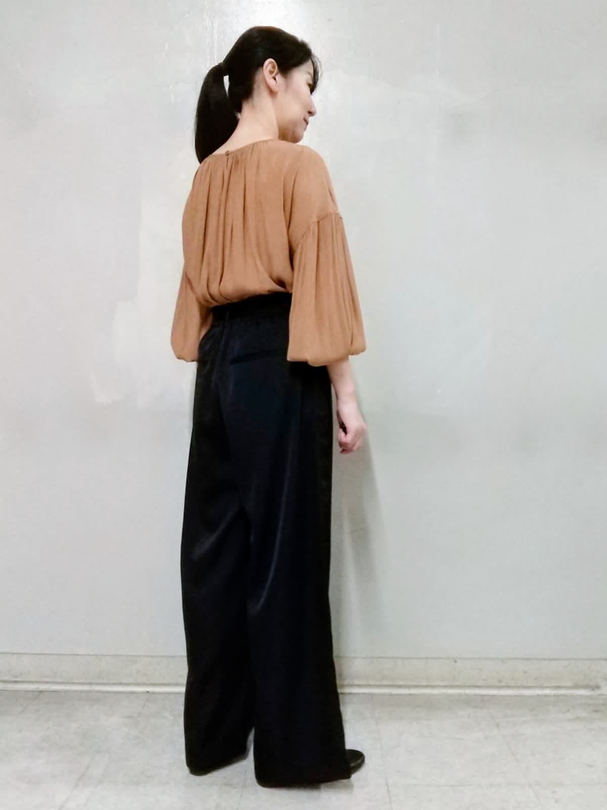 【着用サイズ】ブラウス:フリー、パンツ:9号 【着用カラー】ブラウス:オレンジ、パンツ:ネイビー お出かけスタイル。ライトな素材で艶感のあるギャザーブラウスとサテンパンツはお出かけにぴったり!ブラウスは袖が上げ下げ出来る袖口ゴム仕様。ほどよいギャザーがボディラインをカバーして華やかな印象になります。パンツはウエストオールゴム仕様。ハイウエストで脚長効果バツグンです。どちらも締め付け感がなくラクな着心地です。