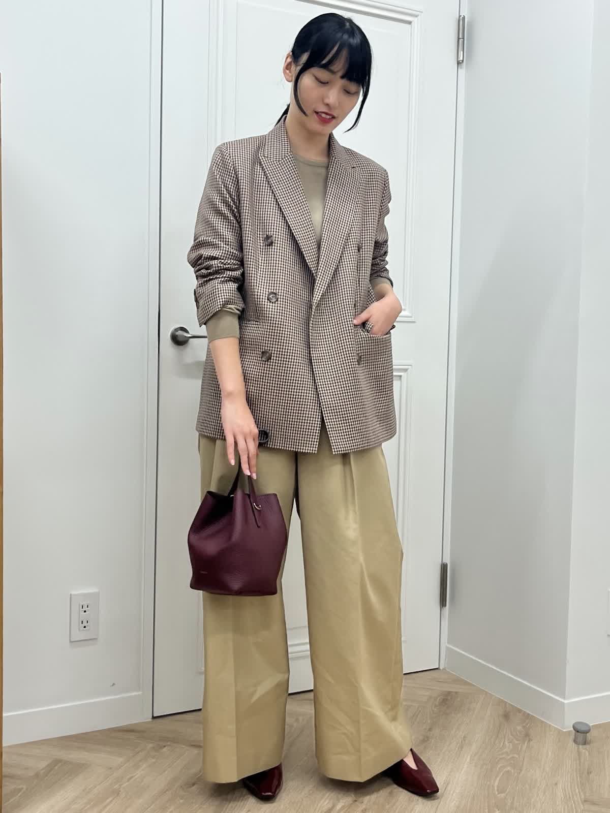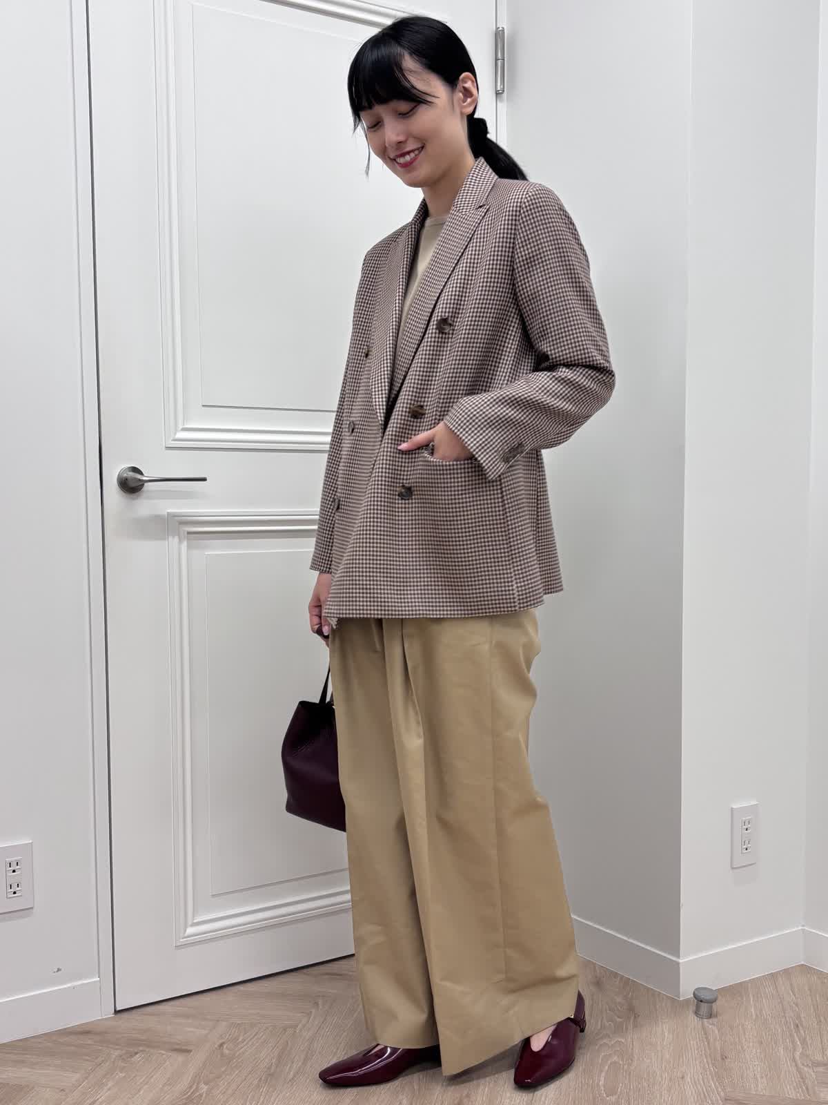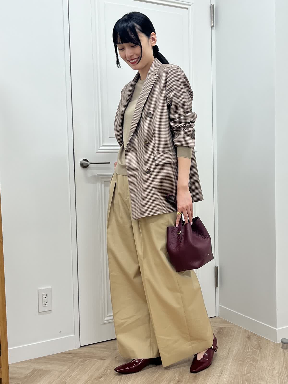【着用カラー】ジャケット:柄小、ニット:キャメル、パンツ:ベージュ、バッグ:ワイン 【着用サイズ】ジャケット:9号、ニット:9号、パンツ:9号 コーディネートのテーマは休日のお出かけコーデです。エディターの三尋木さんコラボのジャケットは身幅が広く、ゆったりと着られるのがポイント。アウター感覚で、一枚羽織るだけでサマになるのが嬉しい。パンツだけでなく、ワンピースなど何に合わせても大活躍間違いなしのアイテムです。 同じく三尋木さんコラボのチノパンは、かなりワイドで身体の線を拾わないので、着痩せ効果抜群。オフィスでもカジュアルなシーンでも使えるのも好ポイント。今回は中に薄手のニットを合わせて、秋らしいコーディネートにしてみました。靴とバッグは同じ色で合わせて、休日のおでかけにいかがですか?