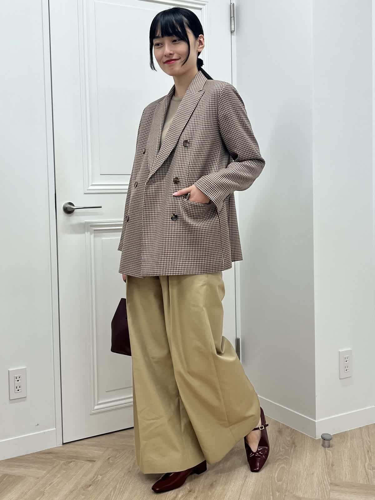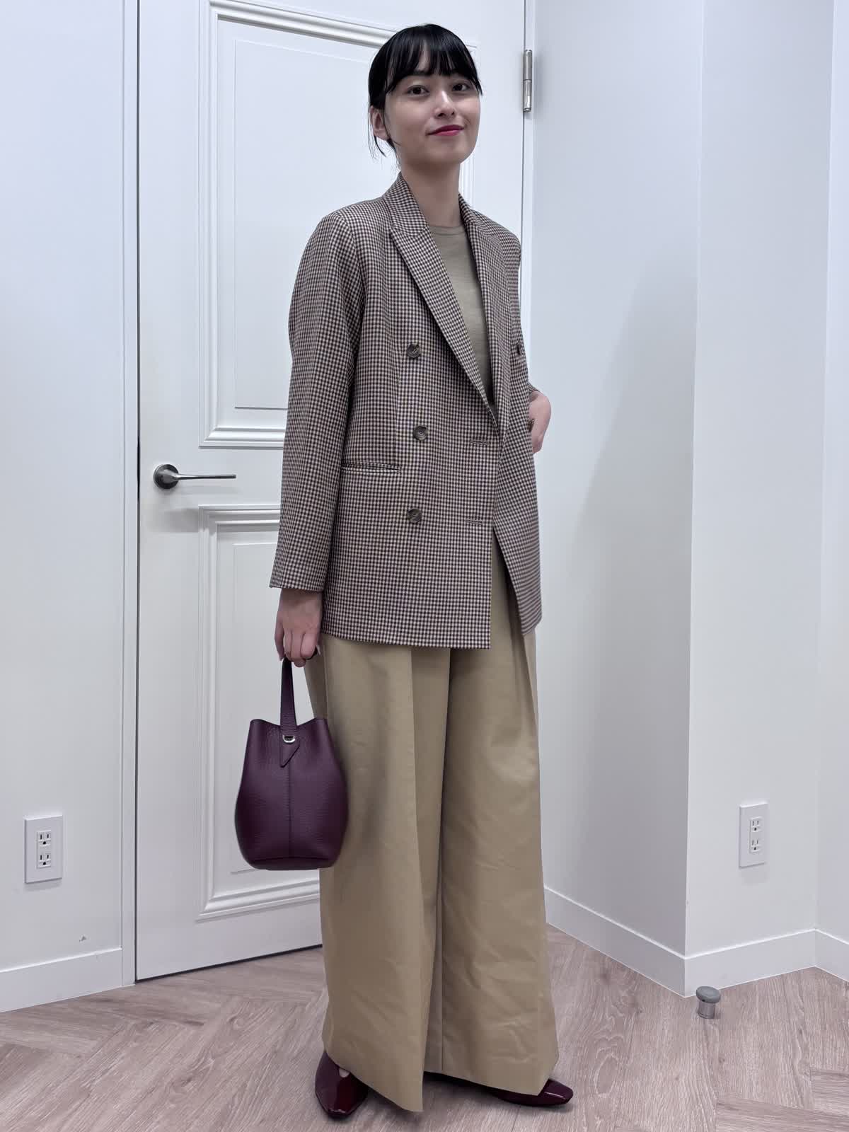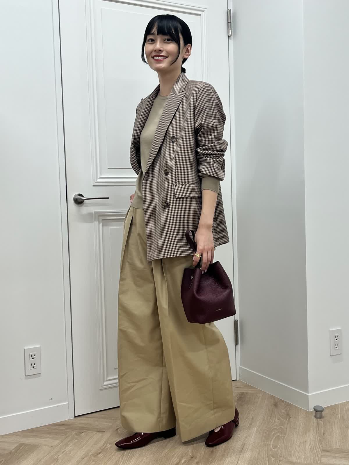 【着用カラー】ジャケット:柄小、ニット:キャメル、パンツ:ベージュ、バッグ:ワイン 【着用サイズ】ジャケット:9号、ニット:9号、パンツ:9号 コーディネートのテーマは休日のお出かけコーデです。エディターの三尋木さんコラボのジャケットは身幅が広く、ゆったりと着られるのがポイント。アウター感覚で、一枚羽織るだけでサマになるのが嬉しい。パンツだけでなく、ワンピースなど何に合わせても大活躍間違いなしのアイテムです。 同じく三尋木さんコラボのチノパンは、かなりワイドで身体の線を拾わないので、着痩せ効果抜群。オフィスでもカジュアルなシーンでも使えるのも好ポイント。今回は中に薄手のニットを合わせて、秋らしいコーディネートにしてみました。靴とバッグは同じ色で合わせて、休日のおでかけにいかがですか?