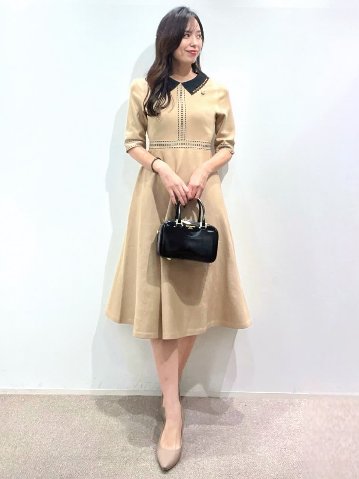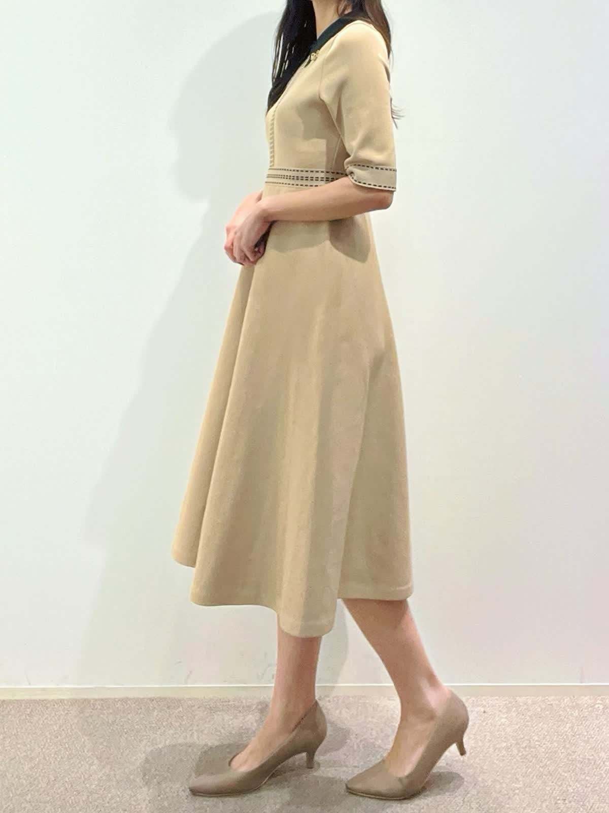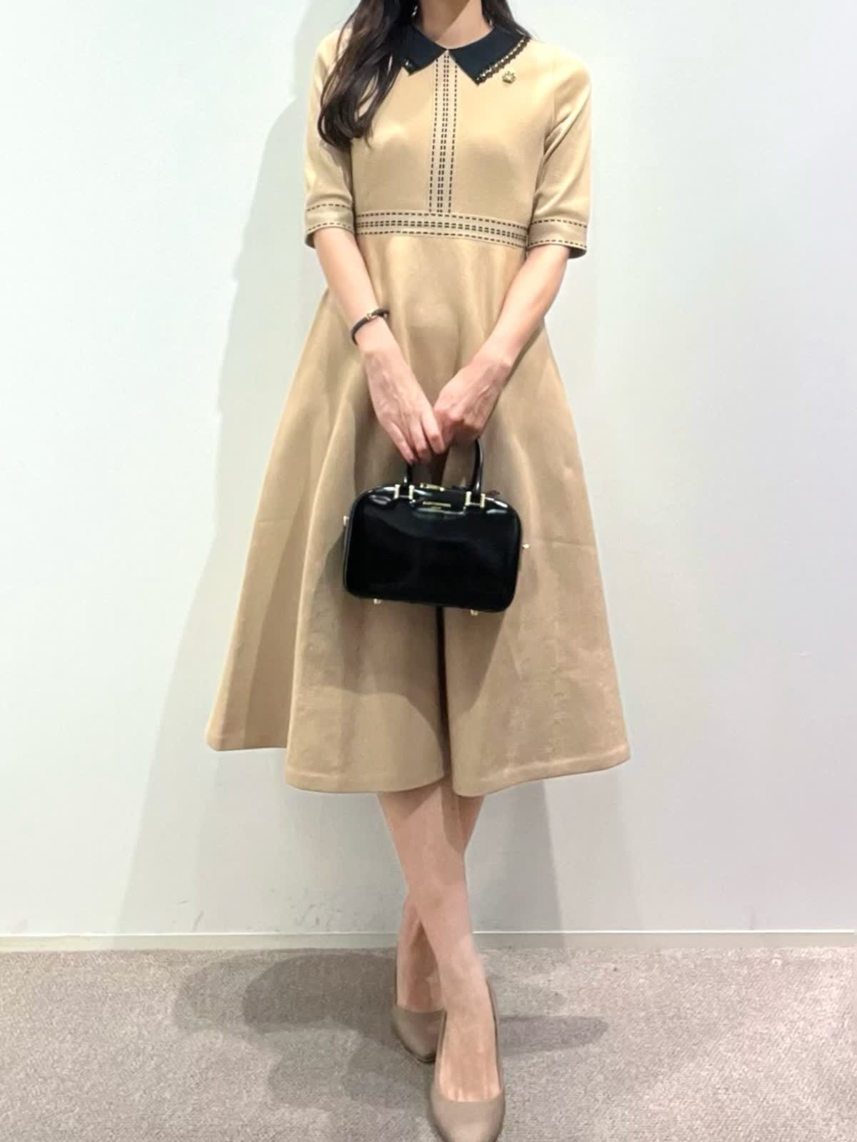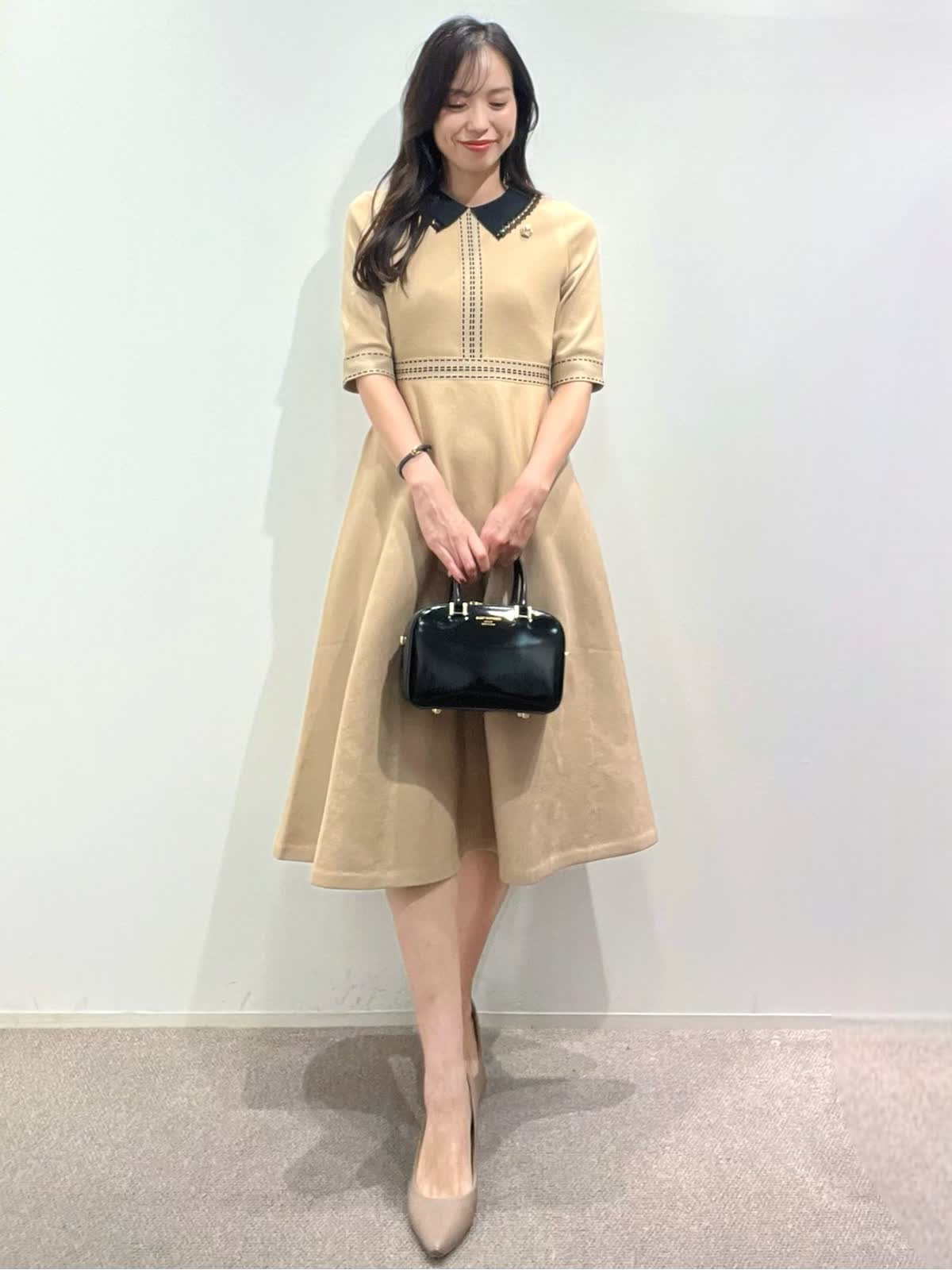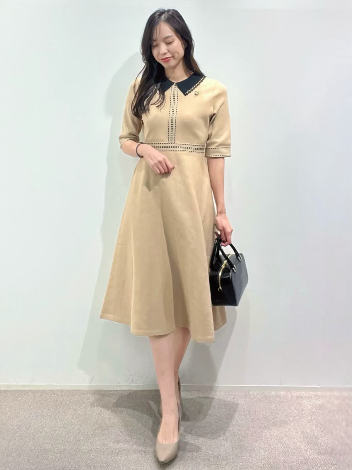 【着用サイズ】ワンピース:9号 【着用カラー】ワンピース:ベージュ バッグ:ブラック 「上品ベージュでお呼ばれワンピーススタイル」 ベージュとブラックの配色が上品で柔らかい印象のニットワンピース。 ブラックの襟元が引き締め効果もあり、ステッチラインもポイント。フィット&フレアのデザインで女性らしいシルエットと、スタイルアップが叶います。着心地の良いストレッチ性の素材と、ウォッシャブル可能も嬉しいポイント。お仕事や、お呼ばれのシーンなど1枚で品良く華やかな印象のワンピースです。