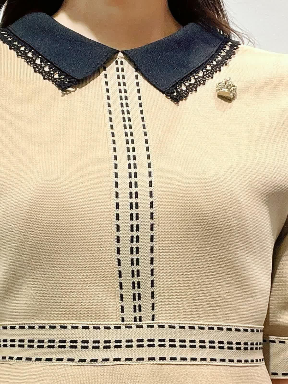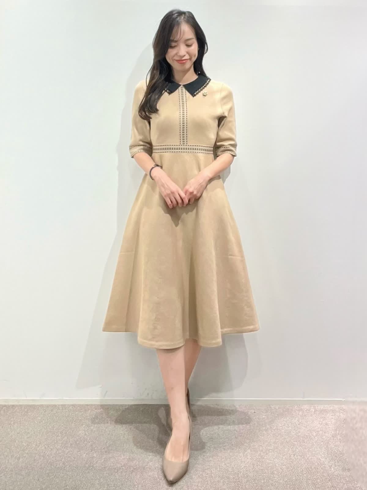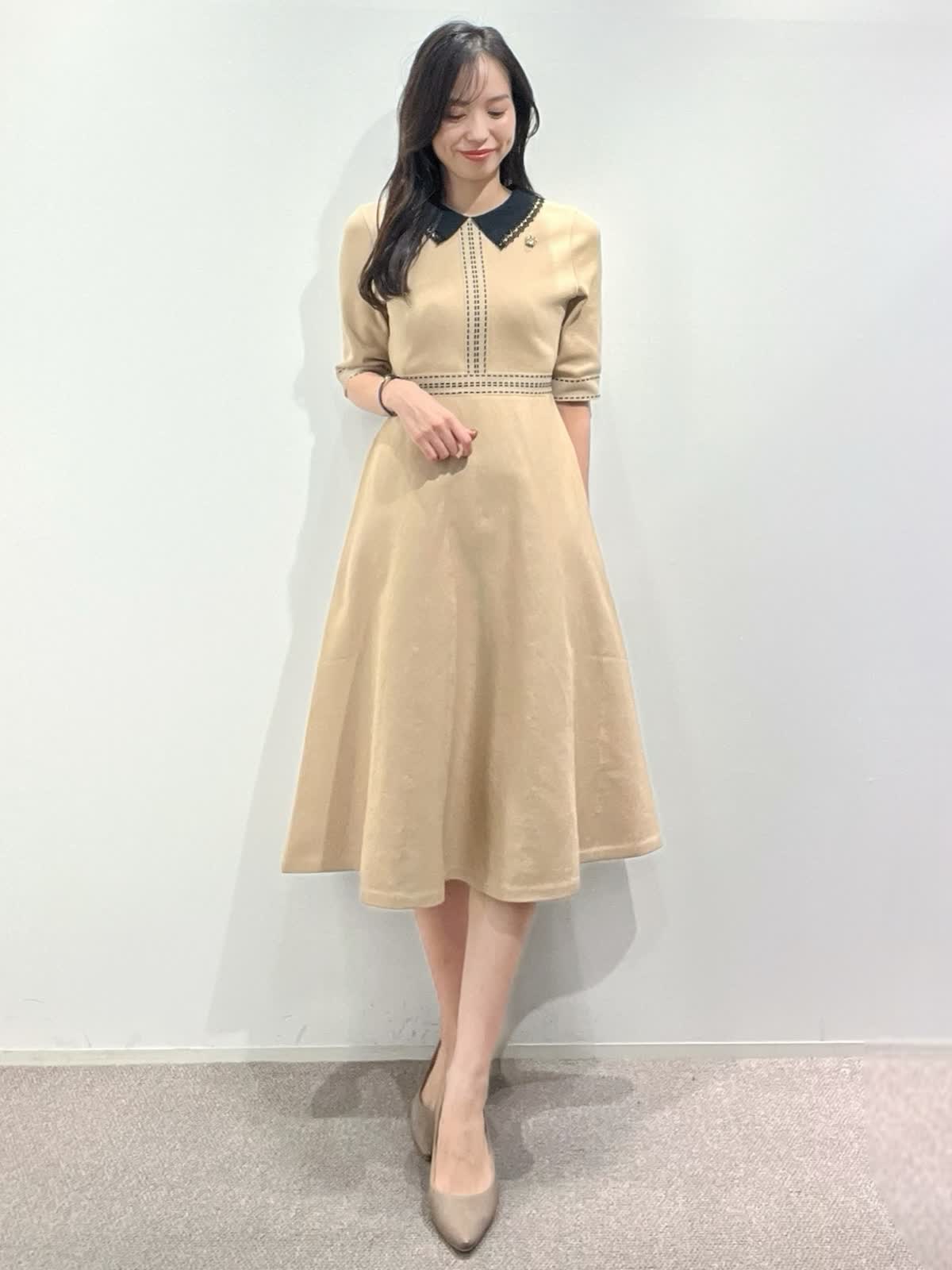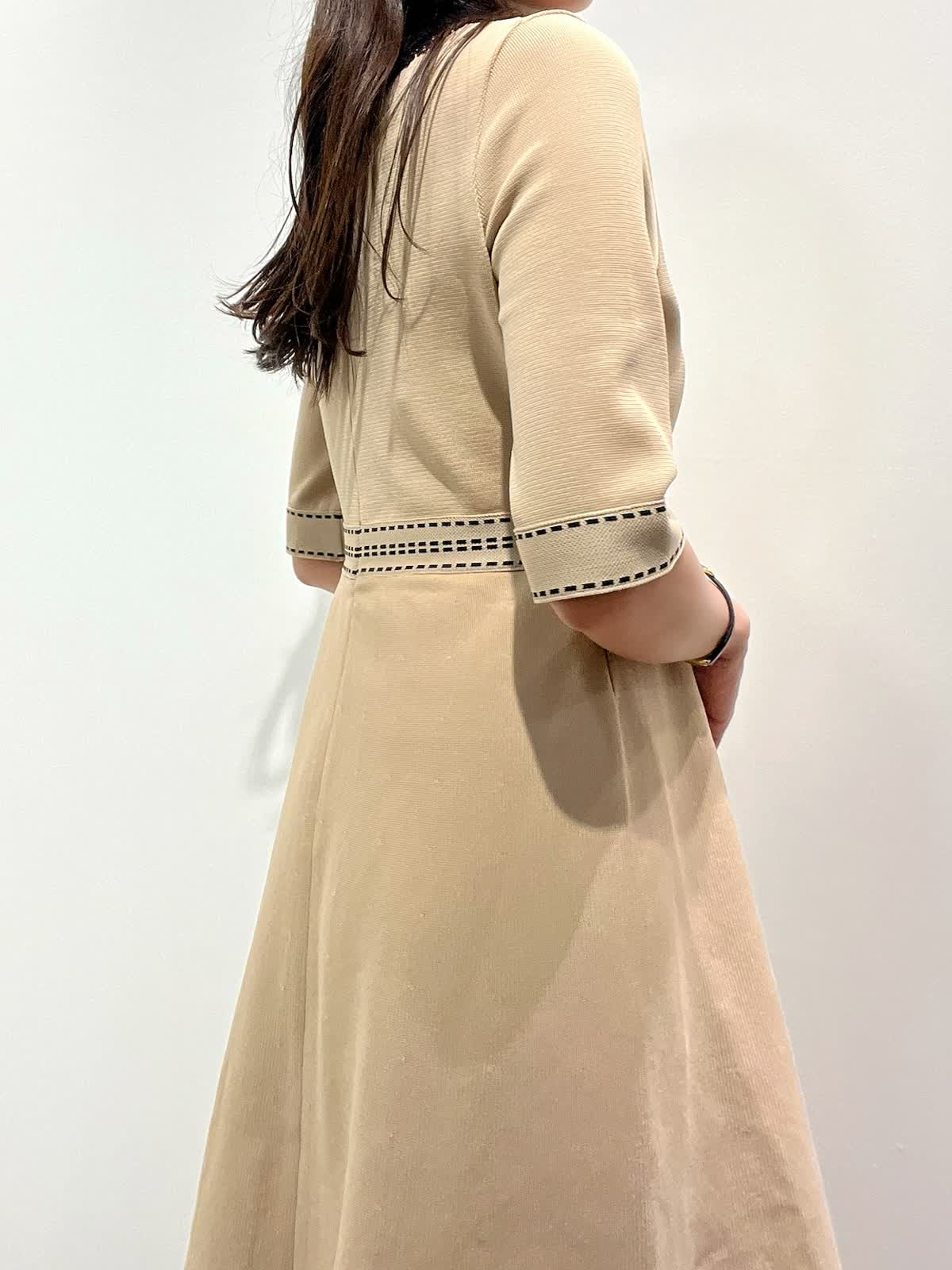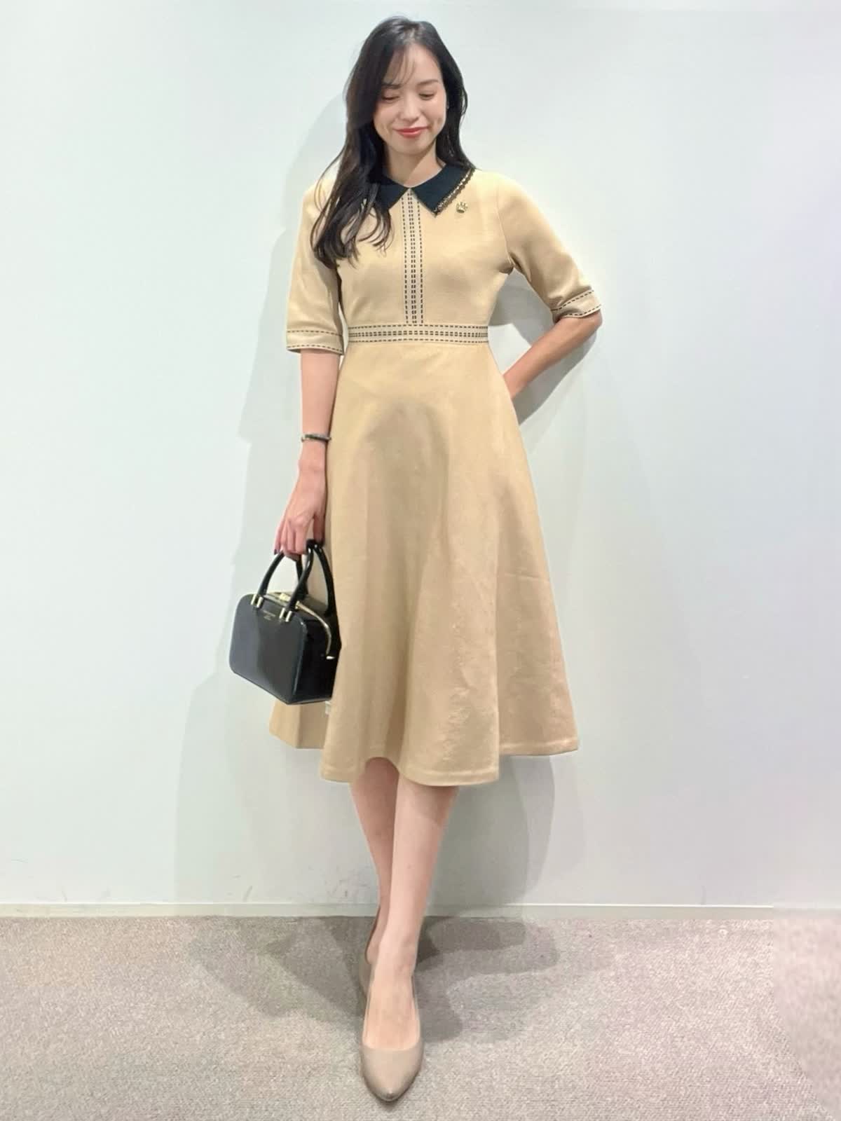 【着用サイズ】ワンピース:9号 【着用カラー】ワンピース:ベージュ バッグ:ブラック 「上品ベージュでお呼ばれワンピーススタイル」 ベージュとブラックの配色が上品で柔らかい印象のニットワンピース。 ブラックの襟元が引き締め効果もあり、ステッチラインもポイント。フィット&フレアのデザインで女性らしいシルエットと、スタイルアップが叶います。着心地の良いストレッチ性の素材と、ウォッシャブル可能も嬉しいポイント。お仕事や、お呼ばれのシーンなど1枚で品良く華やかな印象のワンピースです。