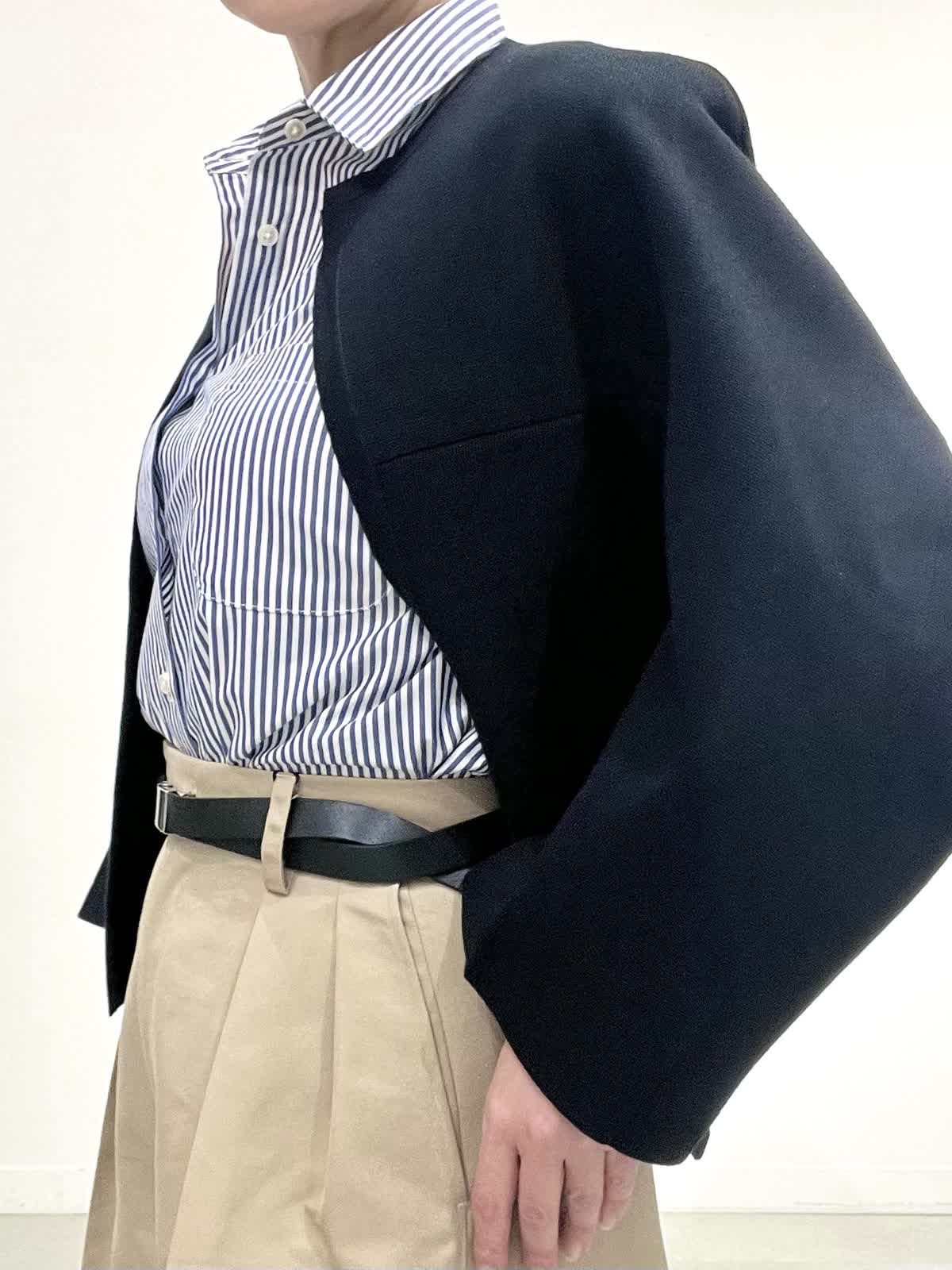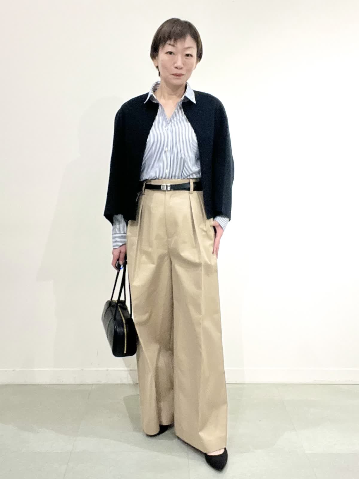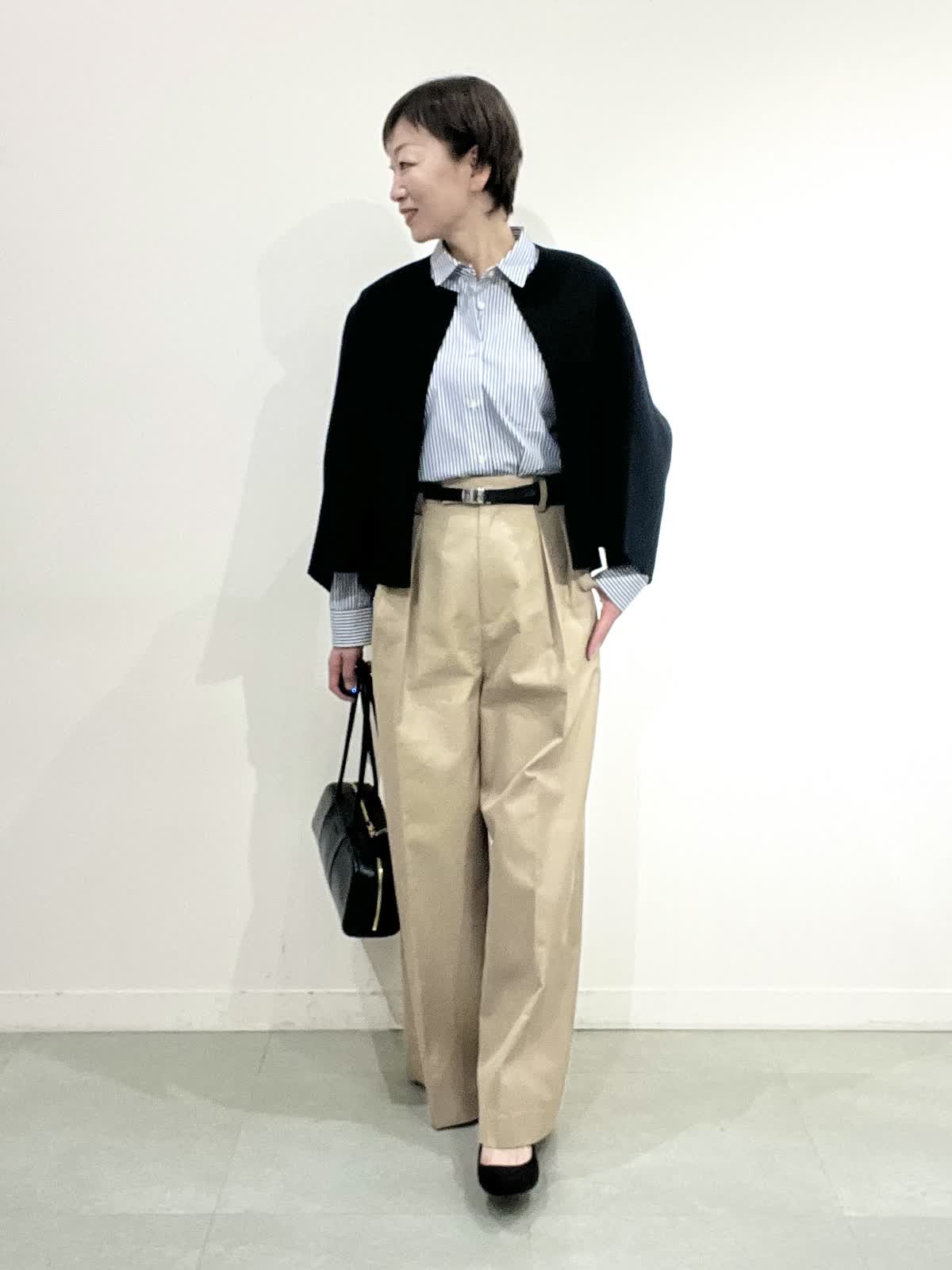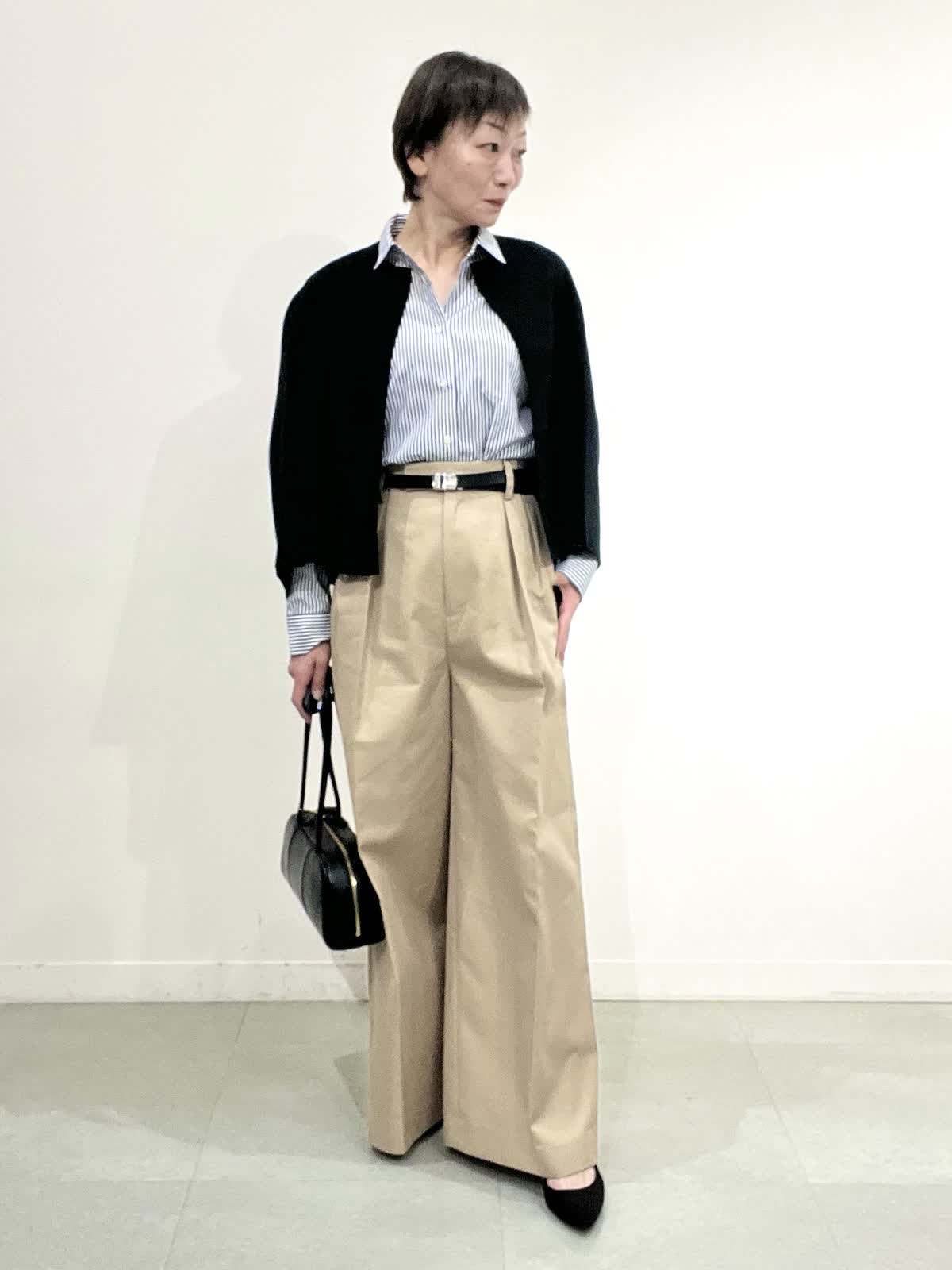【着用カラー】カーディガン:ブラック シャツ:ストライプ パンツ:ベージュ ベルト:ブラック