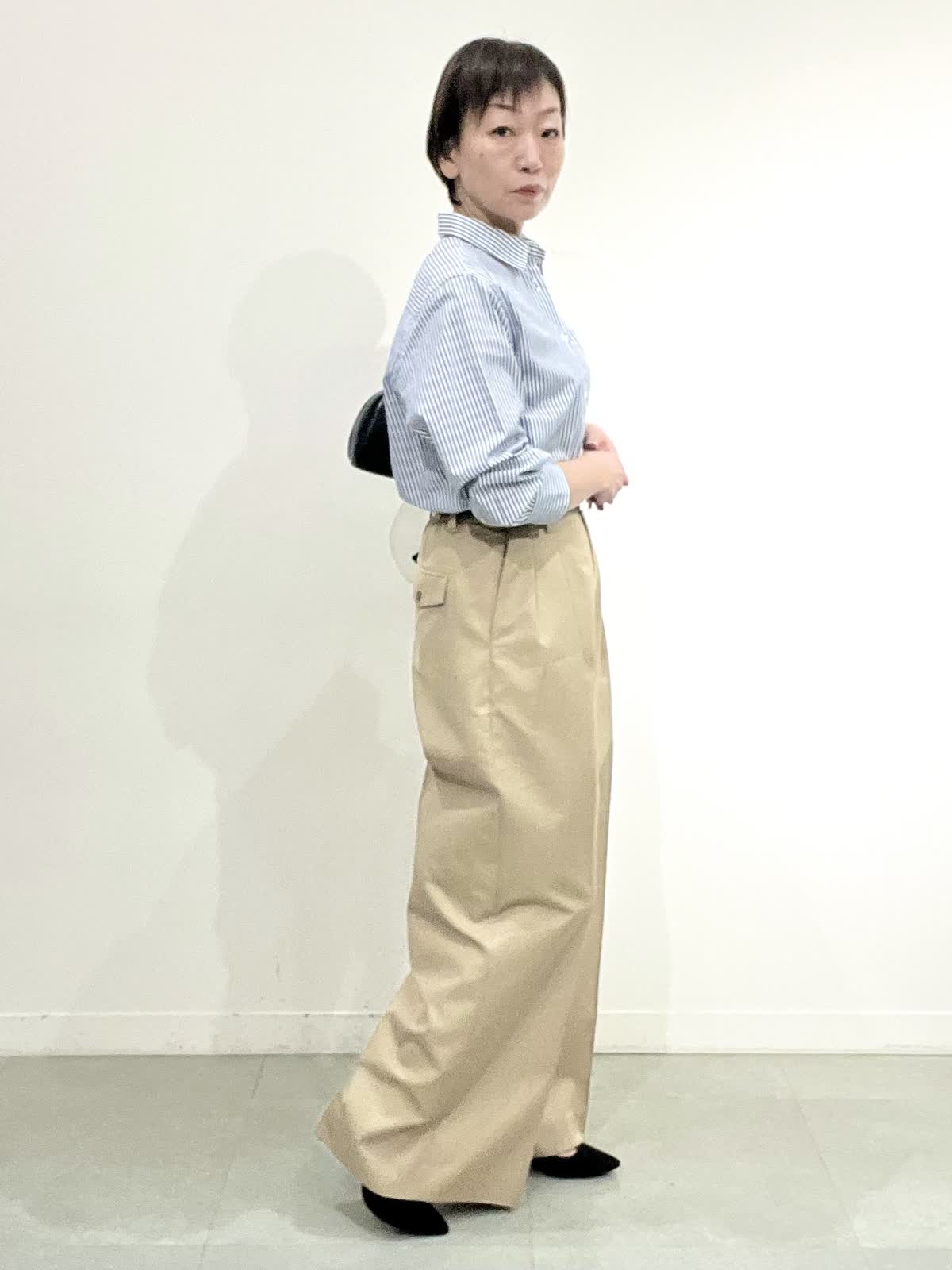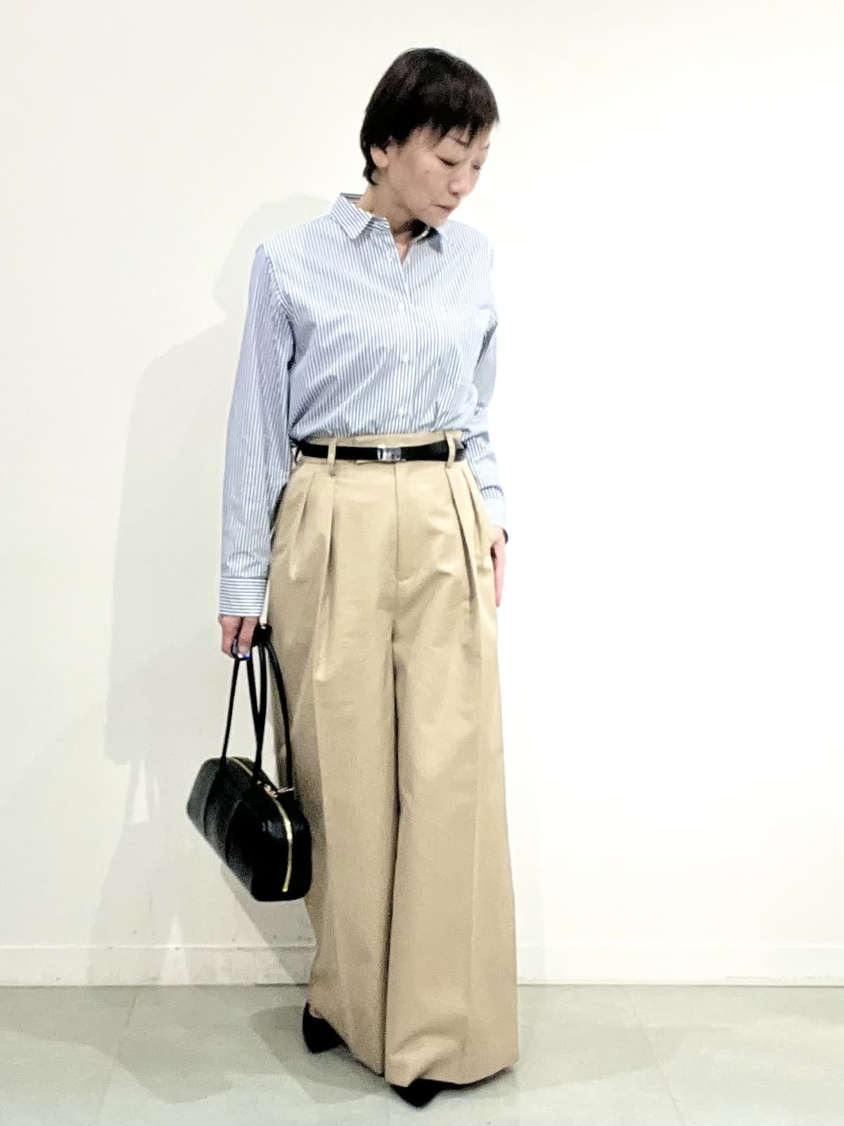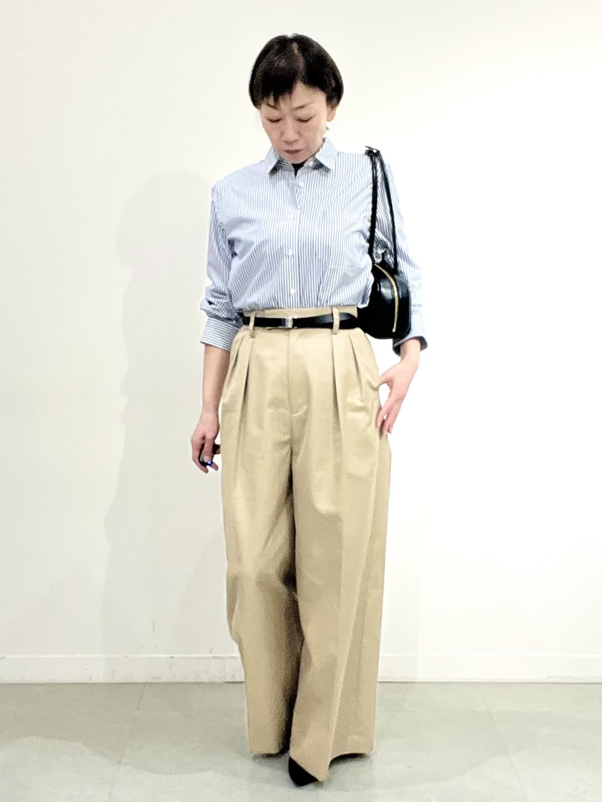 ワイドチノパンツは腰の位置が高組み合、足長効果あります。