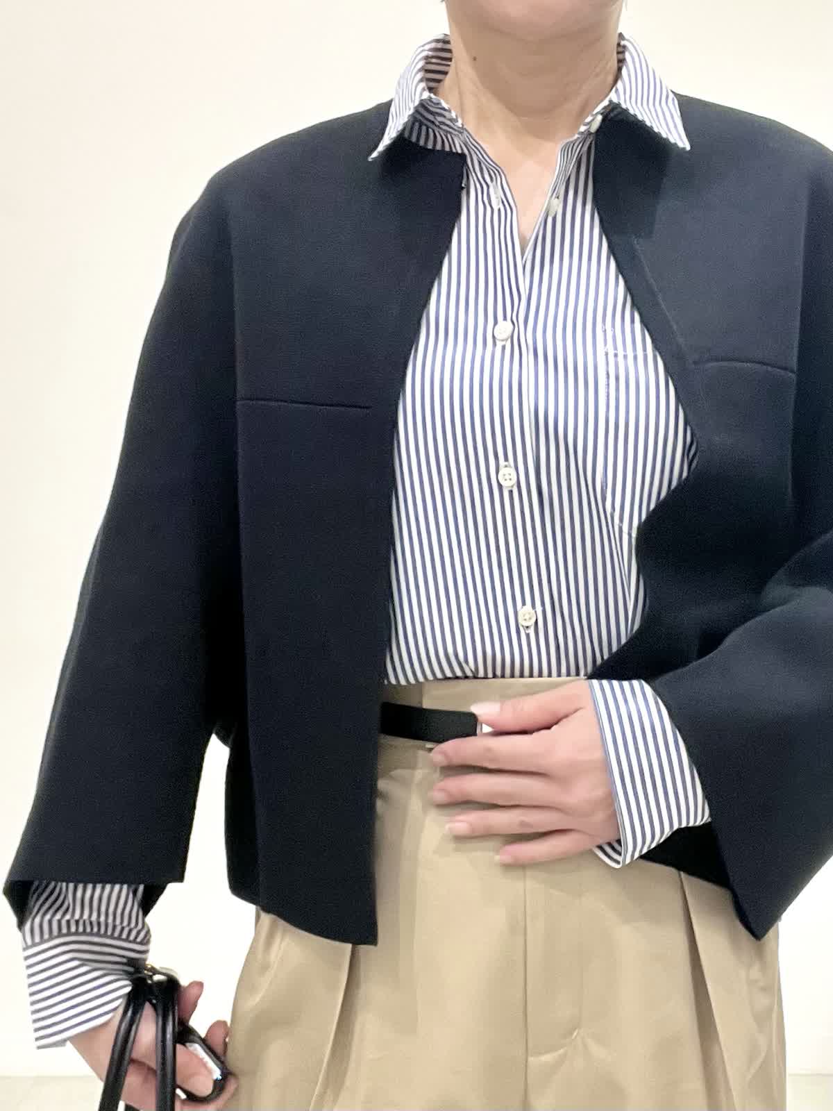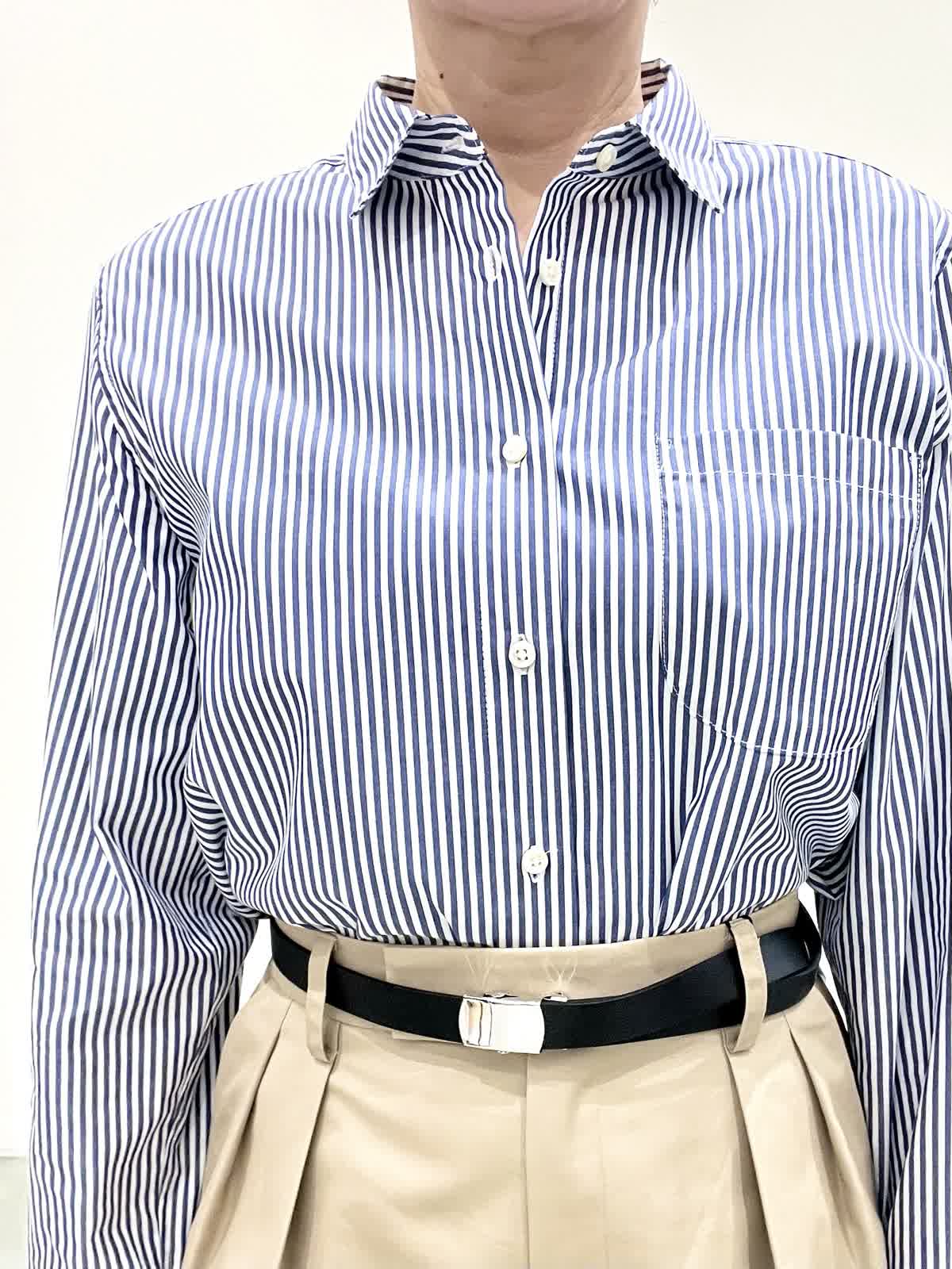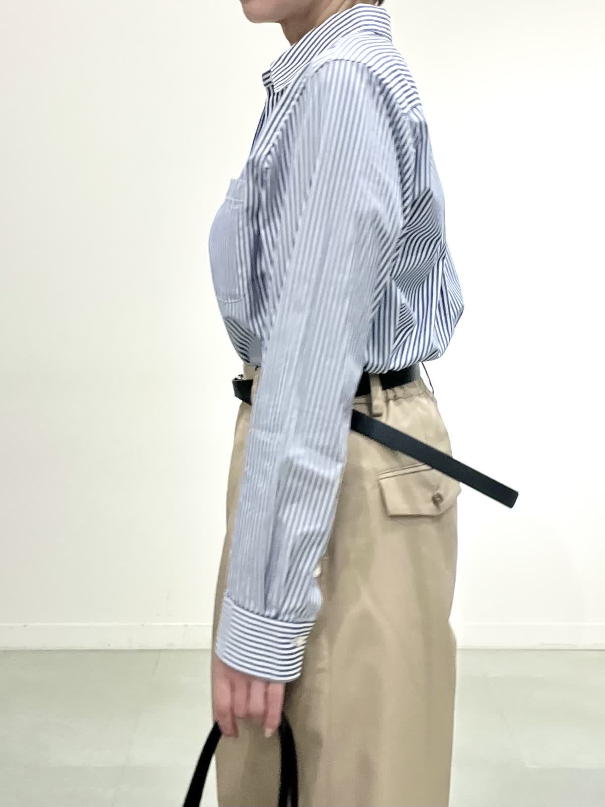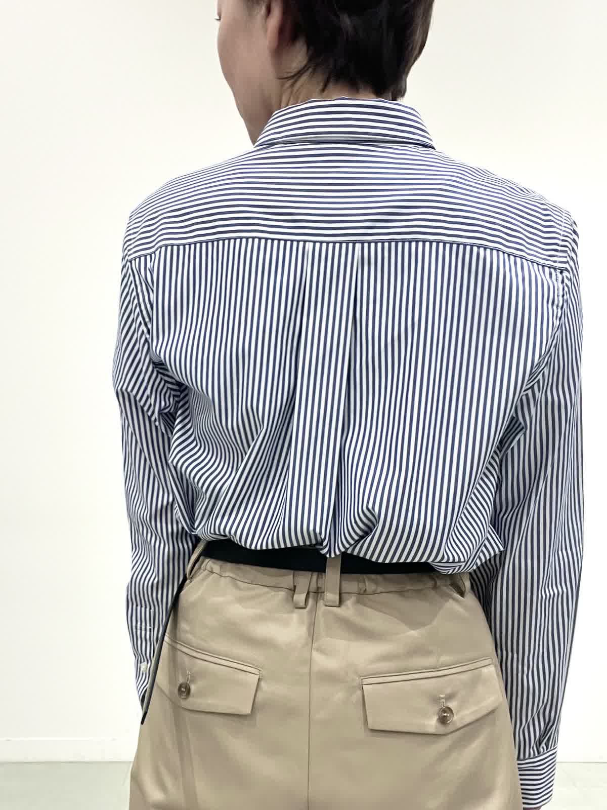 ストライプシャツはジャストサイズで着ていただけるお仕事着に向く定番ラインです。