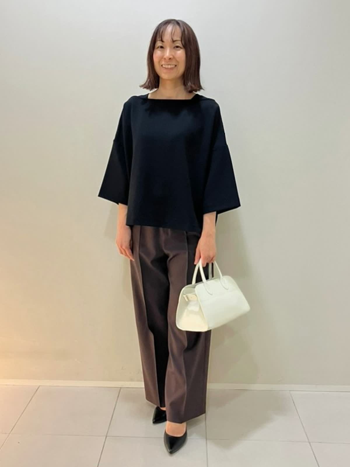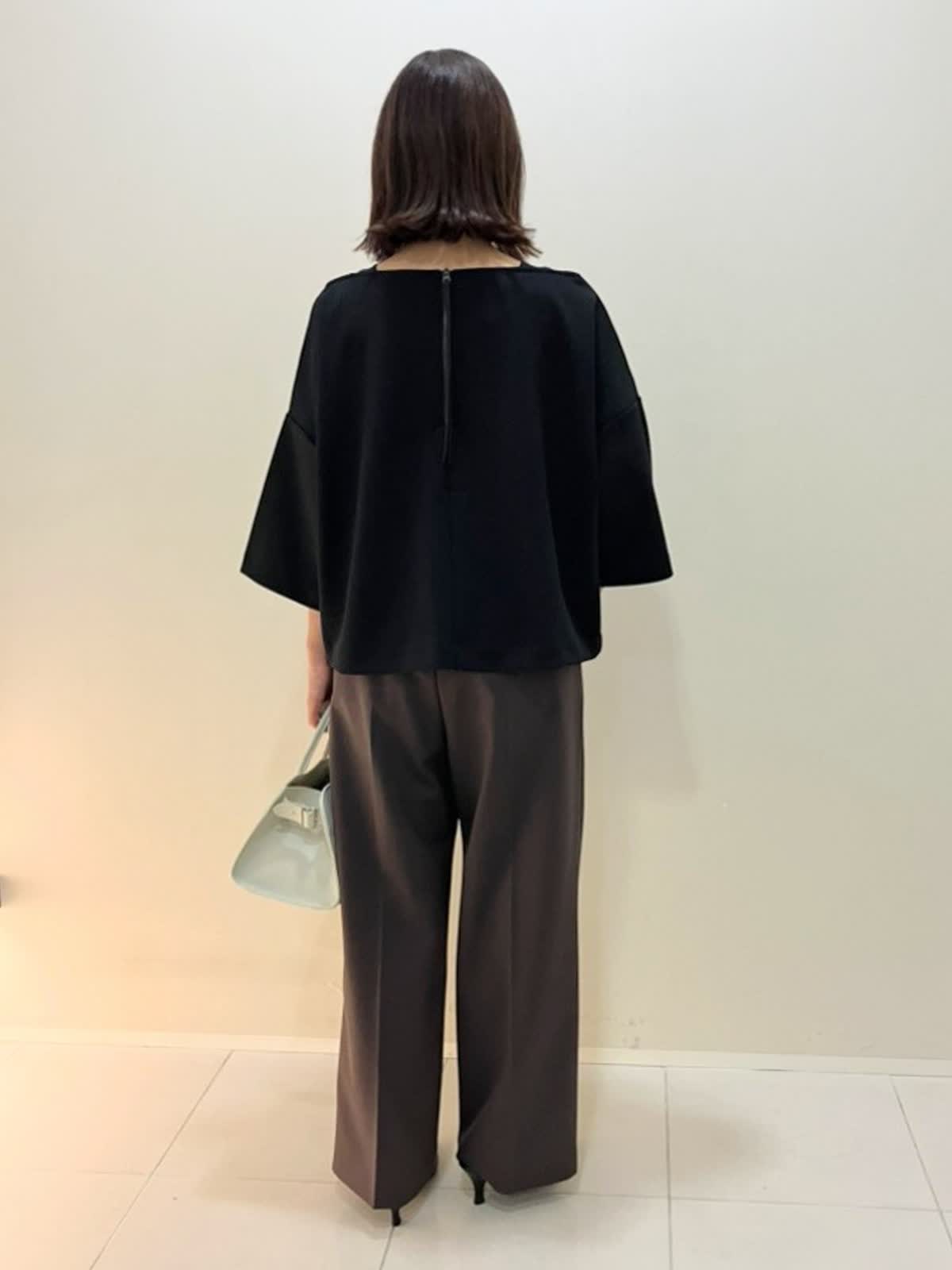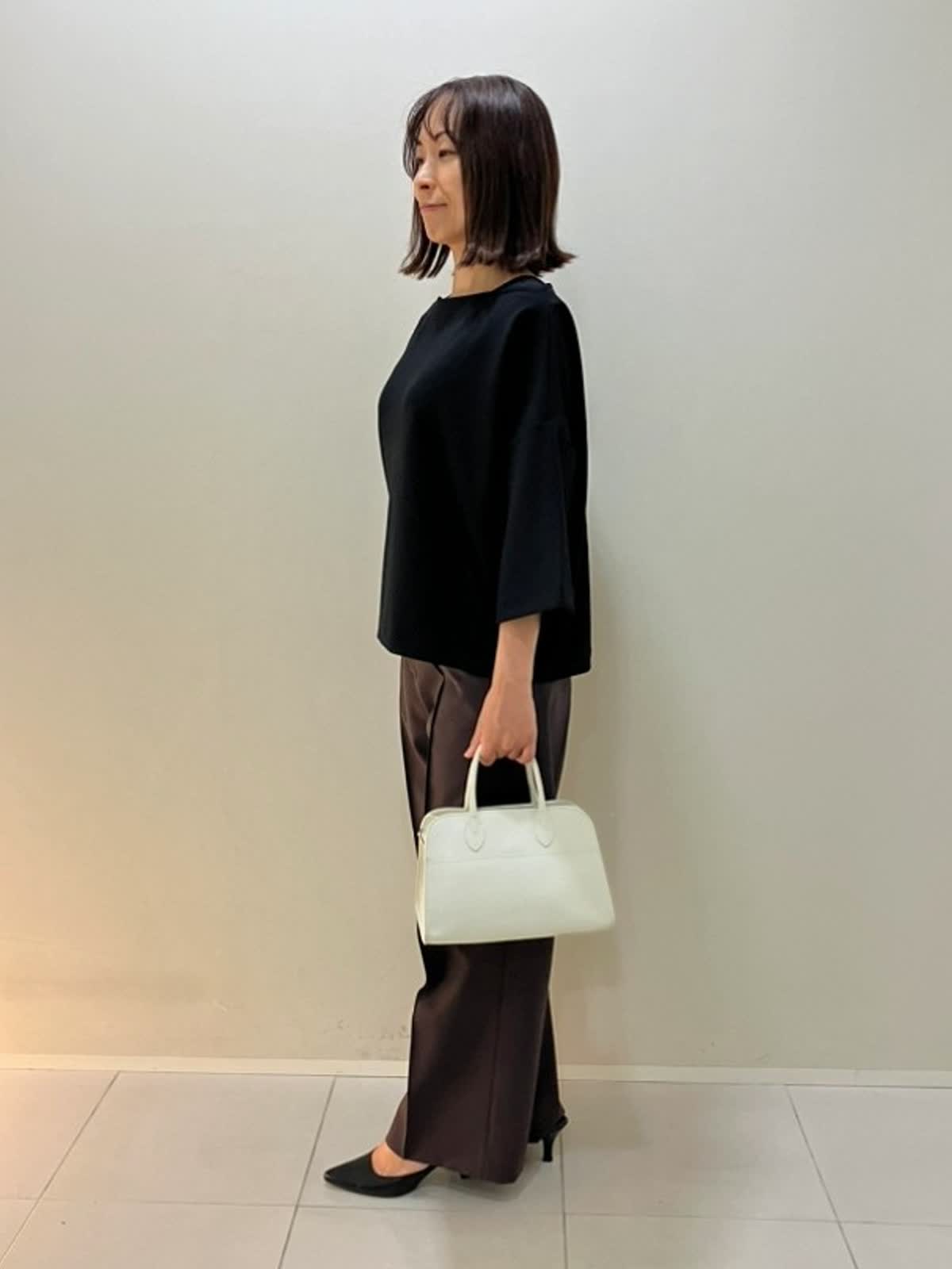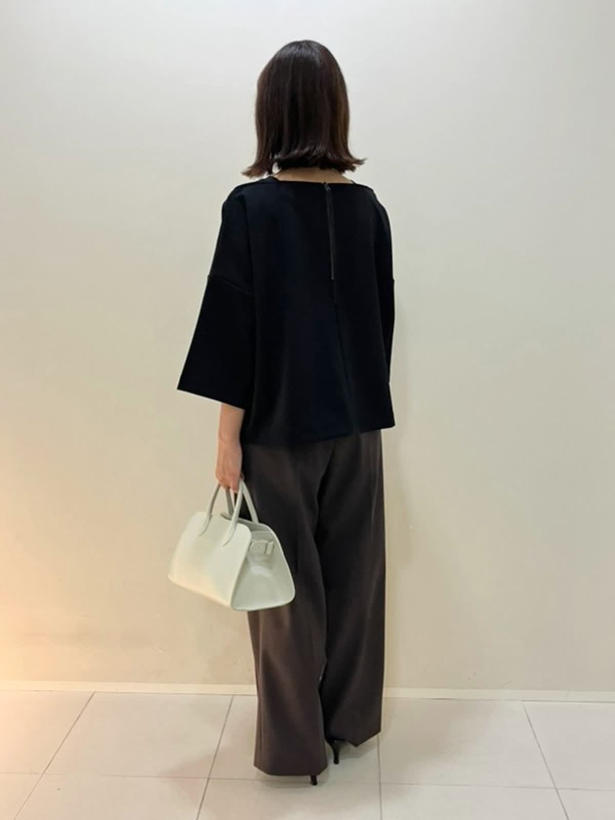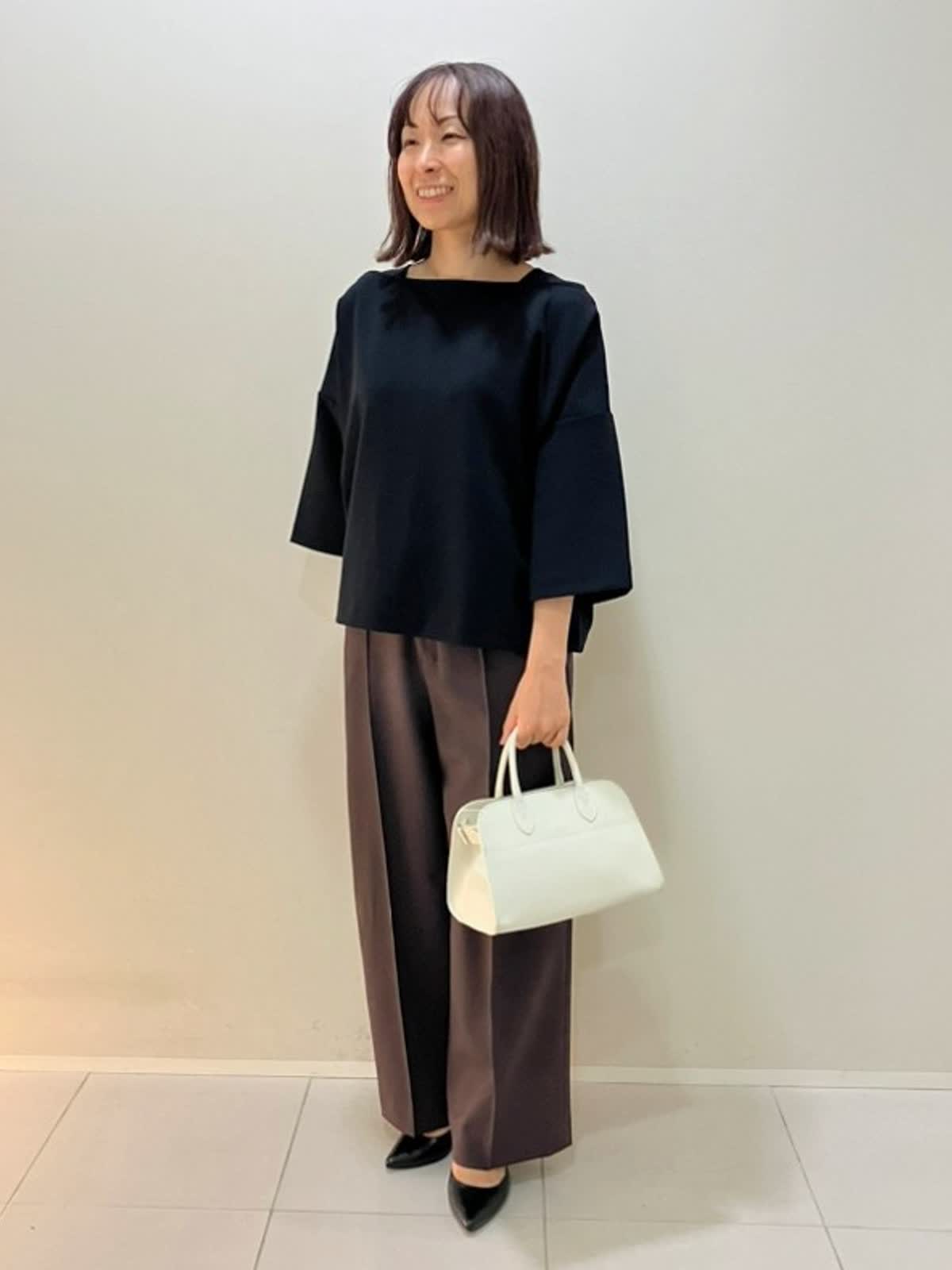 【着用サイズ】カットソー:フリー パンツ:9号【着用カラー】カットソー:ブラック パンツ:ブラウン 秋のキレイめスタイル スクエアネックのカットソーは伸縮性があり、腕まわりや身幅がゆったりとしていて楽な着心地。ワイドパンツは、ポリエステル素材でシワになりにくく、お仕事用にもピッタリなアイテムです。