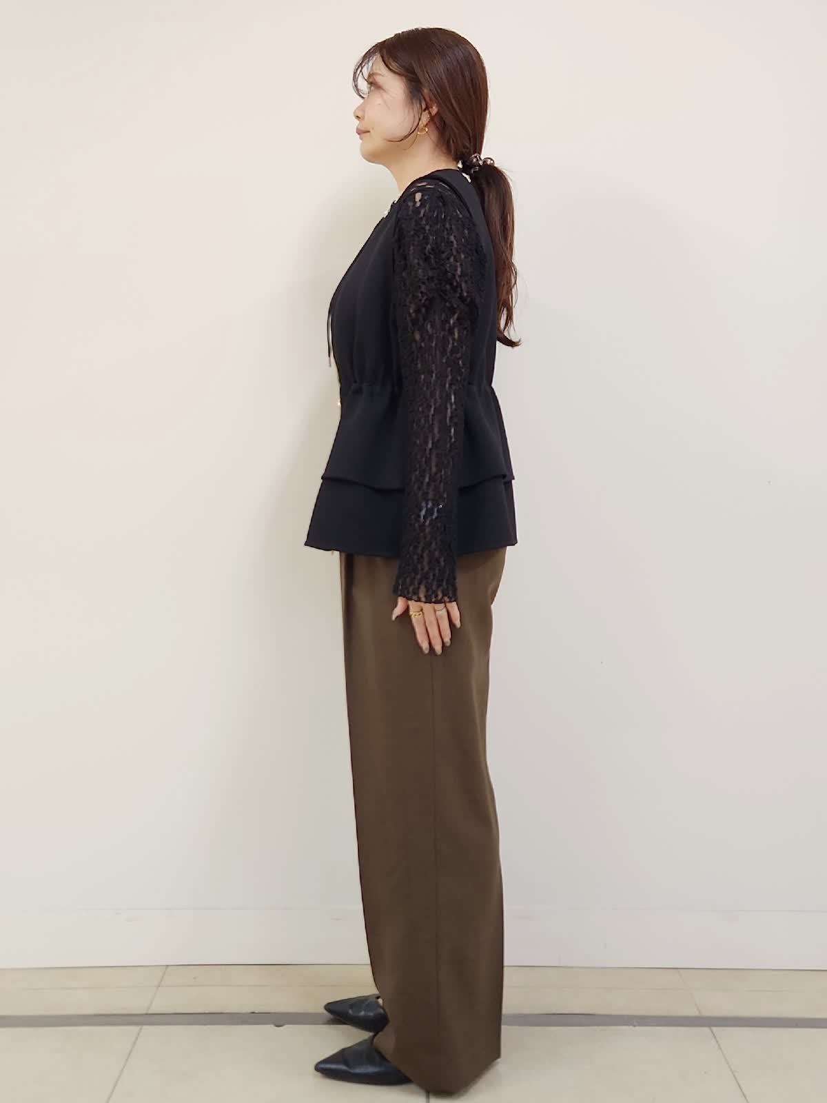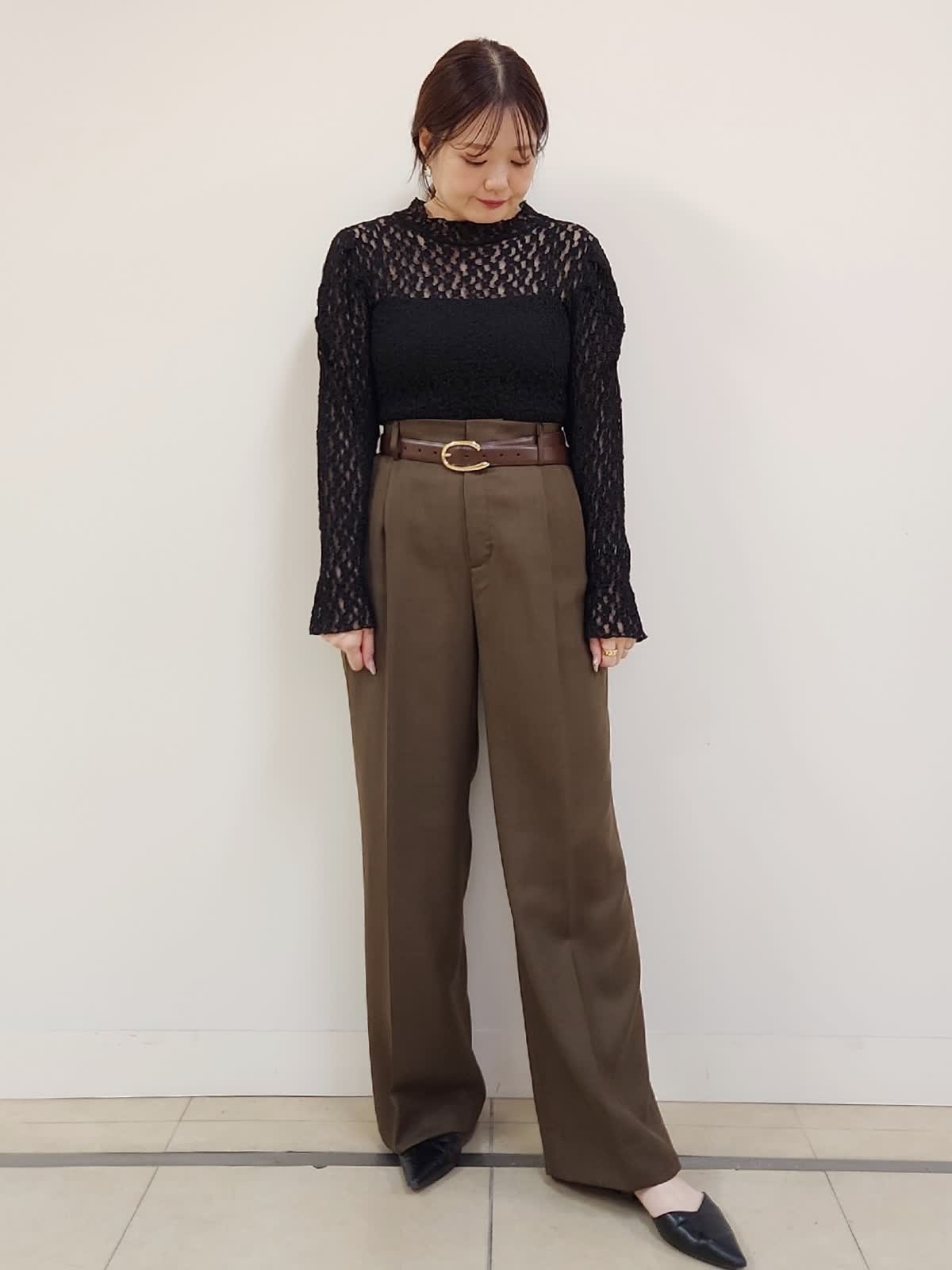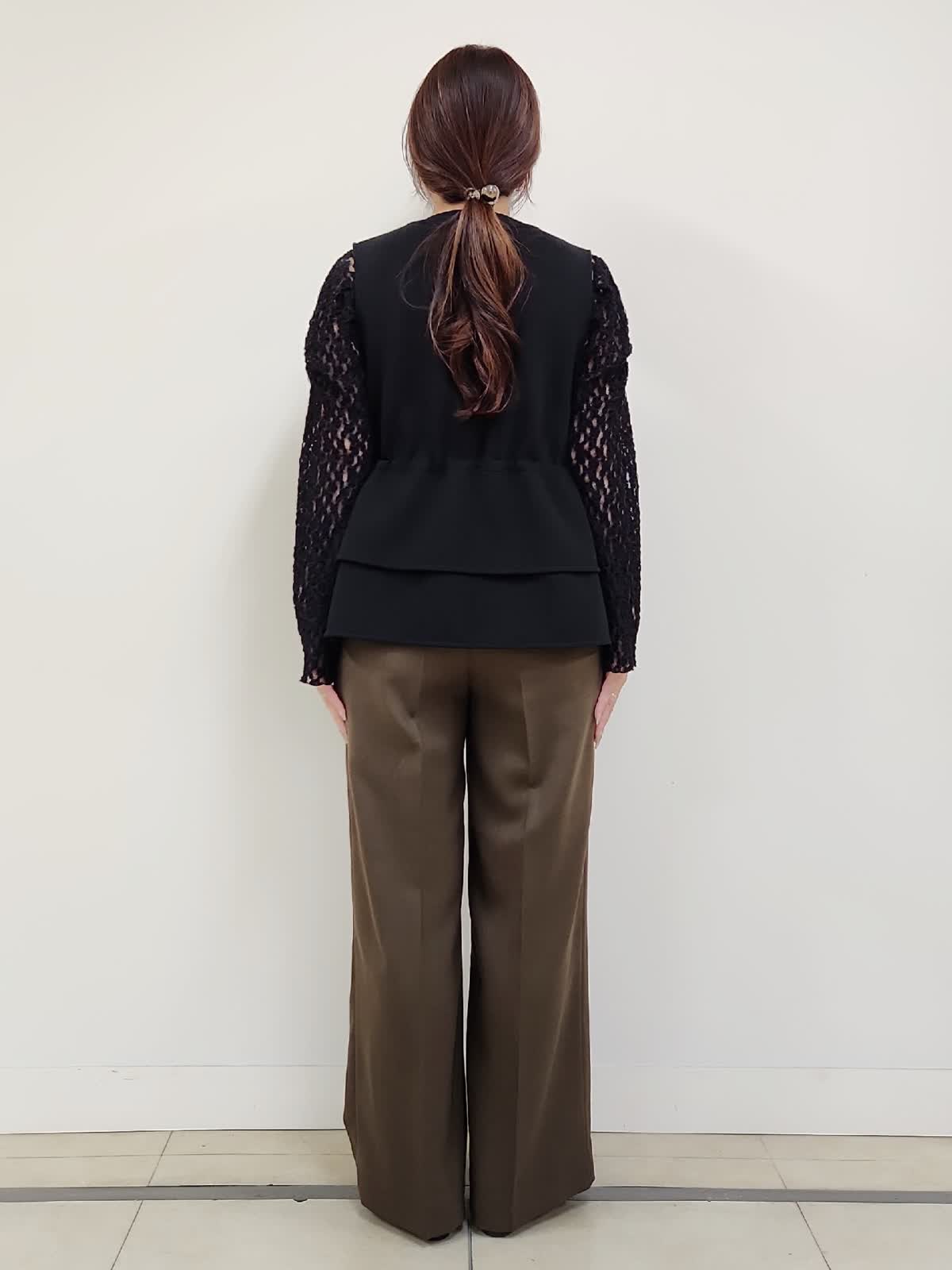 【着用サイズ】ジレ:9号/ブラック パンツ:11号/ブラウン Maglieジレのパンツ着まわしコーデ。定番のブラックはトレンドのブラウンと合わせる事で一気に新鮮。INEDのパンツはウール混ですが今時期にちょうどよい分厚過ぎない素材感です。普段9号ですが、こちらのパンツはお腹からヒップまわりがタイトに感じた為1サイズUPの11号選びました。インナーのレースカットソーはMaglieの商品。店舗にお問い合わせの品番→51-54190002