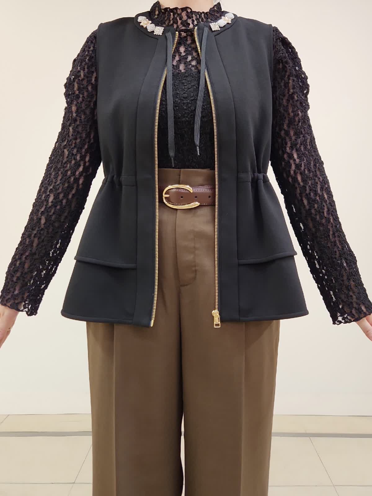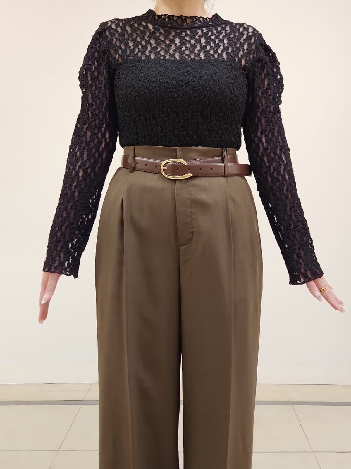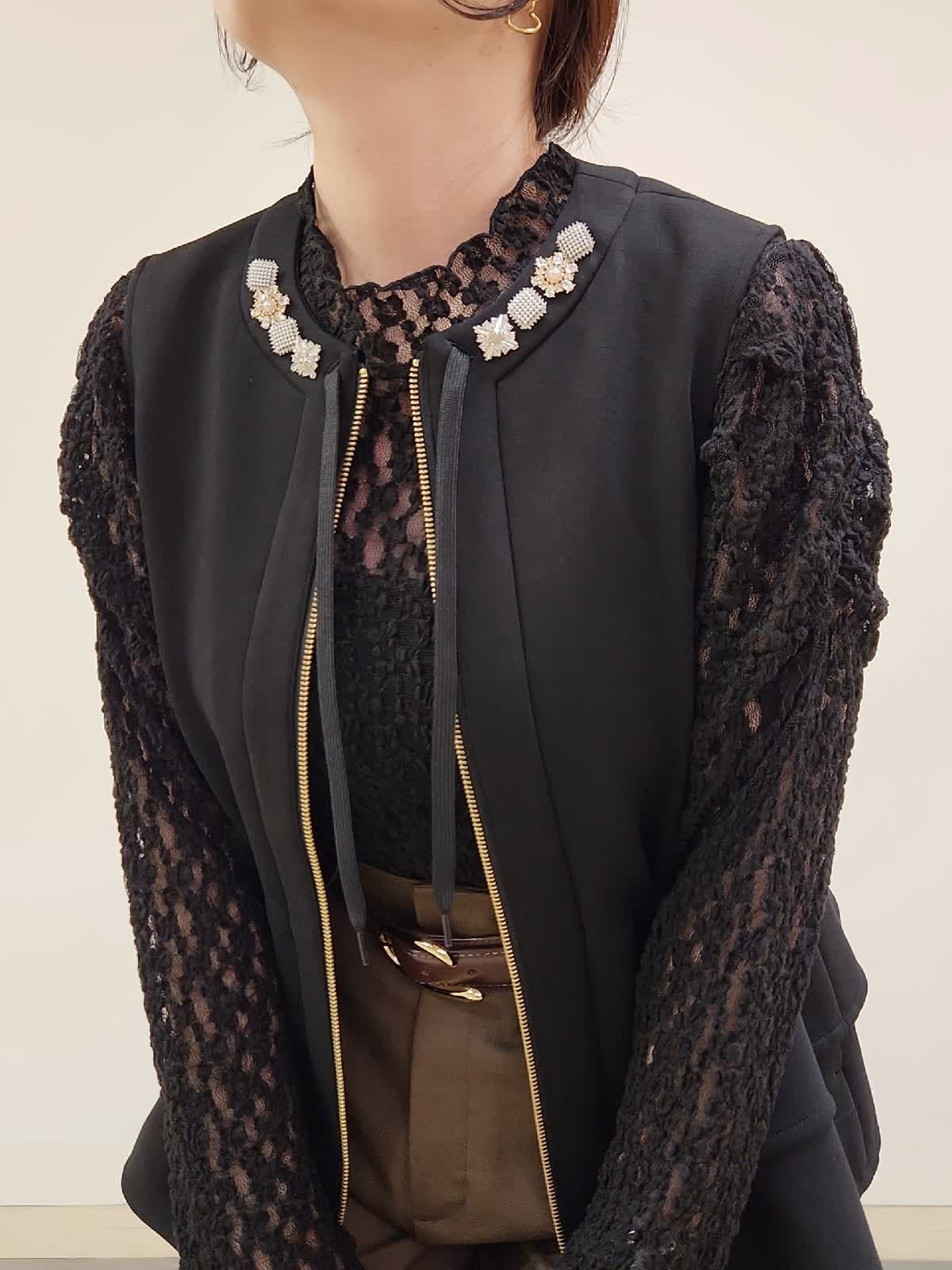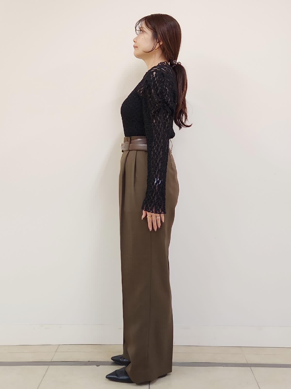 【着用サイズ】ジレ:9号/ブラック パンツ:11号/ブラウン Maglieジレのパンツ着まわしコーデ。定番のブラックはトレンドのブラウンと合わせる事で一気に新鮮。INEDのパンツはウール混ですが今時期にちょうどよい分厚過ぎない素材感です。普段9号ですが、こちらのパンツはお腹からヒップまわりがタイトに感じた為1サイズUPの11号選びました。インナーのレースカットソーはMaglieの商品。店舗にお問い合わせの品番→51-54190002
