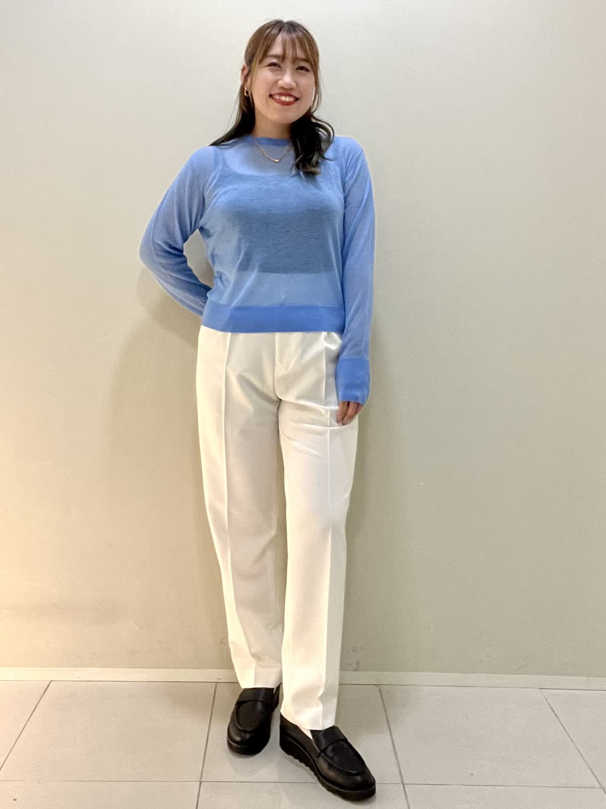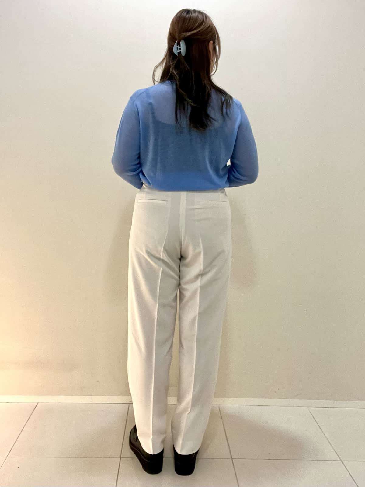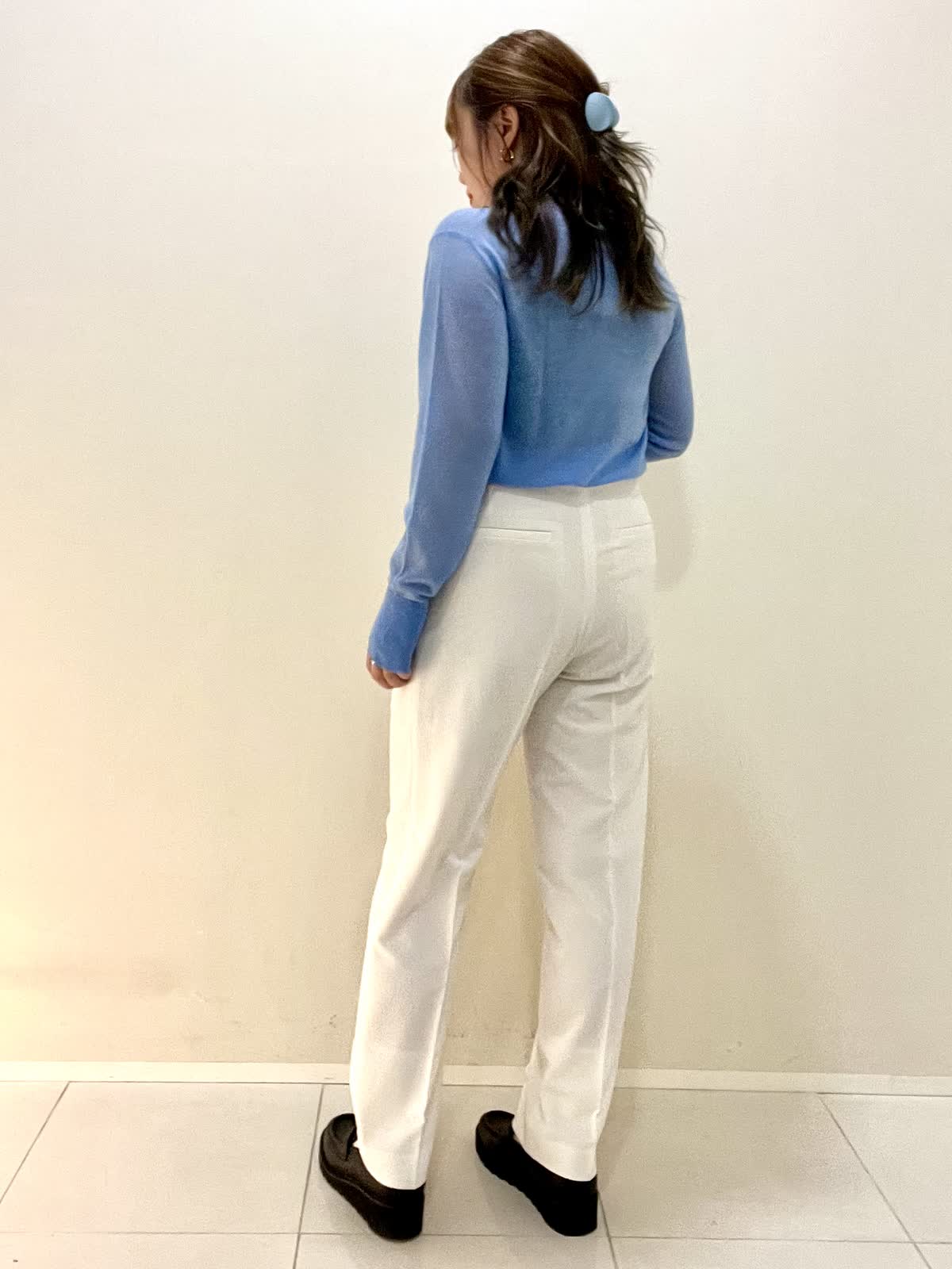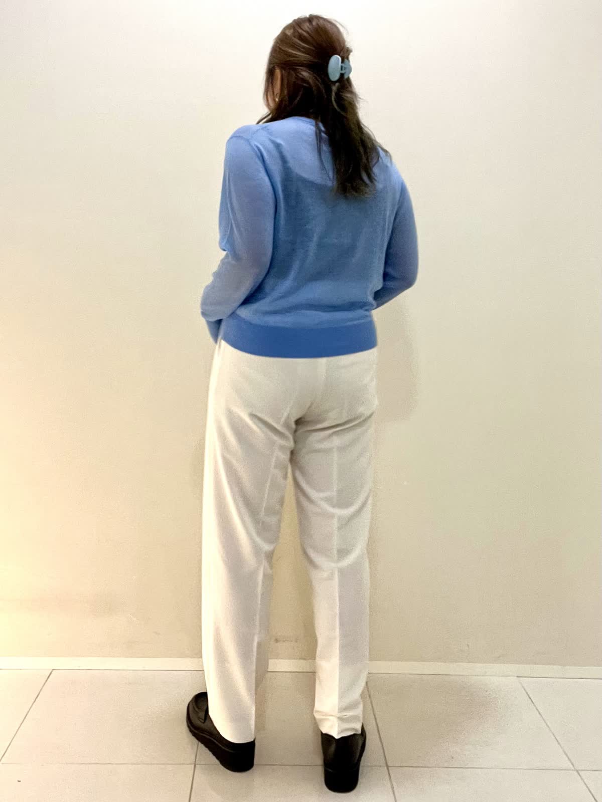 【着用サイズ】ニット:フリー パンツ:M 【着用カラー】ニット:ブルー パンツ:オフホワイト トレンドシアーニットコーデ。ブルーの色が目を惹くシアーニットは、極細のウール100%の糸を使用しています。チクチクしにくくとても軽く柔らかい素材感です。程よいシアーでヘルシーに。テーパードパンツを合わせてすっきりシルエットで着ました。同じシリーズのカーディガンを合わせて着るとアンサンブルになります。