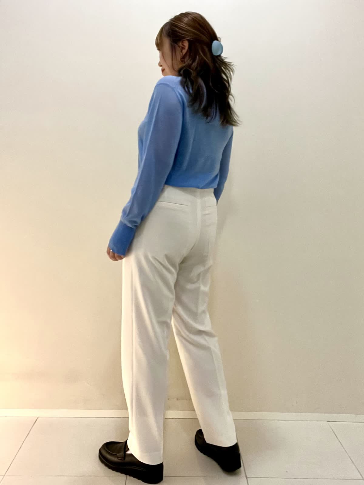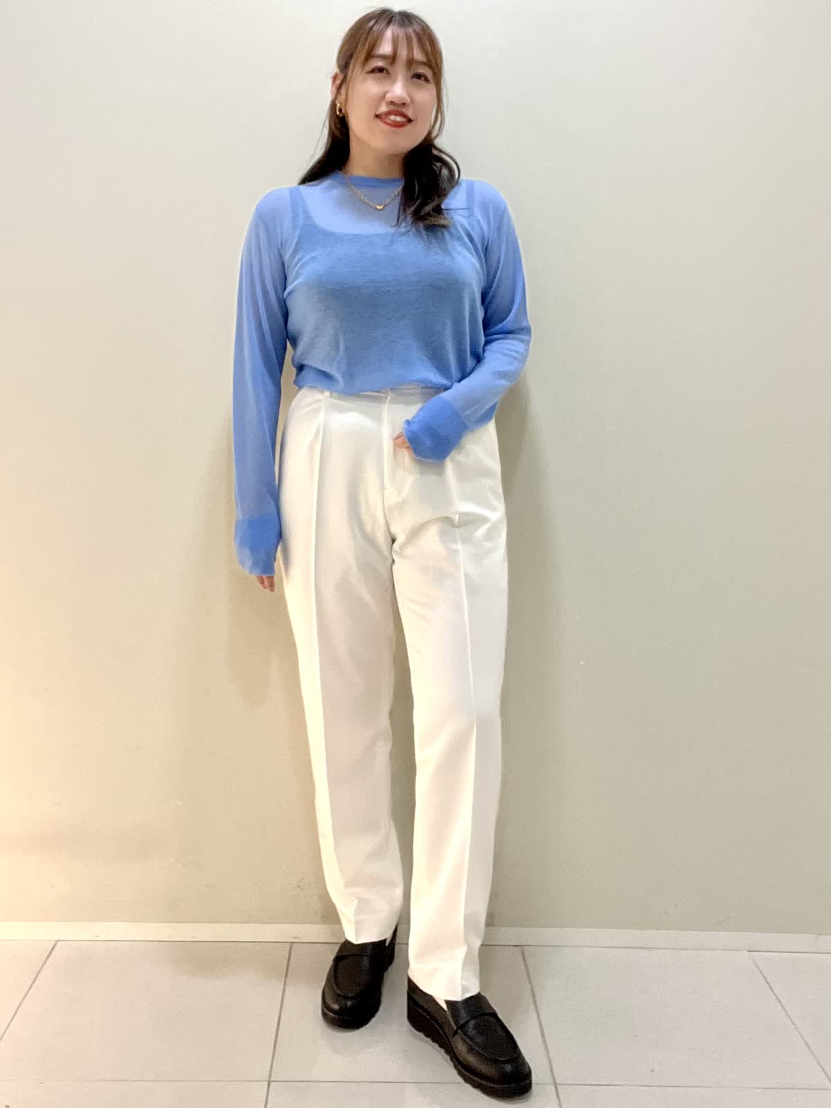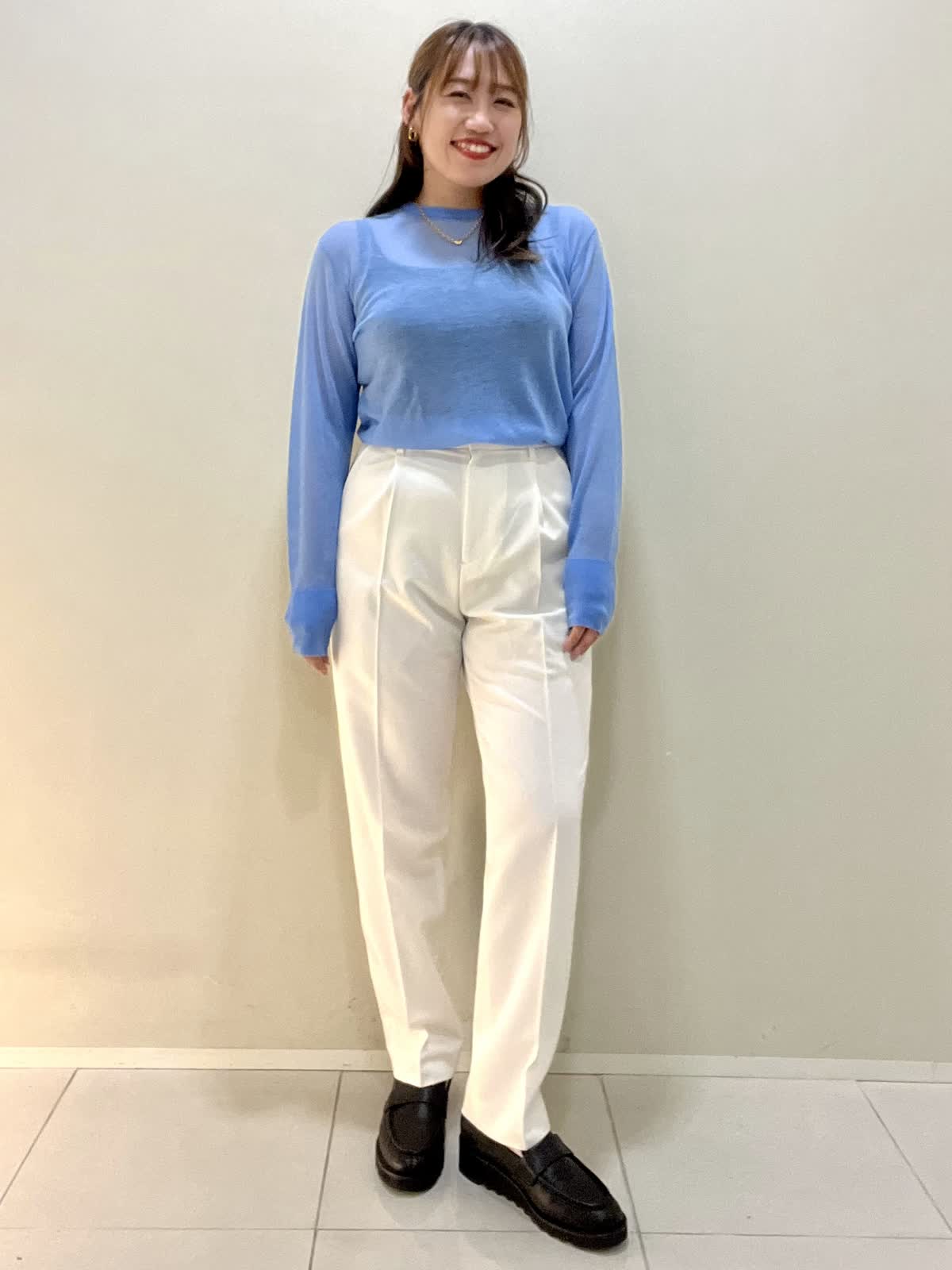 【着用サイズ】ニット:フリー パンツ:M 【着用カラー】ニット:ブルー パンツ:オフホワイト トレンドシアーニットコーデ。ブルーの色が目を惹くシアーニットは、極細のウール100%の糸を使用しています。チクチクしにくくとても軽く柔らかい素材感です。程よいシアーでヘルシーに。テーパードパンツを合わせてすっきりシルエットで着ました。同じシリーズのカーディガンを合わせて着るとアンサンブルになります。