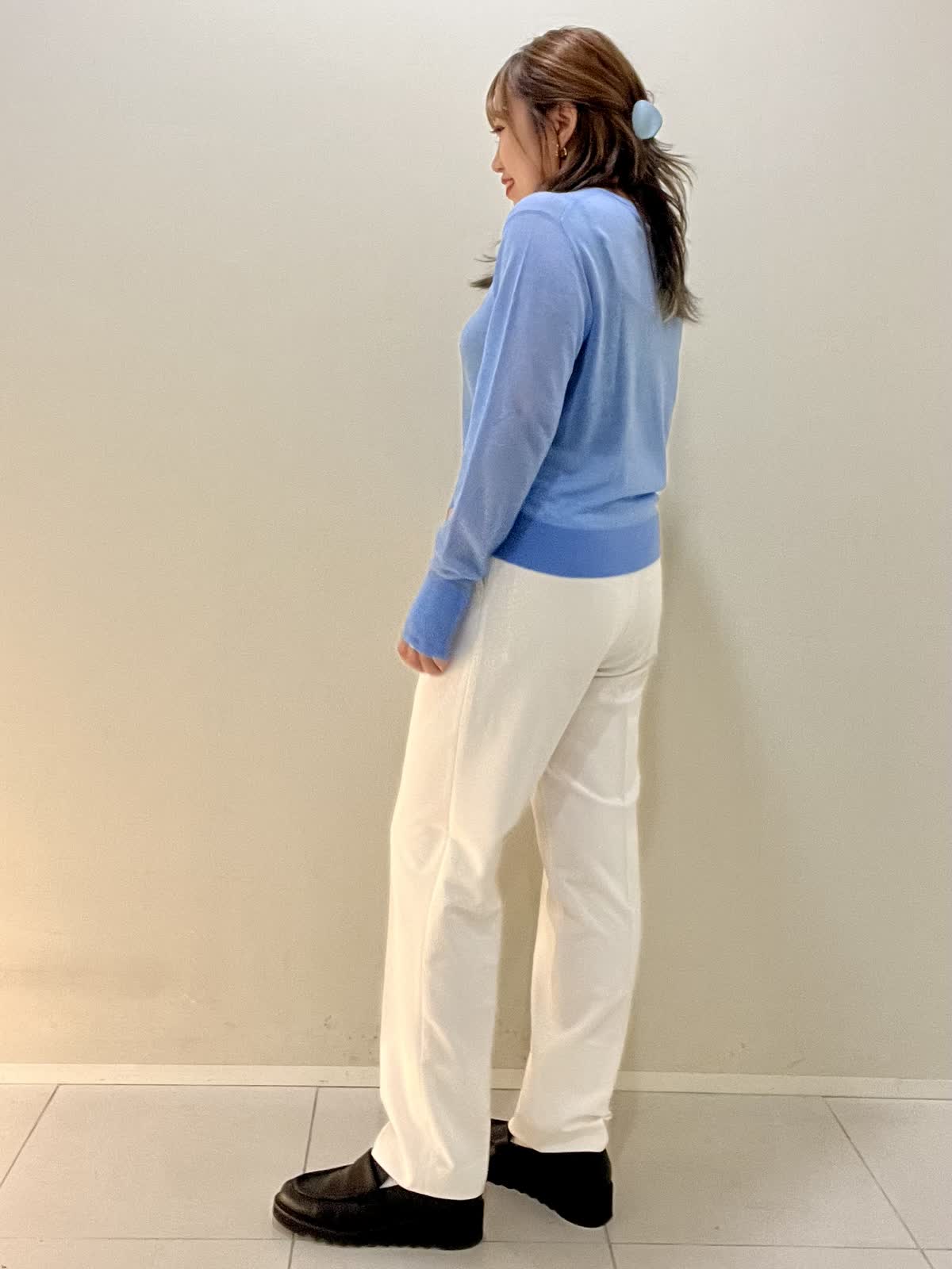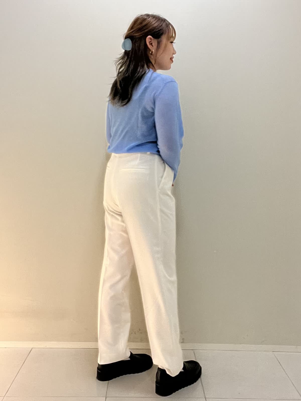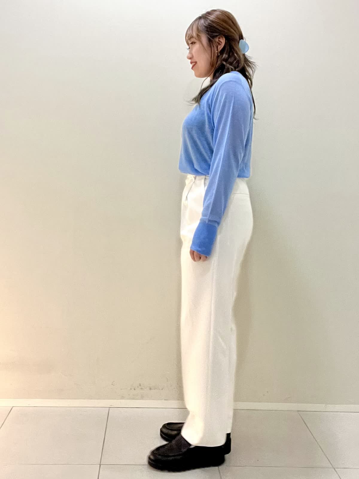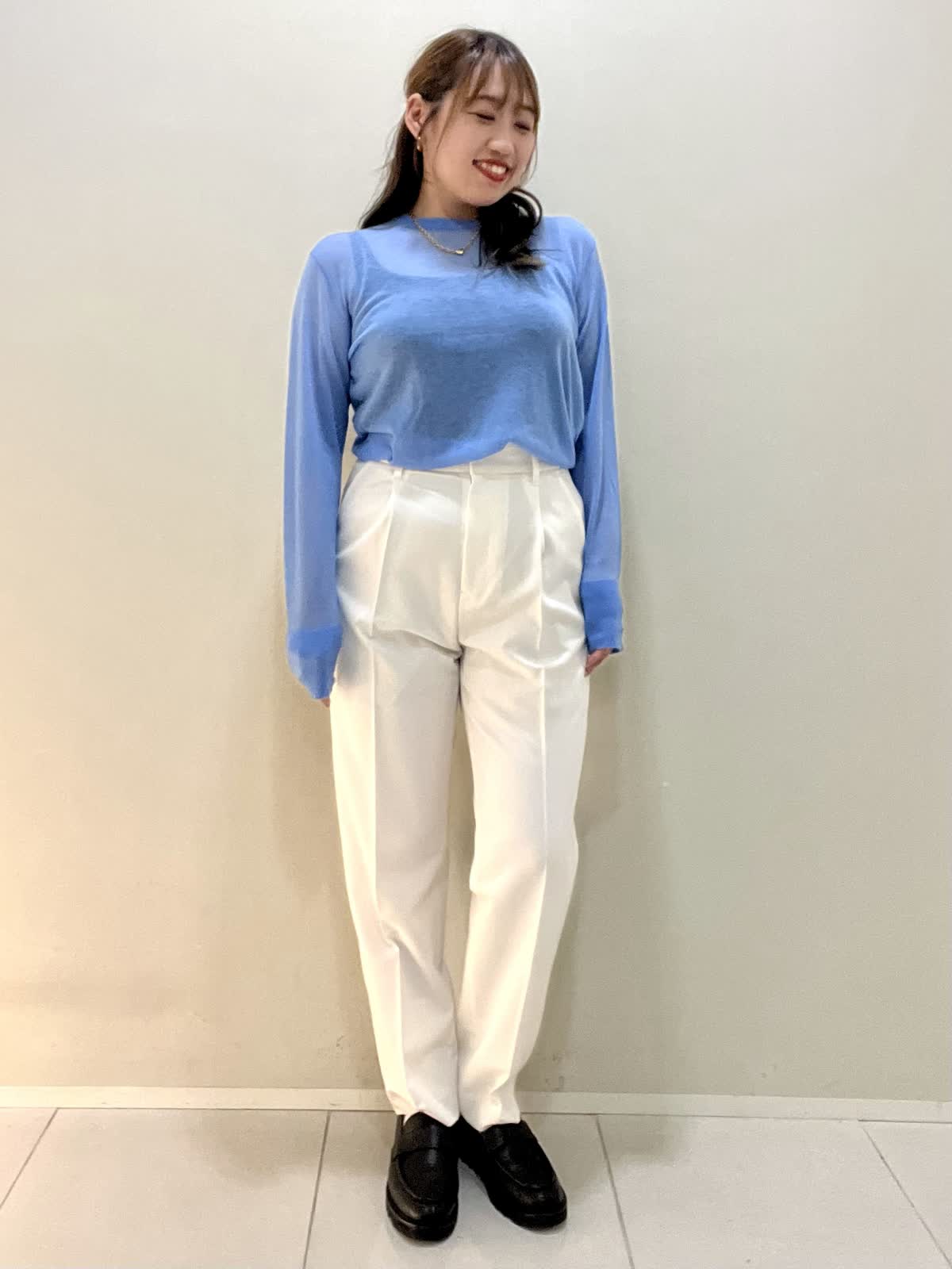 【着用サイズ】ニット:フリー パンツ:M 【着用カラー】ニット:ブルー パンツ:オフホワイト トレンドシアーニットコーデ。ブルーの色が目を惹くシアーニットは、極細のウール100%の糸を使用しています。チクチクしにくくとても軽く柔らかい素材感です。程よいシアーでヘルシーに。テーパードパンツを合わせてすっきりシルエットで着ました。同じシリーズのカーディガンを合わせて着るとアンサンブルになります。