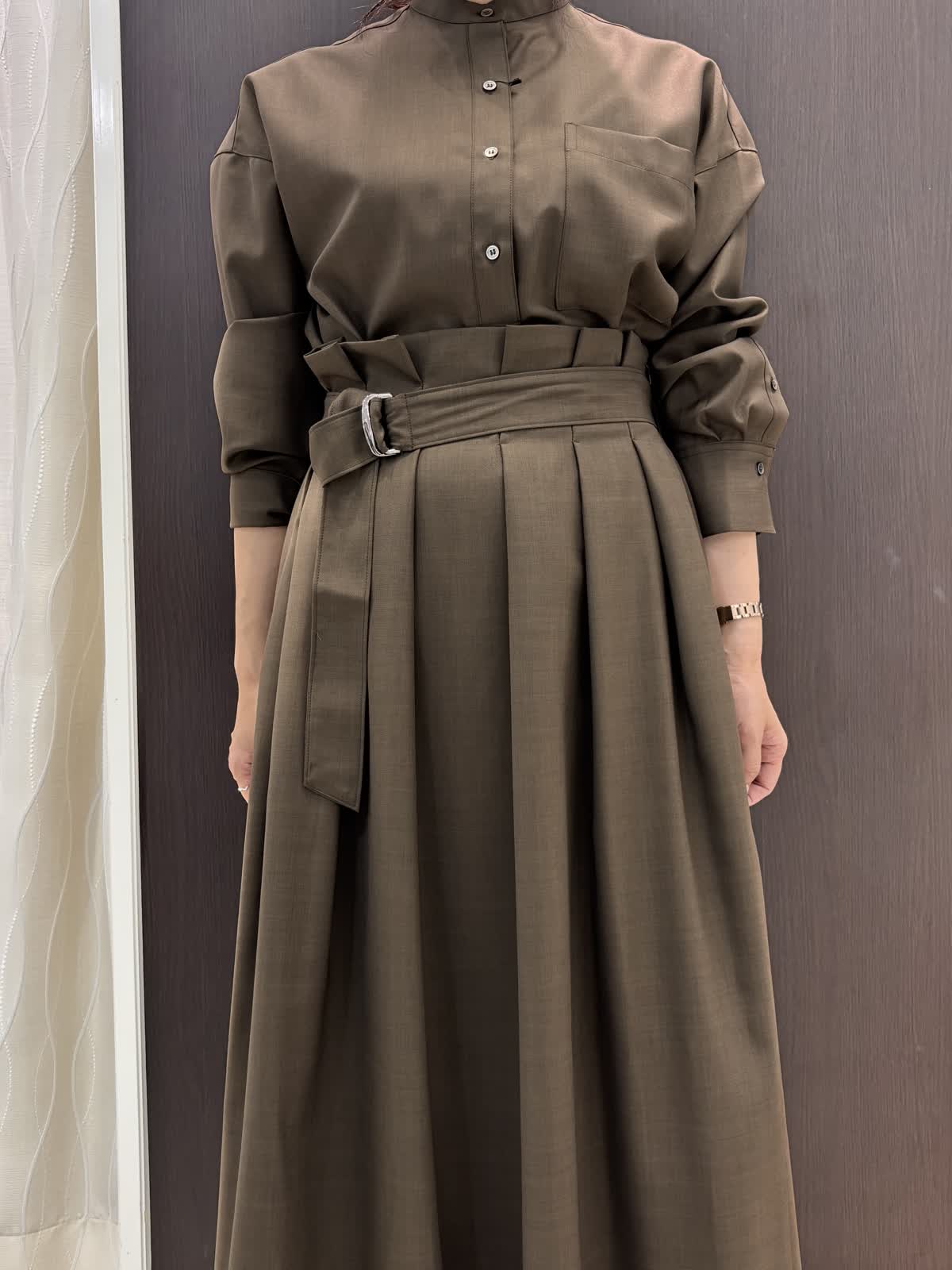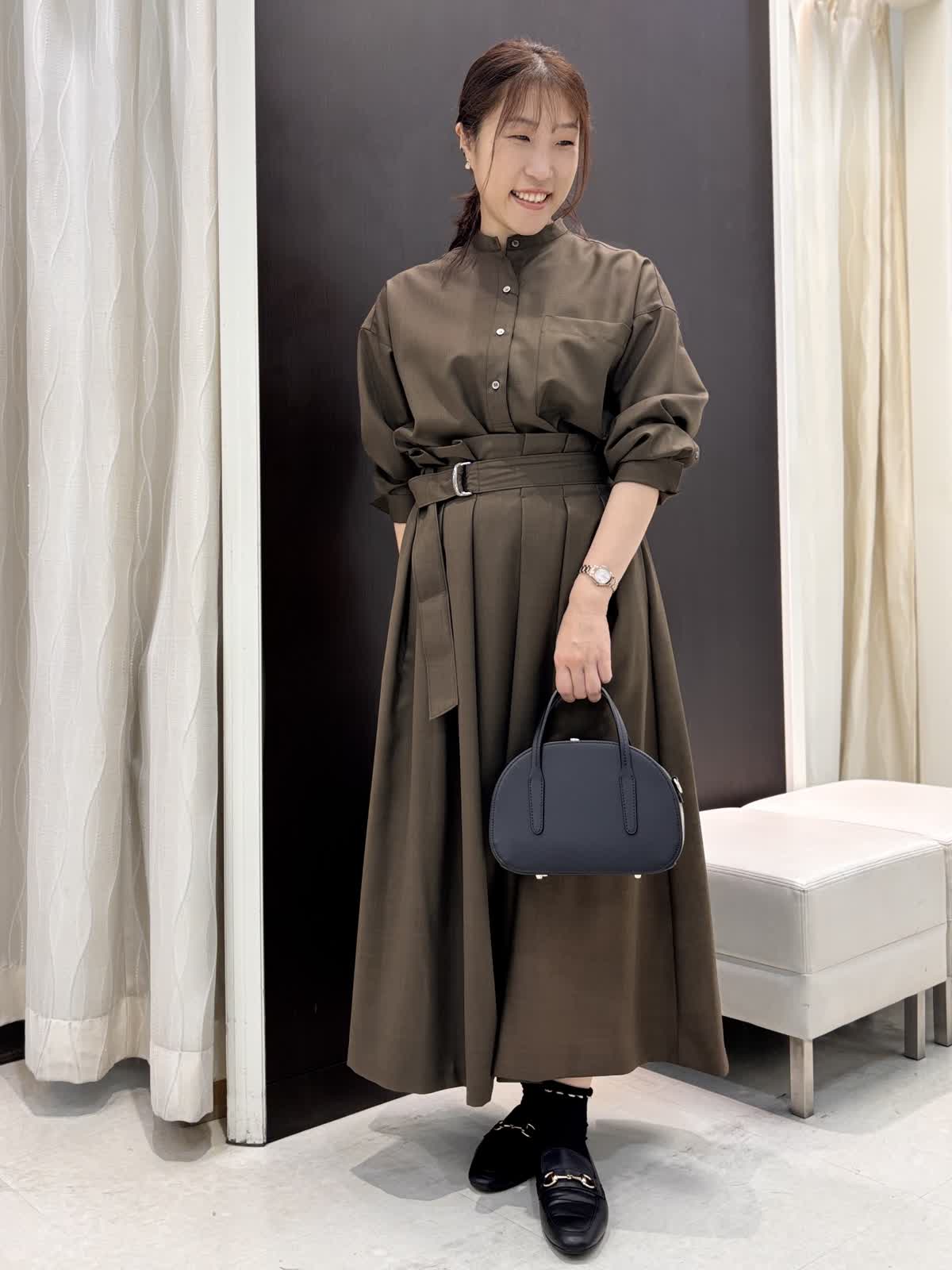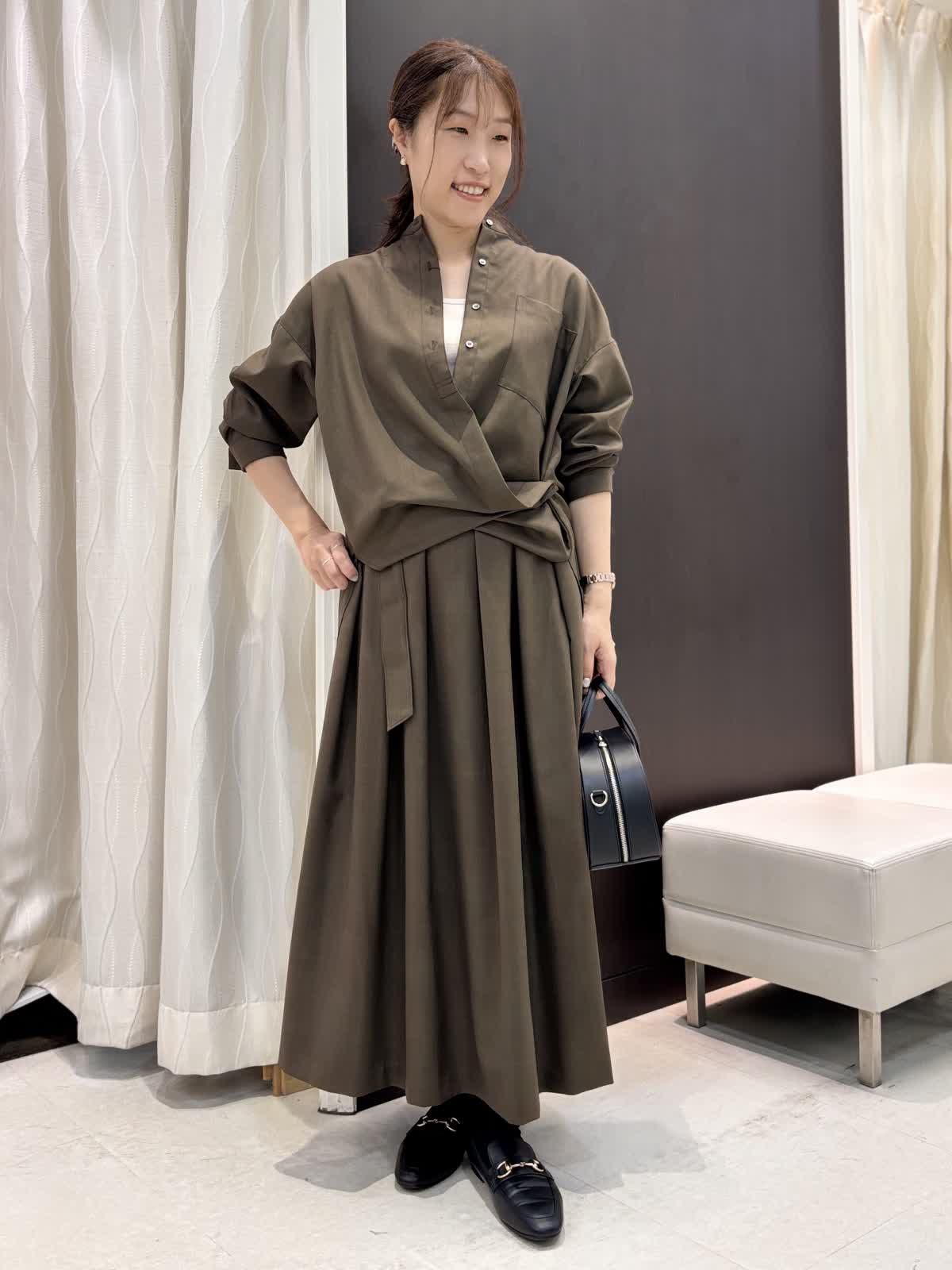 今年注目のブラウンカラーのセットアップは着るだけでキチン感があるので、食事会やビジネスシーンなどさまざまな場面で使えそうです。ブラウスはアレンジが出来るので、気分に合わせて少し大人めにカシュクールデザインにチェンジしてもOK。ウール調に見える綺麗な素材ですが、扱いやすいポリエステル。程よい光沢感があり高見えします。スカートのサイズはゆったりでとても履きやすいです。