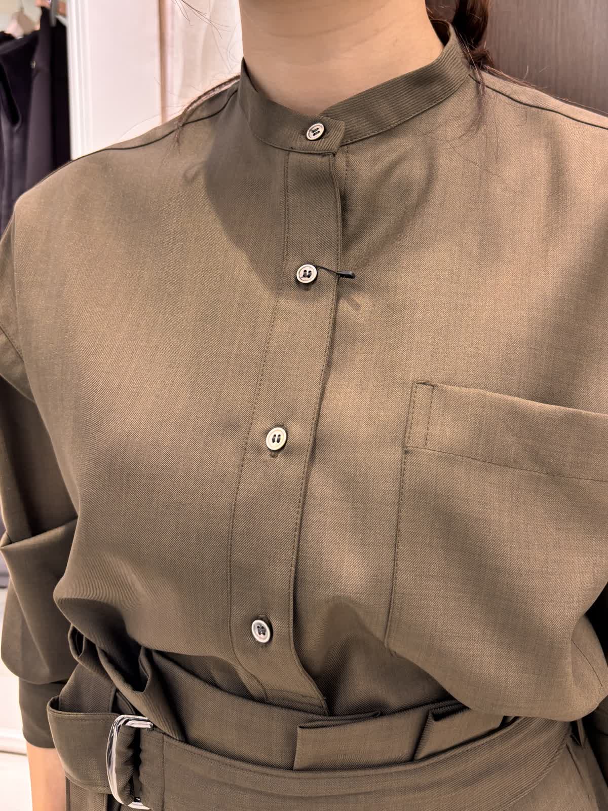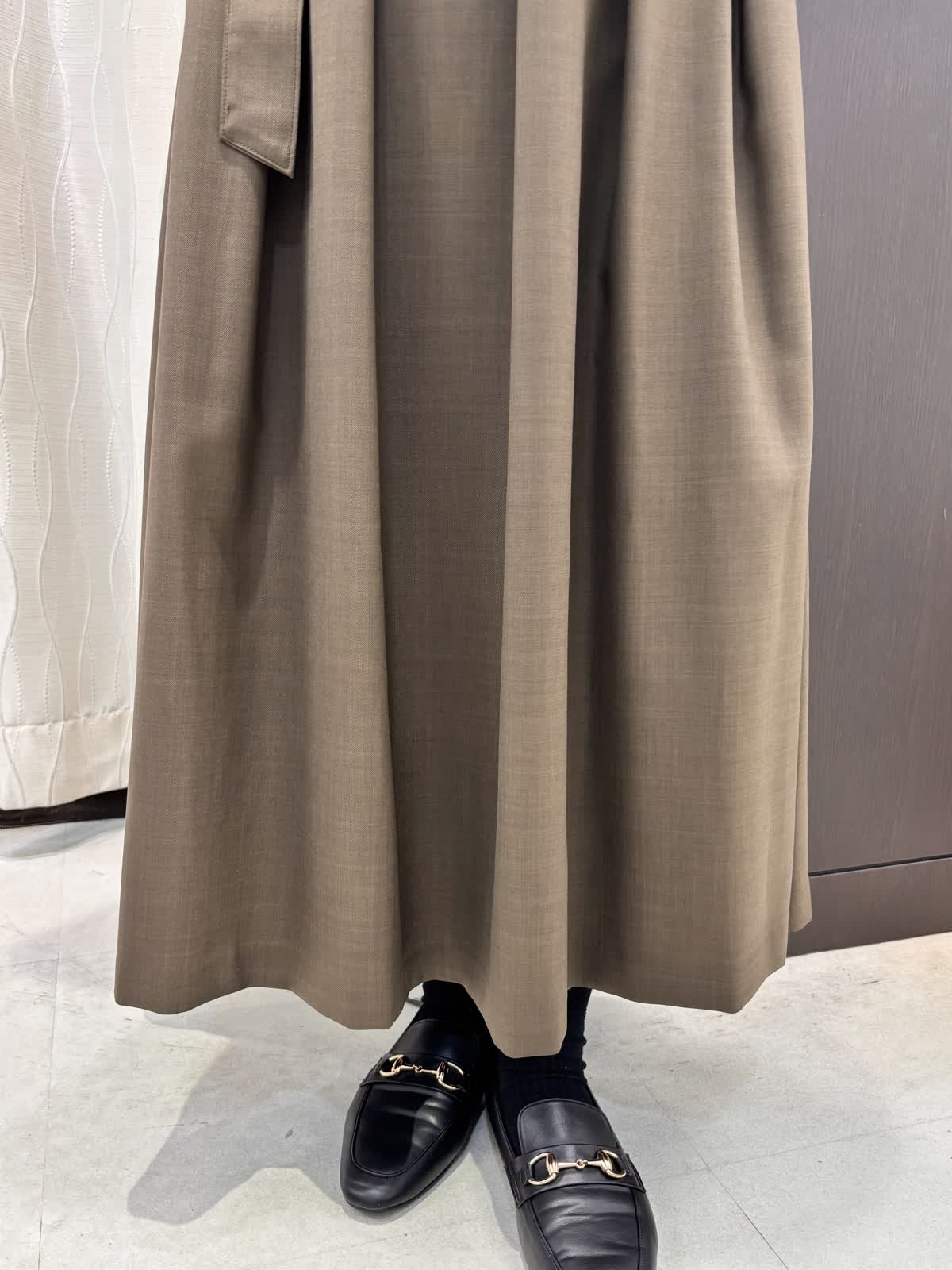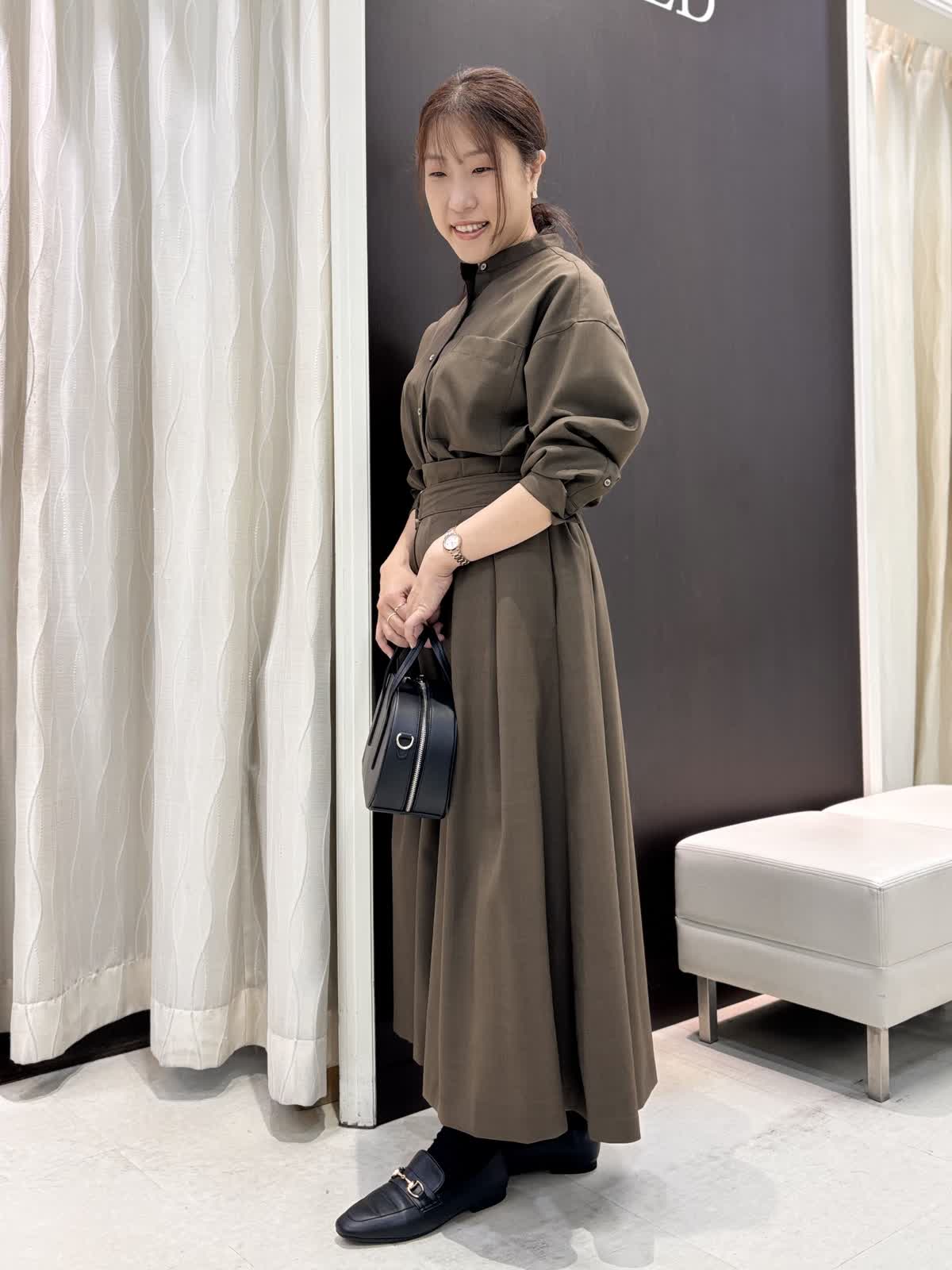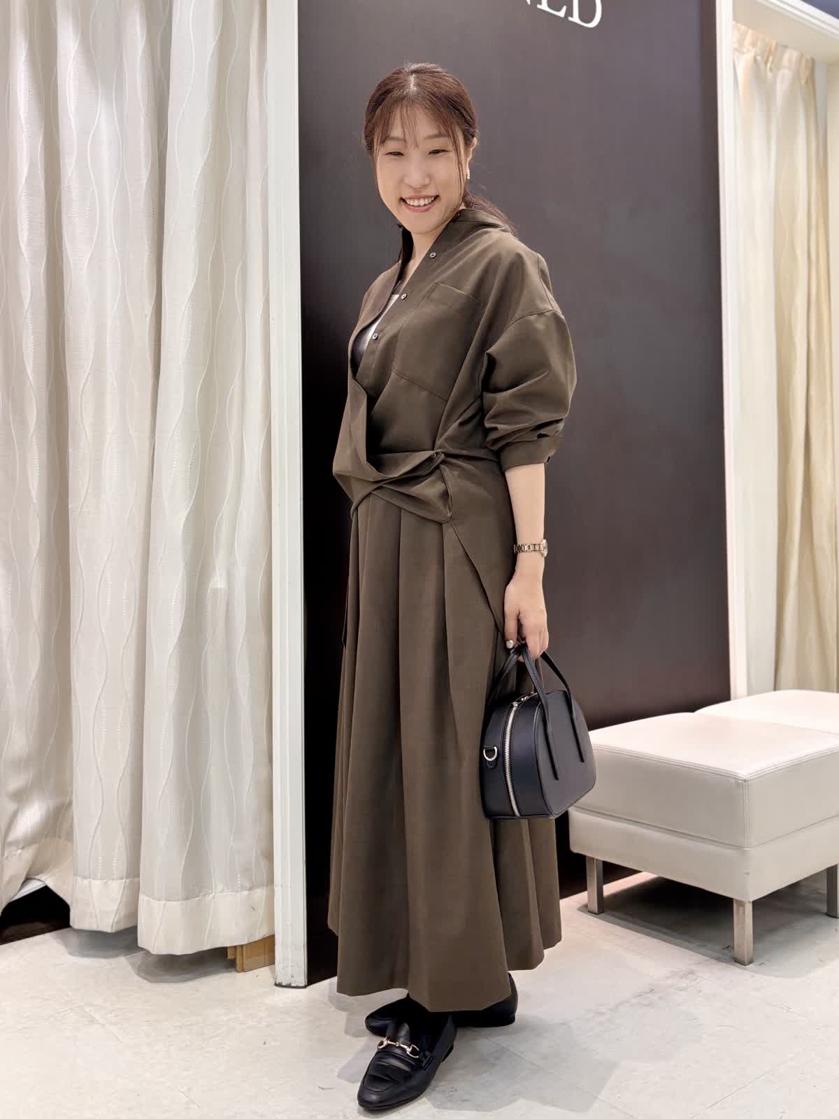 今年注目のブラウンカラーのセットアップは着るだけでキチン感があるので、食事会やビジネスシーンなどさまざまな場面で使えそうです。ブラウスはアレンジが出来るので、気分に合わせて少し大人めにカシュクールデザインにチェンジしてもOK。ウール調に見える綺麗な素材ですが、扱いやすいポリエステル。程よい光沢感があり高見えします。スカートのサイズはゆったりでとても履きやすいです。