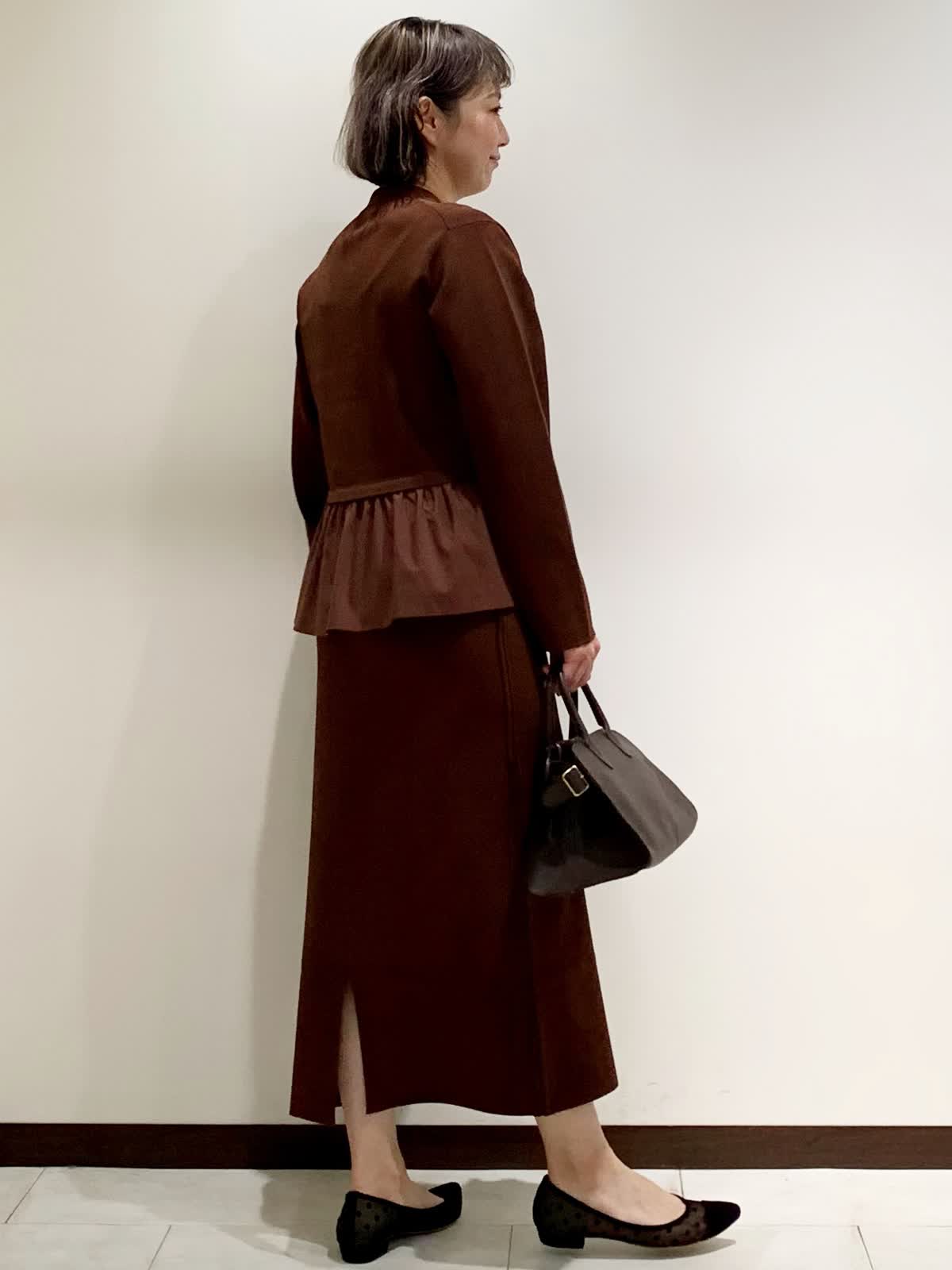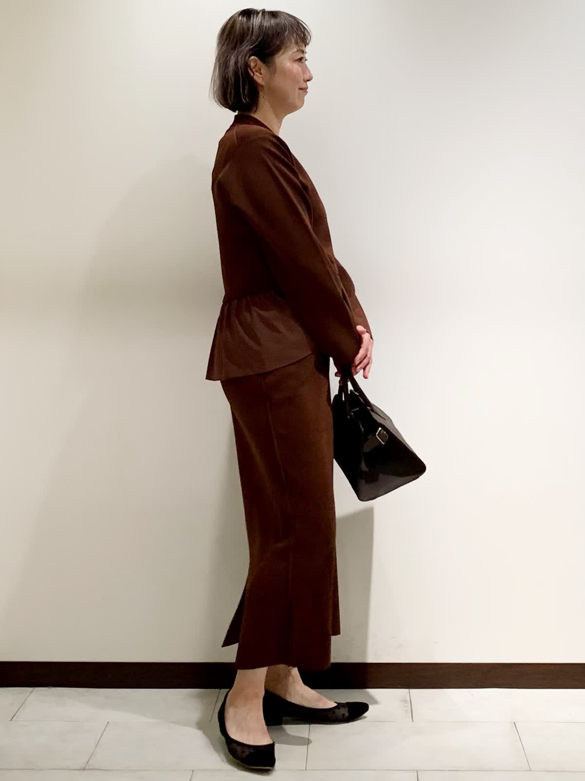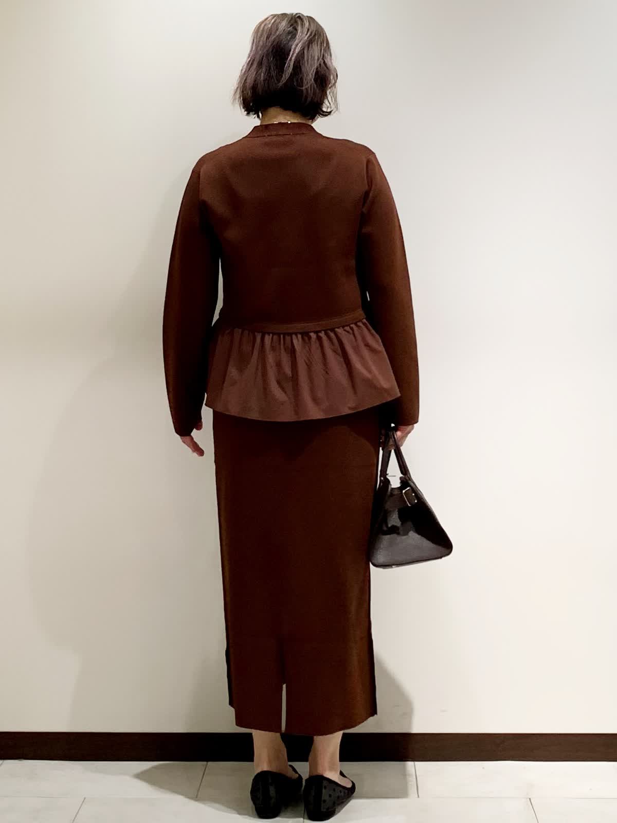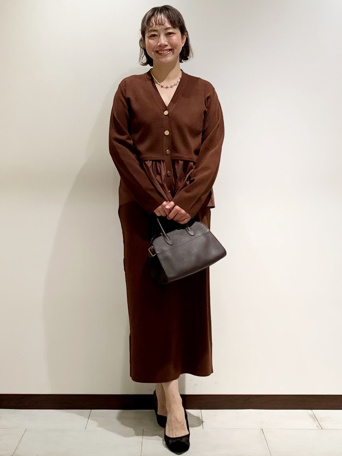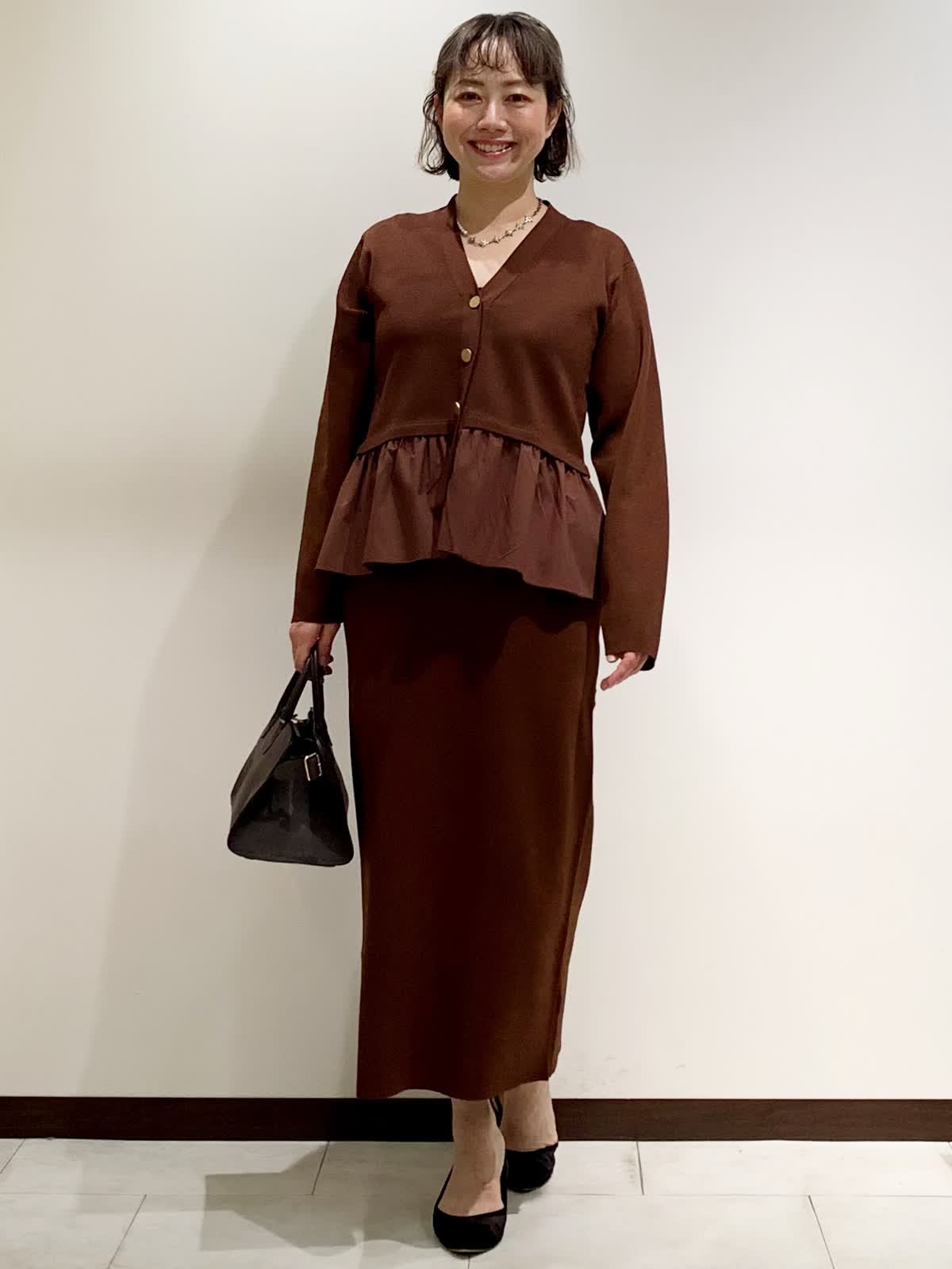 【着用サイズ】フリーサイズ 【着用カラー】カーディガン:ブラウン スカート:ブラウン ネックレス:シルバー バッグ:モカチャ スッキリとしたVネックとウエストからフワッと広がる立体感が着やせ効果抜群な1着。スカートはボディラインを拾いすぎないちょうど良いシルエット。程よい肉感でウエストがゴムなのでリラックスして着られます。