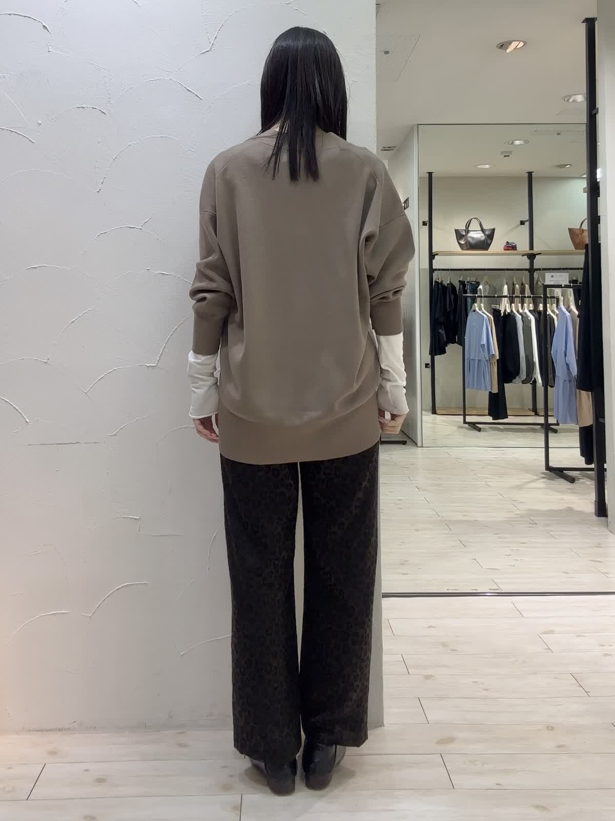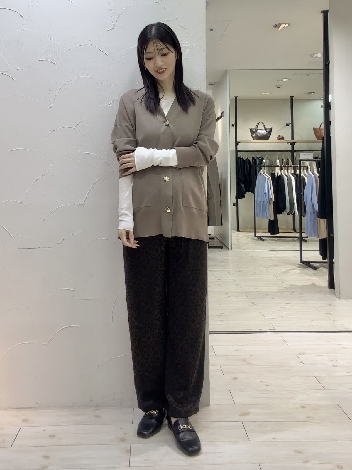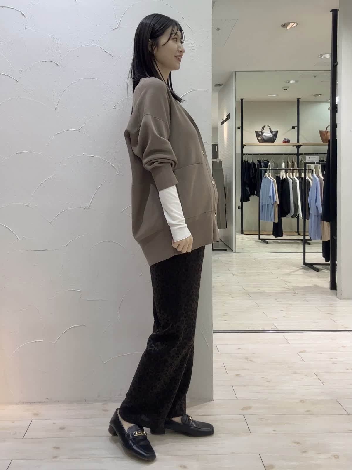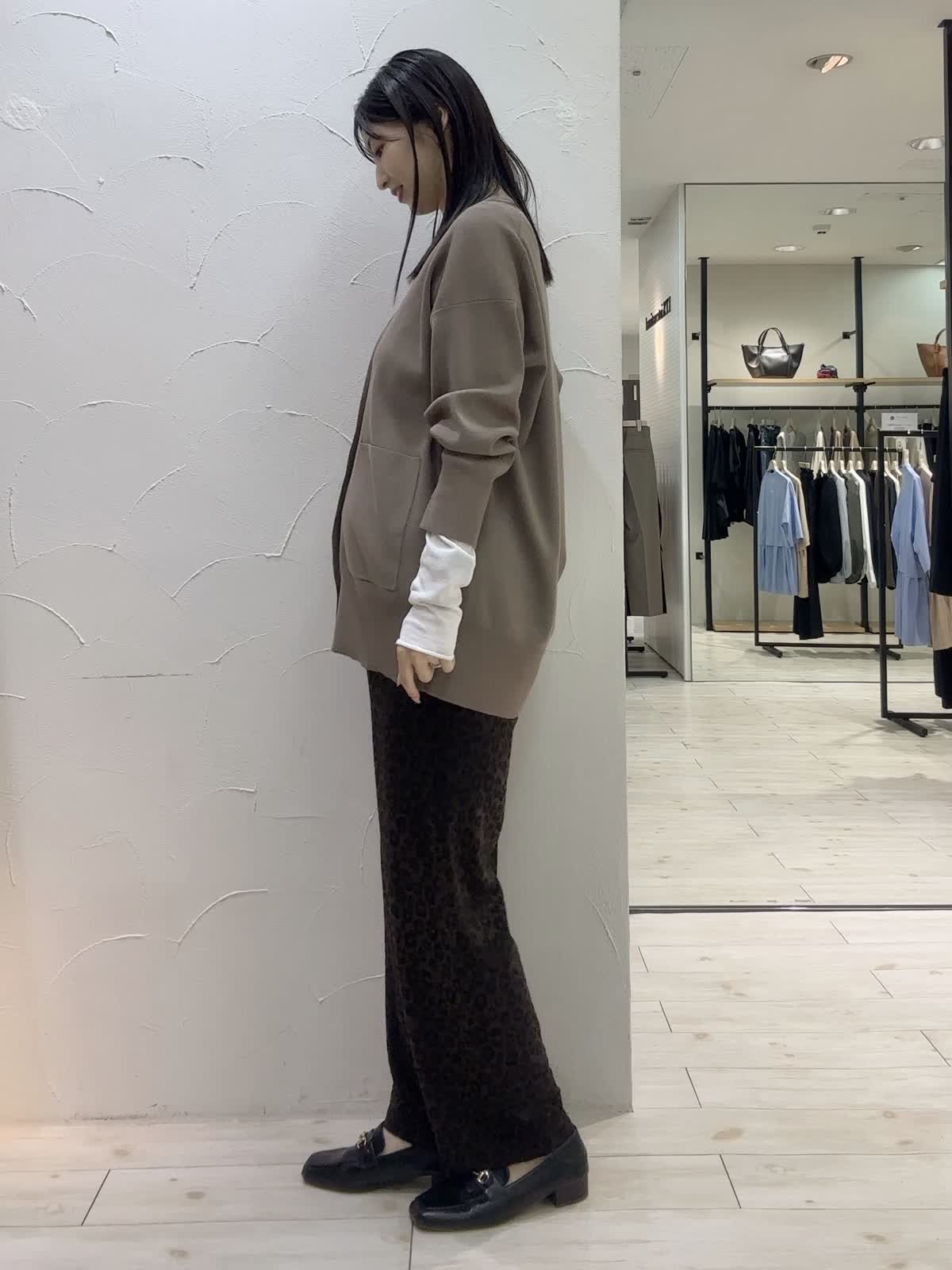 【着用サイズ】カーディガン:フリー カットソー:9号 パンツ:9号 【着用カラー】カーディガン:モカチャ カットソー:オフホワイト パンツ:柄中 秋のリラックスコーデ。カーディガンは、ヒップが隠れる着丈感で安心感があります。シアーカットソーをレイヤードしてこなれ感のあるシルエットに。レオパード柄のパンツは程よいラメ感があり上品な印象。ウエスト総ゴムなのでリラックスして着用できます。