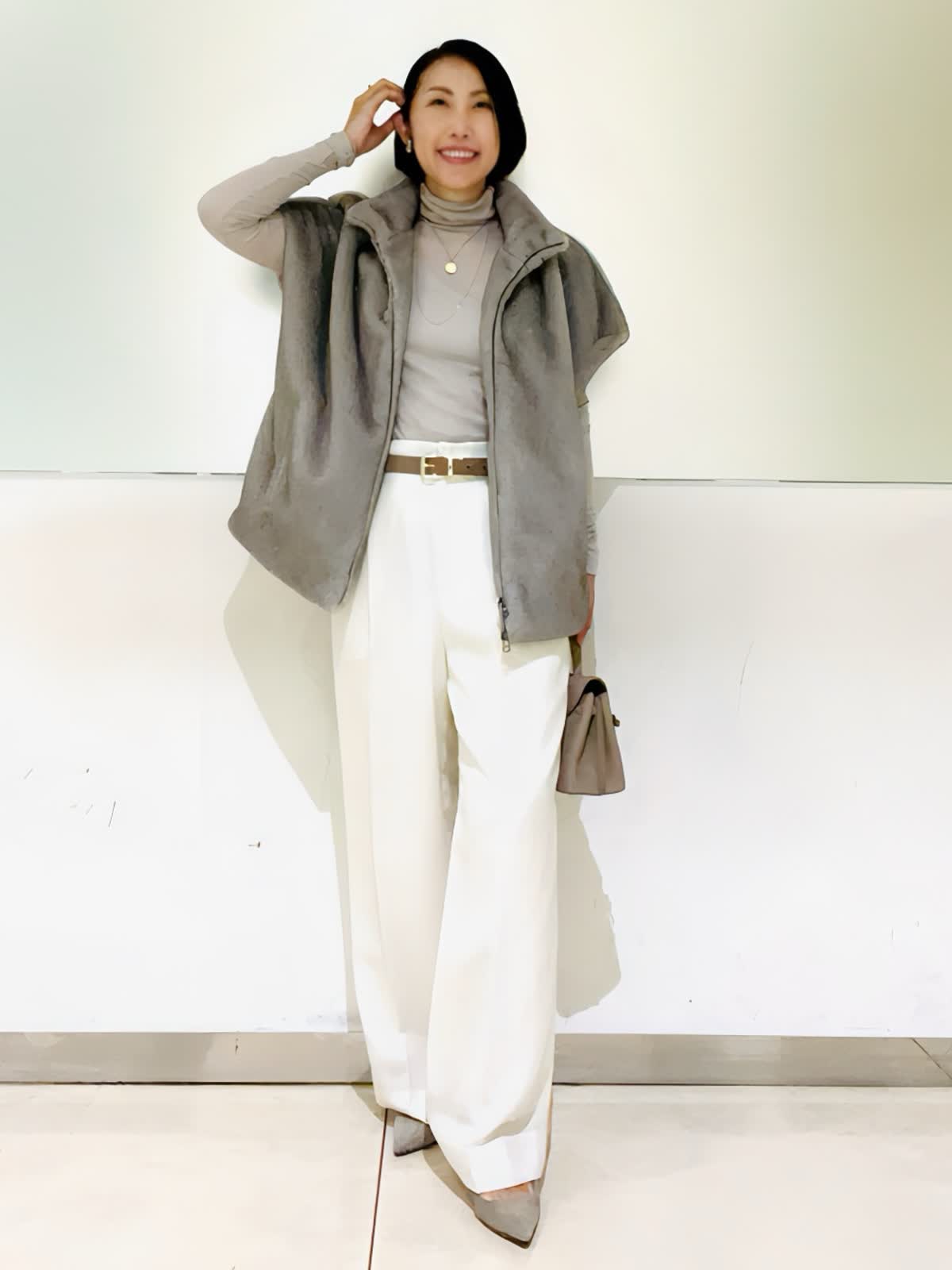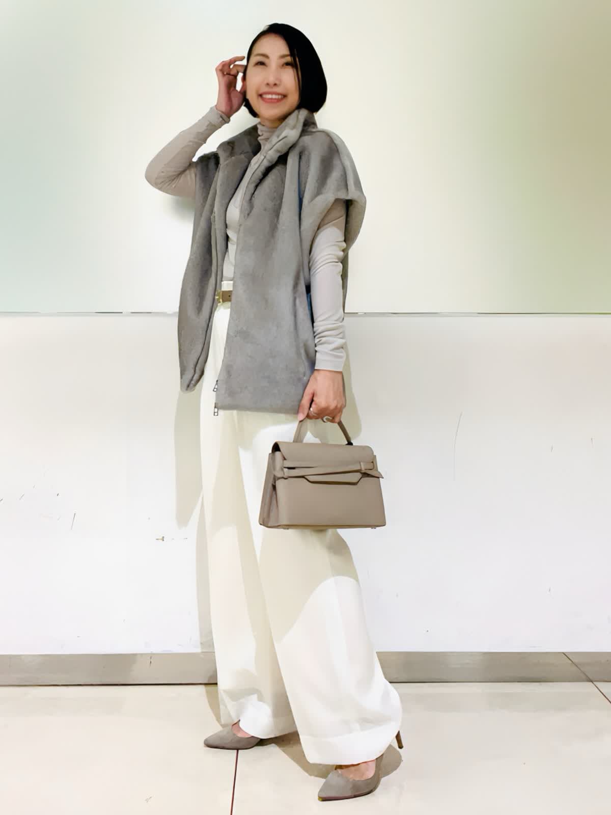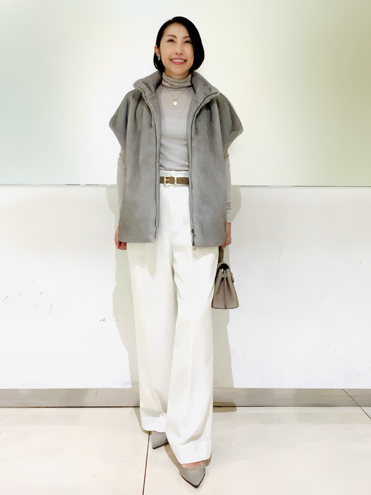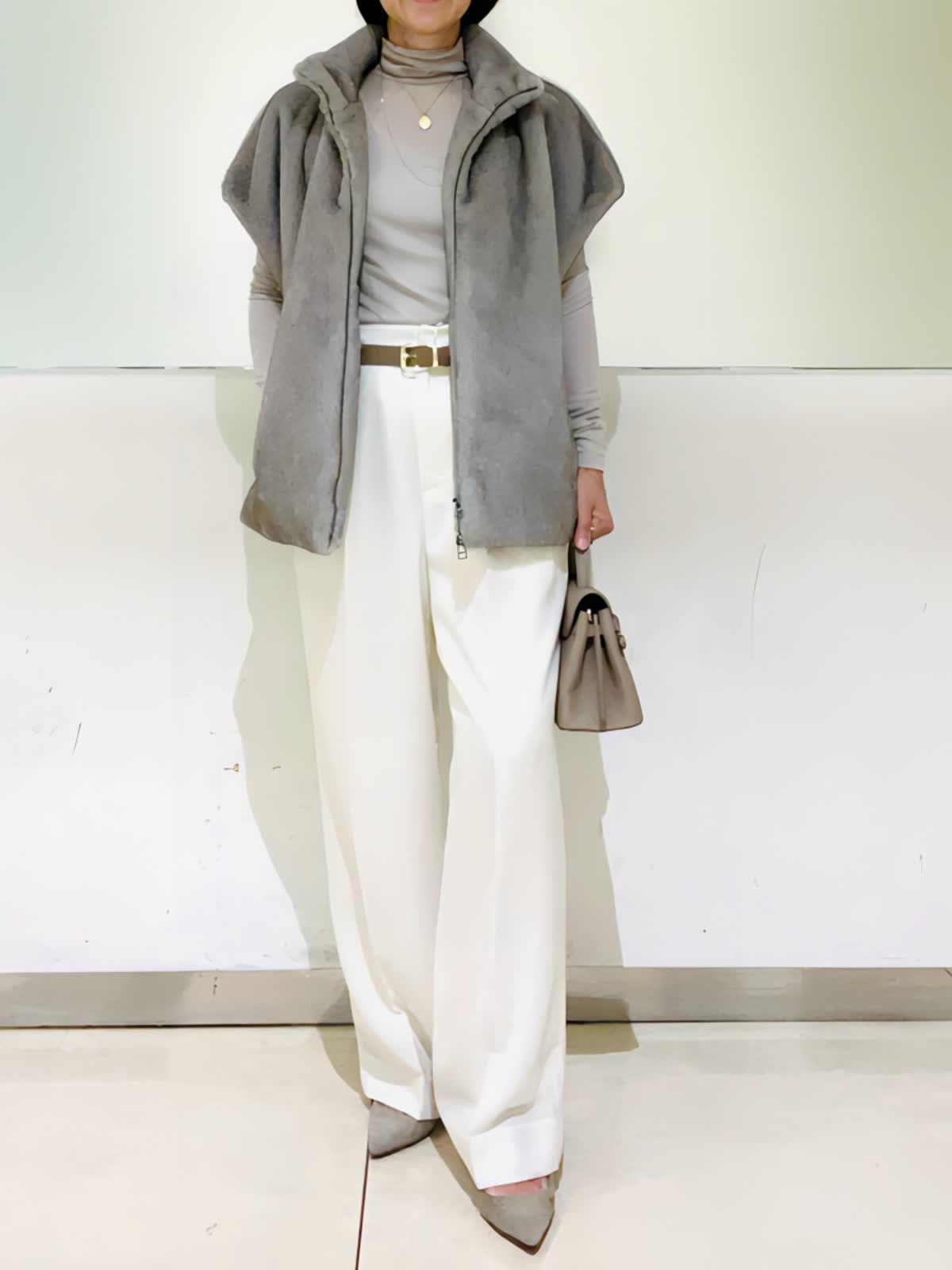 【着用アイテム】すべて9号 【着用カラー】ブルゾン:グレーベージュ カットソー:グレー パンツ:オフホワイト 高級感のあるミンクライクなエコファーブルゾン。まるで本物のようなエコファーは羽織るだけでリッチな気分に。抜け感のあるグレーベージュがこなれた雰囲気に。オフホワイトのパンツを合わせることでおしゃれ感がアップするスタイリングです。