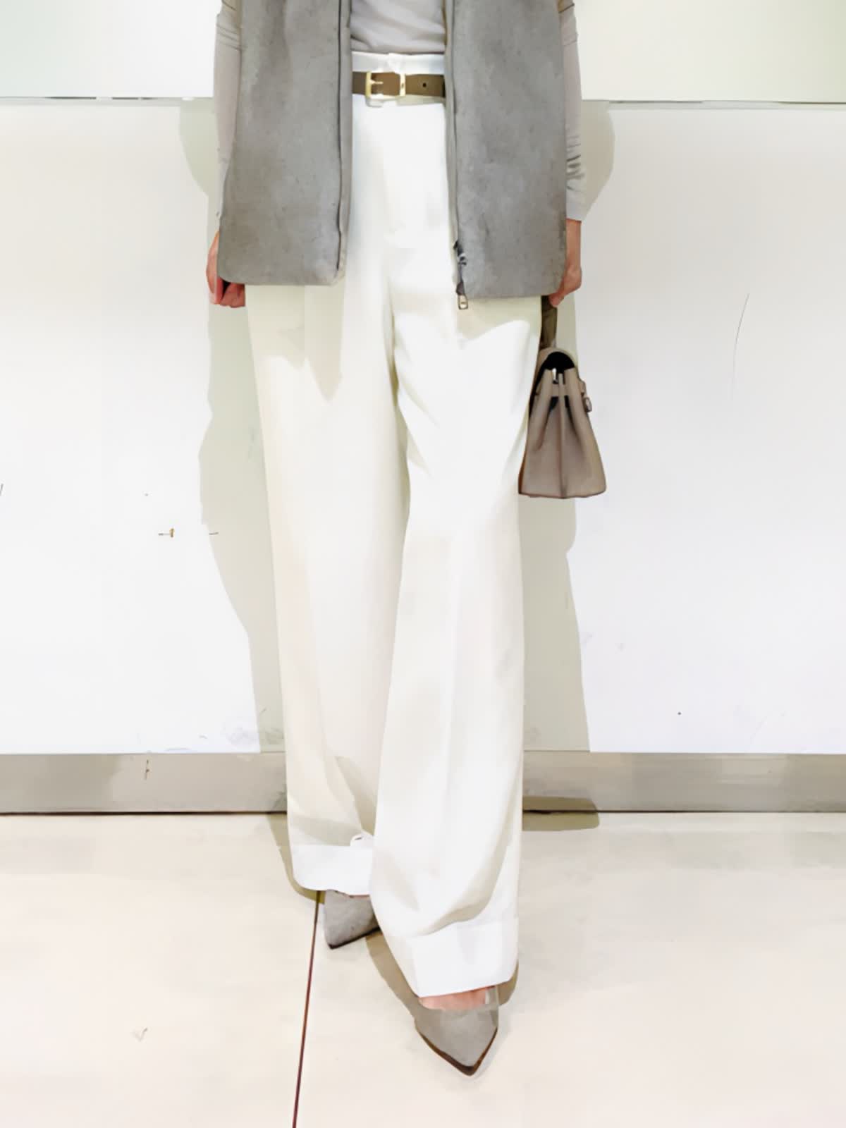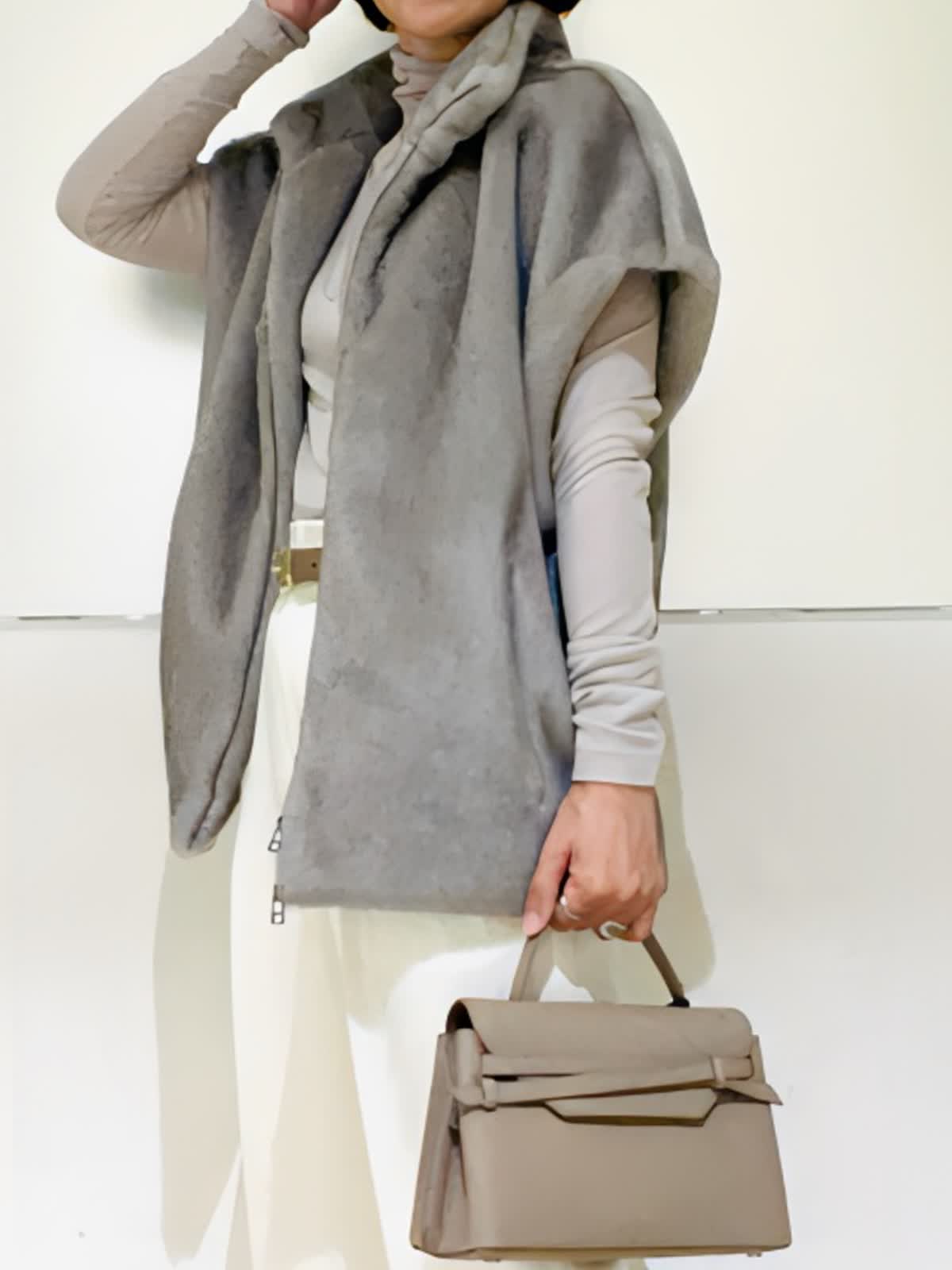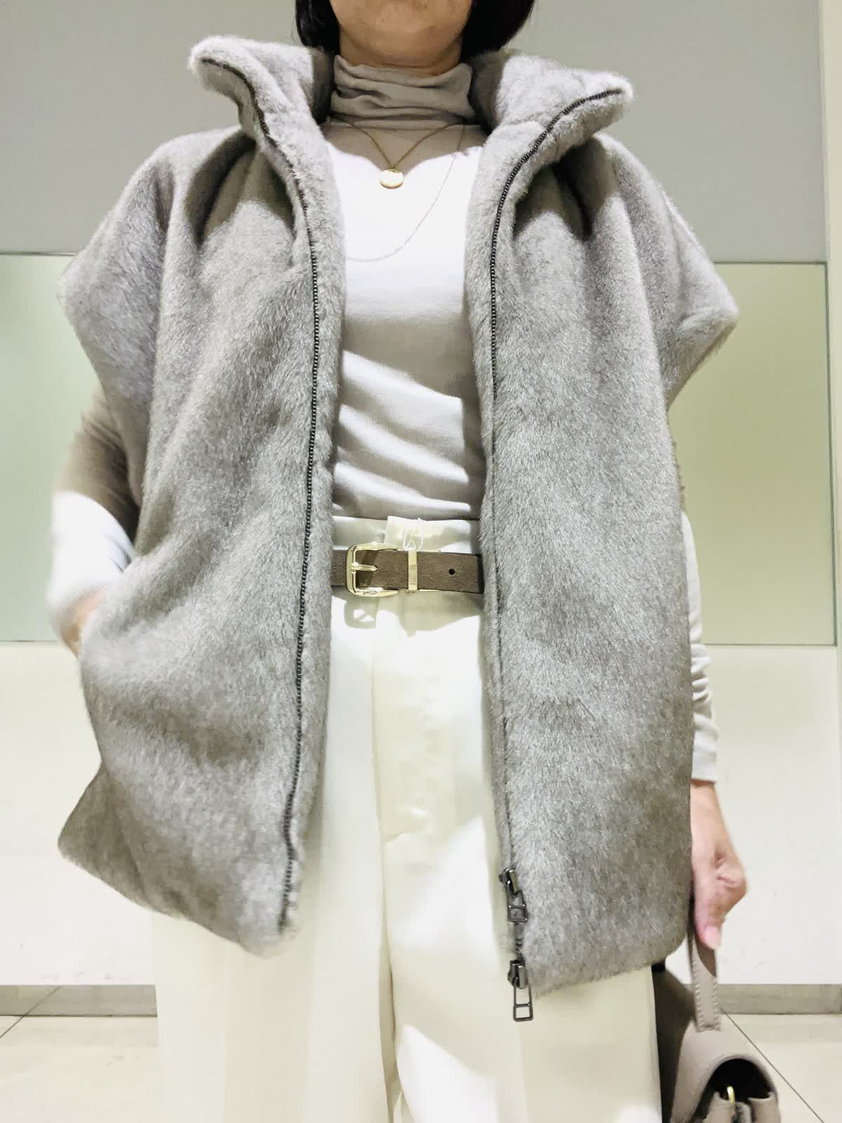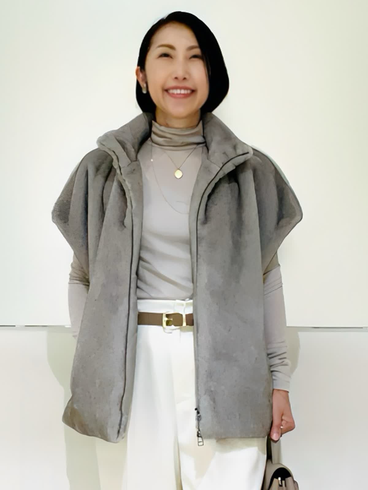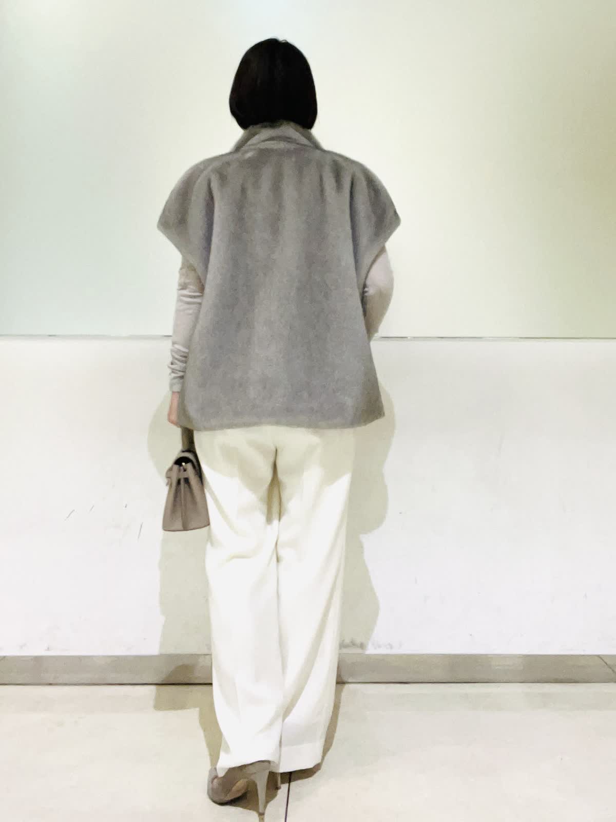 【着用アイテム】すべて9号 【着用カラー】ブルゾン:グレーベージュ カットソー:グレー パンツ:オフホワイト 高級感のあるミンクライクなエコファーブルゾン。まるで本物のようなエコファーは羽織るだけでリッチな気分に。抜け感のあるグレーベージュがこなれた雰囲気に。オフホワイトのパンツを合わせることでおしゃれ感がアップするスタイリングです。