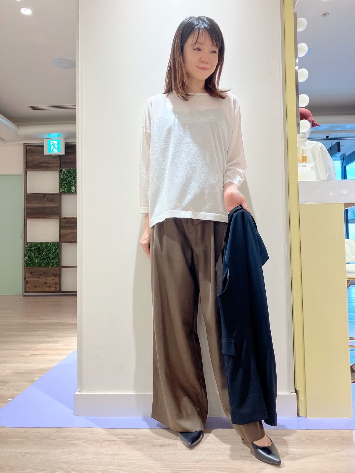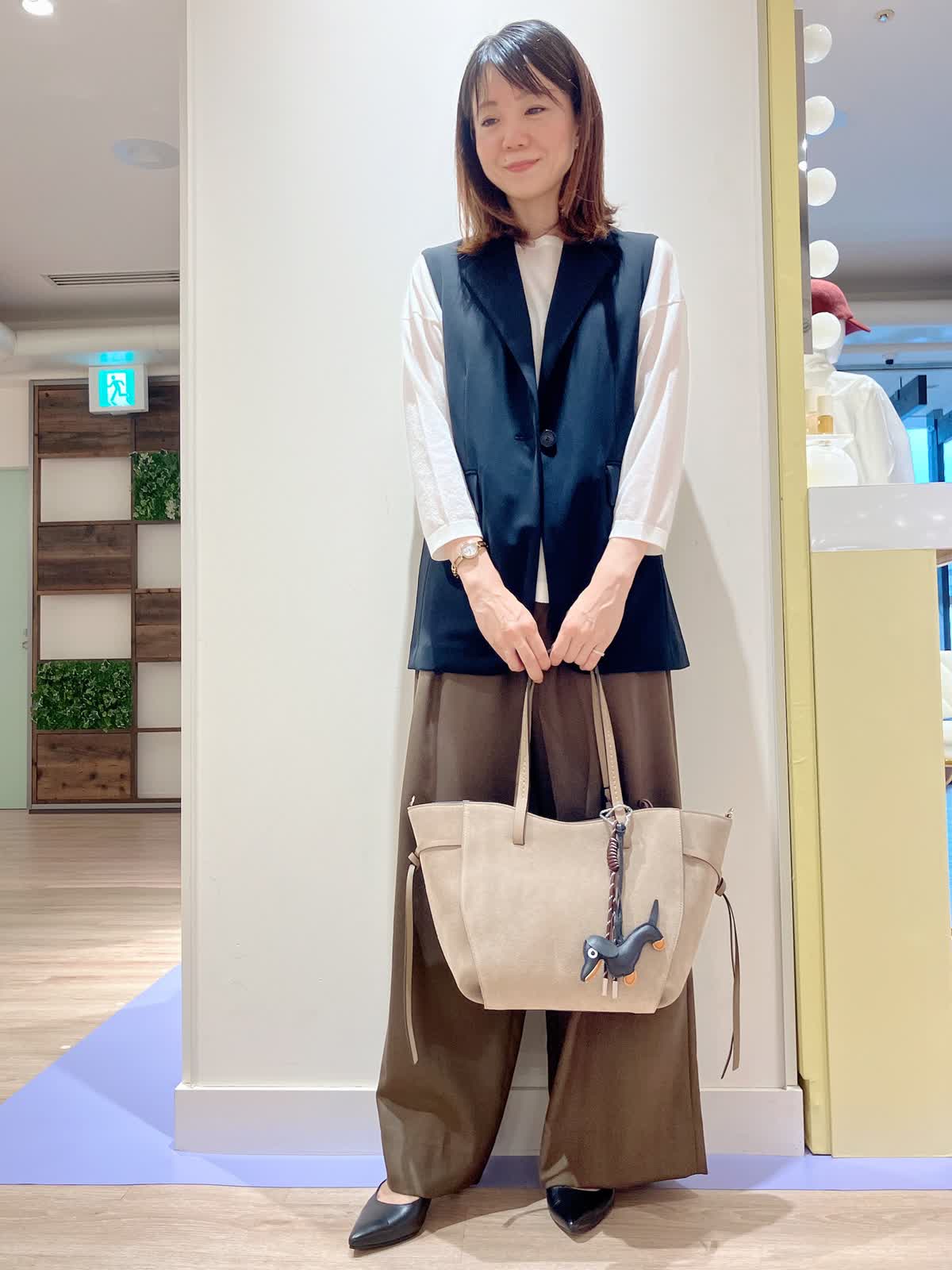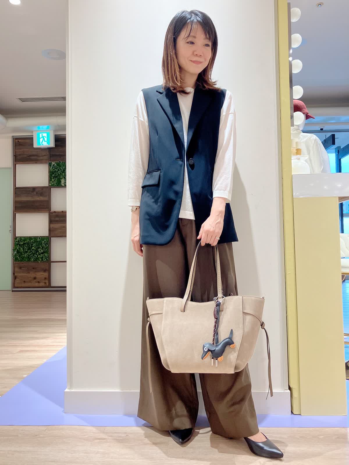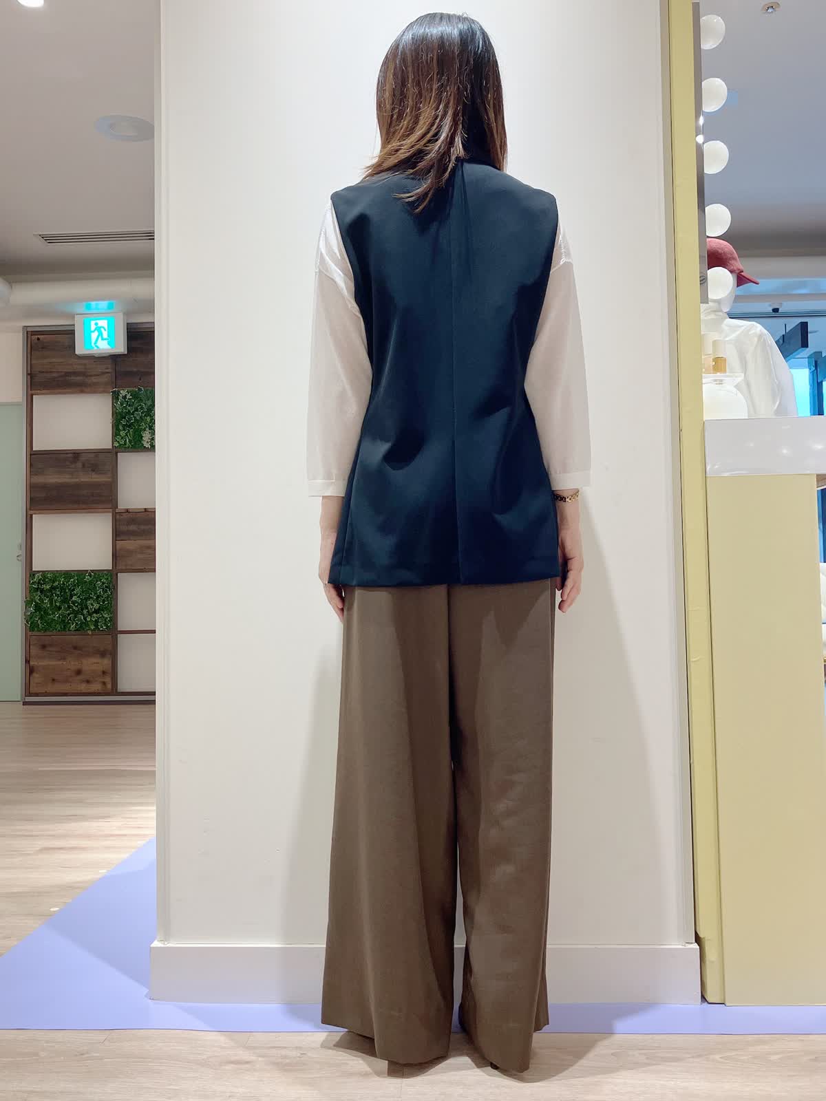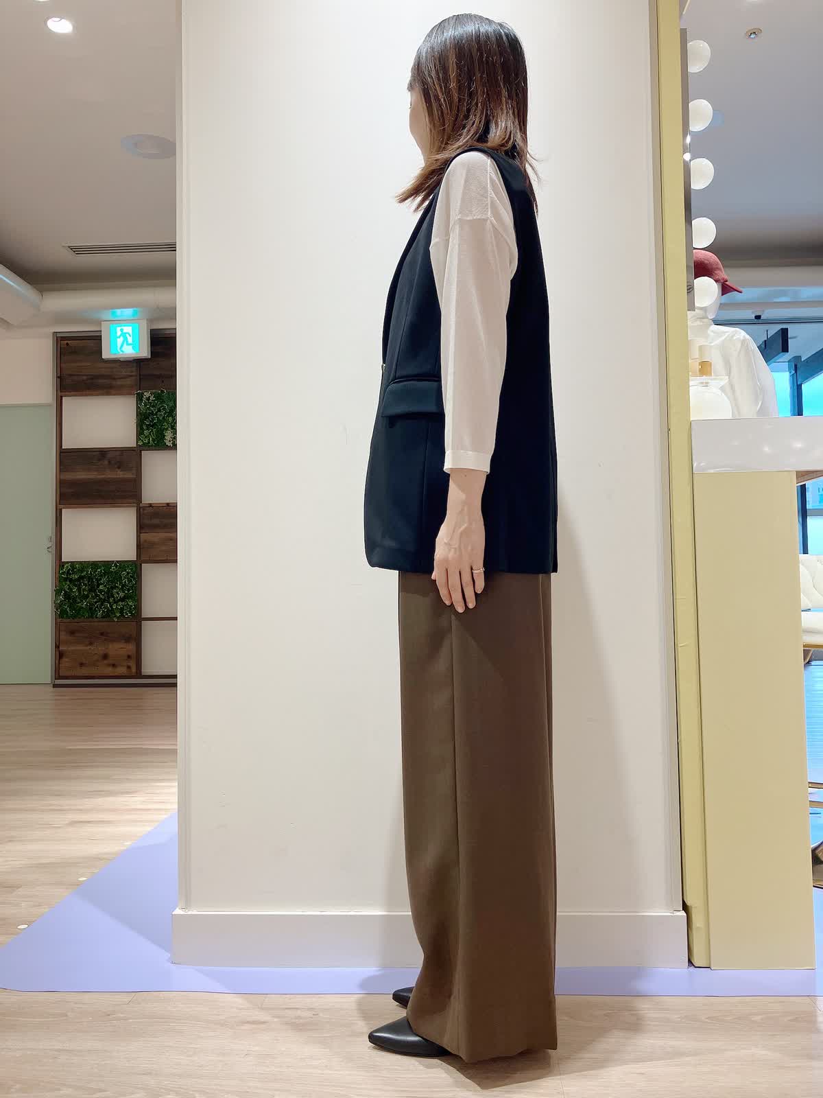 【着用サイズ】ジャケット:9号 ニット:9号 パンツ:7号 【着用カラー】ジャケット:ブラック ニット:オフホワイト パンツ:ブラウン コーディネートのテーマはトラッドな通勤スタイリングです。 ジャケット見えするジレは、季節の変わりめの通勤にもぴったりのアイテム。今年らしくシアー感のあるインナーと合わせてお洒落度アップ。ブラウンのワイドパンツ投入でトラッドな秋の通勤スタイリングにおすすめです。