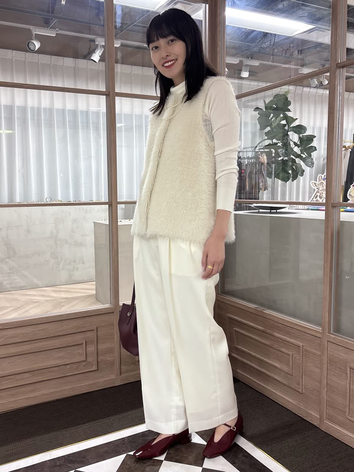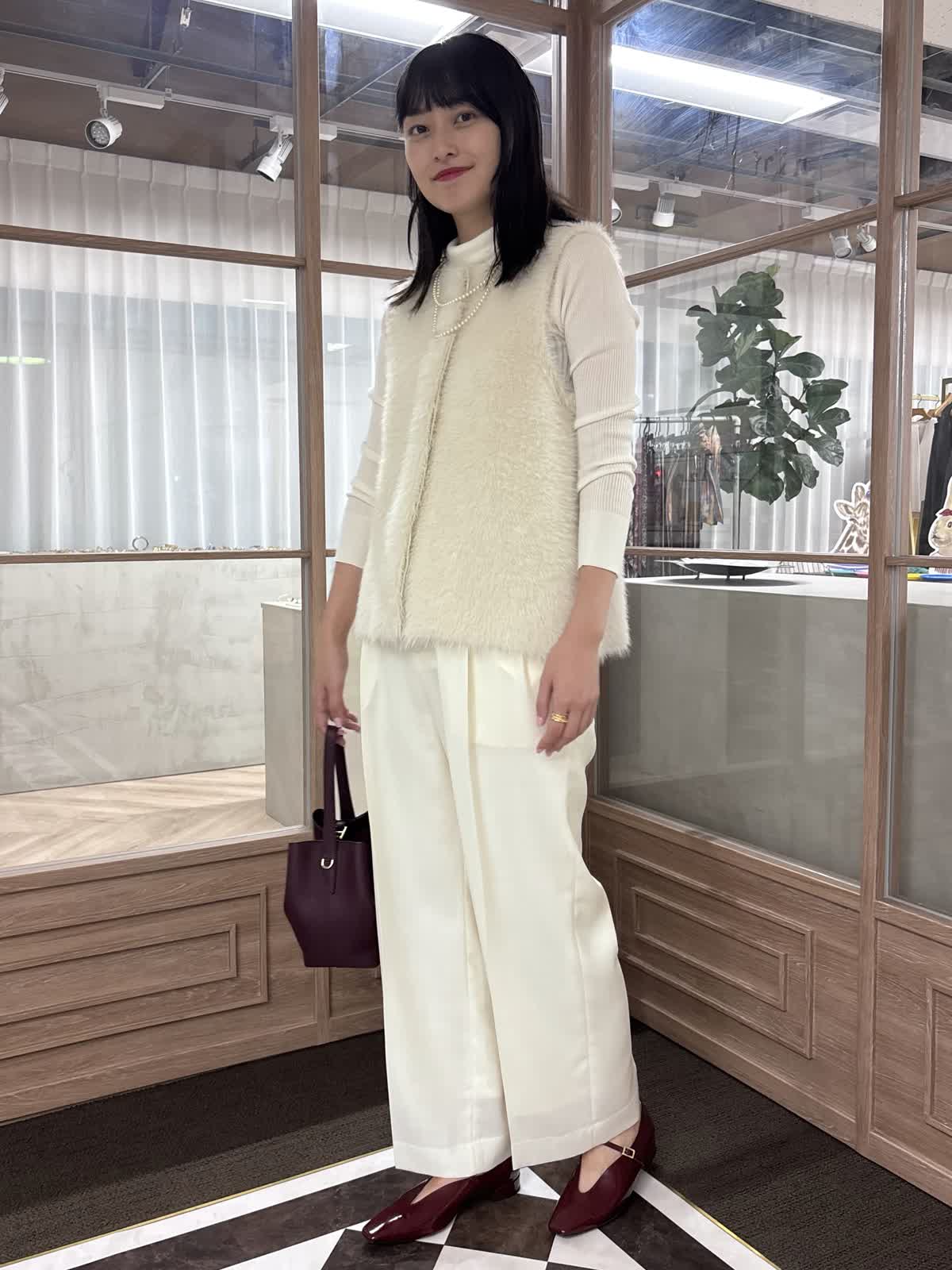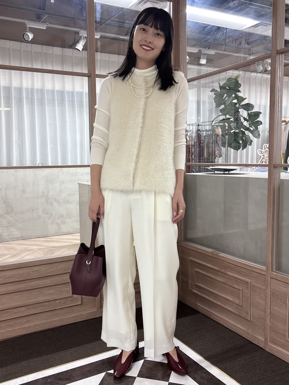 【着用カラー】ニットジレ:オフホワイト、ニット:オフホワイト、パンツ:オフホワイト、バッグ:ワイン 【着用サイズ】ニットジレ:9号、ニット:9号、パンツ:9号 コーディネートのテーマは、秋のお出かけコーデです。ファージレはふんわりとした毛足で心地よく、コーディネートのアクセントになるアイテムです。ややコンパクトで、着痩せ効果も抜群。一枚でも、中にニットを合わせても着られる万能アイテムです。中のニットはタートルネックで、どんなコーデにも合う秋冬大活躍のアイテム。様々なカラー展開で、まとめ買いもおすすめ。少しワイドめなパンツは薄めの素材で、今の時期から着用することができます。靴とバッグをボルドーで合わせて、秋コーデの完成です。