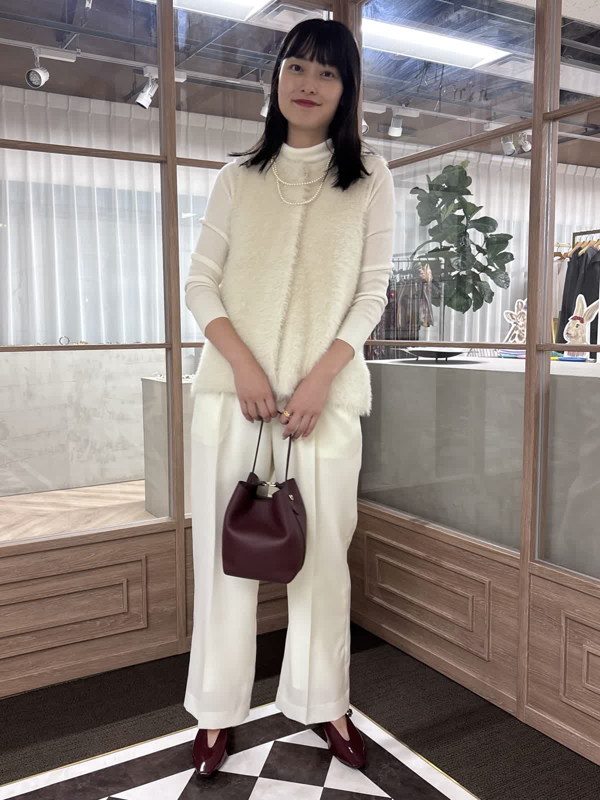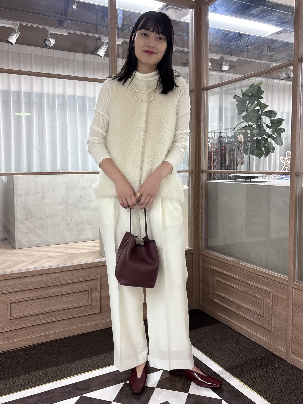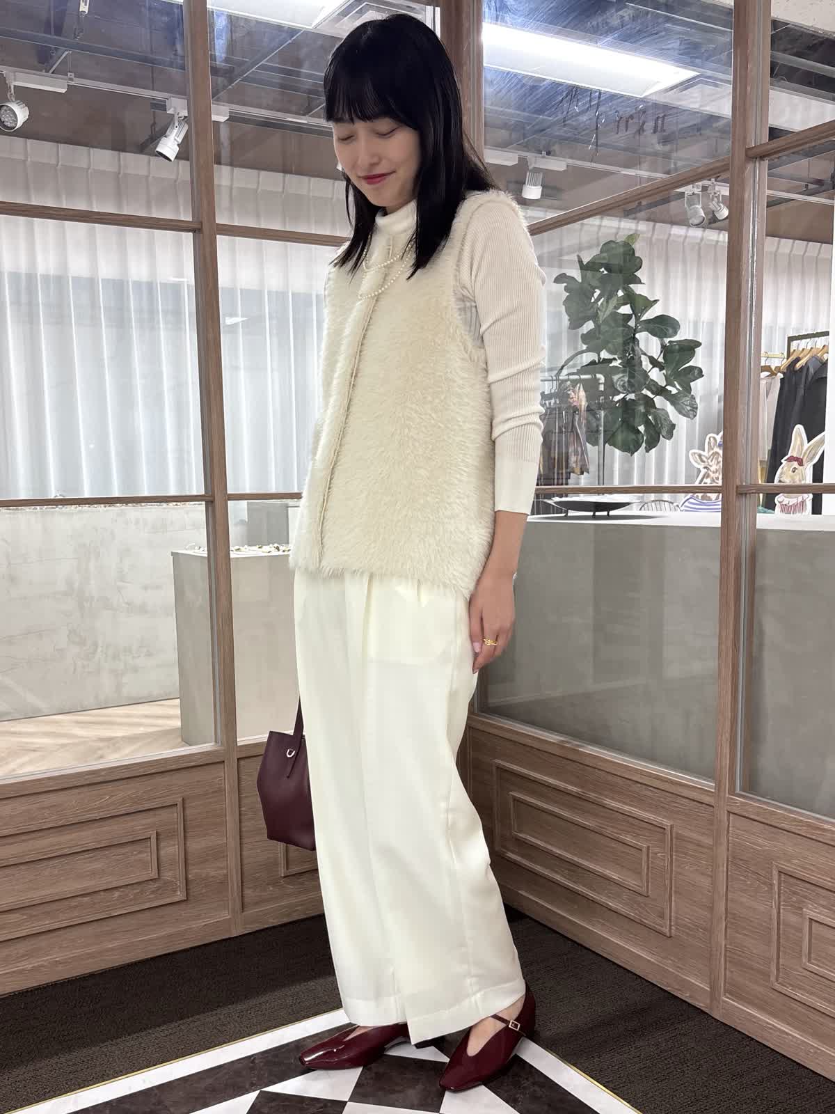 【着用カラー】ニットジレ:オフホワイト、ニット:オフホワイト、パンツ:オフホワイト、バッグ:ワイン 【着用サイズ】ニットジレ:9号、ニット:9号、パンツ:9号 コーディネートのテーマは、秋のお出かけコーデです。ファージレはふんわりとした毛足で心地よく、コーディネートのアクセントになるアイテムです。ややコンパクトで、着痩せ効果も抜群。一枚でも、中にニットを合わせても着られる万能アイテムです。中のニットはタートルネックで、どんなコーデにも合う秋冬大活躍のアイテム。様々なカラー展開で、まとめ買いもおすすめ。少しワイドめなパンツは薄めの素材で、今の時期から着用することができます。靴とバッグをボルドーで合わせて、秋コーデの完成です。