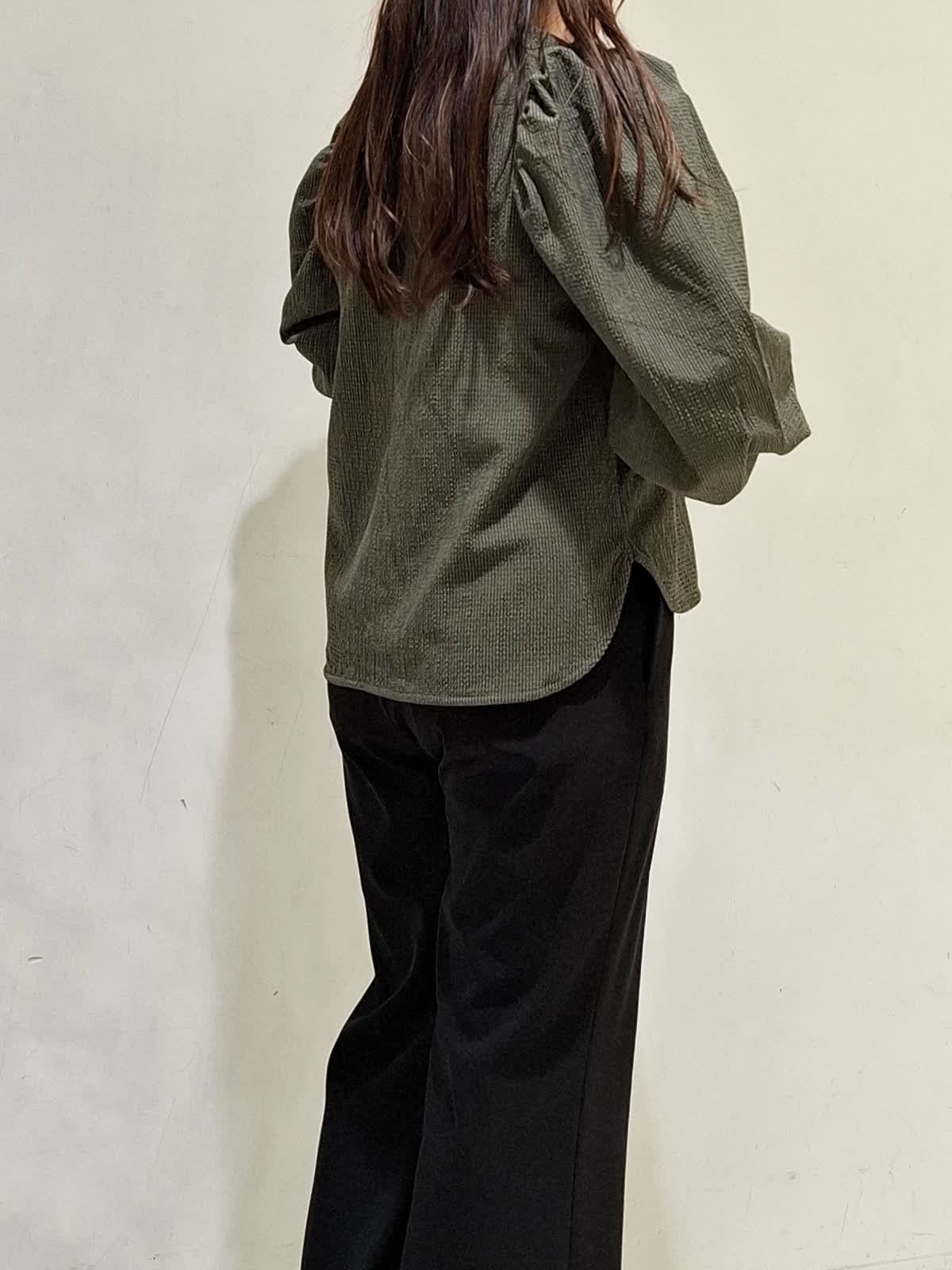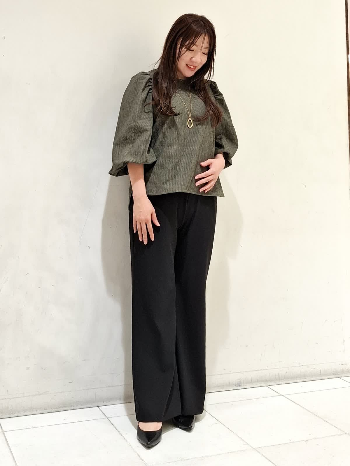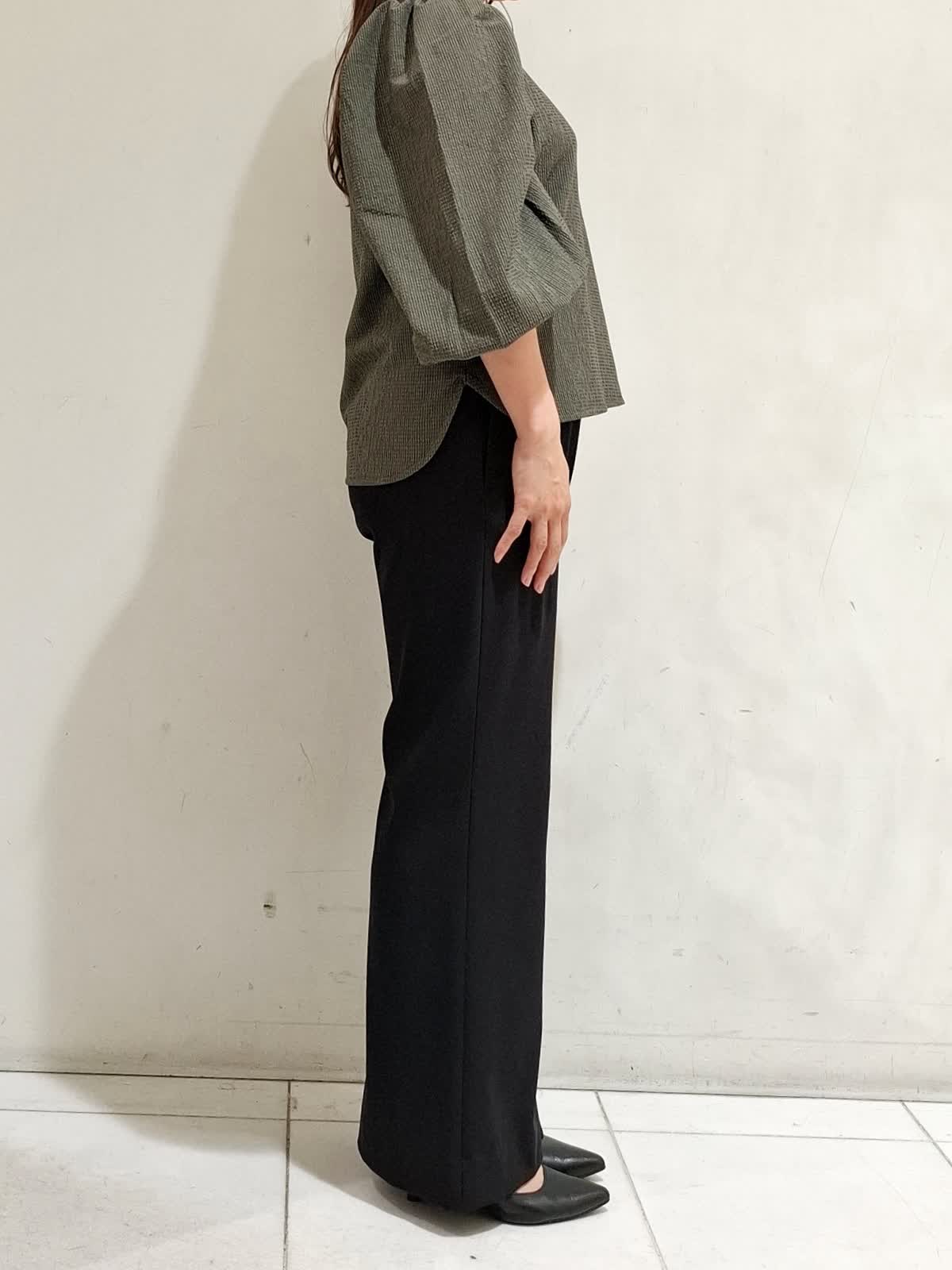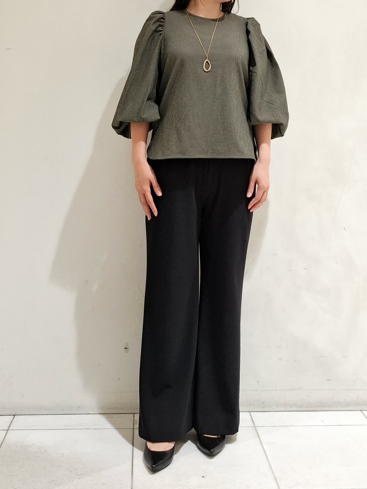 【着用サイズ】カットソー:フリーサイズ カーキ パンツ:9号サイズ ブラック ボリュームギャザースリーブで表面感があり、一枚で着ても着映えするカットソー。気温が高い日でもドライタッチで着やすく、軽くて伸縮性のある素材でストレスフリーです。パンツは、ウエストゴム仕様ではきやすく、脚のラインがキレイに見えるデザインです。