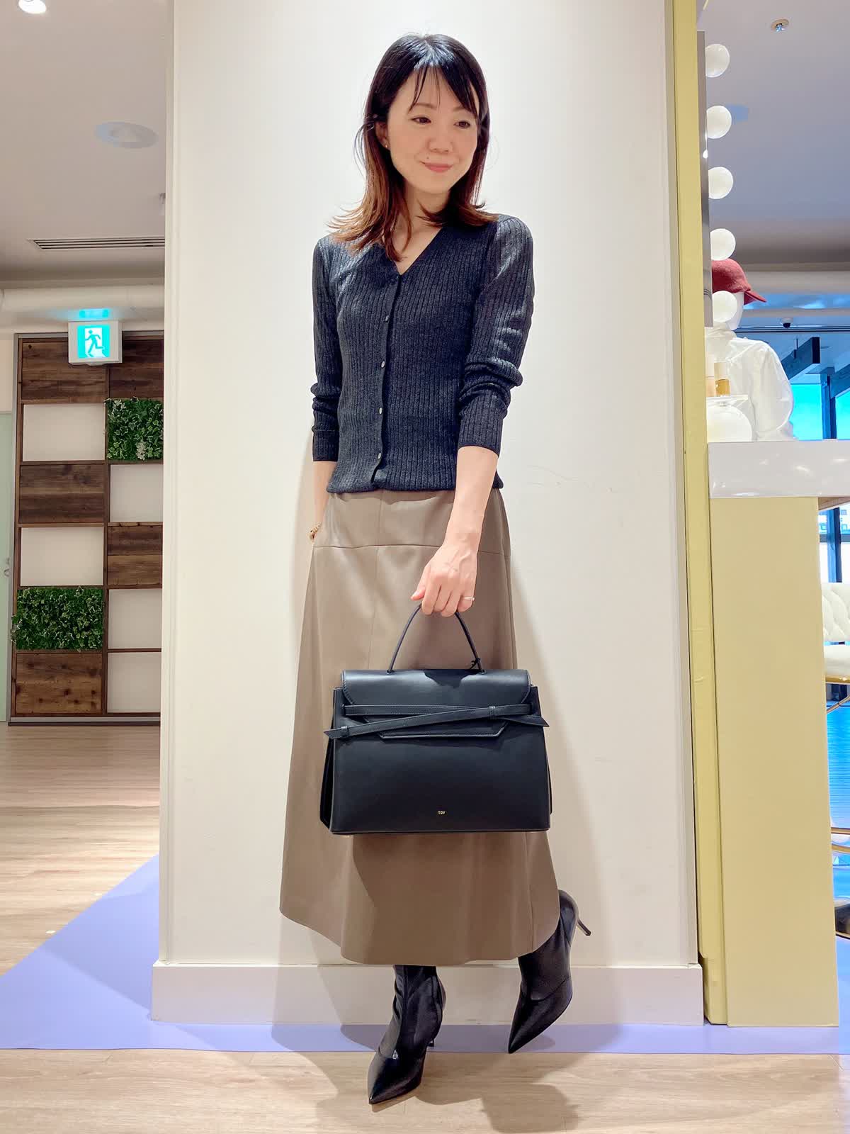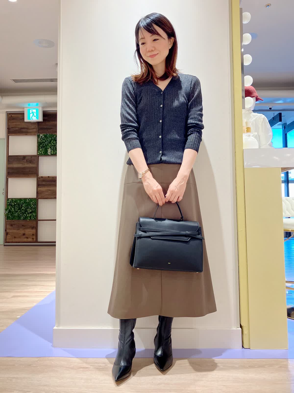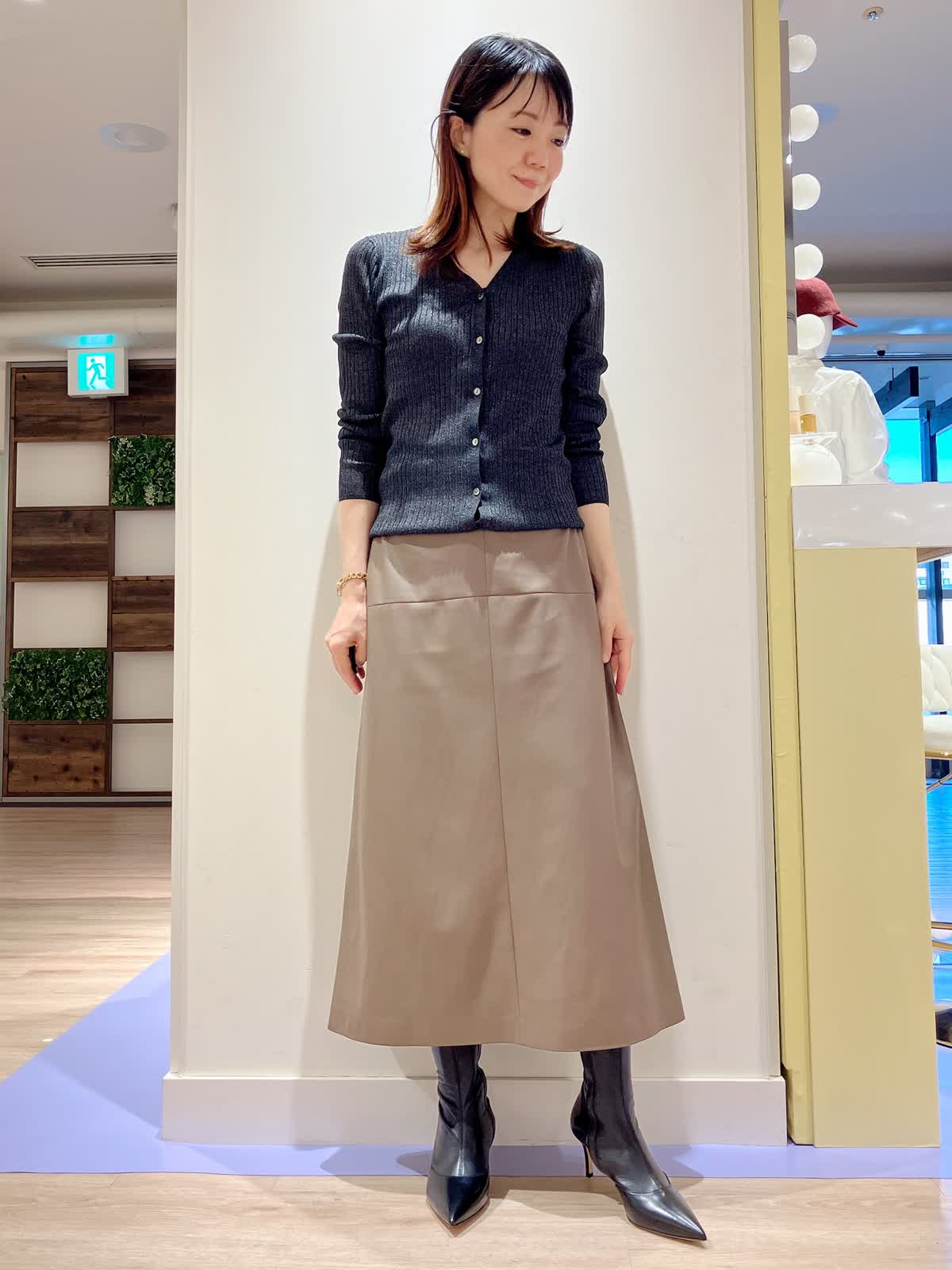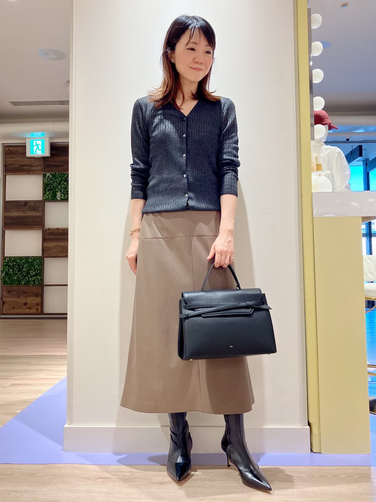 【着用サイズ】カーディガン:9号 スカート:7号 【着用カラー】カーディガン:ブラック スカート:ブラウン コーディネートのテーマは秋の通勤スタイリングです。 リブのカーディガンをプルオーバー風に着こなして、程よくラメ感があり、程よいVネックが女性らしい1枚です。フェイクレザーのフレアスカートを合わせて一気に秋らしさ投入。大きめのバッグと合わせて通勤におすすめのコーディネートです。