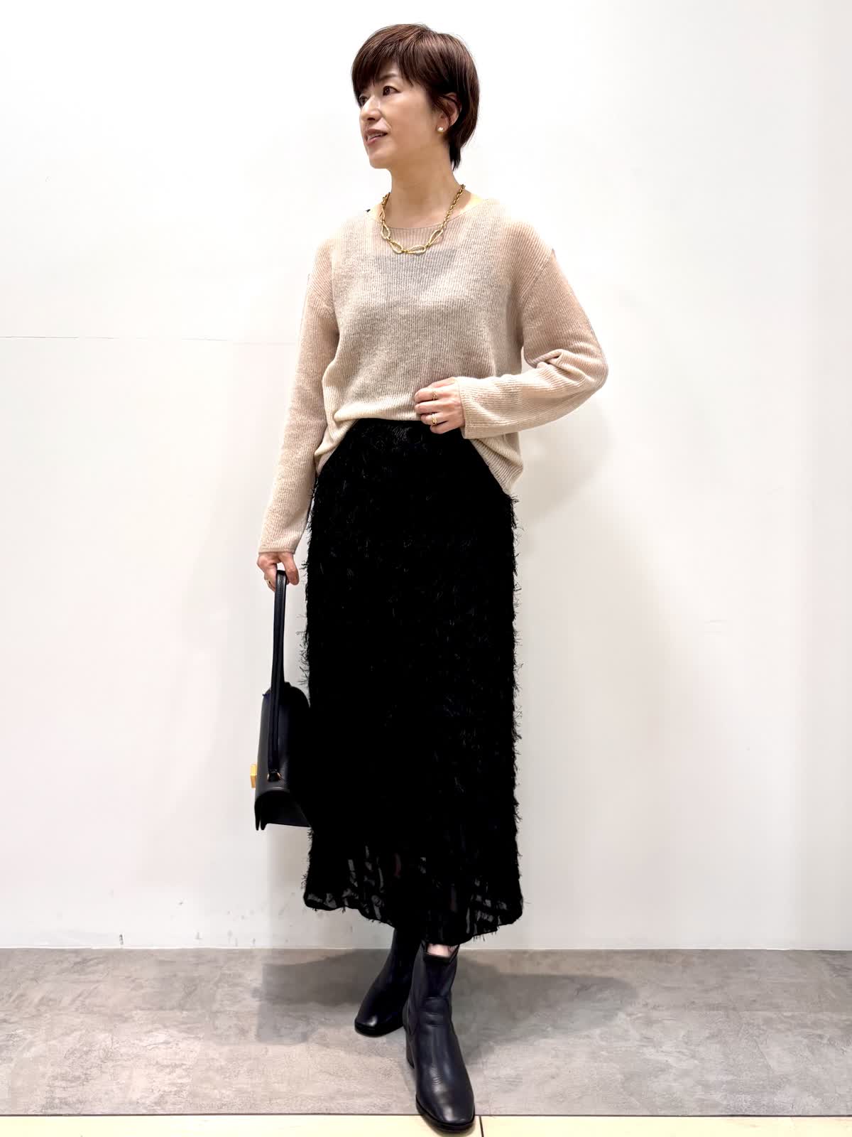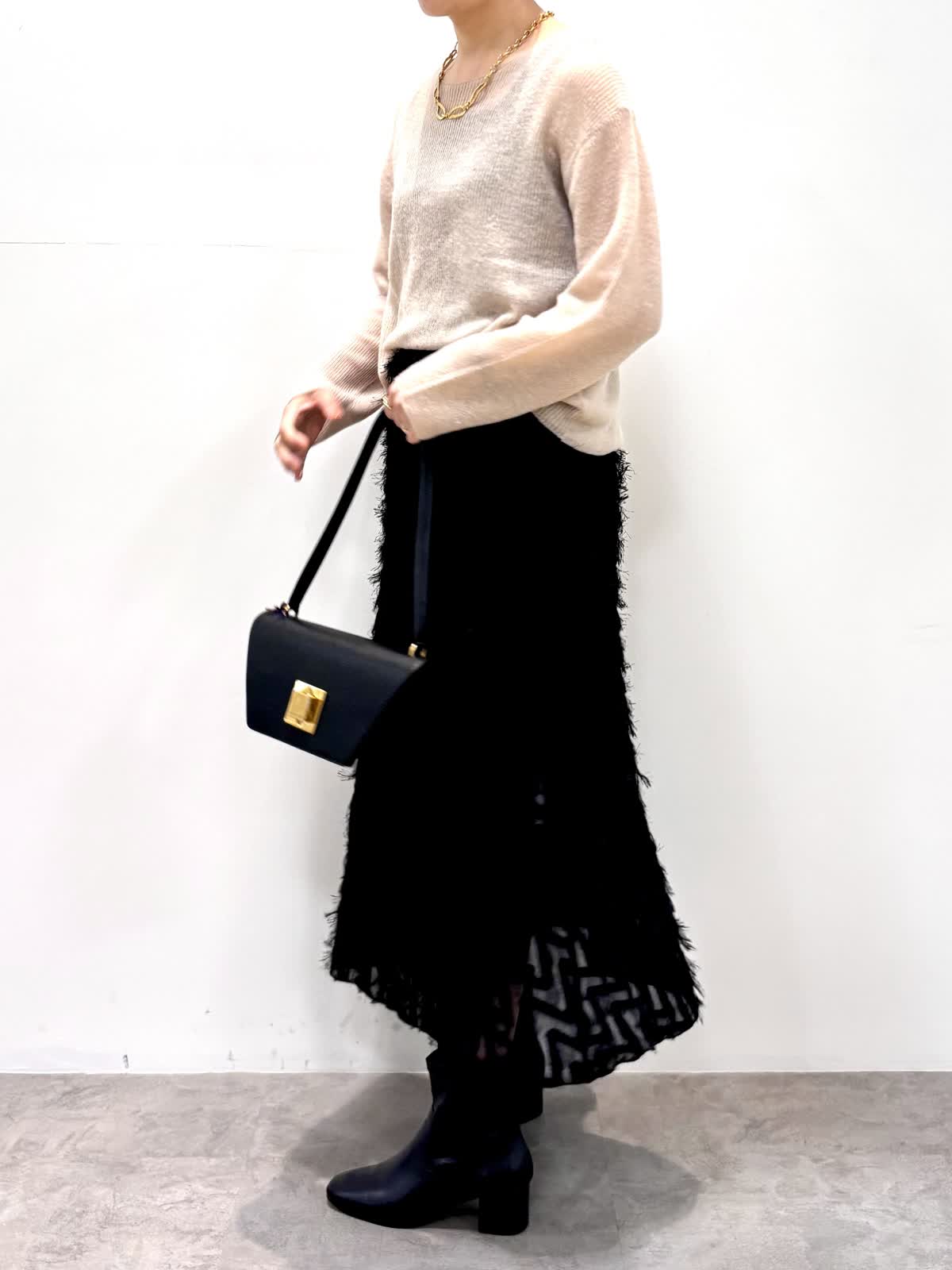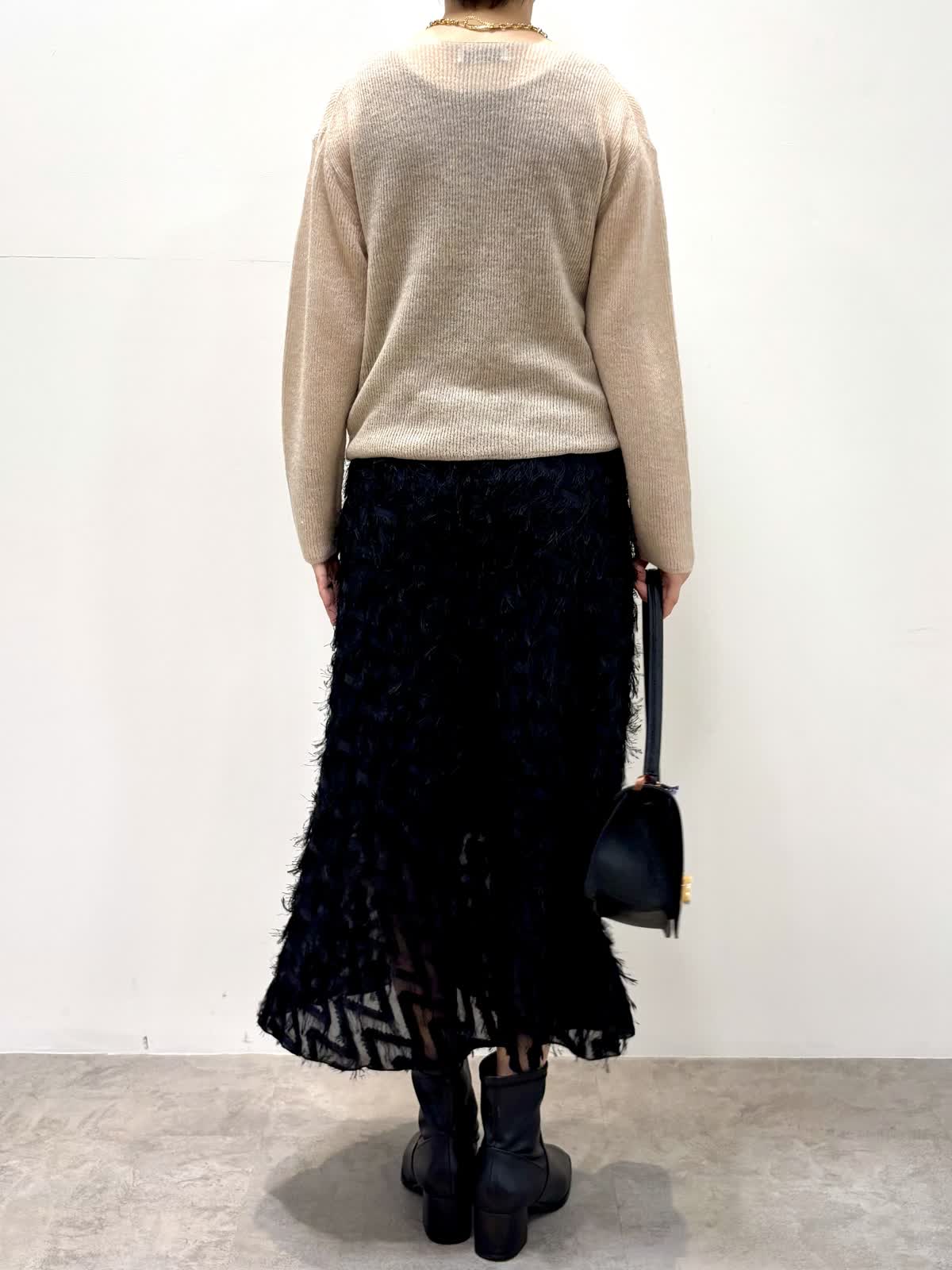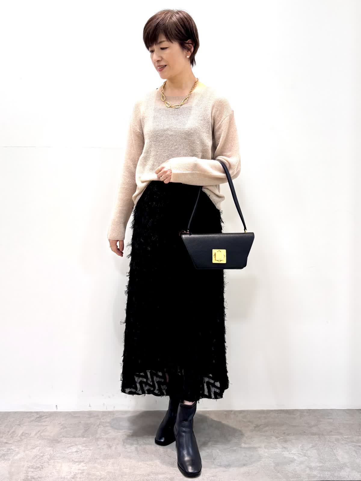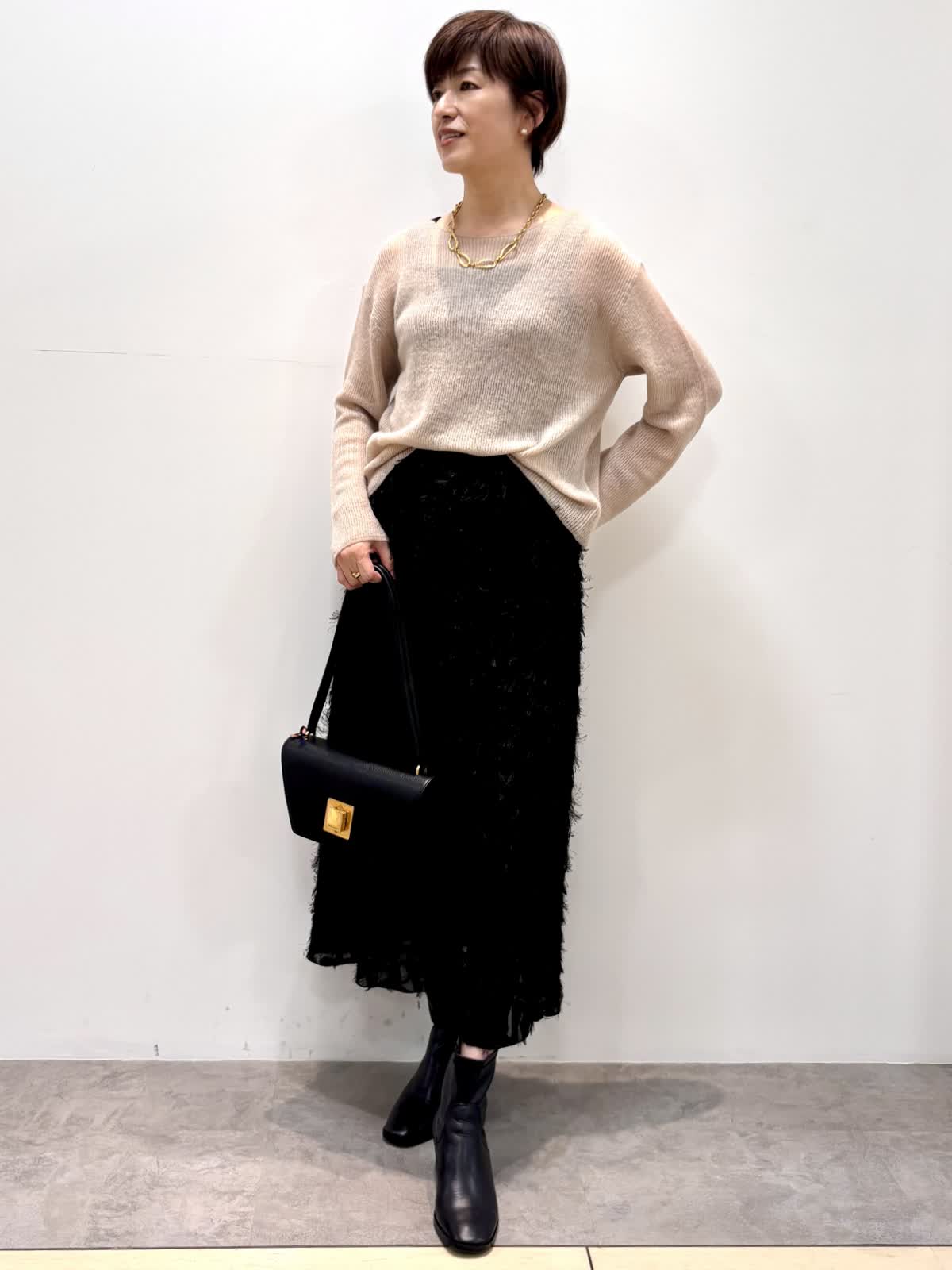 [着用サイズ]ニット:9号 スカート:7号 [着用カラー]ニット:ベージュ スカート:ブラック 今年トレンドのシアー感のあるニットはアルパカ混の軽くて柔らかい着心地です。ジャガードのフリンジをあしらったスカートは一枚で着映えします。モードな雰囲気で、カジュアルコーデと綺麗めコーデのどちらにも合わせやすいです。