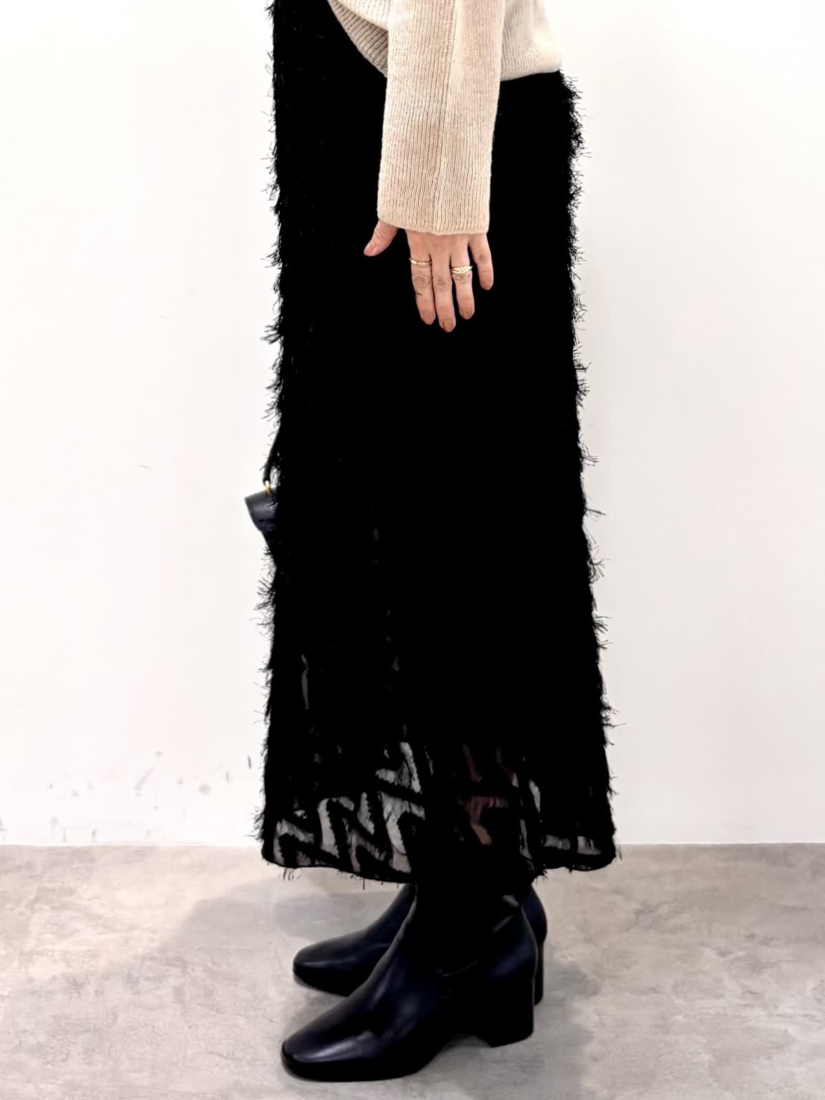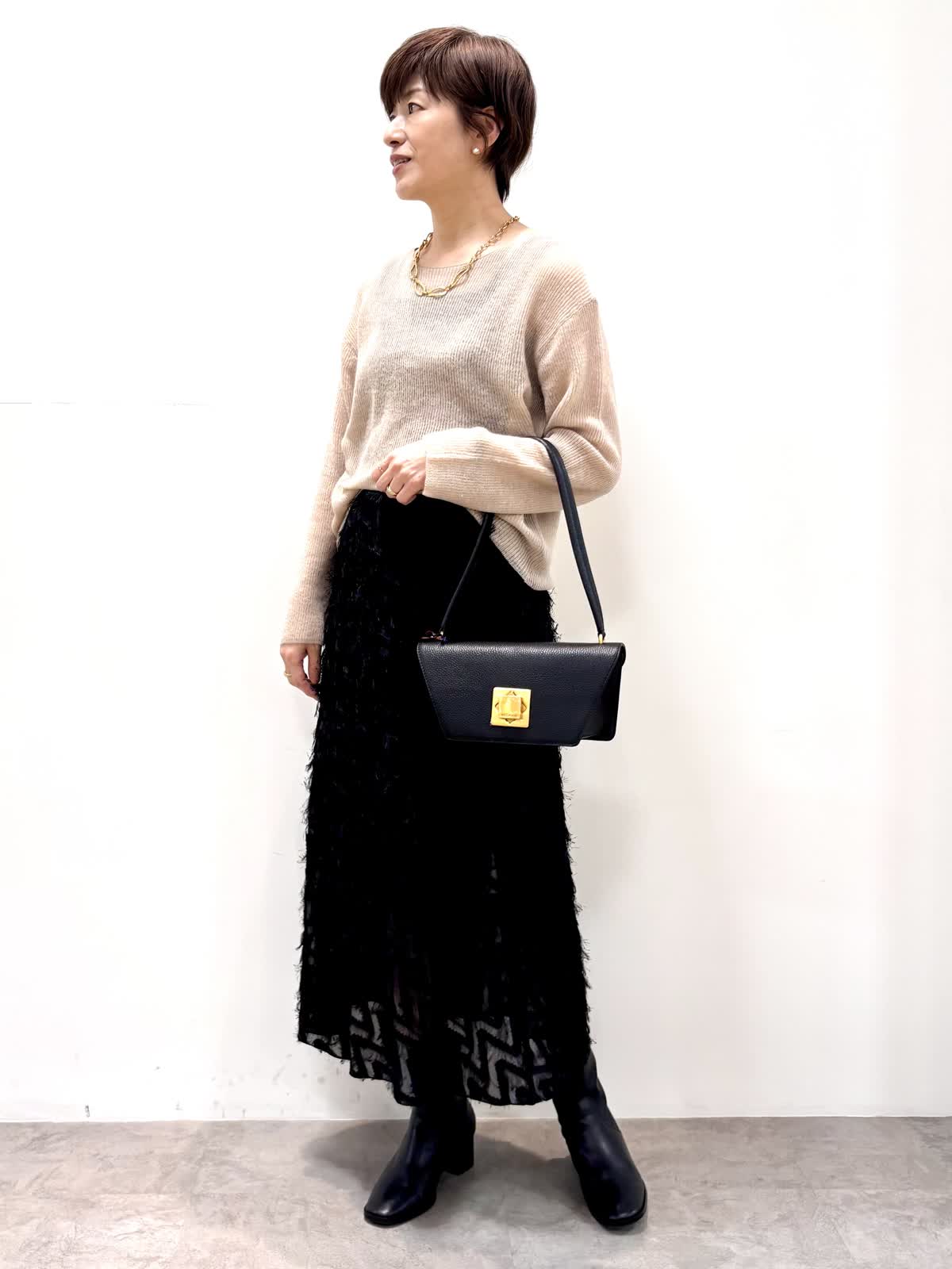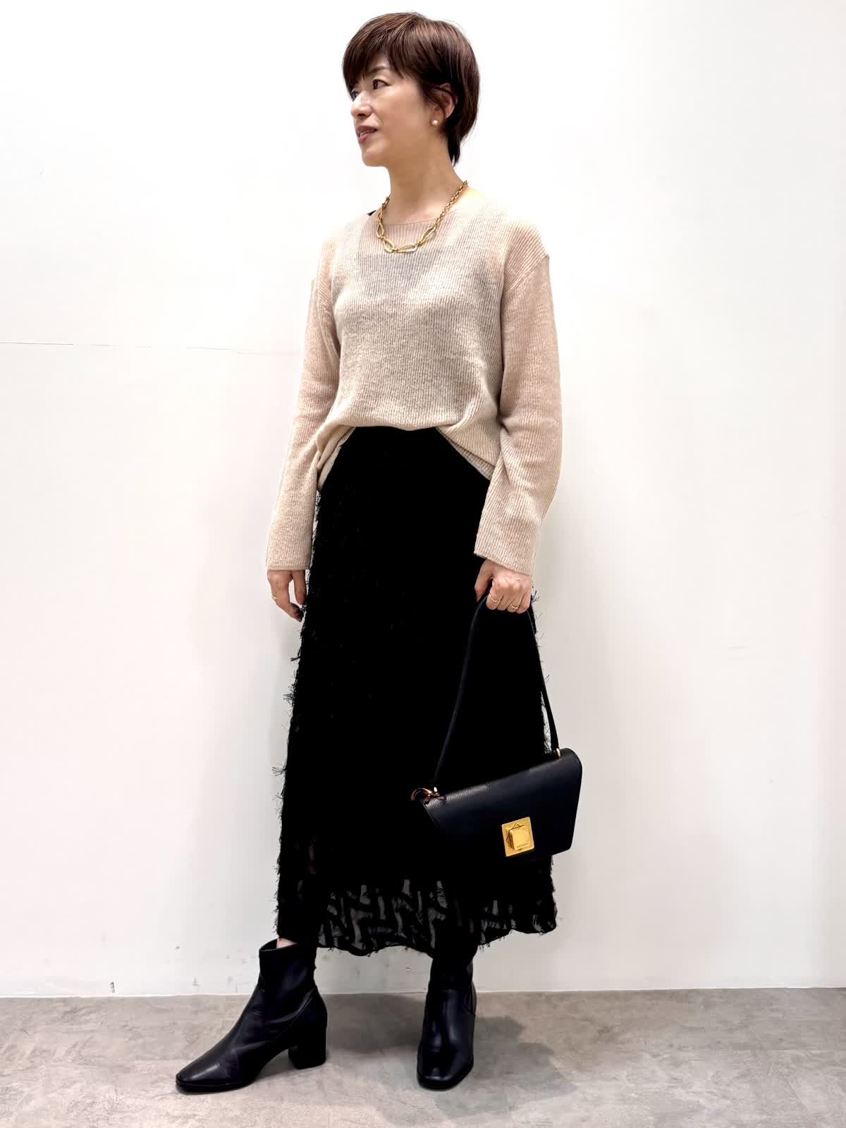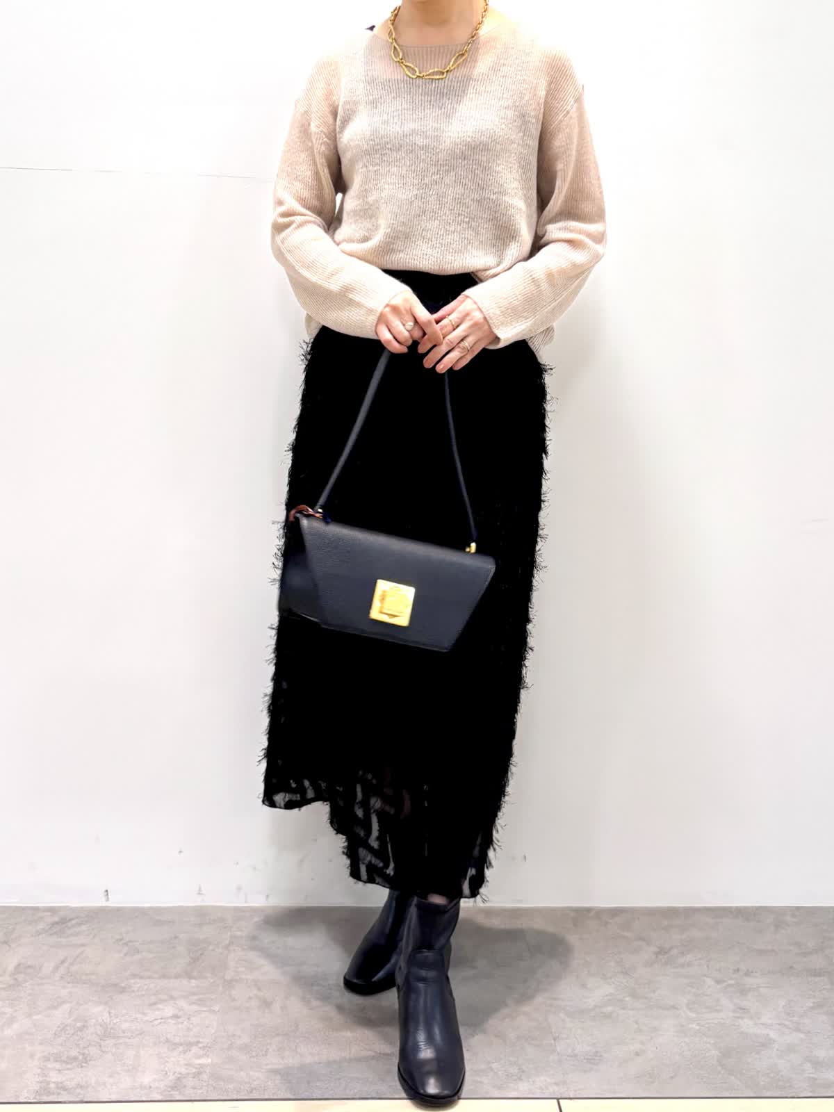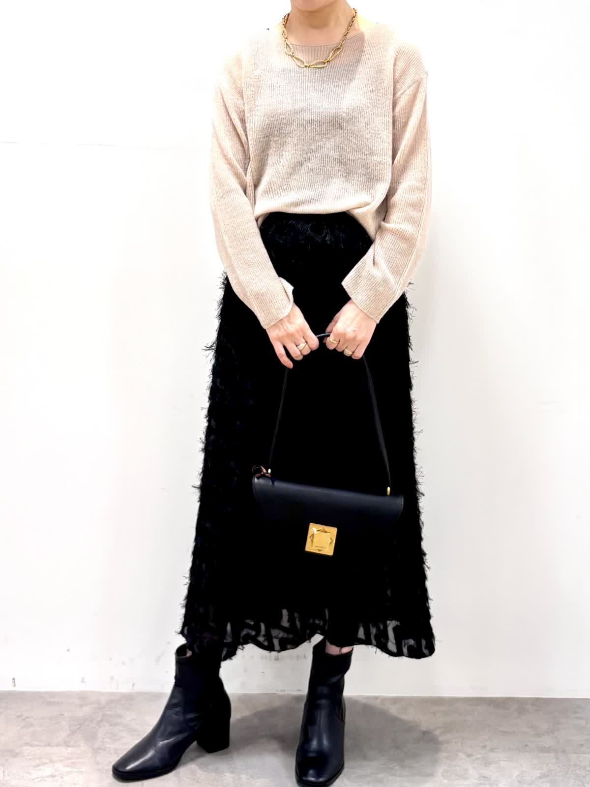 [着用サイズ]ニット:9号 スカート:7号 [着用カラー]ニット:ベージュ スカート:ブラック 今年トレンドのシアー感のあるニットはアルパカ混の軽くて柔らかい着心地です。ジャガードのフリンジをあしらったスカートは一枚で着映えします。モードな雰囲気で、カジュアルコーデと綺麗めコーデのどちらにも合わせやすいです。