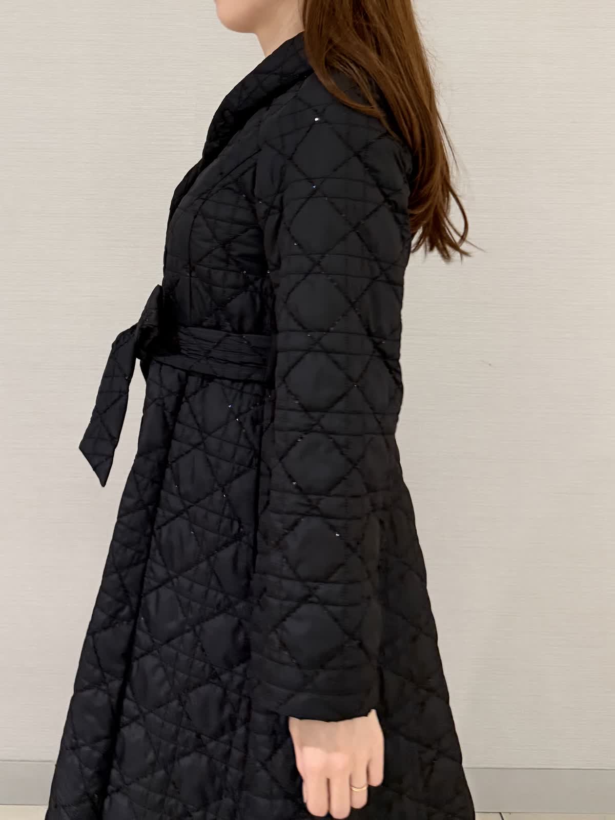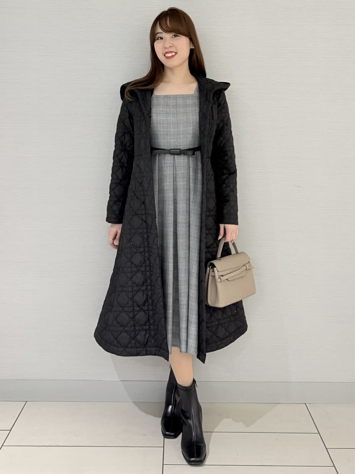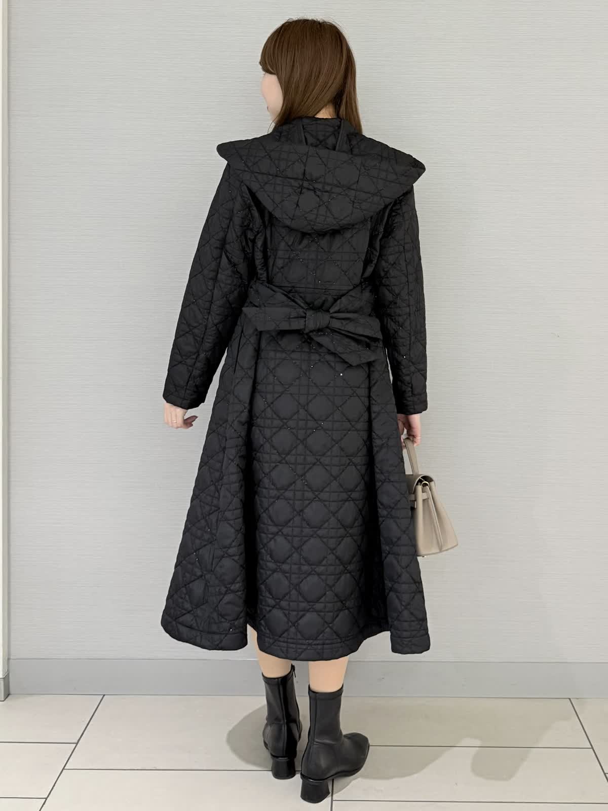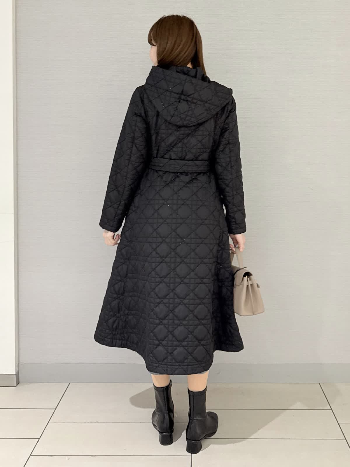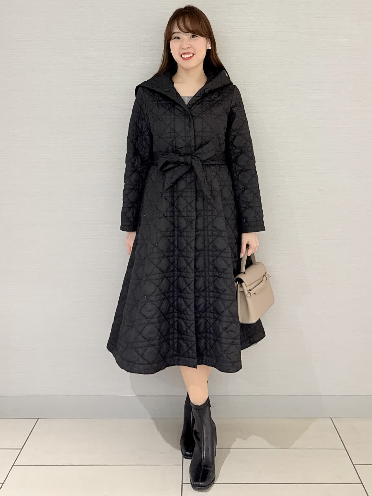 【着用サイズ/カラー】コート:9号/ブラックワンピース:9号/グレンチェックキルティングコートは軽くてラインも美しく黒はスパンコールが散りばめられ気分が上がります! フード付きなので程よく抜け感がありコーディネートがしやすいです。ウエストリボンでスタイルアップし開けて着てもスッキリとしバランス◎生地はやや薄いので早い時期からお召しいただけます。【サイズ感】どちらもいつものサイズ感でちょうどよかったです。コートはアームからバストにかけてもコンパクトすぎないデザインなので薄いニットを着ていつものサイズでもややゆとりがでるサイズ感でした。ですが、アウターなので、普段サイズを迷う方やゆとりをもって着たい方は1サイズあげたほうが安心して着心地良くお召しいただけるかと思います。ワンピースは冬にインナーでニットなどを着るとピッタリになりそうな感じがしました。