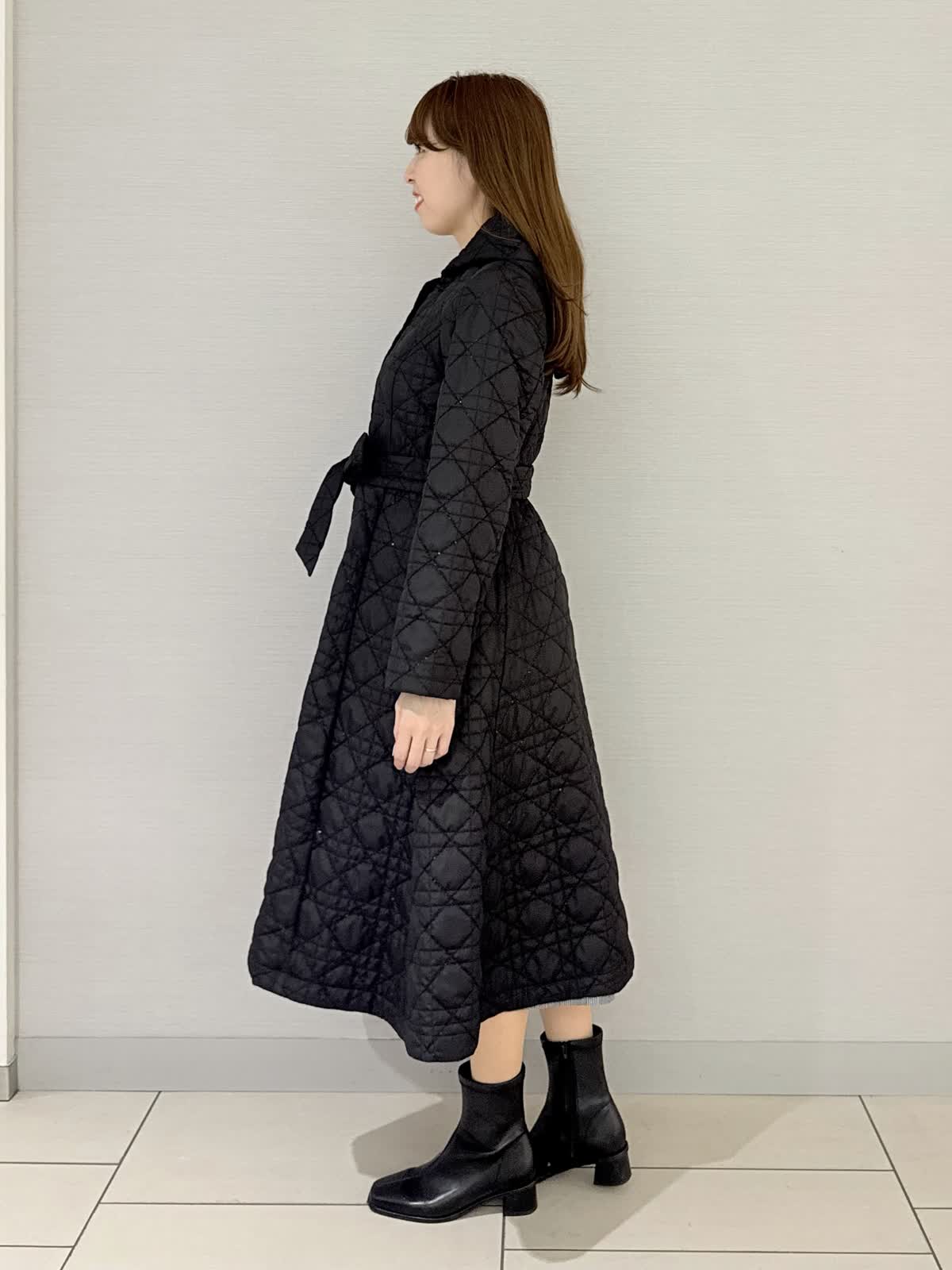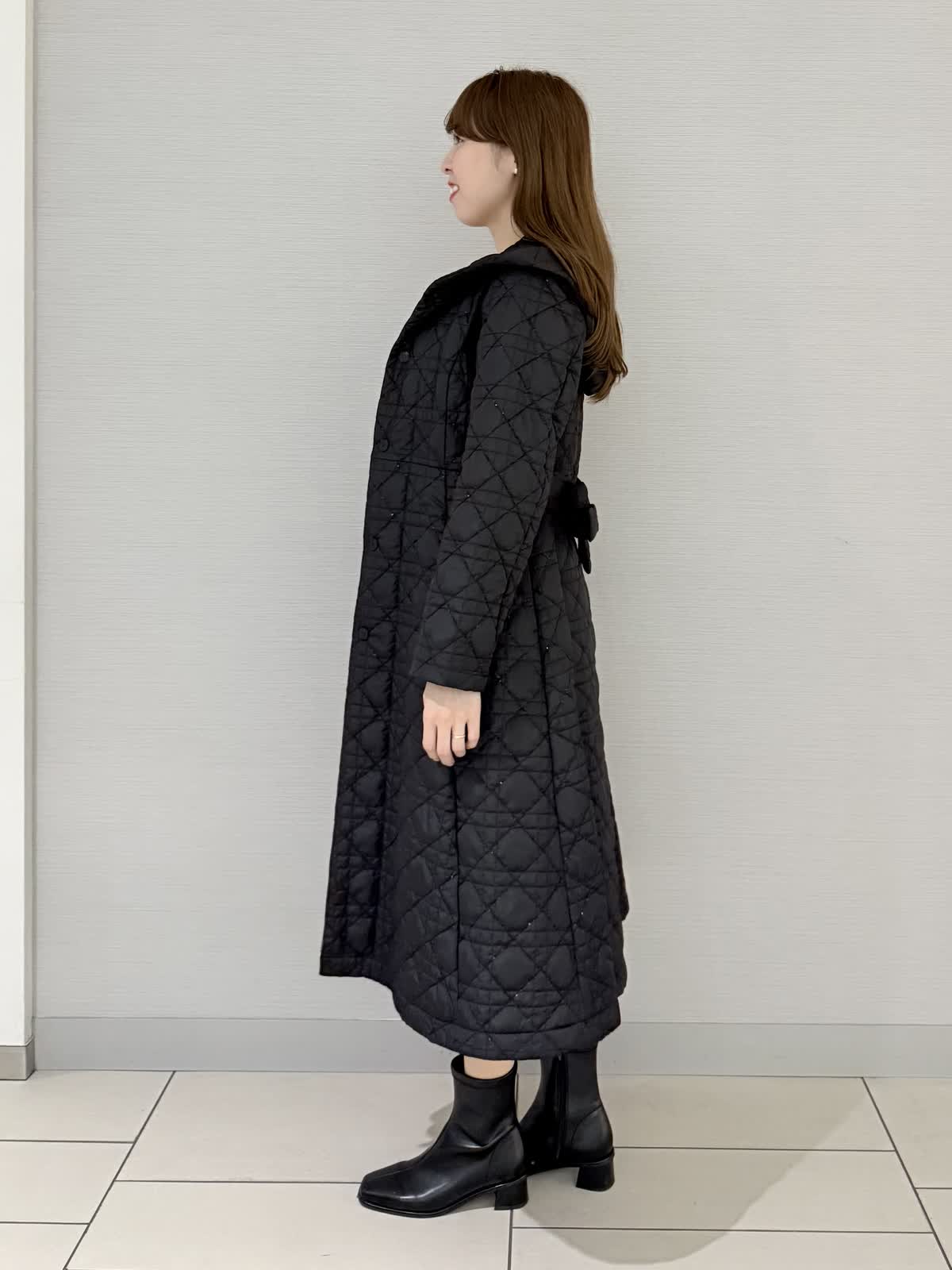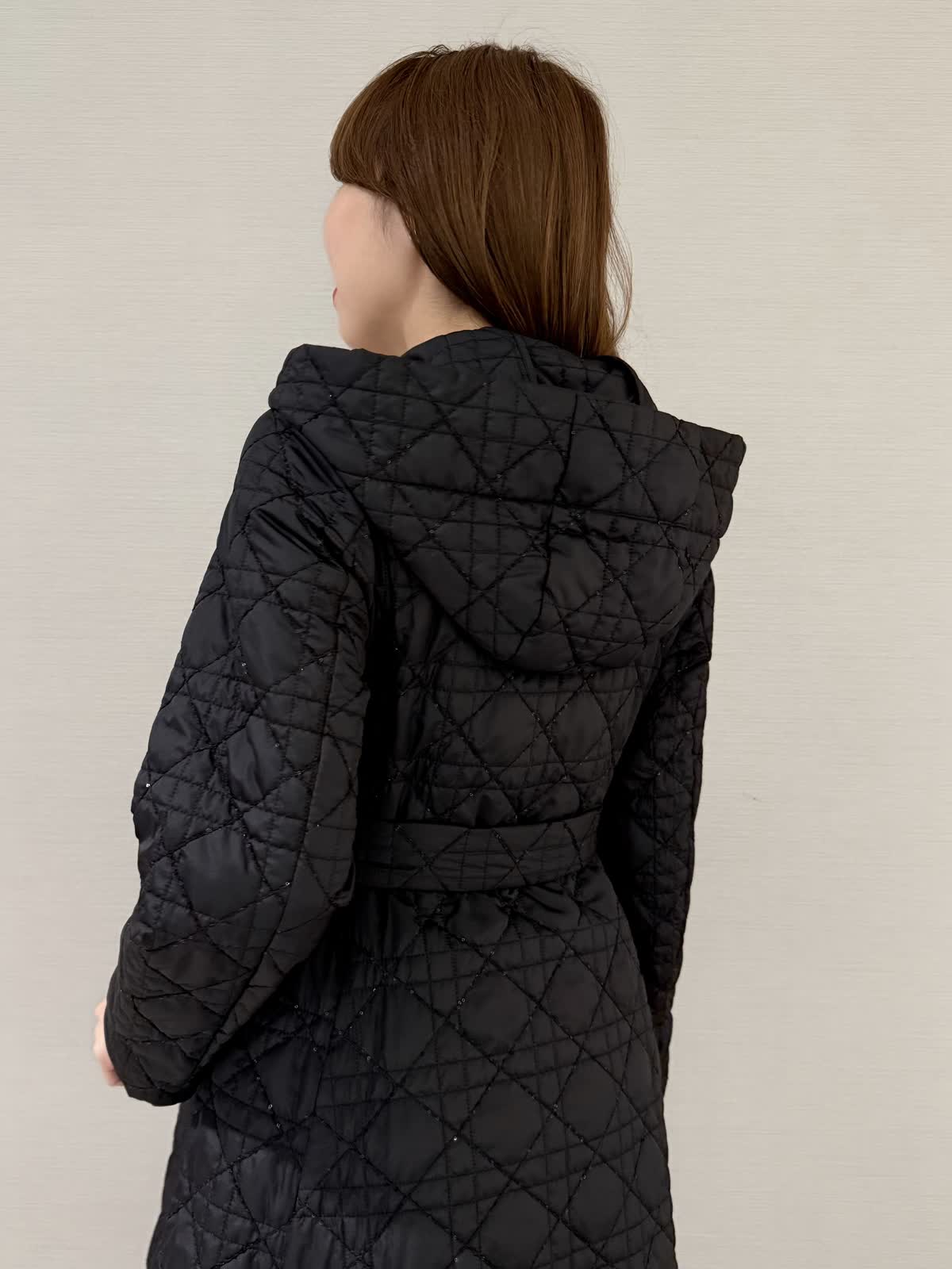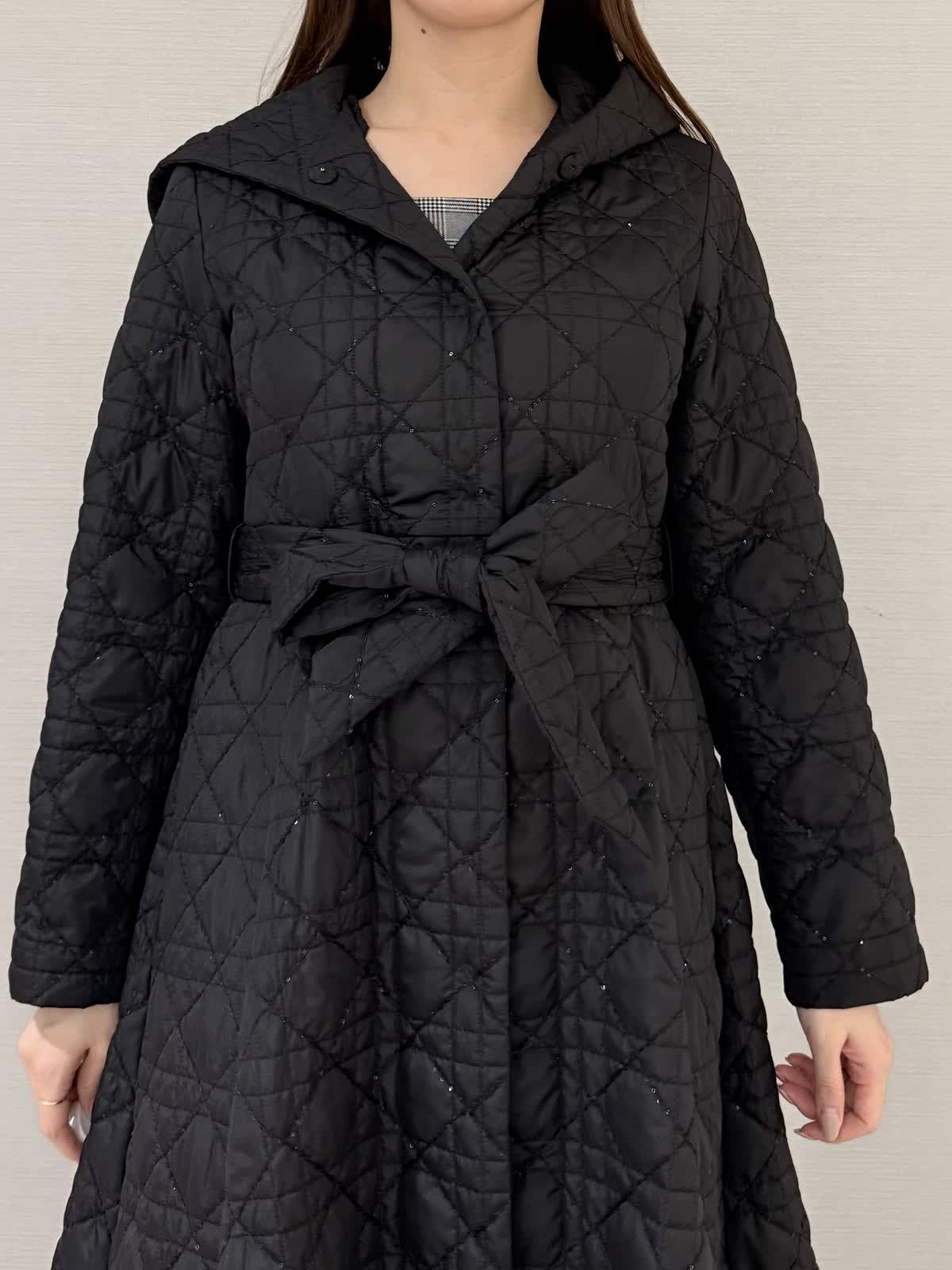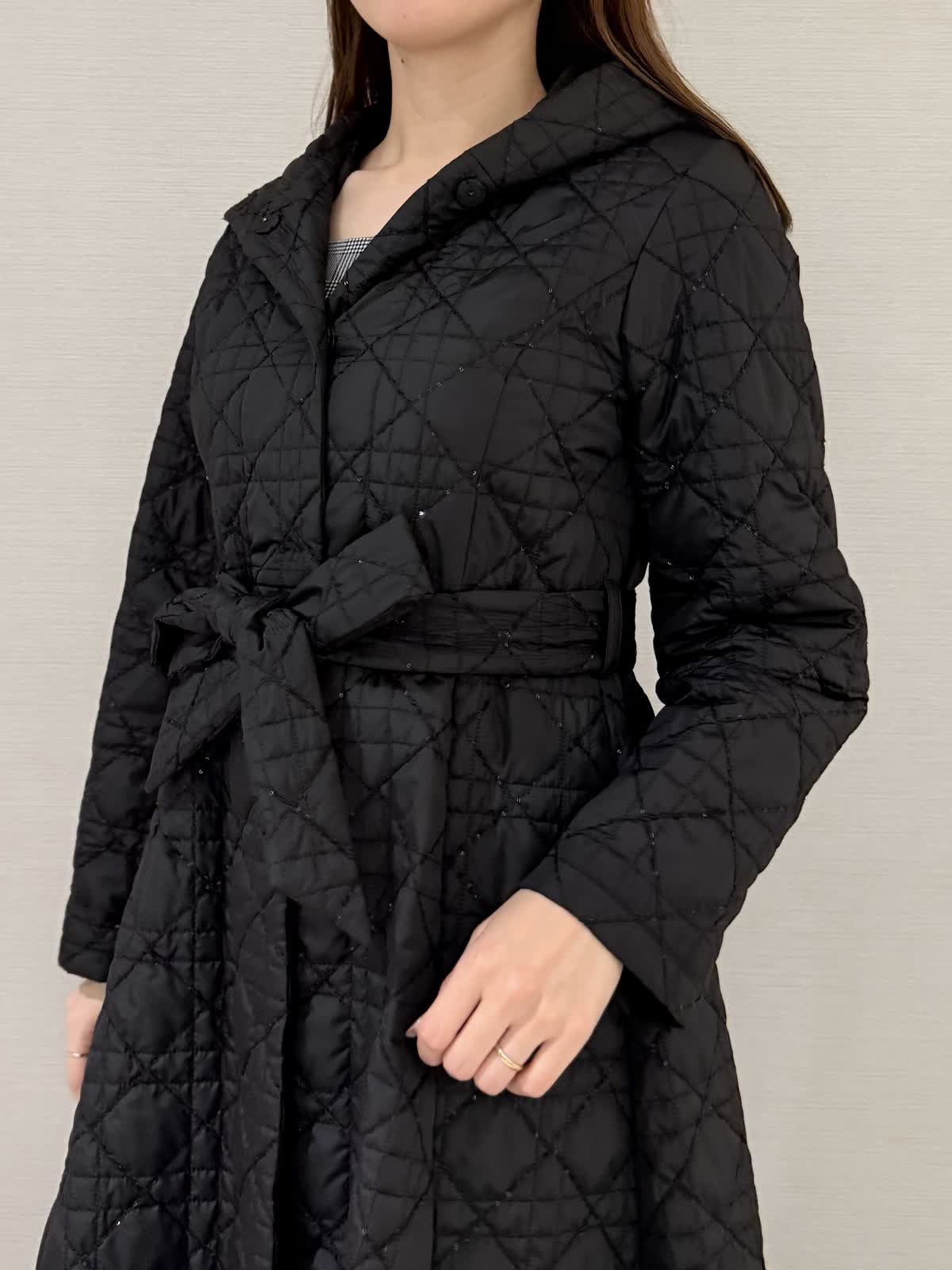 【着用サイズ/カラー】コート:9号/ブラックワンピース:9号/グレンチェックキルティングコートは軽くてラインも美しく黒はスパンコールが散りばめられ気分が上がります! フード付きなので程よく抜け感がありコーディネートがしやすいです。ウエストリボンでスタイルアップし開けて着てもスッキリとしバランス◎生地はやや薄いので早い時期からお召しいただけます。【サイズ感】どちらもいつものサイズ感でちょうどよかったです。コートはアームからバストにかけてもコンパクトすぎないデザインなので薄いニットを着ていつものサイズでもややゆとりがでるサイズ感でした。ですが、アウターなので、普段サイズを迷う方やゆとりをもって着たい方は1サイズあげたほうが安心して着心地良くお召しいただけるかと思います。ワンピースは冬にインナーでニットなどを着るとピッタリになりそうな感じがしました。