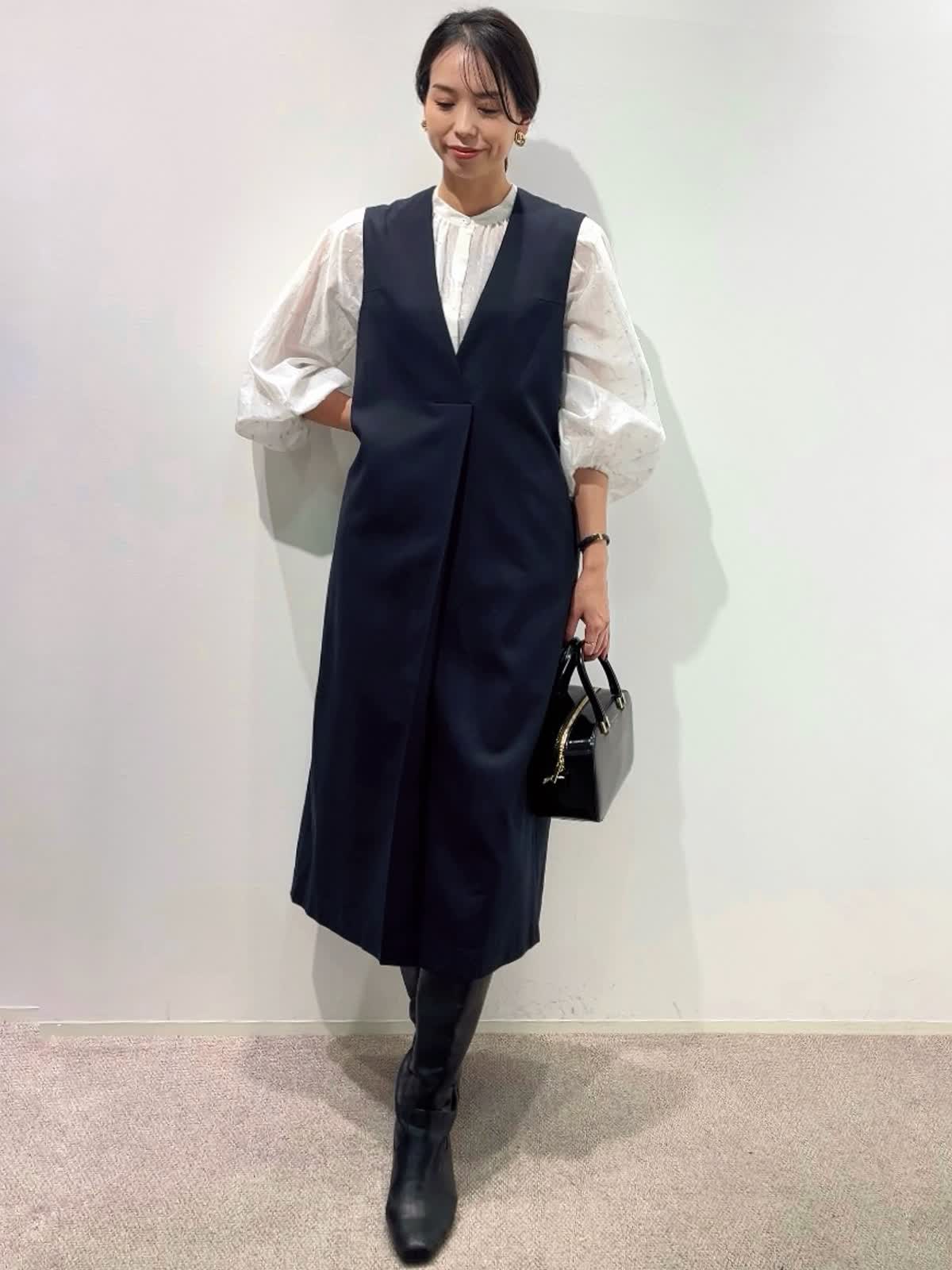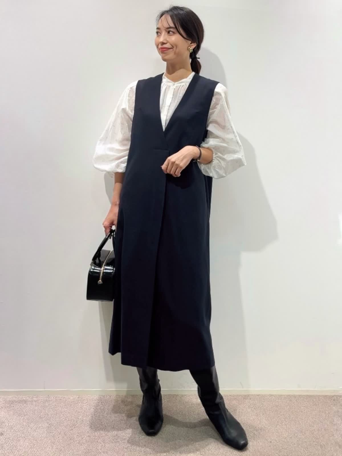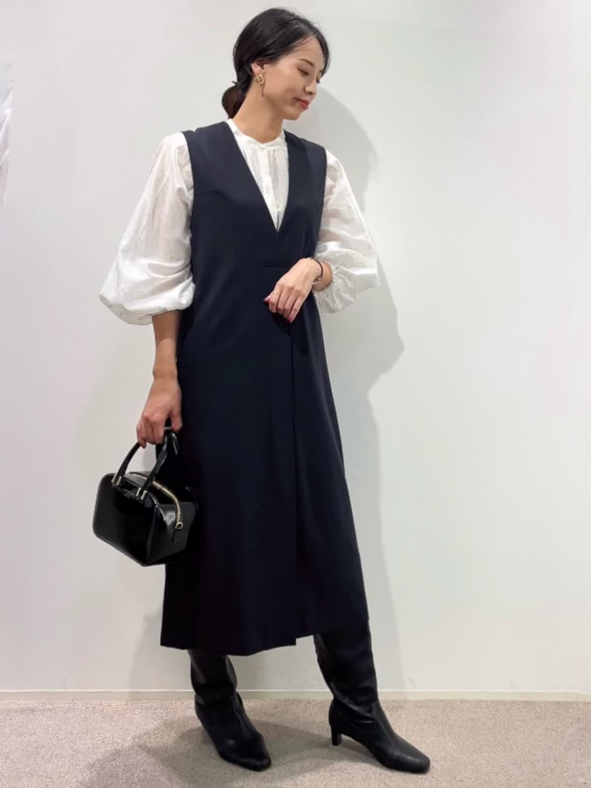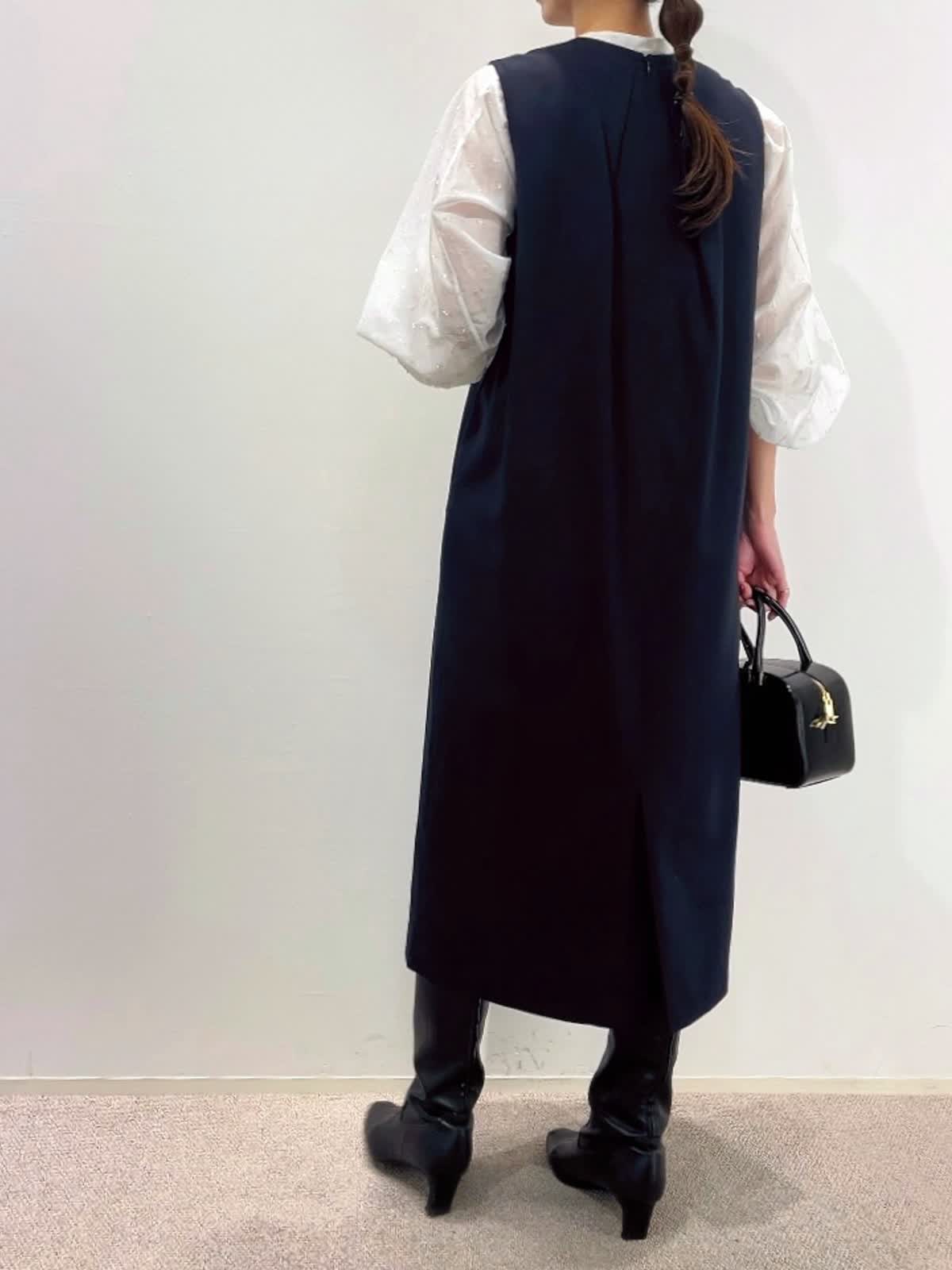 【着用サイズ】ワンピース:9号 ブラウス:9号 【着用カラー】ワンピース:ネイビー ブラウス:オフホワイト バッグ:ブラック 「上品に決まる秋の万能ジャンスカスタイル」 ラメドットがポイントのボリューム袖のブラウスは、レイヤードスタイルにおすすめな華やかで着映えするデザイン。 ワンピースは、Vネックラインが縦長のシルエットを強調させてシャープに見せてくれるので、スタイルアップが叶います。 インナーを変化させると、秋から冬のシーズンまで長く活躍できるので、スタイリングの幅も広がります。ゆとりのあるサイズ感なので、ストレスフリーで着用しやすくおすすめ。シーンを選ばず、オンオフ対応できる万能ワンピースです。
