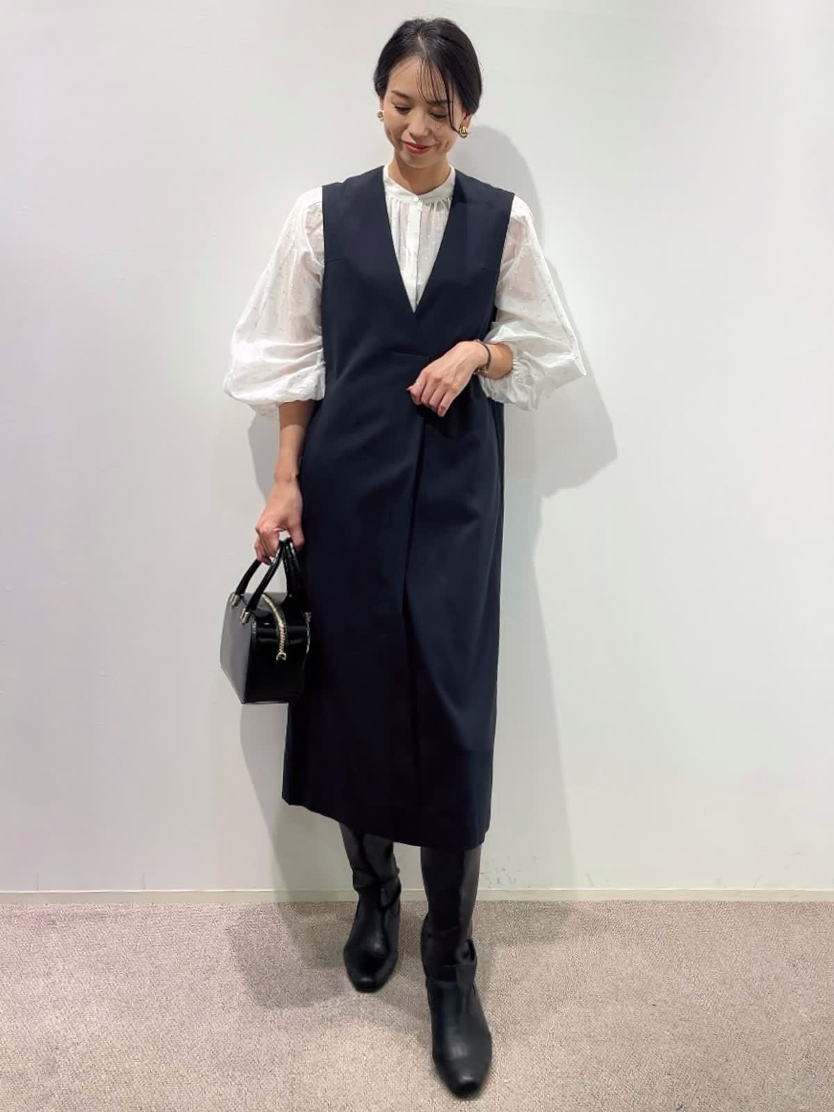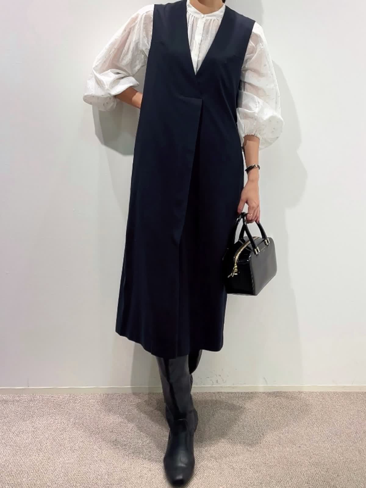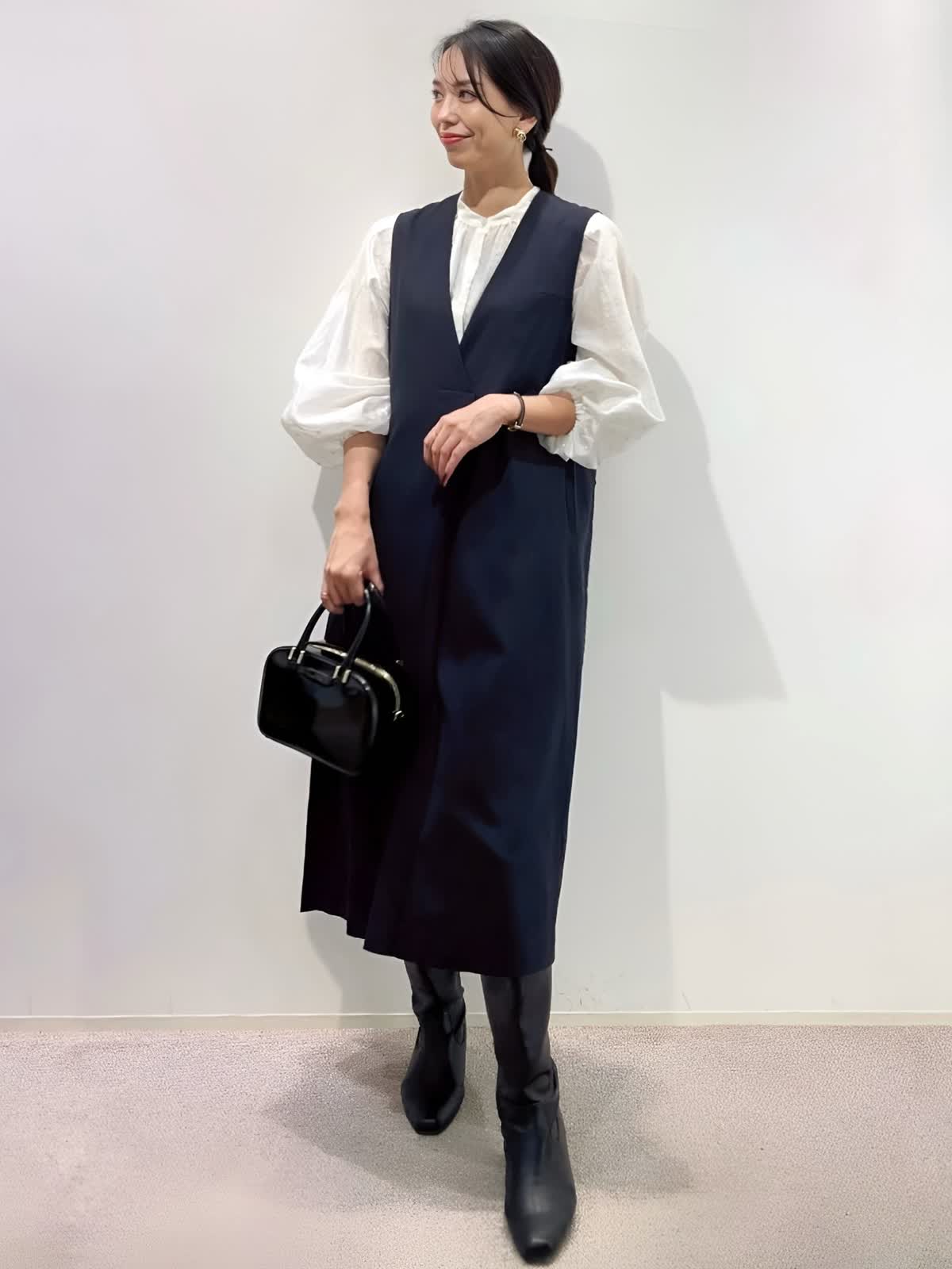 【着用サイズ】ワンピース:9号 ブラウス:9号 【着用カラー】ワンピース:ネイビー ブラウス:オフホワイト バッグ:ブラック 「上品に決まる秋の万能ジャンスカスタイル」 ラメドットがポイントのボリューム袖のブラウスは、レイヤードスタイルにおすすめな華やかで着映えするデザイン。 ワンピースは、Vネックラインが縦長のシルエットを強調させてシャープに見せてくれるので、スタイルアップが叶います。 インナーを変化させると、秋から冬のシーズンまで長く活躍できるので、スタイリングの幅も広がります。ゆとりのあるサイズ感なので、ストレスフリーで着用しやすくおすすめ。シーンを選ばず、オンオフ対応できる万能ワンピースです。