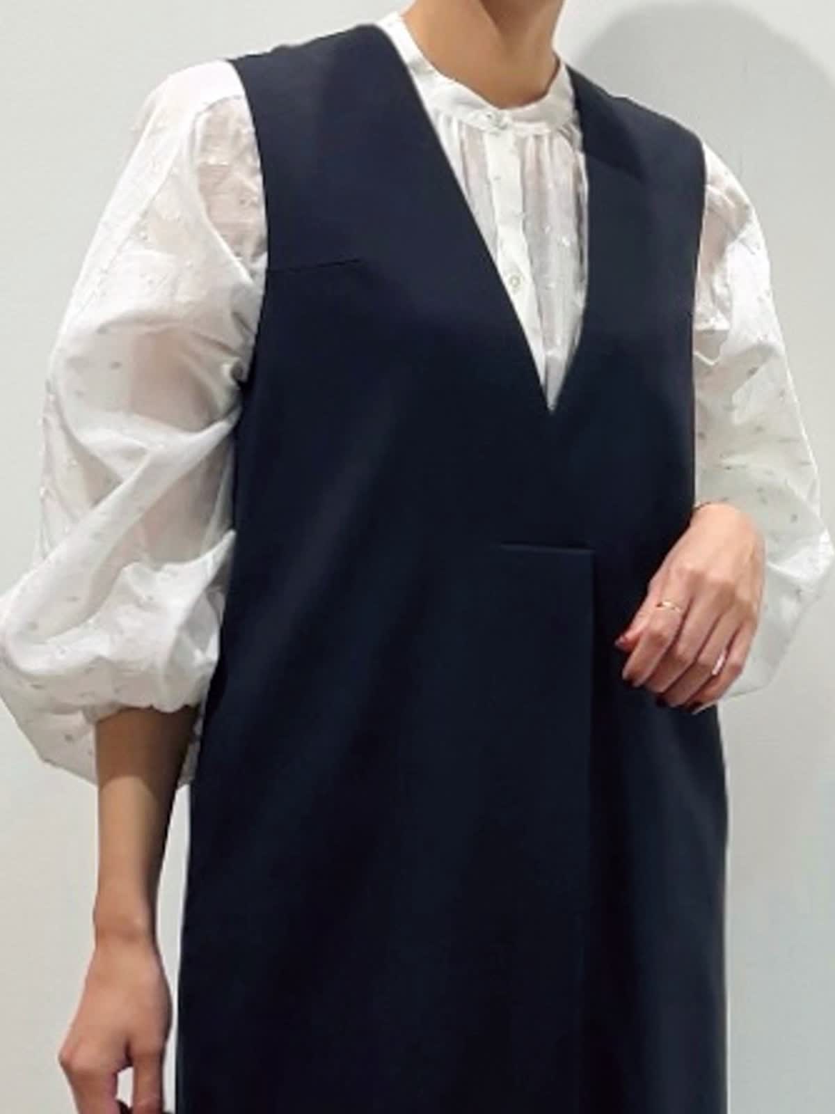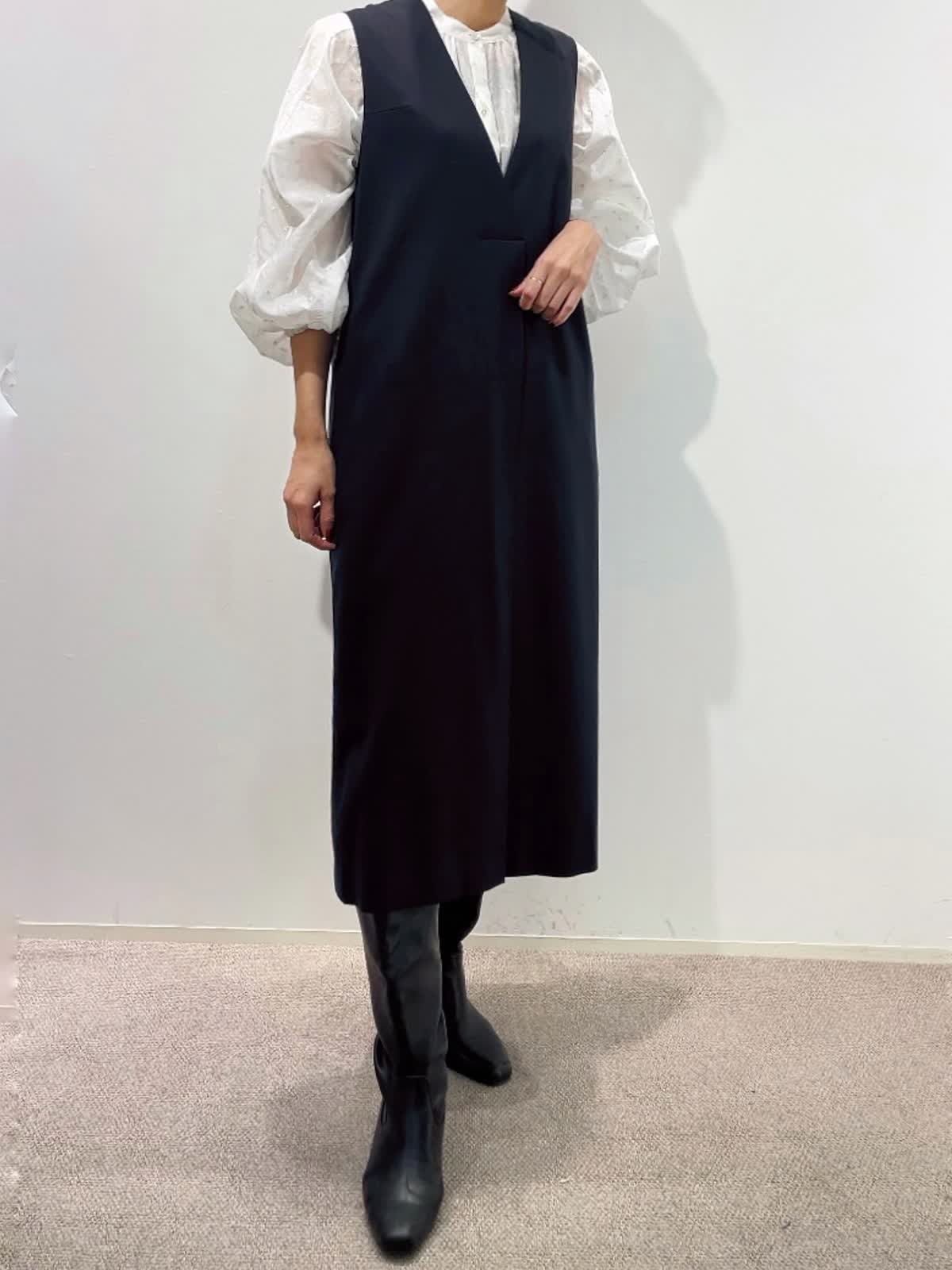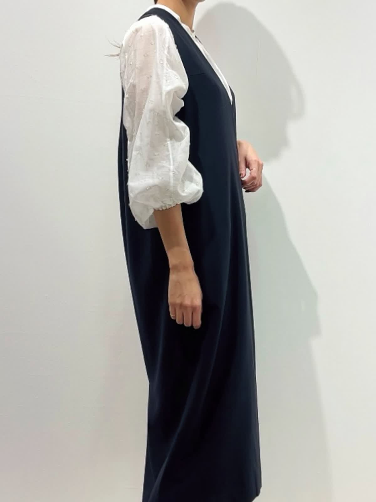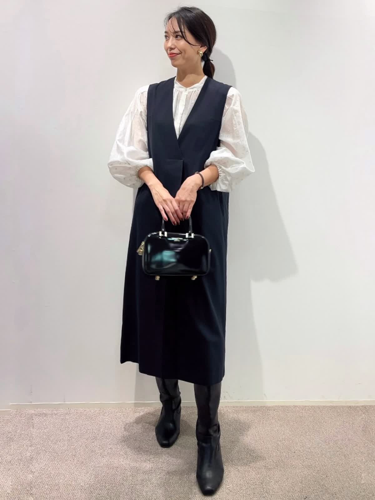 【着用サイズ】ワンピース:9号 ブラウス:9号 【着用カラー】ワンピース:ネイビー ブラウス:オフホワイト バッグ:ブラック 「上品に決まる秋の万能ジャンスカスタイル」 ラメドットがポイントのボリューム袖のブラウスは、レイヤードスタイルにおすすめな華やかで着映えするデザイン。 ワンピースは、Vネックラインが縦長のシルエットを強調させてシャープに見せてくれるので、スタイルアップが叶います。 インナーを変化させると、秋から冬のシーズンまで長く活躍できるので、スタイリングの幅も広がります。ゆとりのあるサイズ感なので、ストレスフリーで着用しやすくおすすめ。シーンを選ばず、オンオフ対応できる万能ワンピースです。