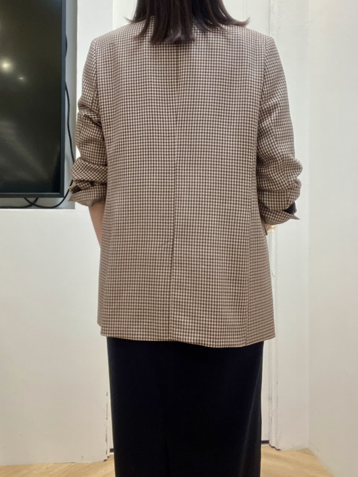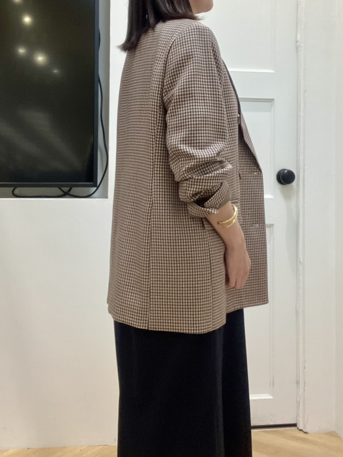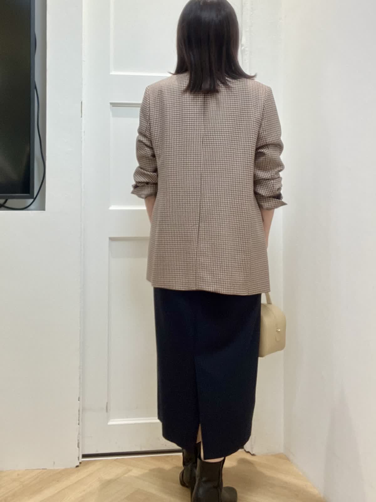 【着用サイズ】全て9号 【着用カラー】ジャケット: 柄小 ニット:グレーベージュ ワンピース:ネイビー 《三尋木さんコラボ》ジャケットはオーバーサイズなシルエットが今っぽく、とにかく軽くて着心地抜群です! ジャンパースカートは女性らしい深いVネックとゆるやかなコクーンシルエット。 チェックジャケットを羽織るだけで旬コーデが完成します。