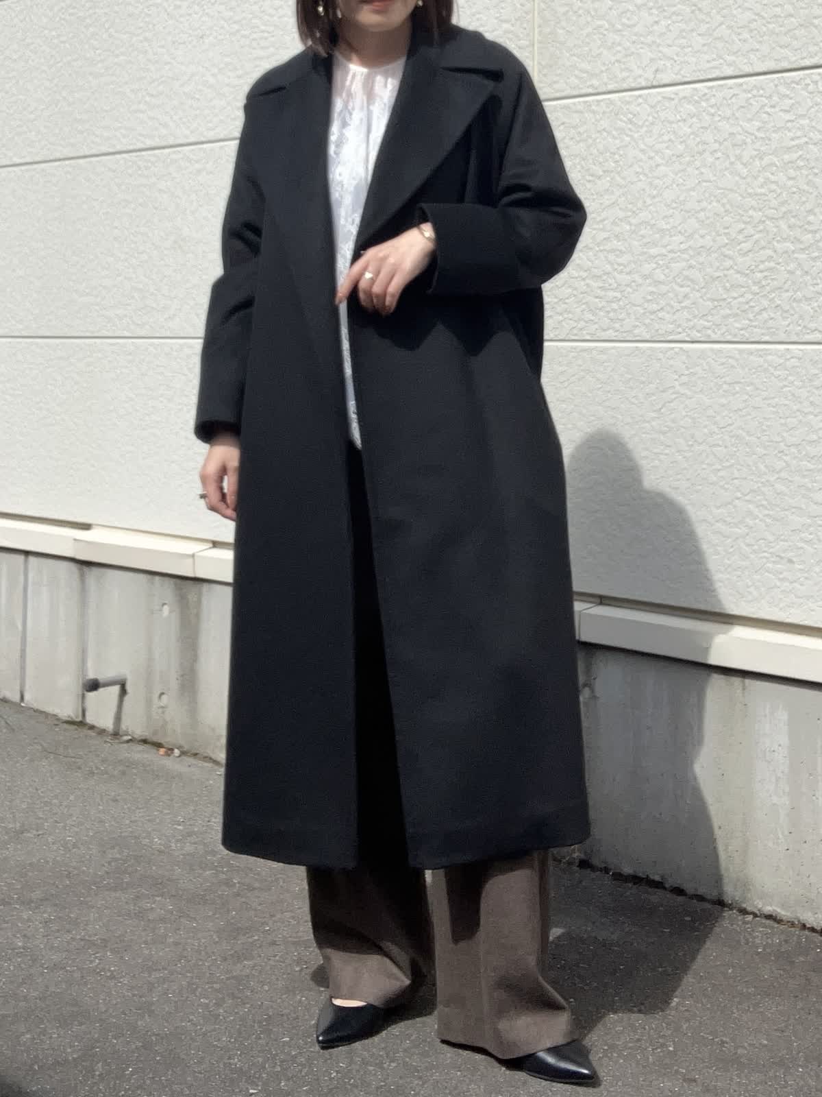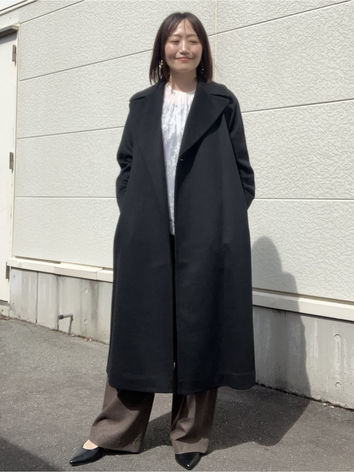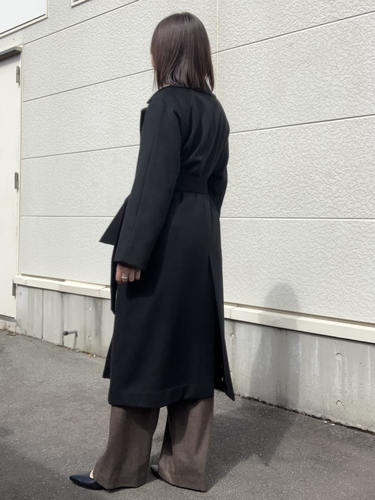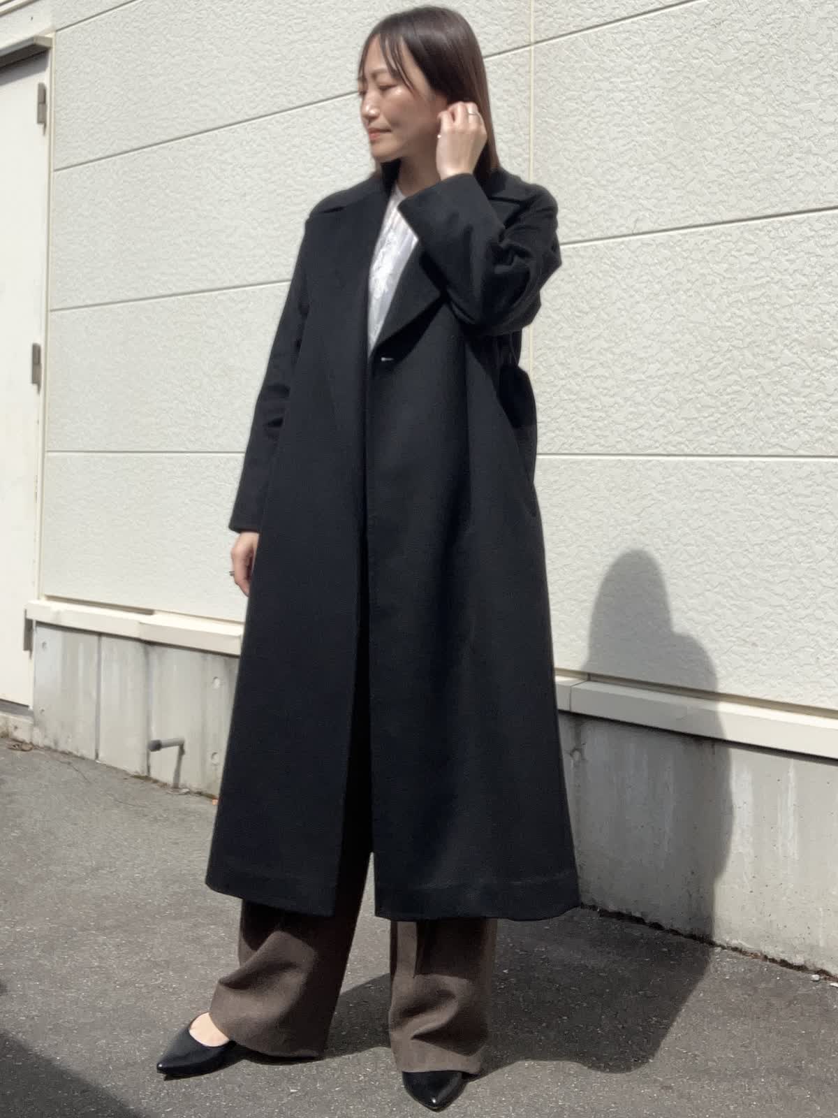 【着用サイズ】全て9号【着用カラー】コート:ブラック ブラウス:オフホワイト パンツ:ダークブラウン 1着は持っていたい黒のカシミヤ100%のコート。通勤や冠婚葬祭などのきちんとしたシーンからお休みの日まで幅広く対応できます。冬の始まりは薄手のインナーにサッと羽織っても素敵に着こなせる、頼れるコート。トレンドに左右されず長くご愛用いただけます。